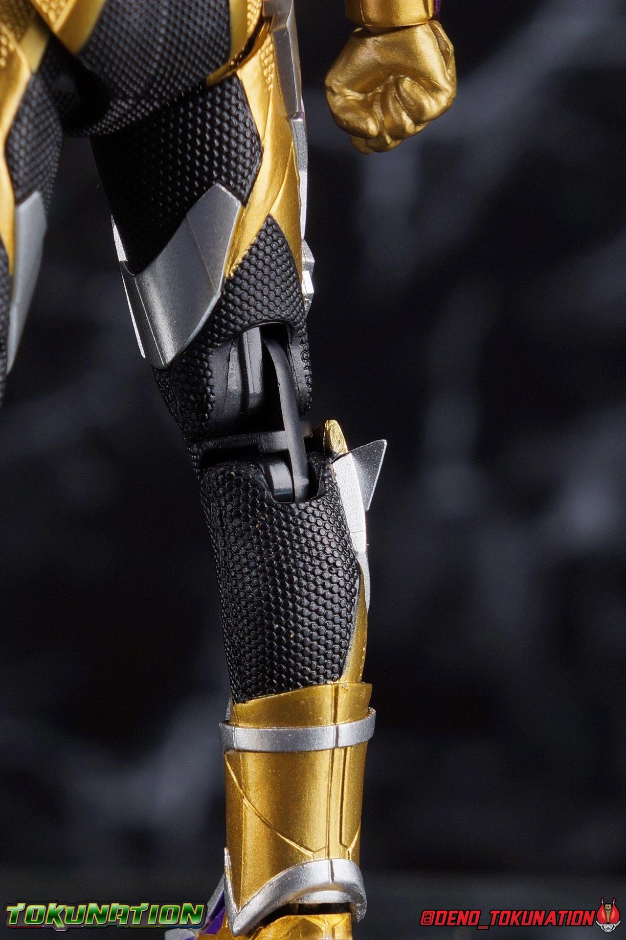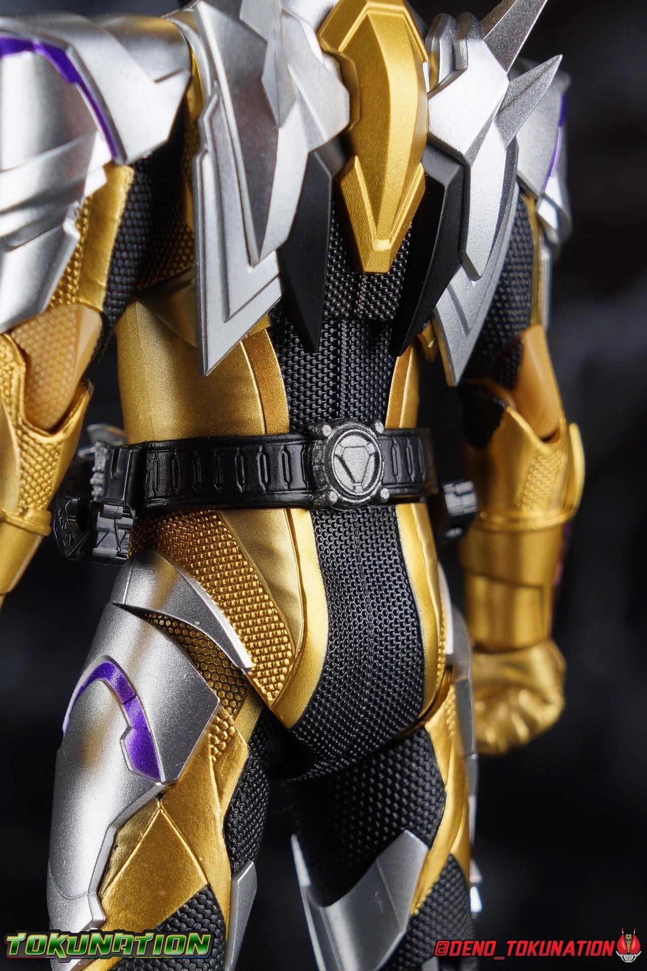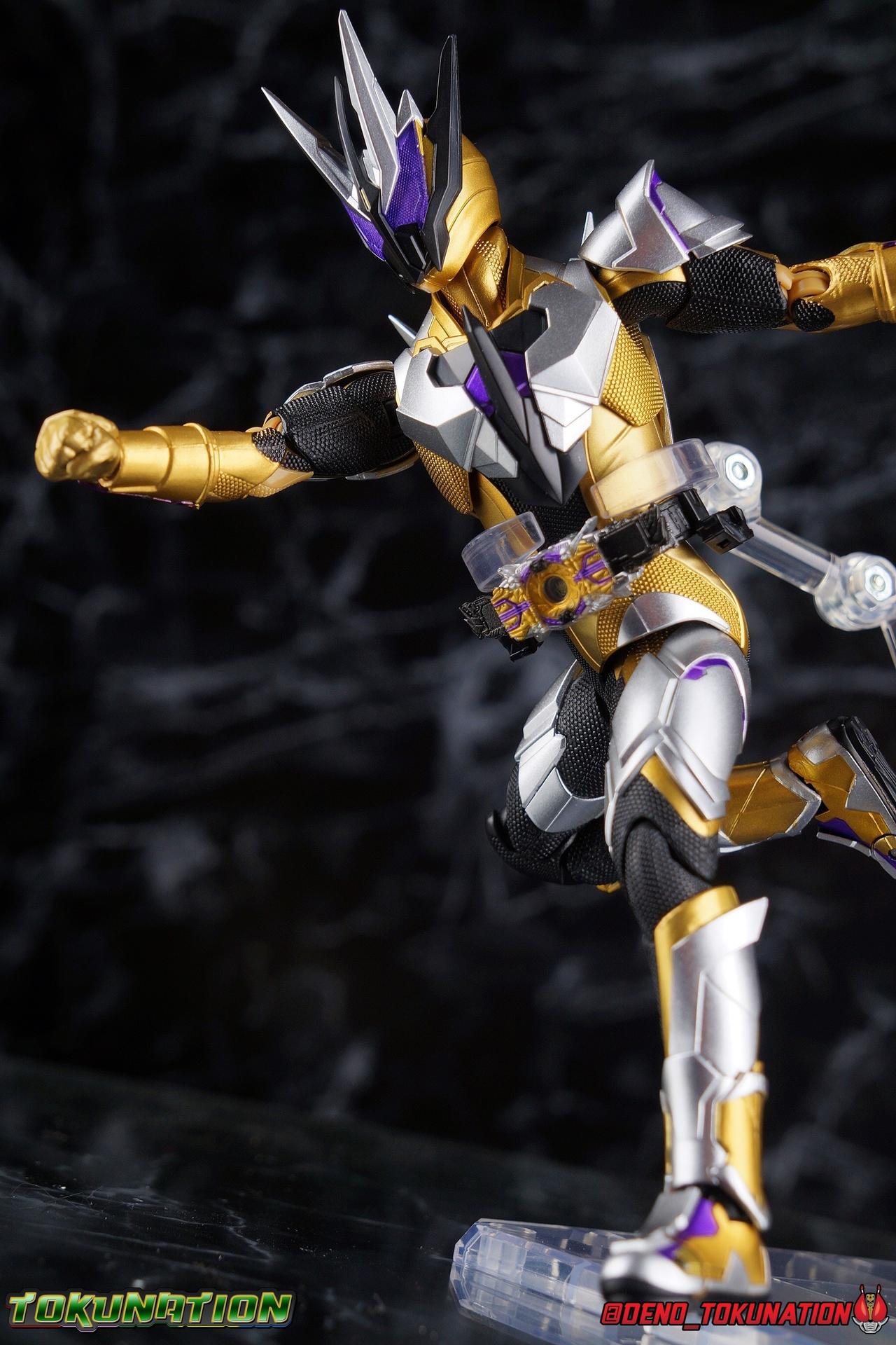 The cruelty of humanity. That is what Gai Amatsu instilled in Satellite Ark. In doing so he instigated not only the Daybreak Town Incident, but also the creation of Metsuboujinrai.net, and all the pain to come for both humans & humagears. For 12 years Gai has manipulated events from the comfortable shadows of ZAIA Enterprise. Now the mysterious man behind A.I.M.S. has his sights set on Hiden Intelligence as well, but can Zero-One keep his grandfather's company safe? Gai Amatsu is a master manipulator, and maybe one day, he could even be a hero. But for now? With strength that's 1000% greater than Zero-One's, the golden solider Kamen Rider Thouser is born! Packaging Keeping in line with the sort of packaging the Zero-One line has had, Thouser arrives in a mostly white box, but with appropriately ostentatious gold details and lettering. There are no fun black light gimmicks or anything like that with Thouser's box. Just some really standard stock photos and a nice portrait of the figure across the front. Nothing special to report this go around. Figure time! Main Figure Unfortunately I've yet to be able to handle all the riders from Zero-One so far. Having missed Horobi, Jin, & Valkyrie, I feel like I need to preface this review. Because I don't feel like I have a complete picture of the Zero-One Figuarts line yet without them. So if my impressions of Thouser are way off base, I apologize. That being said, while he's certainly the most ornately detailed of the Zero-One riders, he has a number of flaws as well that need to be addressed as this line continues. Zero-One really set the standard for this line. An absolutely rock solid release to kick off a new line up of rider figuarts, which doesn't always happen. And while I thought he was fantastic, I did feel Vulcan was a less than perfect follow up. With Thouser much of what we see is new, but there's a lot of familiarity as well. The basic form of the Zero-One mold is there, but Thouser still manages to be very different. In the legs we can see the exact same textured black detailing between the two, but the armor that covers it is entirely different. So these two do share at least some parts. However what they don't share is the same range of articulation. Thouser has very restricted ankles, largely due to the design of the ankle cuff, where it drops down around the back of the foot. This nixes almost all of the outward movement of the foot, so good luck with wide stances. The knee bends are fortunately spared, having been directly carried over from Zero-One, no new armor to get in the way. The hip and thigh are largely identical, with only surface details having been changed for Thouser. However the thigh armor does extend further up toward the waist on him as well. And because the drop down hips on this mold already don't go down very far, rotating the hips up to pose the figure is a dangerous preposition. Be very very careful to angle them correctly or you will damage the silver paint on the thighs. Bot overall I really like the way the legs look, the design is great and paint work magnificent. Around his waist, Thouser has the appropriately named Thousandriver. And much like the Zero-One Driver in this line, I feel like we've been a little cheated. The Zero-One Driver is essentially non-functional because it can't revert to it's closed pre-henshin state, and the Thousandriver is exactly the same. The two halves that cover the window of the driver are permanently molded open. So even if you remove the keys you can't really recreate the closed driver. As for the keys we get the Amazing Caucasus Progrisekey & Awaking Arsino Zetsumerisekey. Only the Caucasus key has any detail and that's just the emblem on the end of the key that winds up being in the driver window. Outside of this both keys are just black plastic. The Driver looks fantastic, but it feels half realized, much like the Forceriser. The belt also has Key holsters on each hip, but considering so far there are no closed Progrise or Zetsumerise Keys in this line that I'm aware of, these holsters are entirely pointless. The ab section of the torso is very very similar to Zero-One, it's possibly the same part, though there are some details sculpted into the surface like fabric folds on Thouser. The upper body is the big difference with Thouser having completely newly sculpted armor and some really bright regal colors. But Thouser's armor is also quite thick? The chest armor sticks out a fair bit further than Zero-One, nearly as far out as the Thousandriver. Luckily the torso's articulation is nearly the same as Zero-One. We get a full rotating waist joint, and a ball jointed upper body that can lean about 45 degrees to either side, with a fair bit of room to arch the back. Thouser also features quite similar arms to Zero-One. They're essentially the same, again with new armor for Thouser. Thankfully this means we get the same basic elbow bend and wrist articulation. However the shoulders are a different story. Largely because of the large new shoulder pads which Thouser sports. Covering a greater portion of the joint, and having less range to move, the pad limits what the arms can do. Leaving us with about a 45 degree bend in straight out and upward movement. This is a bummer but it wasn't unexpected as well. Finally, probably the most interesting thing about the Thouser design, is his helmet. It's a harsh, striking design that certainly looks like the bad guy. Even despite Gai's change of heart later in the series, the design still speaks to it's villainous origins. Early concept art for Thouser had the compound eyes in blue and I think that actually would have gone a long way to making the suit look more heroic overall. As is there's some great royal purple compound eyes set amongst a crown of beetle horns. Luckily all the added bulk of the head itself and the armor of the torso don't really impact how the head can maneuver. While the figure has plenty of areas that should have