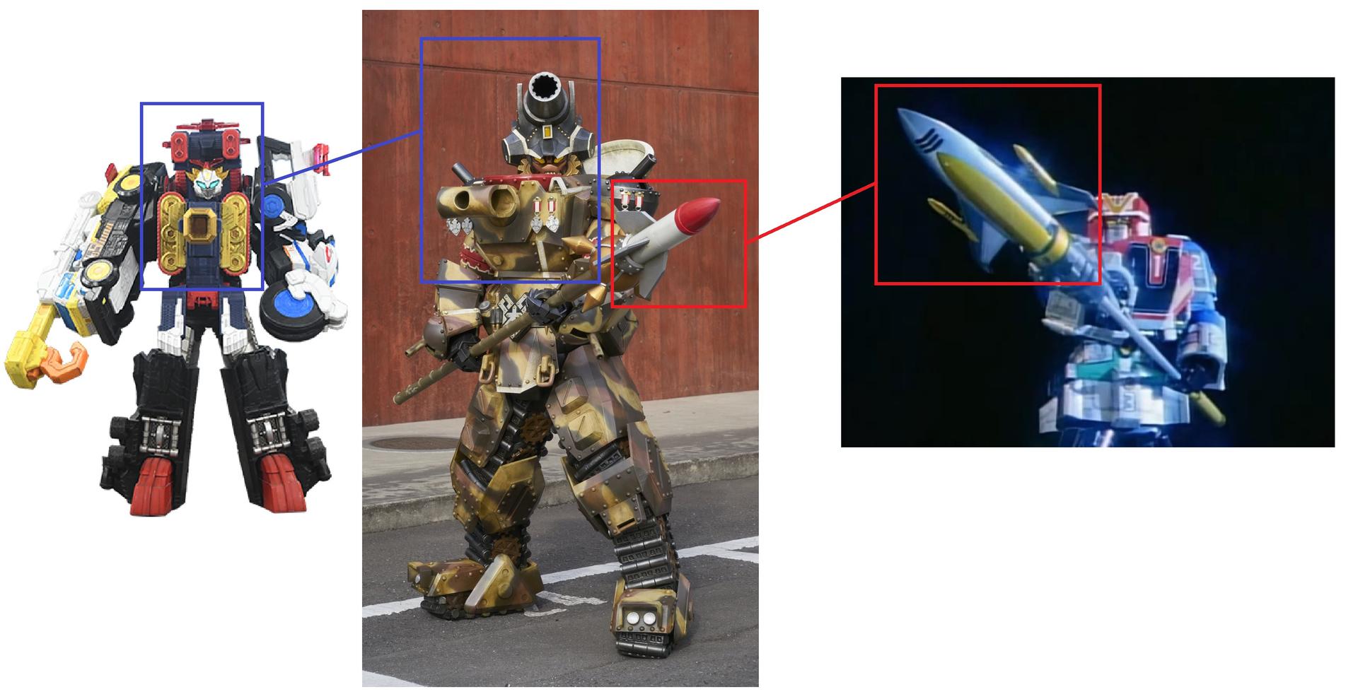 - Barashitara's body design and motif are based on Siren PatKaiser from Lupinranger vs Patranger series because both Barashitara and Siren PatKaiser's main motif is military. And Barashitara's Bara Spear weapon are based on Victory Mars's Jet Lance weapon from GoGoV series - Ijirude's body design are based on King Brachion from Zyuranger series because both Ijirude and King Brachion's main color is white and they are walked like a tank.