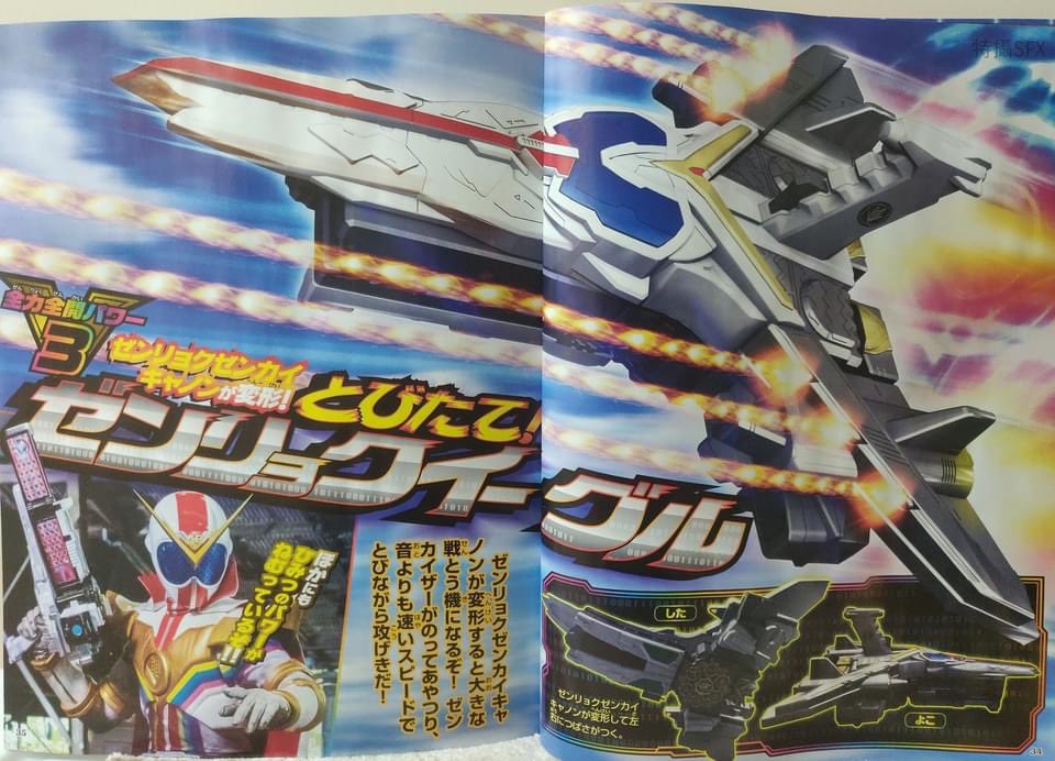 ![]() It seems Zenkai Cannon concept is based on Timeranger's Time Flyer because: - Both Zenkai Cannon and Time Flyer have gun mode. - Both Zenkai Cannon and Time Flyer have Ranger visors (Zenkaiser's visor and Time Red's visor). - Both Zenkai Cannon and Time Flyer have smaller mode. |