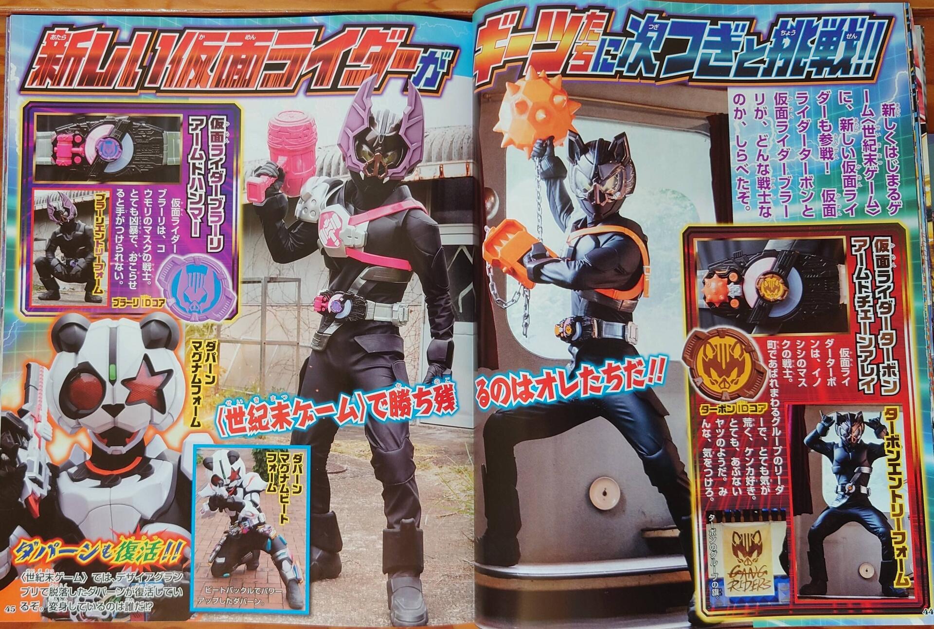 Okay guys, slight update. Along with a higher quality image we have more info on the new riders, Kamen Rider Tarbon (pig Rider) is the leader of some gang, Kamen Rider Burari (bat Rider) is apparently ferocious when provoked, and Dapaan is back as Dapaan and he seen using Magnum & Beat.