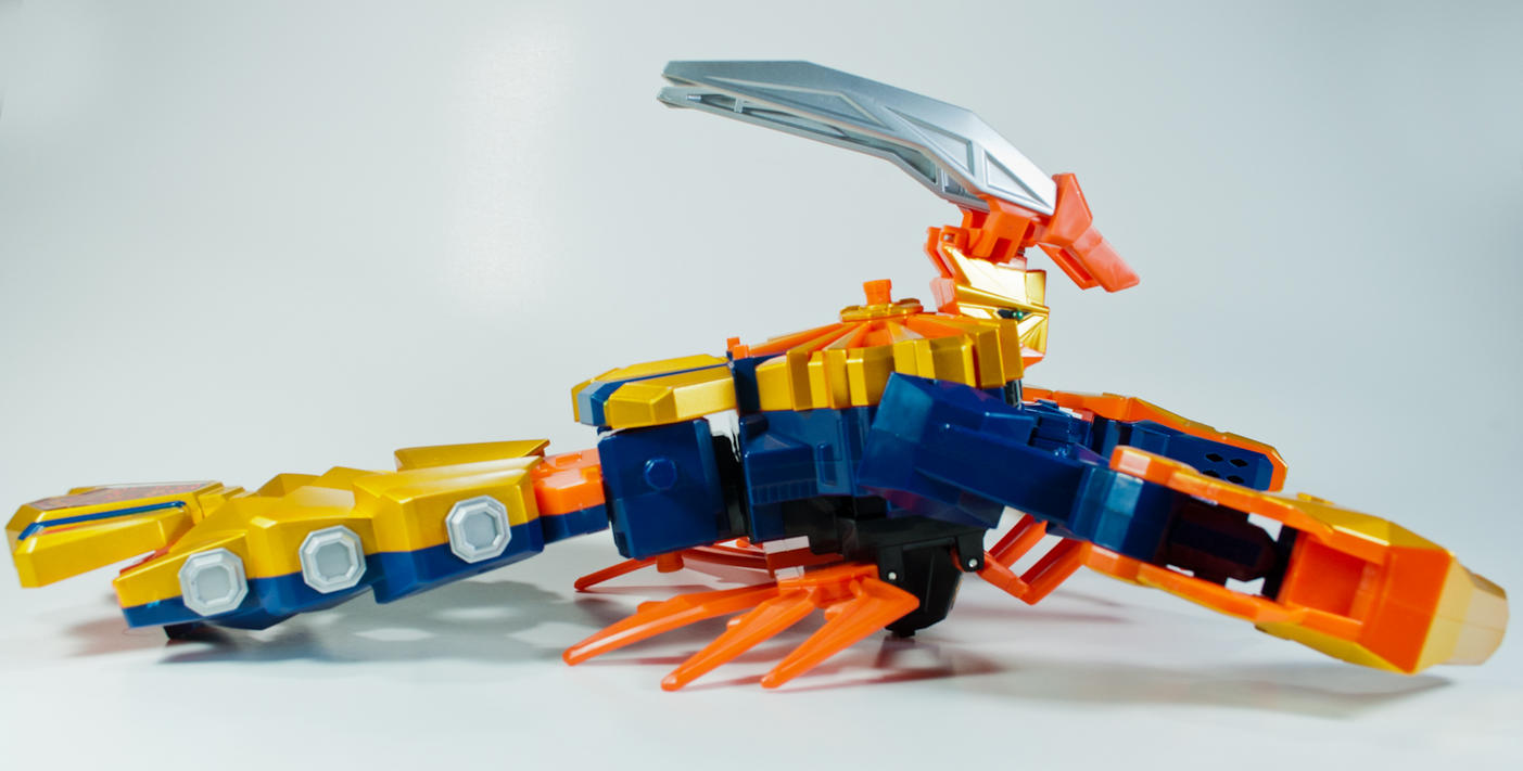 Tokunation continues it's rewind of the Samurai toy line, this time with a gallery of the Clawzord and Octozord! The Clawzord in lobster mode is fairly large for it's price point and is a faithful adaptation of Shinkenger's Ebi Origami. With the help of some symbol power, this lobster can transform into the Claw Battlezord. This megazord has the ability to access 4 different modes, signified by a change of face and weaponry. Claw Battlezord East uses it's mighty claws, West utilizes it's tail as a fan, South uses it's antennae katana to slice and dice adversaries, and North combines with the Octozord to perform frosty attacks. The Clawzord can combine with the Samurai Megazord to form the Claw Armor Megazord. The octozord figure is drastically smaller than the Japanese Ika Origami figure but can still combine with the other zords to form fairly accurate representations of the Octo Spear Megazord, Claw BattleZord North, Samurai Battle Cannon, and of course, the Samurai Gigazord.