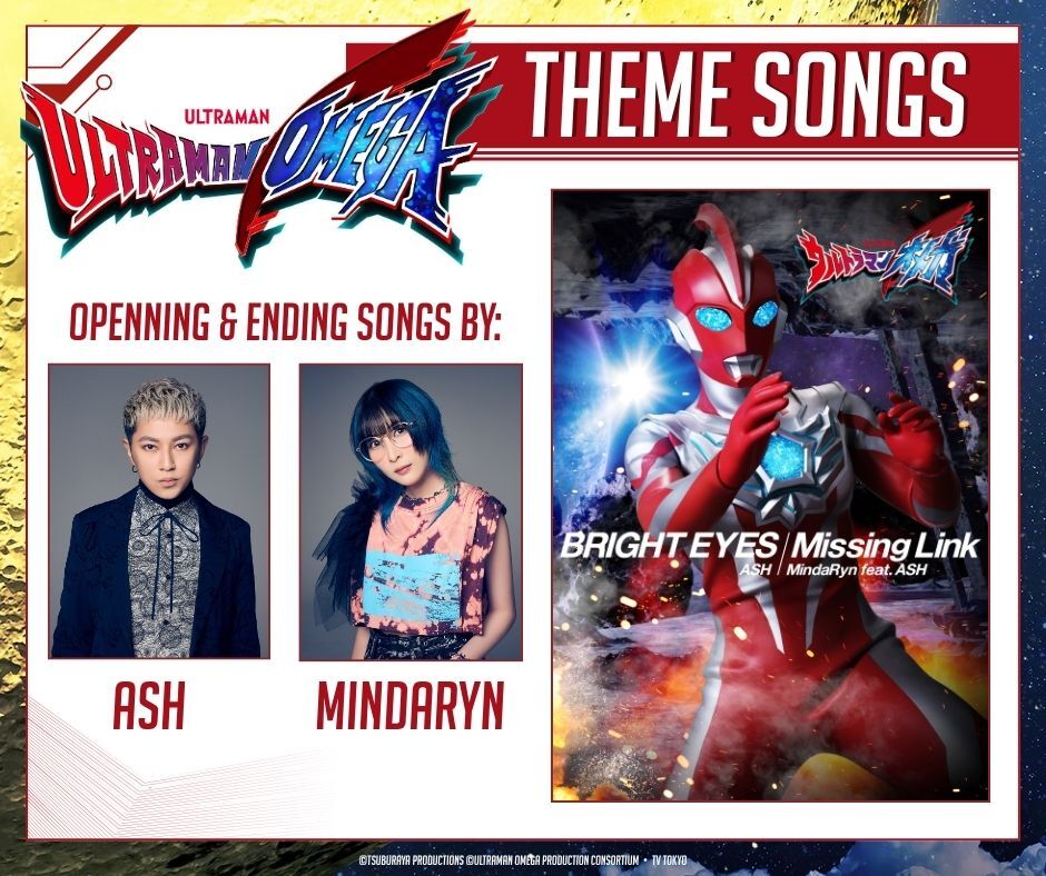 Opening: BRIGHT EYES by ASH Ending: Missing Link by MindaRyn feat ASH Score: NARASAKI https://tsuburaya-prod.com/news/8433 |