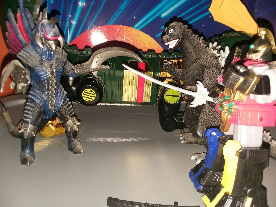 I took some photos, though they aren't the best, but I still tried to give some sense of scale by using a variety of different figures. Used the Dino Charge/Supercharge figures for the Dino Charge Megazord & Snide, the Dino Fury Doomsnake, Showa-Era Godzilla VS. "Final Wars" Gigan, and a large green dragon that nobody on this site could possibly recognize !The figure is pretty much a friggin brick, but a good looking brick. The paint apps are minimal at best, and the face appears flat. The fists turn, arms move up and down, thighs can twist, and that's about it. The sheath can detach and hold the saber. It's a debatable effort, but I personally judge it to be a passable one. |