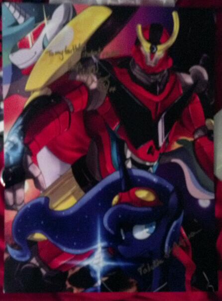 It's ok, take your time. Ok...aside from a few pacing issues, it was not badly written, and some fanfics are actually well-written. This. Anyway...you all spoiled it for Guncannon... So...EQLA haul. Gurren Lagann print, autographed by Nicole Oliver and Tabitha St. Germain: (OMG my real name!) From start to finish, I'm always at a Climax! I also found this little gem (from the same guy who drew me Den-O). Rainbow Dash mini print. Bead Sprites. So...many...pins... (top row is all pins from The World Ends With You). I forgot what I was gonna say because I'm trying not to bite my own hand off.