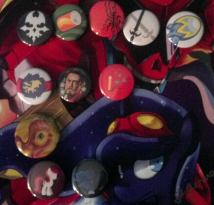 Anyway...you all spoiled it for Guncannon... So...EQLA haul. Gurren Lagann print, autographed by Nicole Oliver and Tabitha St. Germain: (OMG my real name!) From start to finish, I'm always at a Climax! I also found this little gem (from the same guy who drew me Den-O). Rainbow Dash mini print. Bead Sprites. So...many...pins... (top row is all pins from The World Ends With You).
