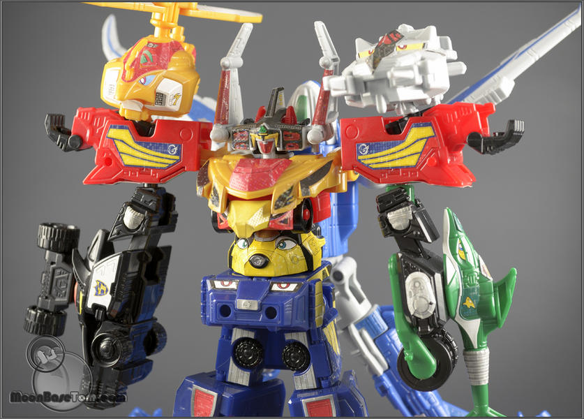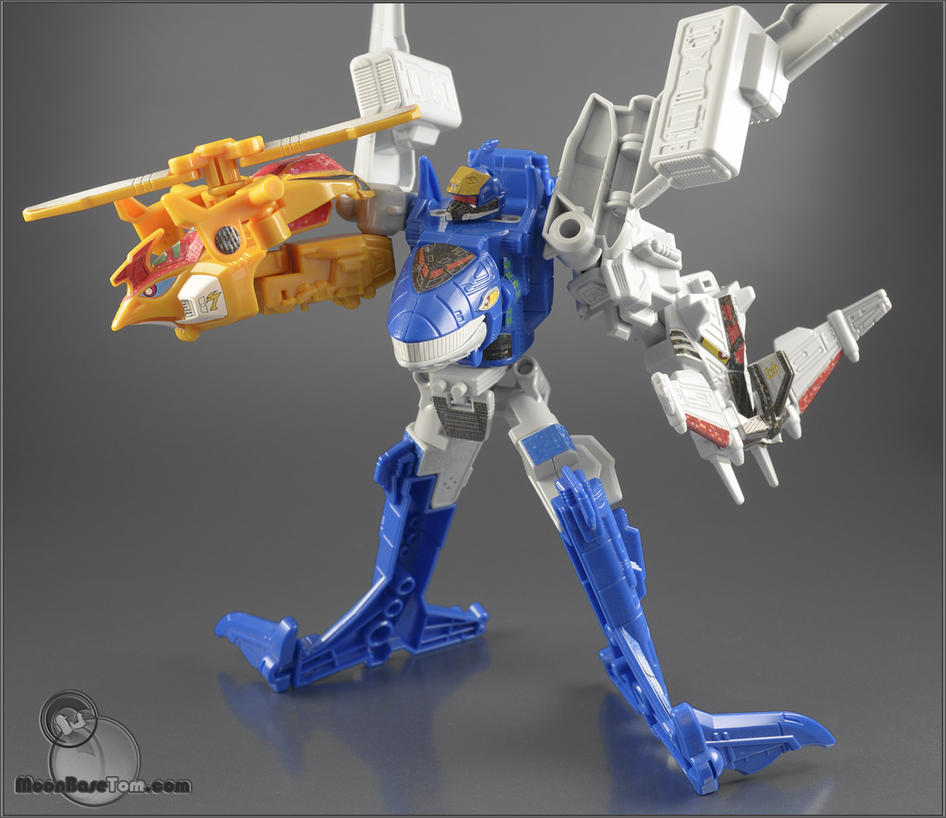 Ginnn! It's time for the Go-On Wing's team, from Engine Sentai Go Onger, to showoff! Jetras Toripter and Jumbowhale, along with thier human partners Go Gold and Go Silver, can combine to form Seiku Oh. These three engines can also combine with the previous six to for the mighty G9!