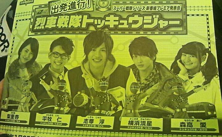 Our new Rangers are: Tokkyu 1 (Red)-Raito, played by Jun Shison Tokkyu 2 (Blue)-Tokatsuchi, played by Jin Hiramaki Tokkyu 3 (Yellow)- Hikari, played by Riria Tokkyu 4 (Green)-Mio, played by Ryusei Yokohama Tokkyu 5 (Pink)- Kagura, played by Ai Moritaka Looks like this new group is all aboard for their heroic duties! |