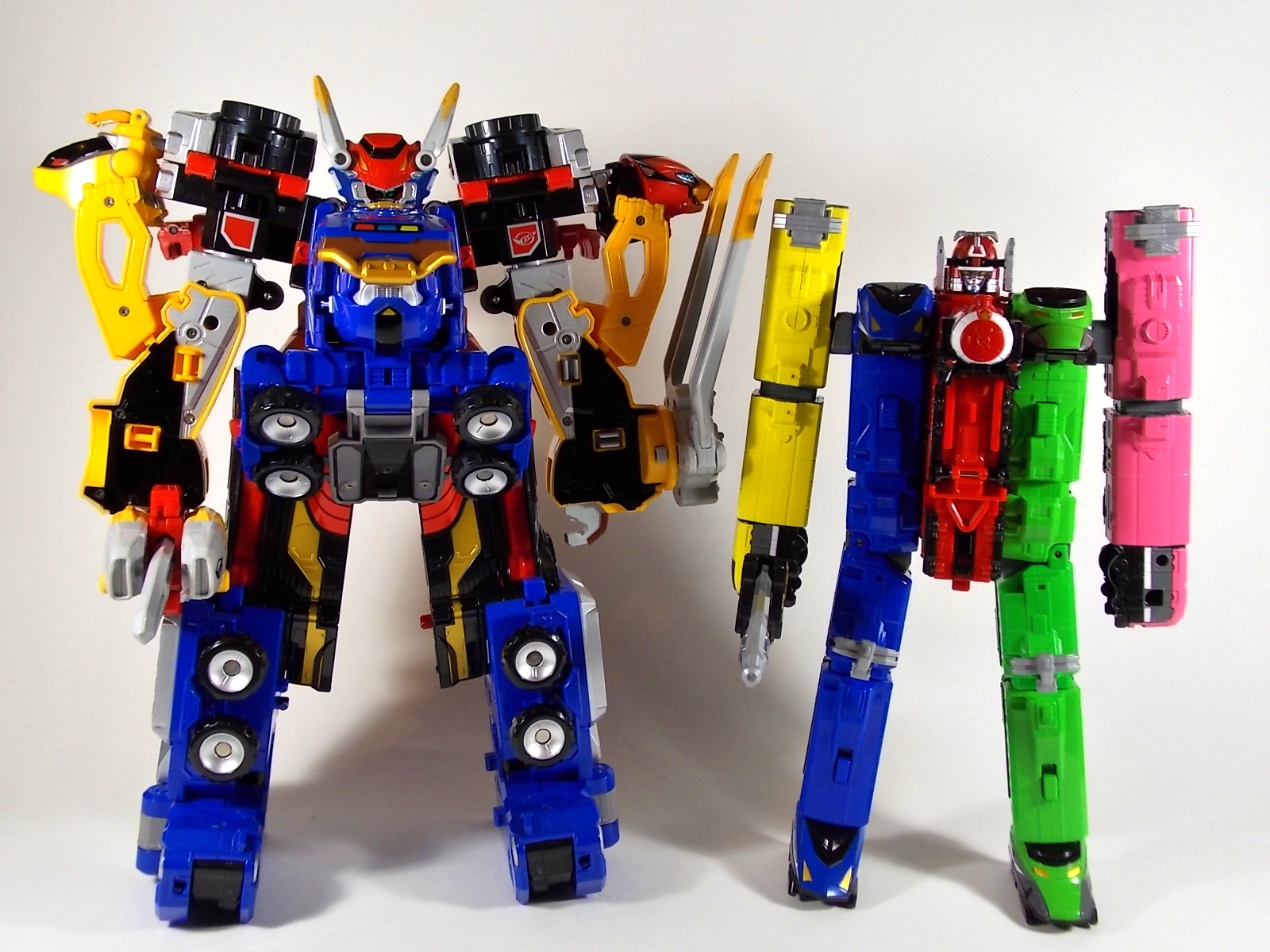 **We've got so many images that this bad boy takes up 80 images across two posts! Scroll down to the second post of this thread to see the second half! DX ToQ Oh is of course from everyone's favorite new train themed sentai, Ressha Sentai ToQger. And though we're only 3 episodes into the series it's already shaping up to be a really fun rider But enough about that, onto the toys! DX ToQ Oh is composed of the 5 main Resshas (trains) from the series. Red, Blue, Yellow, Green, and Pink Resshas. Plenty of people have expressed concerns that this mecha both on screen and in toy form is plain and simplistic. Let me assure you it is neither. To start with the Ressha's themselves are more complex than one would initially think. Out of the box they are each one long train piece with no moving parts. However, in the midsection of each Ressha is a really nice square connecting joint. Some pressure tabs hold these joints in place but I can safely say they are some of the sturdiest connections you'll find on a sentai robo. When released you can flip out an alternate tab underneath the peg that can hitch the two "cars" of each Ressha together. Thus giving them a moveable joint in the middle like the linkage between real rail cars. This joint is what also allows you to remove the main engine of each Ressha, to use them with the DX ToQ Changer. That's right, each forward section of the Resshas is fully compatible with the Changer. Small sets of tabs placed at varying intervals on the bottom of each car determine how the Changer detects them. Of course the secondary cars can not be used in this manner. But more to the point the joints in the middle of each train allow you to create one very long vehicle. These trains may be small but they more than make up for it in functionality. While the size has been a point of contention with this set, reasonably so, in hand you really don't notice. This set really needs to be seen in person to appreciate it. Neither my pictures nor baltmatrix's review can really get the point across the same way actually handling it would. To combine the resshas for ToQ Oh you can 100% mimic the TV counterpart. The Resshas line up in a row, then very nice very awesome sliding locks on either side of the Blue & Green Resshas slide right into place on Red. These are very firm connectors and Bandai NEEDS to use them more. Pink & Yellow have fold out peg joints to plug into the shoulder so that's pretty straightforward. Then we need to do the naughty bit of the transformation and fold up Red Ressha. Some traditional Bandai DX clips hold this piece in place but the ammount of force needed to use them is minimal. We probably won't see the same kinds of breakage occur like last year with Kyoryuzin. And in fact these clips are strategically placed all over ToQ Oh. We will most certainly be seeing some big combos when other Ressha are introduced. The clips on the bottom of both feet, the sides of the legs, and the tops of shoulders strongly imply this. Now you just need to fold the feet up and rotate the hands. The feet by the way have a pair of locks on them so they don't rotate while the robot is standing, much like DX Gosei Great. Again very smart, and very secure, thanks Bandai! Then rotate the shoulder pads down, stand him up, fold the second half of Red Ressha down, and pop the head up! Oh and open the awesomely detailed train "doors" that conceal the head, and ToQ Oh is formed! There's also the included train crossing themed sword Fumikiriken. Nicely enough it can be stored on Red Ressha while in vehicle form. Looking at this set as a whole I am impressed, damn impressed. Bandai has cleverly engineered this thing. It's as efficient as it can be and really pulls off the look of it's show counterpart. Could it have elbows? Sure, but then you would loose the separating pivoting joint the cars use in train form. Overall this is a very impressive piece that still stacks up well to the last few years of sentai DX robos. If anything it's size is indicative of much larger combinations to come just like the DX Go-Buster Ace of 2 years ago. I HIGHLY recommend you pick this set up. The Ressha modes are really well done with absolute mountains of detail and the Robo mode is a joy to see and handle. A+ Bandai!