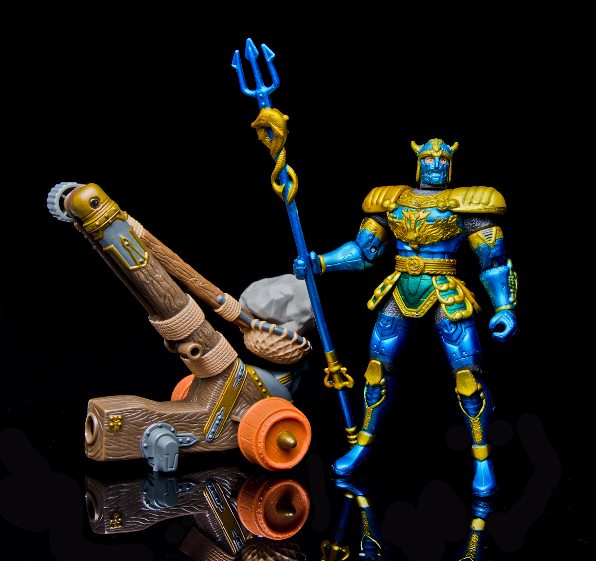 The Hailstorm Catapult comes in two parts, an 'all-terrain' vehicle and the titular catapult that hitches on to the back. The set comes with 7 pressure missiles, 4 of which can fit in the front and the other 3 fit into a quiver that pegs into the side of the catapult. The catapult comes with two 'boulders' that are somehow light yet dense. There's no spring or other fancy gimmick, you just load the catapult and turn a nob to flip the arm forward. Despite this, the catapult has enough force to fire the projectile a several feet. The front half of the Hailstorm Catapult also has bone-like blades that swing out with the push of a lever. The back of the box names these as the Screaming Scycles of Terror. The vehicle also comes with an 'Angus' figure that 'stands' approximately 4.75 inches tall. The figure only has 2 points of articulation although it has a lot of sculpted details, the paint applications are minimal. All of this is acceptable though as the Hailstorm Catapult is designed to fit the 5 inch line of Knights. The overall sculpt and paint of the vehicle is well done with the texture of the wood elements really shining through. Despite being a toy-line only vehicle, it has a lot of personality and really completes a Mystic Knights display. Last edited by conundrum; 03-25-2014 at 11:17 PM.. |