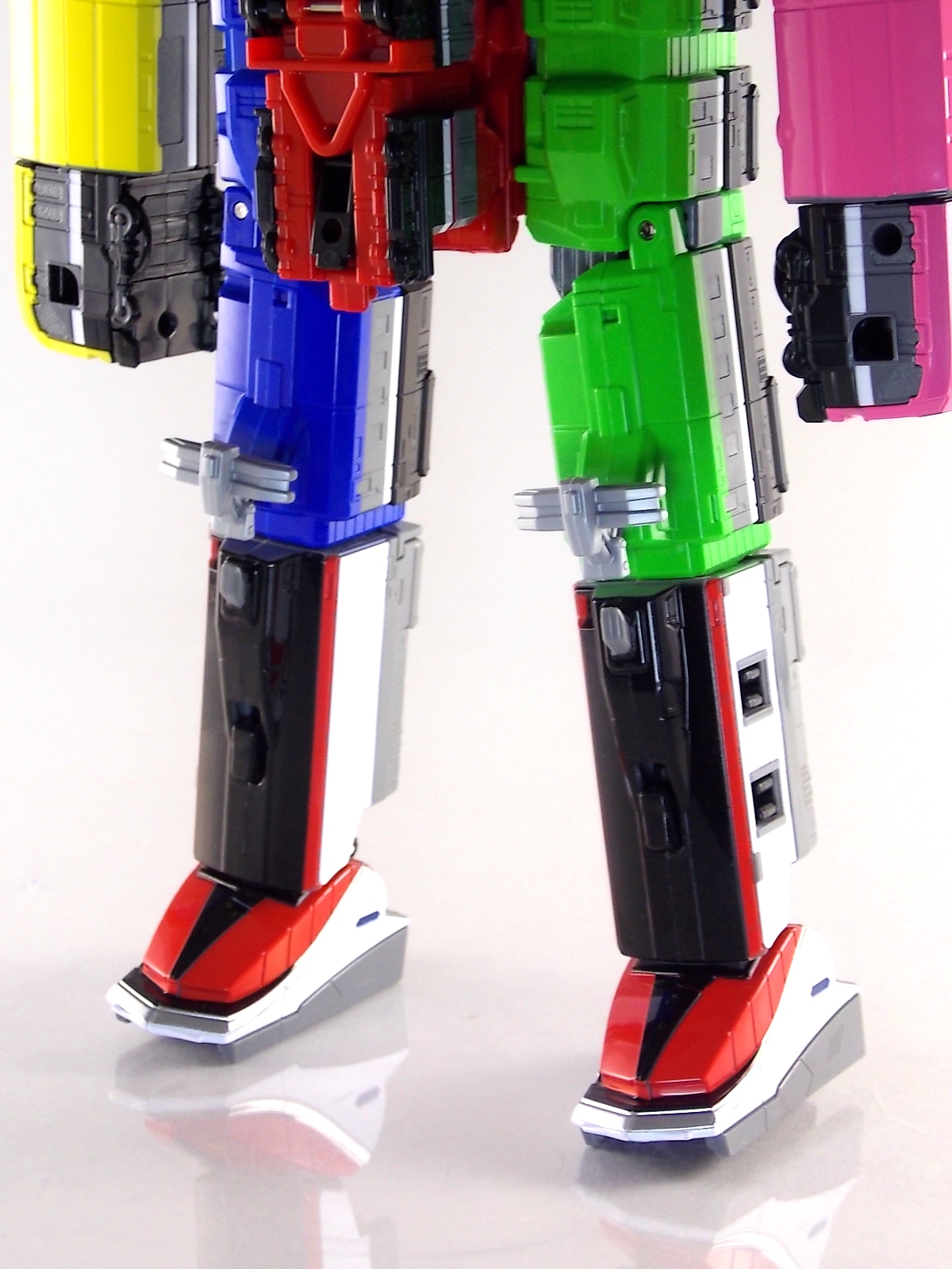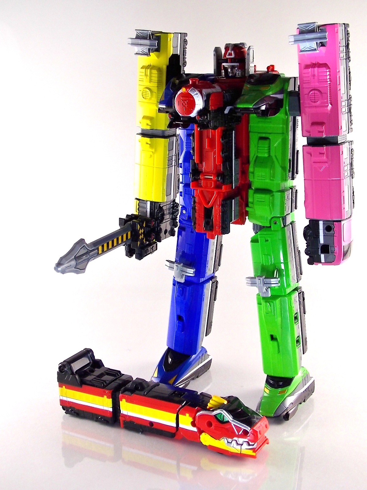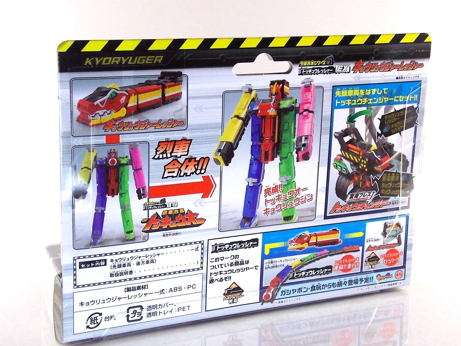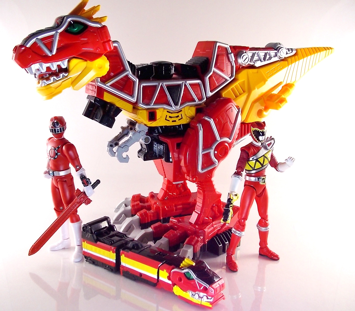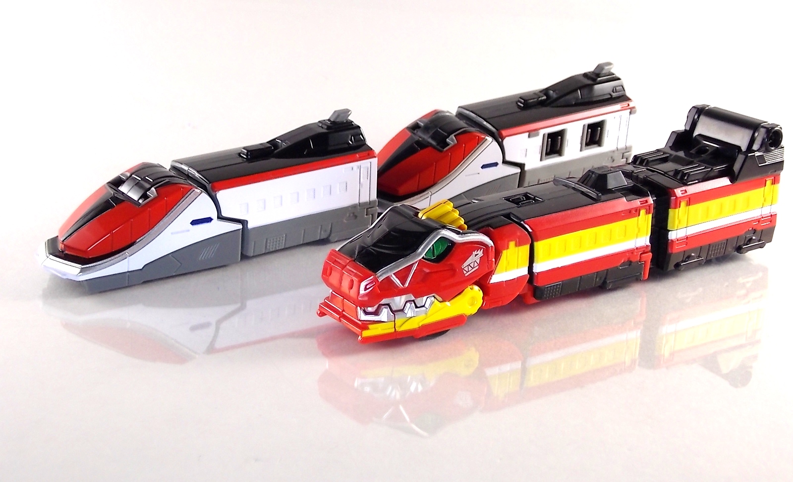 Today we're doubling up with the Ressha EX DX Kyoryuger Ressha & DX Den-Liner Ressha! Both of these unique add-ons for DX ToQ Oh feature prominently in the recent film Heisei Rider Vs. Show Raider: Kamen Rider Taisen Featuring Super Sentai! Each of them is also based on a Legend Hero. To start we have the Kyoryuger Ressha. At first glance it's obvious that this machine is clearly based on Gabutyra from Zyuden Sentai Kyoryuger. Each of these Legend Sentai Resshas so far has been modeled after the main piece of the main mecha from each series. So Gabutyra was the logical choice here. Kyoryuger Ressha is a crisply painted figure with some nice new details added to the generic ressha body. Interestingly Bandai gave it;s mouth the ability to open ever so slightly, though it serves no real purpose. This Ressha as with the Go-Busters one before it is a special 2-car vehicle. the 2nd "car" is merely a hiding spot for the combined mode head which is modeled after Kyoryuzin. Side by side this head with the real deal are a much closer match than the Go-Busters Ressha compared to Go-Buster Ace. Though due to the transformation they still don't have the natural feel the suits on film do. When combined in place of Red Ressha, ToQ Oh Kyoryuzin is formed! Sadly this Ressha does include Kyoryuzin's sword the Goren Zyudenken. However you can borrow a Zyudenken from your DX Kyoryuzin to complete the look. It's a tight fit but DX ToQ Oh can hold the sword! Den-Liner Ressha is next. If the name didn't give it away this Legend Rider Ressha is based on the Den-Liner vehicle from Kamen Rider Den-O! Easily the most intelligent merchandise induced crossover sentai has done, mixing two train themed heroes was a no brainer. Though Den-Liner Ressha comes off a bit simplistic. Seeing as these parts are merely replacements for the lower legs of DX ToQ Oh there isn't much to say. Each car faithfully replicates the look of Den-Liner at this much smaller scale. I've attached an image of the DX (gold ver.) Den-Liner to compare it to the size of the original. There's quite the difference between them. When combined with just ToQ Oh you create ToQ Oh Den-Liner. But when used simultaneously with Kyoryuger Ressha, ToQ Oh Kyoryuzin featuring Den-Liner is formed! This form being a fun inversion of the title of the movie itself. These new legs also happen to feature the same mounting clips that the standard Blue & Green Resshas do. So if you're in the mood to mix and match there are plenty of options. I messed around and came up with Cho ToQ Oh Kyoryuzin featuring Den-Liner. A mouthful but still fun to look at.