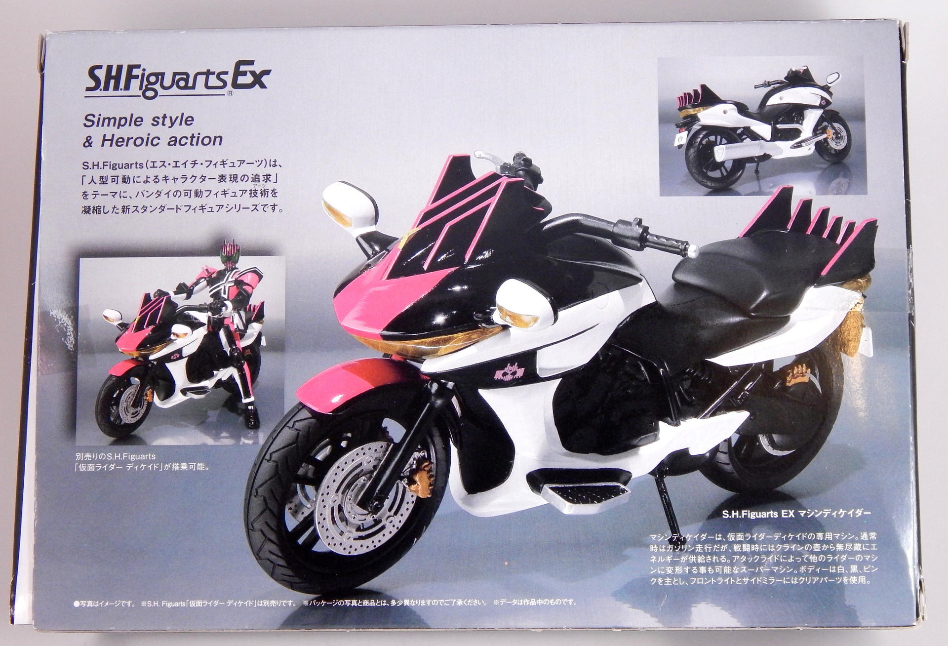 I don't quite recall this ability from the show, but the Kamen Rider Wiki tells me that Machine Decader, like Decade himself, can take on the form of other Rider's motorcycles. Sadly, this toy does not exhibit this ability, and only takes on the one form. It's probably just a ploy by Bandai to get us to buy the other bikes separately. The only gimmicks this bike does have are the free-spinning wheels, the slightly turning front wheel and handlebars, and the slight bit of suspension on the rear wheel. And the fold-out kick stand. Like most of the SH Figuarts bikes, Decader comes with a clear plastic stand to hold the bike upright so it looks like it's driving, replacement grips (I don't know why, they feel no harder or softer than the ones it has on to start with), and a pair of hands for Decade. These hands baffle me. Unlike those that come with say, Fourze, which are clearly specialized hands for riding the bike (two fingers extended to grip the break handle), the hands for Decade look exactly like the pair of weapon gripping hands already included with him. Seriously, as far as I can tell, I have three identical pairs of gripping hands, I can't tell which came with the bike, and which came with the two figure releases. So I guess I just have extras in case I loose some? Machine Decader follows the design scheme of its black, pink, and white Rider, down to his silly card-slats, on the front and back, as well as the yellow corner on the center slat. While an unusual look for a motorcycle, I rather like it on Decader. The bike is well detailed, such as tire tread, brake rotors and what of the engine is visible beneath the body. The paint on Decader is also quite nice, the lines between the pink, black, and white are clean and sharp, and little details like the silver brake rotors and the copper brake calipers help make this feel like a good quality replica. There are also three examples of the Decade logo on the bike: two pink-on-black on the front-side of the bike, and the last being black-on-white on the license plate. There are several bits of clear yellow plastic for the front and rear lamps, as well as the turn signals (on the mirrors). These sorts of details really help make this bike feel worth the price. Speaking of price, Machine Decader was a Tamashii Web Exclusive in late 2010, for around ¥5000. It makes only rare appearances on Mandarake nowadays, but it tends to still be in the ¥5000-¥6000 range. I bought mine from another collector a few months ago (who has hooked me up with several older, harder to find pieces) for around $40-ish. Finally, how does Decade fit on his bike? Pretty well. He's not too difficult to get pose on it looking pretty naturally (unlike Kamen Rider W who doesn't perch on his bike very well). These Figuarts bikes don't really do a whole lot and they usually come with but few accessories. In fact, they're really just glorified display stands, so paying $50-$60 can feel like you're not getting much for your money. But, to me they have been worth purchasing. I feel they really add a lot to my Figuarts displays, and some of them do have little extras, such as action features, or bonus accessories. While Machine Decader is not one of these with extras, I'm still happy to have it in my Kamen Rider Decade display, and I think you might too. And just for the record, for the shot where Decade is surfing on Decader, no stand was required to get him to balance up there. ![]() Related Galleries SH Figuarts Kamen Rider Decade SH Figuarts Machine Decader SH Figuarts Kamen Rider Decade Violent Emotion -coming soon SH Figuarts Kamen Rider Decade Complete -coming soon SH Figuarts Kamen Rider Diend -coming soon SH Figuarts Kamen Rider Diend Complete -coming soon |