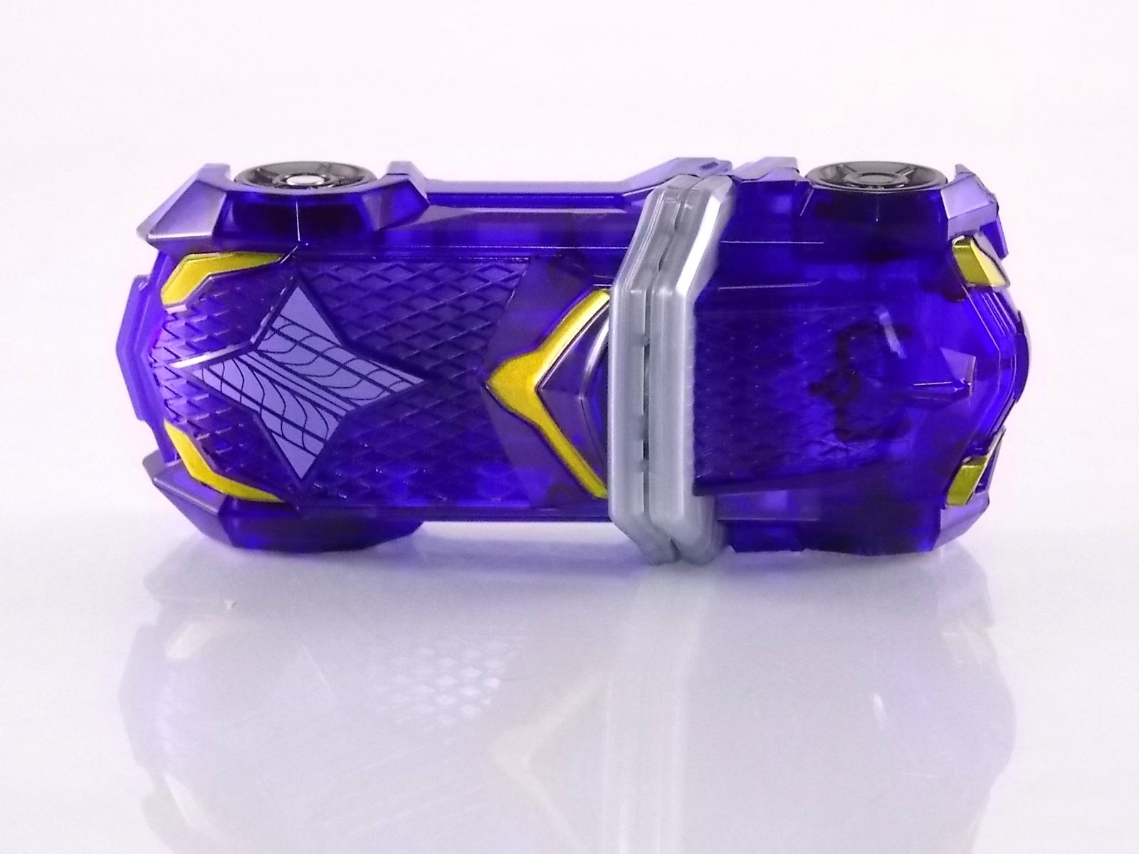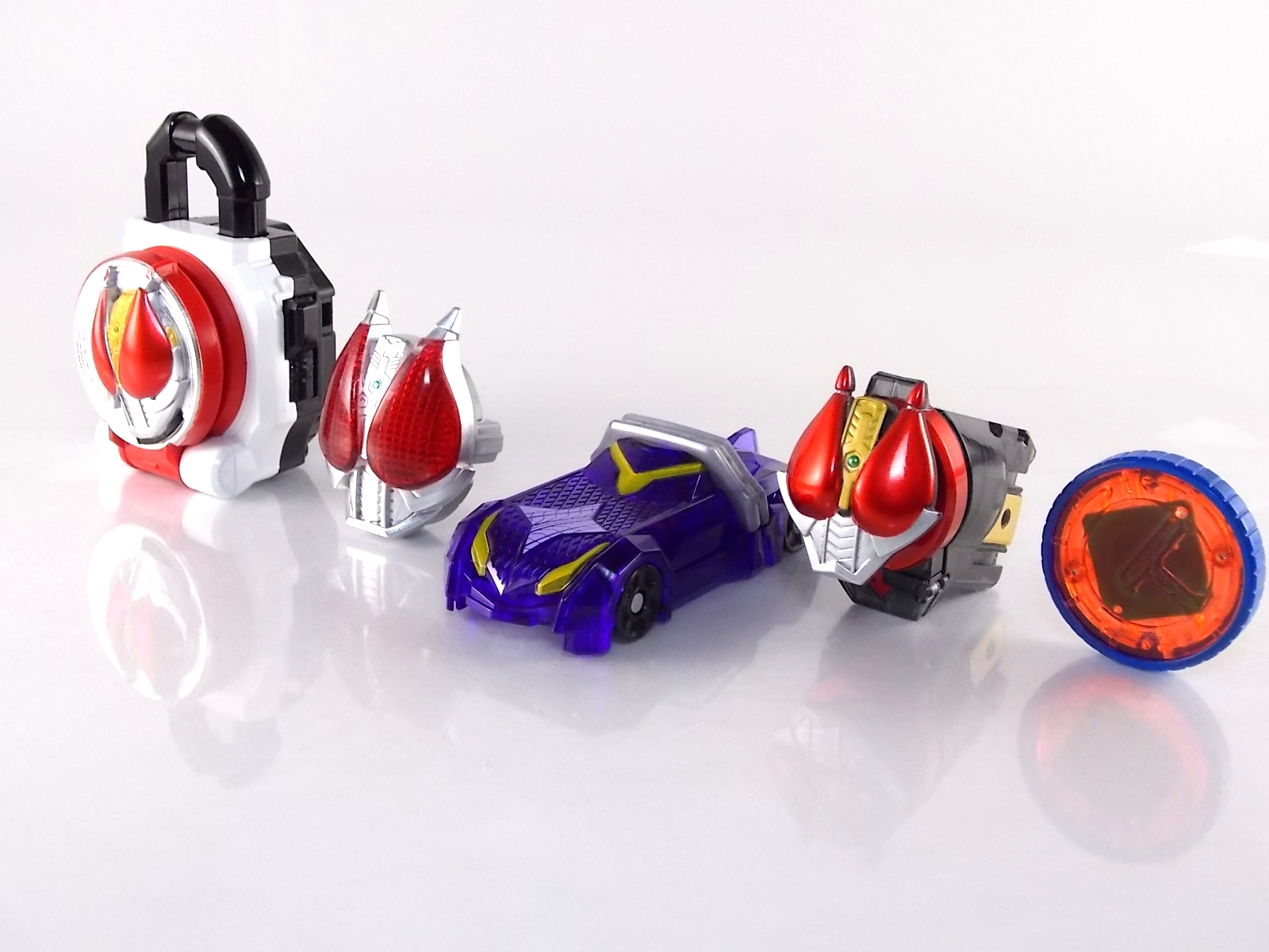 We're back with the 3rd in our series of Kamen Rider Drive galleries, DX Tridoron! Tridoron also includes the Midnight Shadow Tire & shift Car, and the 1st run bonus Max Flare Full Throttle Version Shift Car! Let's get started! **Before you take a looks at the images here please sure to stop by Baltmatrix's youtube page and check out his video review of Tridoron as well! Packaging For starters the box for DX Tridoron is HUGE. The vehicle itself is also huge, but that box. Now the only things really adorning th ebox are the usual sets of stock photos for action shots and features including the vehicles multiple transformations. I knew what I was getting when I bought it so the cross sells are lost on me but they do look cool. Now as you can see Tridoron is boxed in one solid piece, rather unusally. Sentai mecha tend to come in a few parts that need to be assembled, last years Gaim Suika Arms needed to be assemebled too. So pulling this beast out of the box in one piece was surprising. Tridoron The main focus here is of the Tridoron itself. As I mentioned above this thing is huge, a bit heavier than you might expect, and very sturdy. As has become the custom since the Neo Heisei era really began, there's always a big DX vehicle of some type that transforms in a fashion and is compatible with the gimmick line. W had Revol Garry, OOO had Ridevendor, Fourze had Power Dizer, Wizard had Wizardragon, & Gaim had Suika. Tridoron far exceeds all of these things. Tridoron's heft and size aside there's actually a fantastic amount of detail sculpted into this thing. Now it is missing some key paint apps that would otherwise make it look closer to the show prop, but it's a more than serviceable lookalike. I can't help but continually connect dots between Drive and various Metal Heroes. Tridoron is yet another link in that connection. This vehicle hearkens back to the large DX cars of old from shows like Winspector & Exceedraft. It really reminds me very much of Winsquad/Winfire specifically. Much like Drive, Triodon has 3 forms also named after Drive's. Type Speed- Tridoron's basic car form. In show this form is accessed when Drive henshin's. At the same time the front left fender retracts on Tridoron and the Type Speed tire is shot out. On the toy there is no retractable panel so it's always in default Type Speed form rather than the "civilian" mode. In this form as with the other two the cockpit actually opens! And it's fully compatible with Tire Koukan action figures and even S.H. Figuarts! Though the inner drivers seat may only seat one and take some liberties with the design it's still pretty great. Type Wild- tied into Drive's second upcoming form, Type Wild sees Tridoron completely flipped. First the entire core cockpit block is removed, then the front axle is rotated 180 degrees, and the car is flipped over. Making use of that second set of tires on the spoiler. Then plug the core block back into place and you've got Type Wild! This mean almost reverse drag racer look is pretty spiffy actually. And the black on the underside of the car helps convey this form's attachment to Drive's Type Wild. Type Technique- based on Drive's third form is Technique. This mode sees Tridoron fully transformed. Remove the core block as you did for Wild, but also fully detach the two remaining halves of the vehicle. You'll use a pair of clips on the underside of the rear end to attach that section at a diagonal. Then two large capture claw type arms fold out on the core block and it's reinserted on top of this new frame facing what would have been the rear bumper. This form is a bit silly looking to be honest. The only thing that really connects it to Drive's type Technique are the hints of green on the claw arms. In all 3 forms this vehicle is imposing. As comparison images show it's huge. Much larger than most SHFiguarts or DX bikes. All 3 forms can also make use of the "Tire Extension" gimmick which has a hint of Tire Koukan. The rear of Type Speed can accommodate Shift Cars! There's a switch for electronic sounds on the bottom of the core block that when flipped will allow for Shift Cars to trigger sound effects with Tridoron. Simply slide them into the space behind the canopy. Though sadly they don't lock in place, there's really no situation where you'd use one and the card wouldn't be on a relatively flat surface. Each of the 6 wheels on Tridoron can also accommodate Tires! Any Tire Koukan Tire released will fit on any wheel on Tridodorn and may be mixed and matched in any fashion you choose just as in the show. With figuarts on the way this gimmick integration may give some collectors the perfect reason to keep TK figures and the DX vehicle(s). Accessories Included with DX Tridoron are two standard accessories and 1 first run pre-order bonus: 1 - Midnight Shadow Tire. For use with your sold separately TK-01 Drive or with the DX Tridoron it's included with. It's a fairly generic translucent purple tire with some pretty small "blades". For a shuriken tire it's definitely lacking in the looks like a shuriken department. 1 - Midnight Shadow Shift Car. Cast in a gorgeous translucent plastic with just the right number of paint apps. This is my first experience with a Shift Car and I must say it makes me want more. The rotation gimmick is solid and these things are easily bigger than the last several years worth of collectible trinkets. In fact they're bigger than your average toy car. 1 - Max Flare Full Throttle Version Shift Car. This is the previously mentioned first run/pre-order bonus that some retailers have included with DX Tridoron orders. Mine very surprisingly did include it as I was never given any notification or indication that it would be included. But a happy surprise none the less. This if by far the coolest shift car I've seen, gorgeous mix of translucent plastics and lavish paint apps make this one a must own. I do not own the standard Max Flare for comparison. Of course either of these shift car