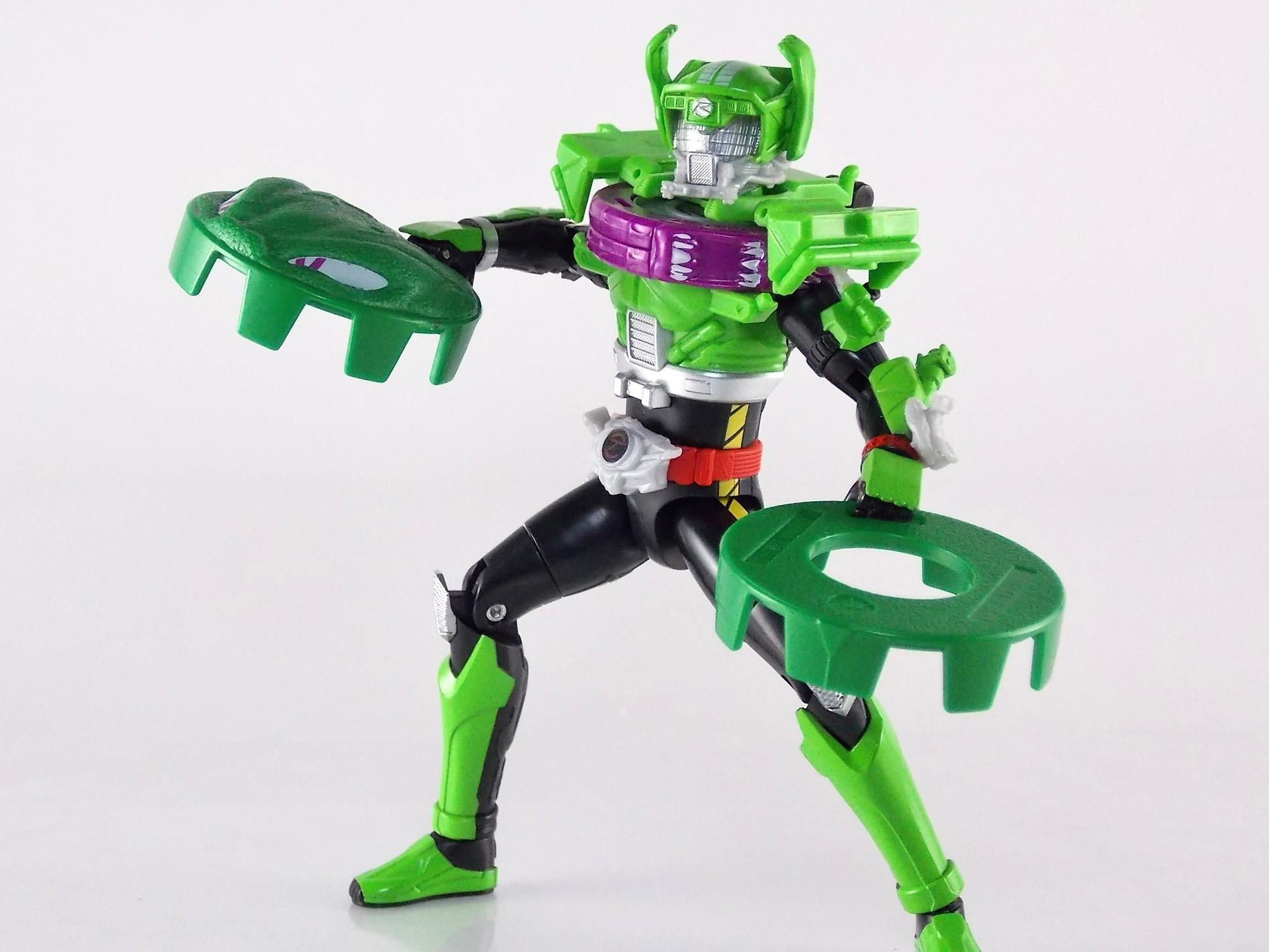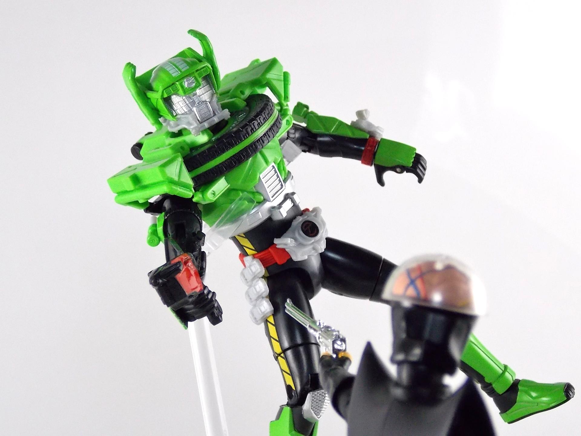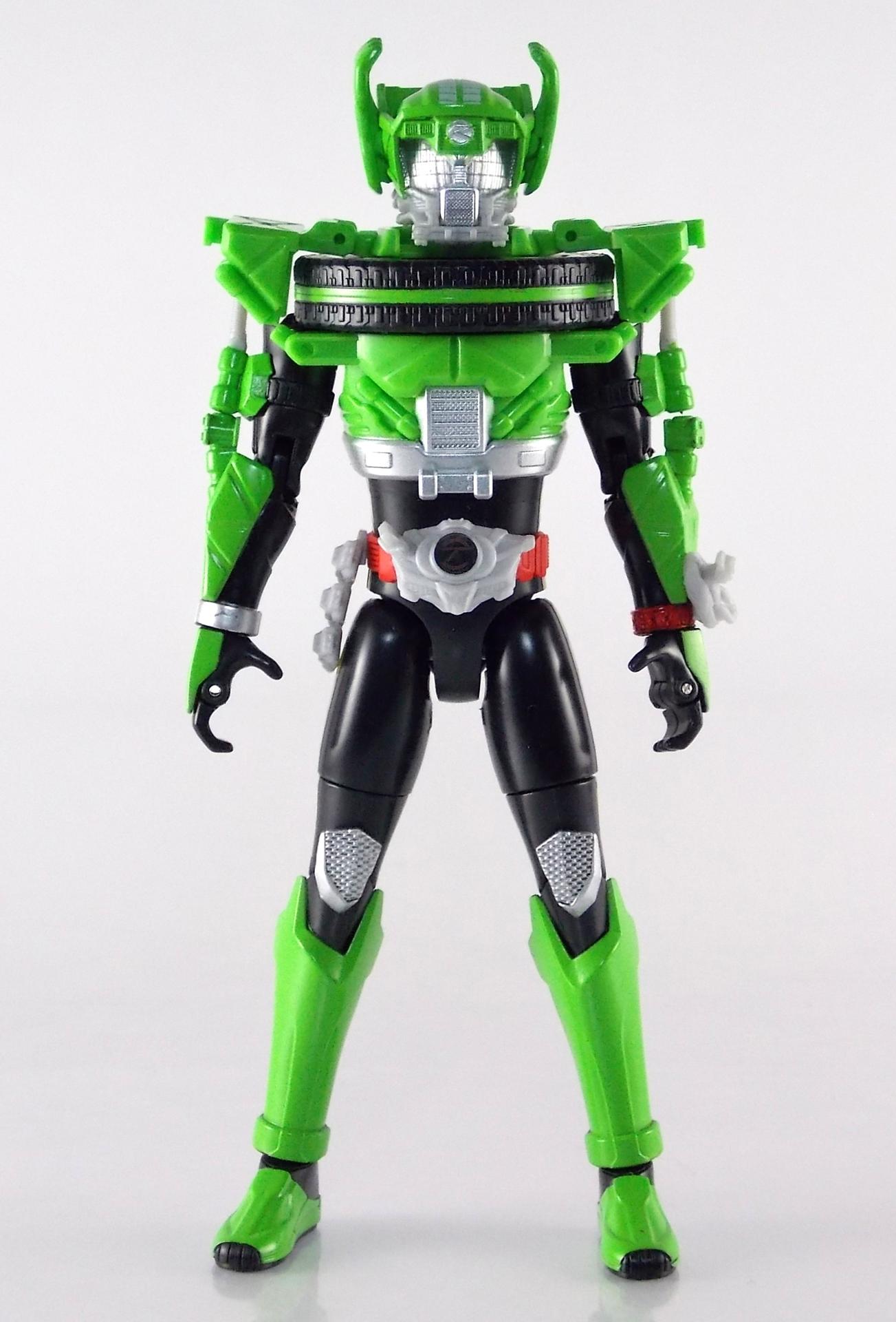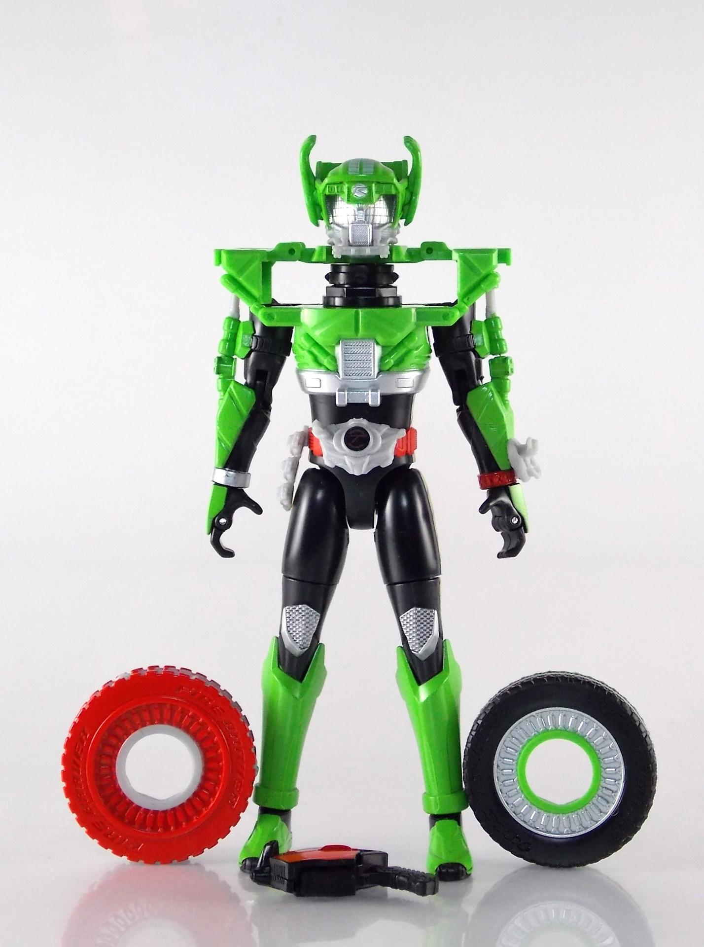 The figure looks good and seems to fit with the rest of the line. I don't like the tire whiplash collar. It looks like if you squeezed his legs he would shoot little discs out. The look just does not seem to fit the other 2 forms. I am behind on the show so if this form has shown up yet I have not seen it. Perhaps on the show it looks better but so far this is the weakest of the suit designs. Still digging the toy line and the gimmick this year.
