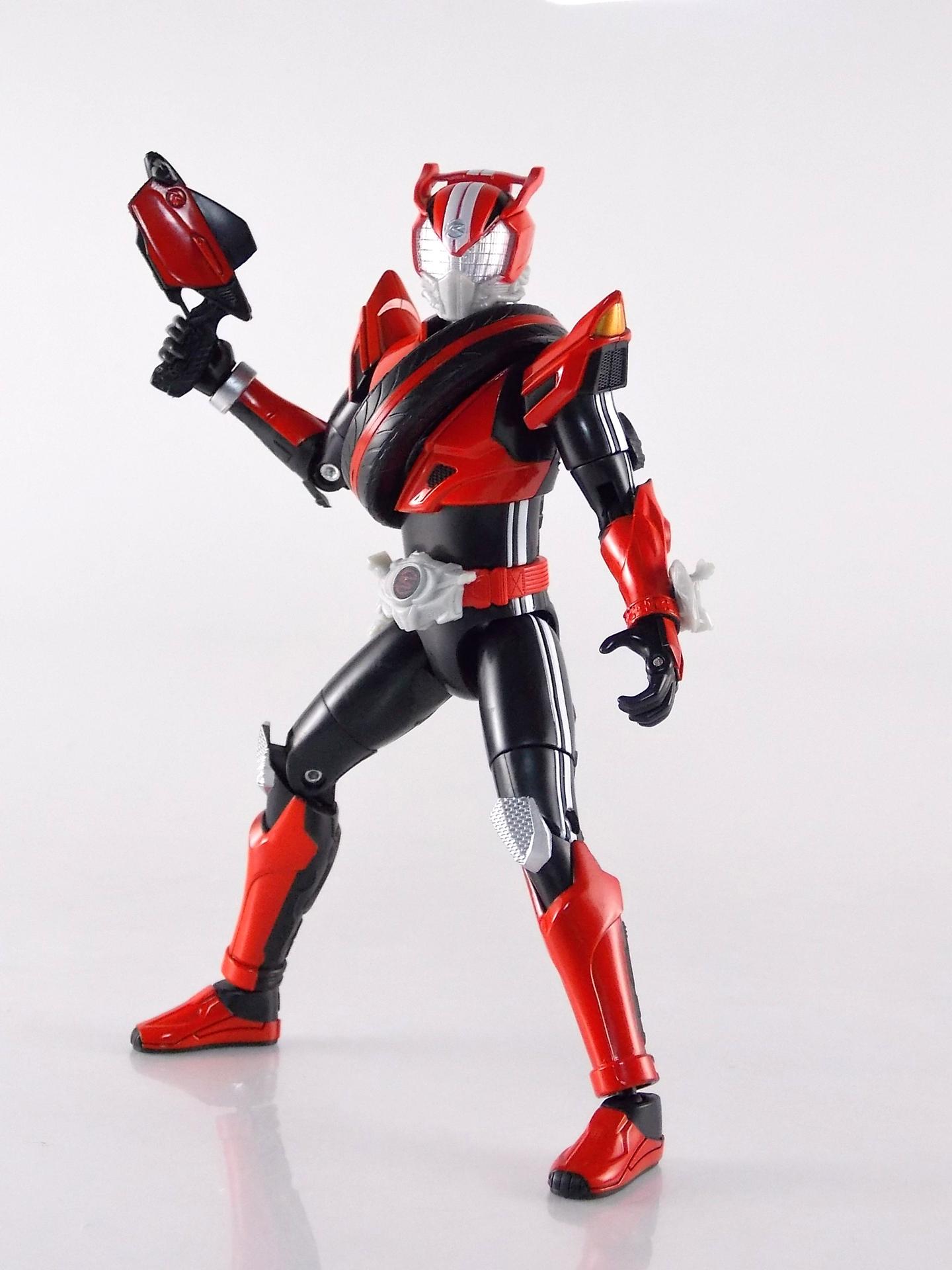 TokuNation is in gear with more Kamen Rider Drive! Continuing our series of Drive galleries we're looking today at the 5th Tire Koukan release, TK-05 Kamen Rider Drive Type Technic! Don't forget to check out the video review of this excellent figure by my man Baltmatrix as well! Packaging Much like Drive Type Speed and Drive Type Wild, Type Technic comes in a nice slim box with one diagonally rounded off side. Collectors of the line have nothing new to see here other than the obviously new stock images for Drive and some of his newer tires. Much like Type Wild, Technic is packed as one solid figure rather than two halves like Type Speed. This is of course due to how the Tire Koukan gimmick has changed for this Type. Main Figure Kamen Rider Drive Type Technic has been pretty divisive actually. A good number of people either love or hate the suits design, I'm firmly in the camp of loving it. But let's explore how this figure lives up to it. For the lower half of the body this is much of the same figure you already got with Types Speed & Wild before. But let me tell you that torso and head are entirely different beasts. Type Technic moves the TK gimmick once again, this time to the rather odd chest area. In order to utilize it you need to hinge back the upper most part of Technic's torso on the arm connected to the back. The shoulders, upper chest, and head are all connected. Then insert a tire, most likely the standard Type Technic Tire and here you have the figure's completed look. Let's start with positives. Despite having a pretty funky version of the line's gimmick the Techinc doesn't suffer that greatly from it. You'd think there'd be no shoulder movement, but there's a ton of it. The shoulders are set on ball joints just bellow where the edge of a tire rests and they have some pretty decent motion. Some false cables are molded on to the upper arms simulate the connection to the shoulder pads as well, the pads themselves can hinge freely for a full range of movement thanks to the upper body's transformation. The sculpt is also spot on for this guy. As always right down to the intricate undercarriage detailing on the back and the exquisite head sculpt. The drawbacks of the design are that, sadly, you can't do "Drive stacking" with this figure. Type Wild offered the hilarious possibility of attaching Type speed to his shoulder because they share the same universal connector. For some reason Type Technic has an entirely different connector on that chest peg meaning you can't do that. It's an incredibly odd change. What this also means is that for tires like Dream Vegas, which require the version 1 connector to be able to stack parts, are incompatible with Type Technic. Now the chest is designed gloriously to allow any of the Tires with moving or protruding bits to still work seamlessly with Technic. The shoulders really are aimed at allowing you to use any tire. However because of how the upper chest swings backs on a single joint hinge, anything thicker than one tire will essentially not work on this guy. That being said it isn't necessarily the point of this figure to be able to accommodate things such as stacking. We've all had our fun with Type Wild but we have no indication that stacking the 3 pieces of Dream Vegas on there or putting Type Speeds torso there, will ever happen in show. So expecting that same kind of compatibility with Technic doesn't necessarily make sense. But it would have been fun. The head also has some pretty limited up/down movement because of the lip around the neck. Accessories Included with Drive Type Technic are several key accessories: 1 - Type Technic Tire. This is of course the main tire necessary to complete Technic's look. 1 - Door Gun. The second standard weapon of Kamen Rider Drive, the Door Gun made it's debut before Type Technic in the show but as with Type Wild and the Handle Sword this was included to sort of sweeten the deal. It's actually not too shabby. Much like the Handle Sword it's fully functional! Though it required only a single hinge to be able to do it the Door Gun opens and closes just as it should. A nice touch in all honesty. 1 - Fire Braver Tire. This new tire made it's debut in episode 9 of Kamen Rider Drive and as the name implies it's based on a fire rescue vehicle. Fire Brave is a fairly creative new tire with a folding "fire ladder" styled arm that can collapse along the inner indentation of the tire. Allowing it to not only fit perfectly inside of Technic's chest, but also to allow for variation of length of the arm for display. The arm itself is physically a bit weak and can pop apart from time to time, but it's inclusion here is a nice bonus. Final Thoughts As before with Types Speed & Wild, TK-05 Kamen Rider Drive Type Technic really does sell me on this lines gimmick. I think this figure is so far the best proof yet that the design detail of Tire Koukan continues to exceed that of Arms Change with a far less obstructive gimmick. Tire Koukan may seem simple but it's intelligently implemented in these figures and is actually a lot of fun. Negatives aside Type Technic is still a really interesting design and a pretty great figure. Nice Drive!