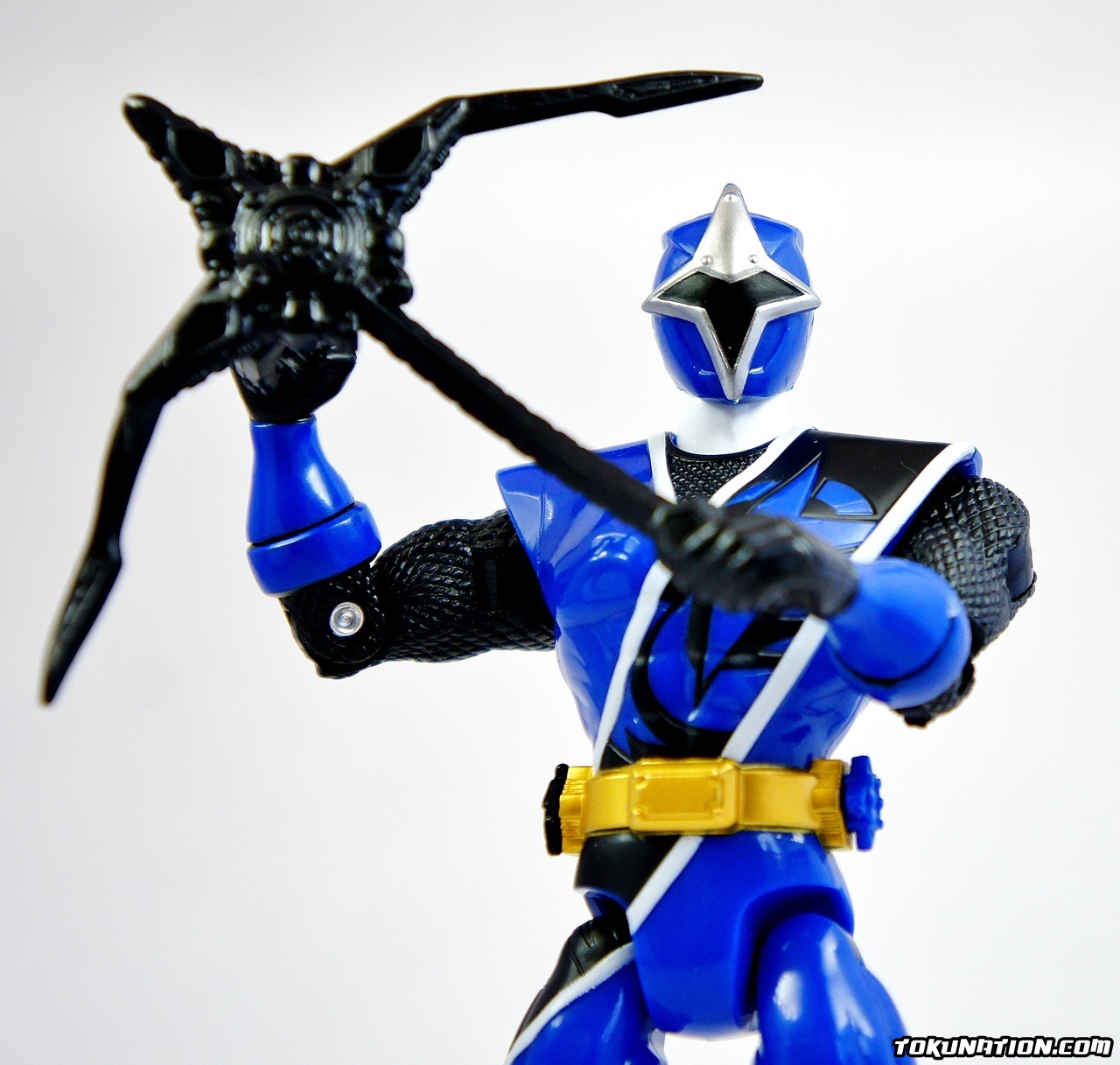 I guess it's important to note really quickly on this figure that it is exactly the same as the Aka Ninger gallery that we did just the other day. The only differences are the helmet, a shuriken on the belt (see a picture), and obviously the color. Otherwise these are the identical figures, so this review is not going to be very long. The Figure The figure is using the Bandai of America styled molding for the overall figure, making it abnormally muscular and causing the figure to have issues trying to stand up straight (SO BUFF HE LEANS!). The only difference from either of this figure's co-releases, Aka Ninger and Ki Ninger, are the colors, a shuriken on the belt, and the helmet. Otherwise these figures are exactly the same and feature the exact same issues, pro's, and con's. The one thing I didn't point out in the past review that I did make a point to take pictures of in this gallery - I absolutely love the detail on the helmets. They each have the shuriken symbol molded in to the side of the helmet and it adds a nice touch. The Accessories Like with Aka Ninger, this figure also comes with the Ninja Ichibantou, the Gamagama Gun, but it has a different form of the Karakuri Hengen - this one is in its bow form! I want to tell you that this makes up for any shortcomings in this line of figures but alas, it is soft plastic, bent coming out of the package, and is awkward to try and hold (see pictures). Another missed opportunity in the accessory line. I think my biggest sticking point for the accessories is the fact they chose the color black. Was this to make it easier for people to custom paint it? Not a single accessory in the show is primarily black - you have a blue Gamagama Gun, a red Karakuri Hengen, and the Ninja Ichibantou is a conglomeration of colors made up of red, black, and mostly yellow for the sword. So why choose black? I don't get it. The Final Verdict I don't know if I'm being hard on these figures because we are used to expecting more out of Bandai Japan or if because they really are slightly disappointing. Either way, unless you enjoy these 5" figures with 15 points of articulation and soft, bendy unpainted weapons then you can pass on these and not lose any sleep. If you're in to completing toy lines or having good representations, these aren't bad but I'm almost willing to bet the vinyl figures are more closely attuned to what the character looks and feels like in the show. Either way - these are affordable and I imagine will be readily available to purchase at any point over the next year. If you have an extra $40 to $50 to spare after shipping - go ahead and give them a shot if they look cool to you. Otherwise you shouldn't lose sleep not picking these figures up.