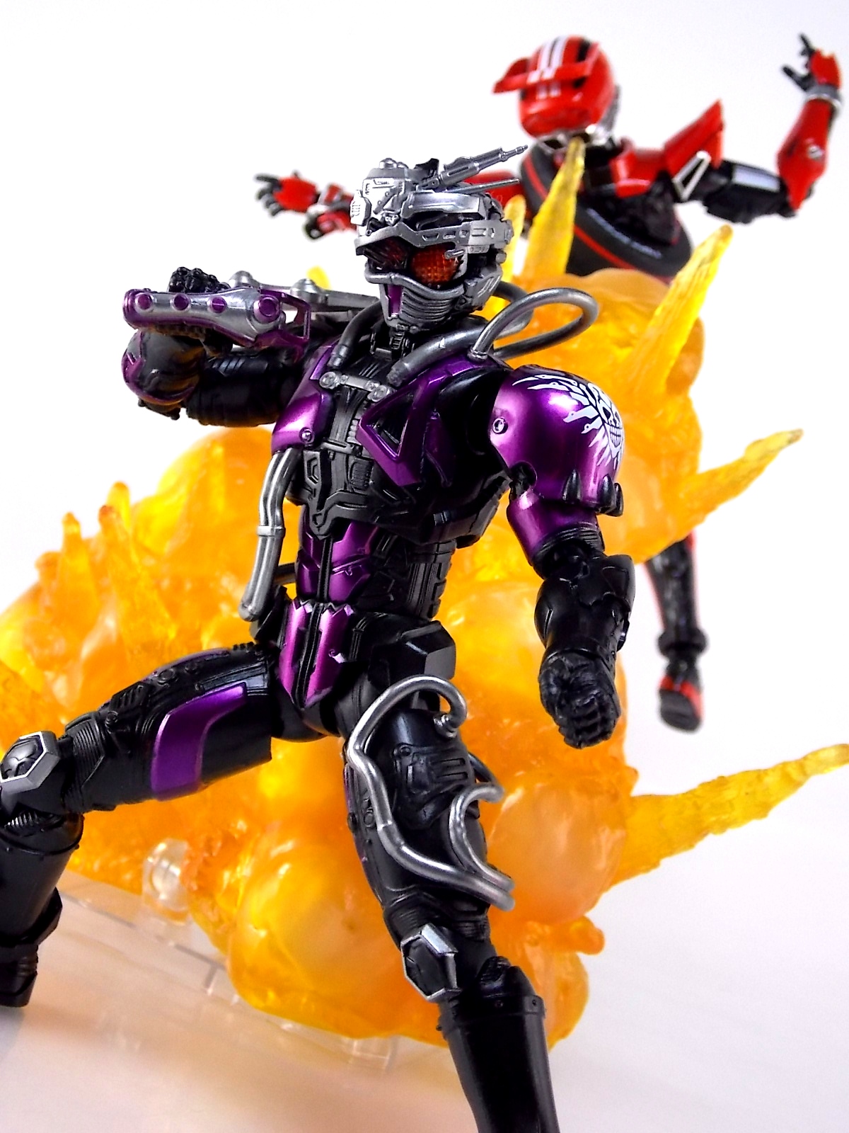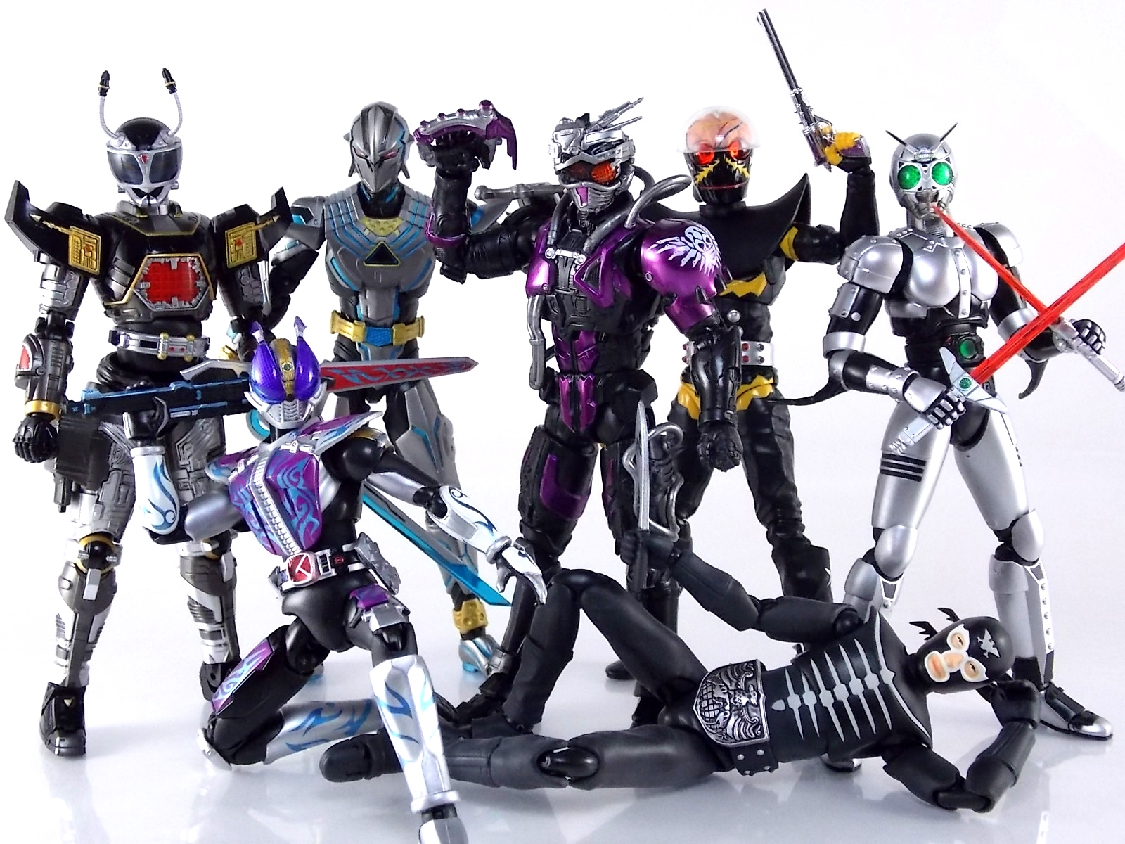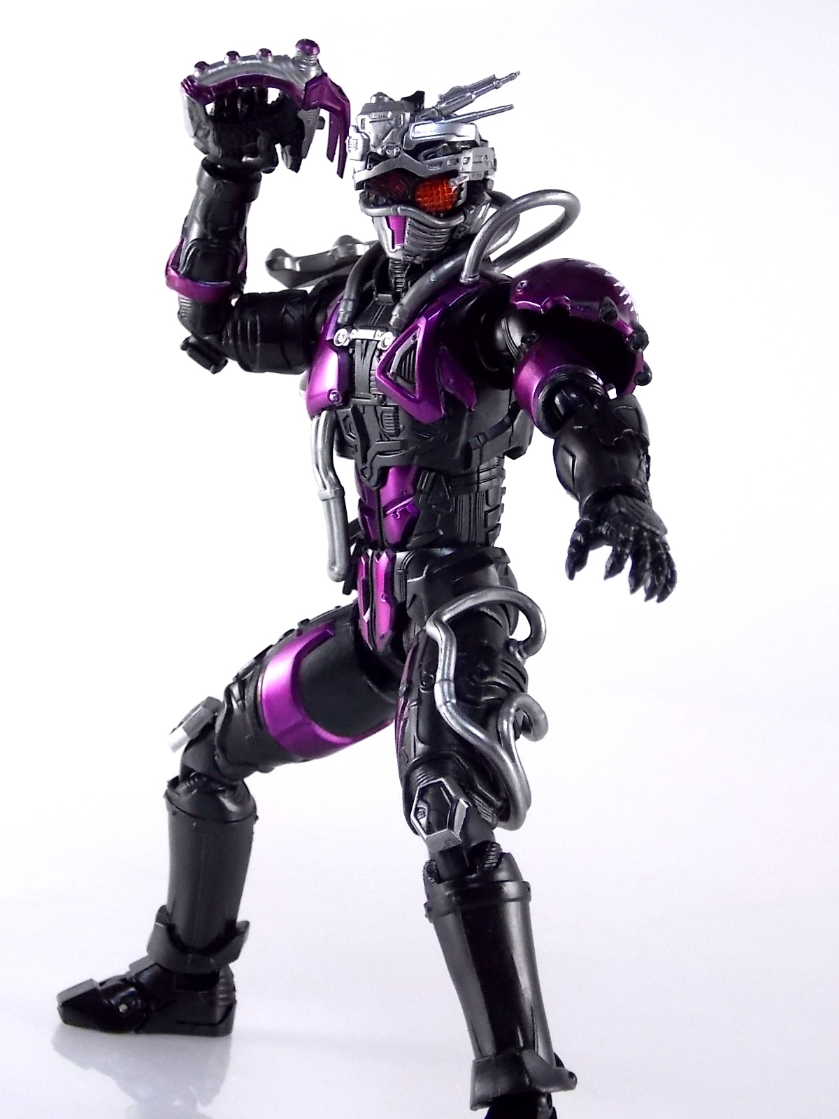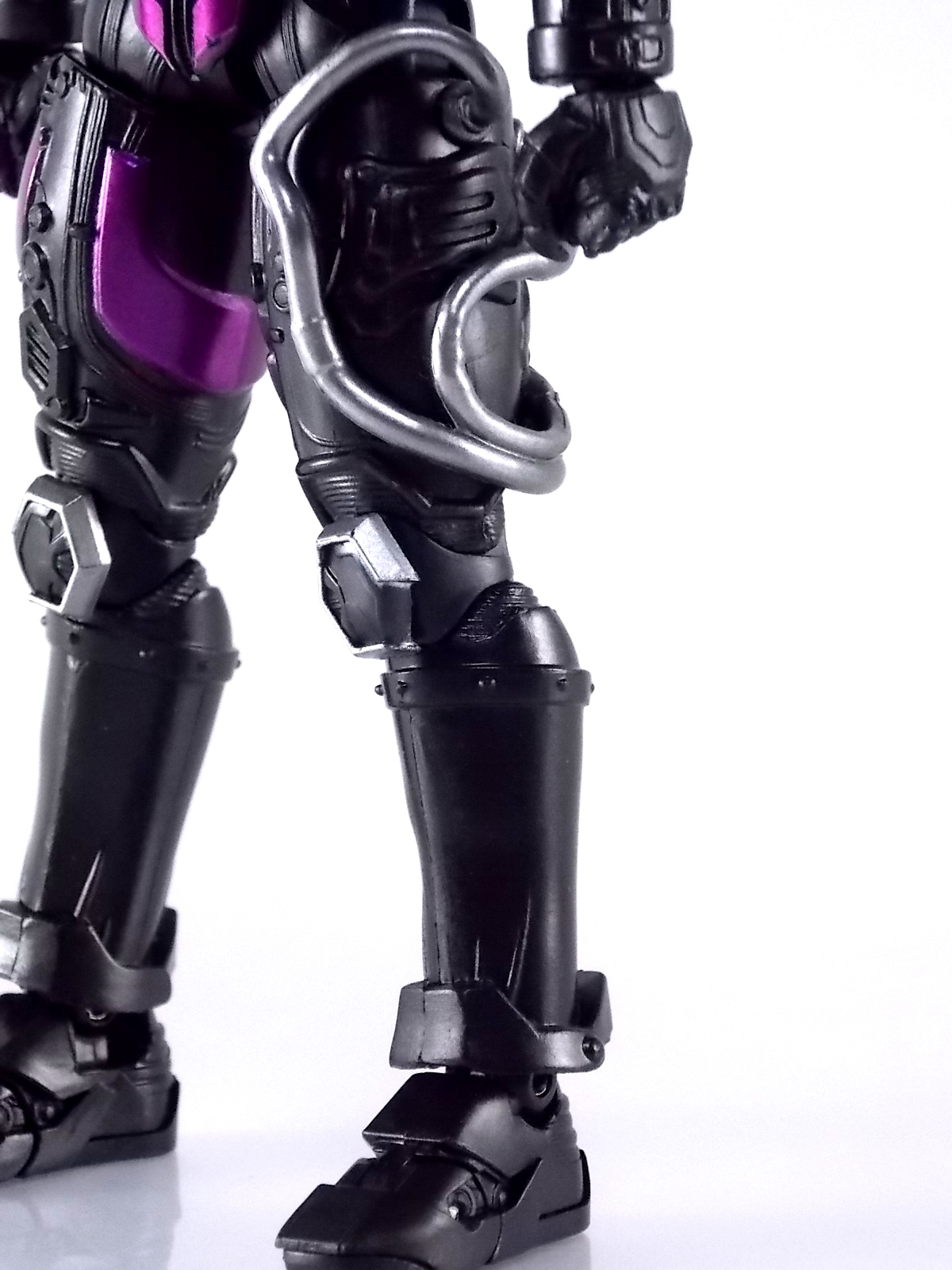 Cue the wicked guitar in the background because an incredible figure is officially in the foreground! Having debuted all the way back in Kamen Rider Drive episode 3, the one and only grim reaper of the Roidmudes is finally brought to life in collectors' toy form as S.H. Figuarts Mashin Chaser! Packaging S.H. Figuarts Mashin Chaser has followed the lead of Drive Type Speed and other recent releases and gone with a slim style box. Seemingly the new standard for mass retail and even some exclusives going forward, I have little new to say about it. As with Drive the theme of this season carries over well to the new box and it's decorated with some very awesome Mashin Chaser artwork. Aside from that and some stock photos of the figure, there's nothing new to report. Main Figure The bulk of this review consists of Mashin Chaser himself, we'll break down accessories a little further below. Chaser is a brand new mold in this fledgling line. If there's any parts sharing with Drive, it's definitely not apparent. But given Mashin Chaser's incredible asymmetry he should be his own unique beast. While Mashin Chaser looks gorgeous let's get something out of the way right now, he doesn't feature a ton of paint apps. Because he doesn't need them. The base figure is primarily black as he should be. Armored components are painted both metallic purple and silver where necessary and the grey piping on his body is molded in the appropriate color from the outset. So while Chaser may not seem to have as many paint applications as other Figuarts, the details are all present. Back to the asymmetry though, Mashin Chaser is probably one of the more elaborately molded Figuarts ever. Each thigh is unique, both forearms, both shoulders, his chest, head, everything really. While Drive was asymmetrical for different reasons he now seems very much more neat and orderly compared to Chaser. Mashin Chaser is really the embodiment of chaotic elements here compared to Drive. And thankfully the sculpt of the figure has capture this perfectly. The head is by far the most interesting part of the figure. There's just so much techincal detailing put into it that it's astounding. There's a bit of a gap issue through the middle of the head on mine, but otherwise it's fantastic. And those eyes, just some of the best compound eyes I've seen on a rider figuart in recent memory. By the way those tubes I mentioned above? They're made of an awesomely flexible plastic so you're much less likely to break them. And awesomely they don't impact the figure's range of motion at all. Because of the way the torso tubes are connected to Chaser they run the length of his torso and down to his waist but loop back up and attach to his back. So you don't have a rigid connection to the waist that would hinder movement. Sadly there are 2 things that hinder the arms. The shoulders. Though Mashin Chaser really does have a full range of motion, his shoulders are poorly designed. Though both have ball jointed pads on them the way the shoulders are designed prevents you from lifting the arms up and fully out perpendicular to the body. The shoulders can be pulled down and out but when you try to gend them back and up the sheath around the shoulder impacts the torso. Rather than being able to put his arms in a 90 degree angle you get more of about 80 degrees. So it's a bit hard to create iconic poses with the Break Gunner out to the side. The head is also unencumbered by the pipes on the shoulders, though the collar around the neck can be a pain. Otherwise the figure is incredibly solid, though I have one minor complaint about his back that I describe below in the Tire section. Accessories The pickings are a little slim, unless you ordered the 1st release of Mashin Chaser with the 1st run bonus! 1 - Brake Gunner. The trademark weapon of Mashin Chaser, the Break Gunner is scaled down to perfection here. While it's non-functional in the sense that it doesn't have moving parts, the guard on top can be removed to reveal a plug for Shift Cars! So any of Drive's standard non-flipped shift cars can be stolen or "tuned" by Chaser. Though the other half of tuning doesn't quite pan out, see Midnight Shadow Tire below. 3 - Sets of additional hands. Pretty standard fare here. Open hands for menacing stuff, one set to hold the Break Gunner in either hand, and a set of bike riding hands! These are a seriously welcome inclusion as many modern figuarts generally don't include them right off the bat. 1st Run Bonus 1 - Midnight Shadow Tire. Much like the Max Flare Tire the Midnight Shadow Tire, like all others in this line, can break apart into several component. The front and back halves can be clipped onto Kamen Rider Drive's chest or another compatible future release. This allows for a damn near seamless high end version of the Tire Koukan gimmick. The Hub section has a peg hole on the back of it that yes conveniently works with tamashii stage arms, but moreover it's meant to let the tires be used by the upcoming Tridoron! The paint on Midnight Shadow is pretty hit or miss though. It's a really thick grainy paint that they went with, not glossy at all and it feels quite cheap. And sadly it's poorly applied on several parts of my Tire. Connection points are also painted in this way so I'm sure it will flake off with repeated use. Sadly however Mashin Chaser is incomparable with the Tires as is. There is a removable plug on his back that exposes a port for his upcoming Busou Chaser set, but there's no such connector to use with any of Drive's Tires currently. Unless a part is included with that set. For now I've come up with a quick and dirty solution to at least get the general look of the Tire on Chaser's back. It involves you having an extra Tamashii Stage part but it works quite well. See the images below for a quick how to. 1 - Flipped Midnight Shadow Shift Car. Just like Max Flare, a flipped version for Drive's Shift Brace. 1 - Mr. Belt Shadow read out. Also just as the 