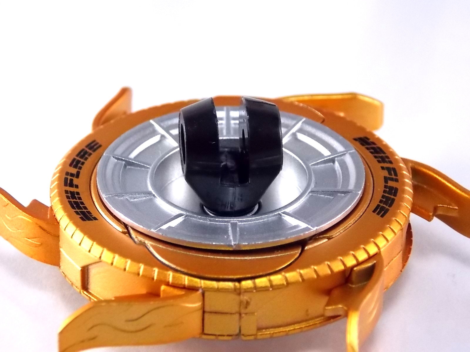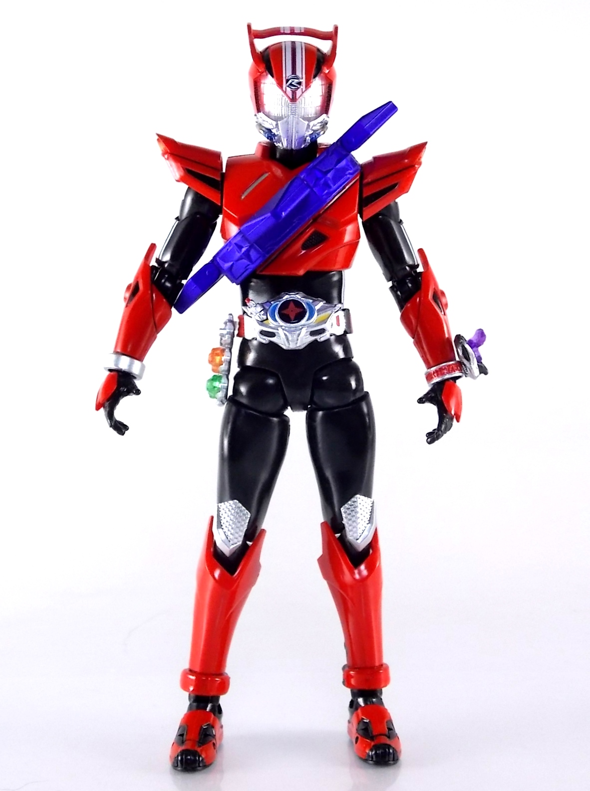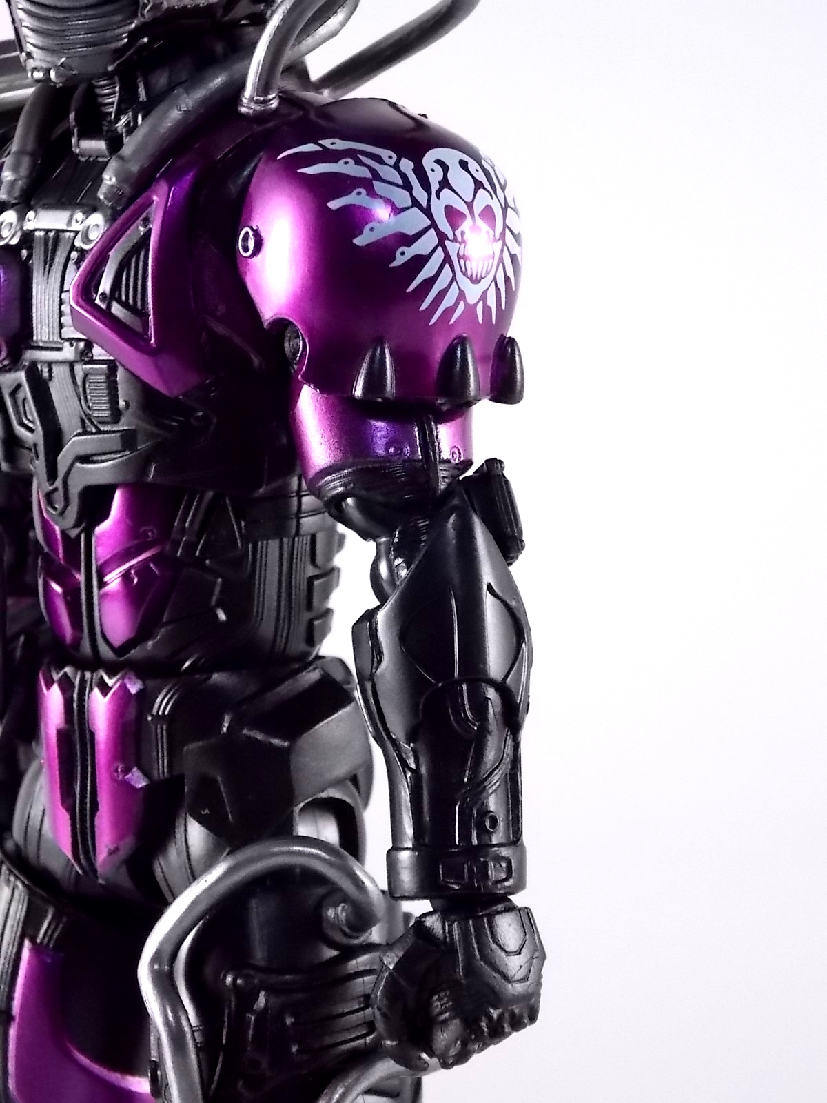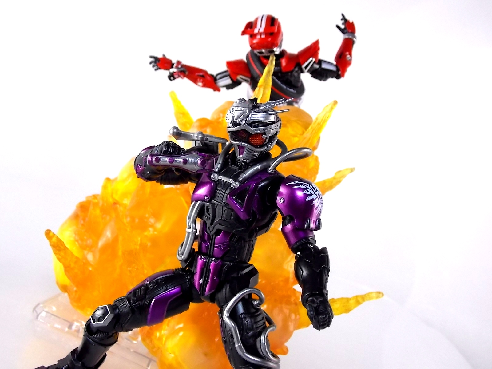 Cue the wicked guitar in the background because an incredible figure is officially in the foreground! Having debuted all the way back in Kamen Rider Drive episode 3, the one and only grim reaper of the Roidmudes is finally brought to life in collectors' toy form as S.H. Figuarts Mashin Chaser! Packaging S.H. Figuarts Mashin Chaser has followed the lead of Drive Type Speed and other recent releases and gone with a slim style box. Seemingly the new standard for mass retail and even some exclusives going forward, I have little new to say about it. As with Drive the theme of this season carries over well to the new box and it's decorated with some very awesome Mashin Chaser artwork. Aside from that and some stock photos of the figure, there's nothing new to report. Main Figure The bulk of this review consists of Mashin Chaser himself, we'll break down accessories a little further below. Chaser is a brand new mold in this fledgling line. If there's any parts sharing with Drive, it's definitely not apparent. But given Mashin Chaser's incredible asymmetry he should be his own unique beast. While Mashin Chaser looks gorgeous let's get something out of the way right now, he doesn't feature a ton of paint apps. Because he doesn't need them. The base figure is primarily black as he should be. Armored components are painted both metallic purple and silver where necessary and the grey piping on his body is molded in the appropriate color from the outset. So while Chaser may not seem to have as many paint applications as other Figuarts, the details are all present. Back to the asymmetry though, Mashin Chaser is probably one of the more elaborately molded Figuarts ever. Each thigh is unique, both forearms, both shoulders, his chest, head, everything really. While Drive was asymmetrical for different reasons he now seems very much more neat and orderly compared to Chaser. Mashin Chaser is really the embodiment of chaotic elements here compared to Drive. And thankfully the sculpt of the figure has capture this perfectly. The head is by far the most interesting part of the figure. There's just so much techincal detailing put into it that it's astounding. There's a bit of a gap issue through the middle of the head on mine, but otherwise it's fantastic. And those eyes, just some of the best compound eyes I've seen on a rider figuart in recent memory. By the way those tubes I mentioned above? They're made of an awesomely flexible plastic so you're much less likely to break them. And awesomely they don't impact the figure's range of motion at all. Because of the way the torso tubes are connected to Chaser they run the length of his torso and down to his waist but loop back up and attach to his back. So you don't have a rigid connection to the waist that would hinder movement. Sadly there are 2 things that hinder the arms. The shoulders. Though Mashin Chaser really does have a full range of motion, his shoulders are poorly designed. Though both have ball jointed pads on them the way the shoulders are designed prevents you from lifting the arms up and fully out perpendicular to the body. The shoulders can be pulled down and out but when you try to gend them back and up the sheath around the shoulder impacts the torso. Rather than being able to put his arms in a 90 degree angle you get more of about 80 degrees. So it's a bit hard to create iconic poses with the Break Gunner out to the side. The head is also unencumbered by the pipes on the shoulders, though the collar around the neck can be a pain. Otherwise the figure is incredibly solid, though I have one minor complaint about his back that I describe below in the Tire section. Accessories The pickings are a little slim, unless you ordered the 1st release of Mashin Chaser with the 1st run bonus! 1 - Brake Gunner. The trademark weapon of Mashin Chaser, the Break Gunner is scaled down to perfection here. While it's non-functional in the sense that it doesn't have moving parts, the guard on top can be removed to reveal a plug for Shift Cars! So any of Drive's standard non-flipped shift cars can be stolen or "tuned" by Chaser. Though the other half of tuning doesn't quite pan out, see Midnight Shadow Tire below. 3 - Sets of additional hands. Pretty standard fare here. Open hands for menacing stuff, one set to hold the Break Gunner in either hand, and a set of bike riding hands! These are a seriously welcome inclusion as many modern figuarts generally don't include them right off the bat. 1st Run Bonus 1 - Midnight Shadow Tire. Much like the Max Flare Tire the Midnight Shadow Tire, like all others in this line, can break apart into several component. The front and back halves can be clipped onto Kamen Rider Drive's chest or another compatible future release. This allows for a damn near seamless high end version of the Tire Koukan gimmick. The Hub section has a peg hole on the back of it that yes conveniently works with tamashii stage arms, but moreover it's meant to let the tires be used by the upcoming Tridoron! The paint on Midnight Shadow is pretty hit or miss though. It's a really thick grainy paint that they went with, not glossy at all and it feels quite cheap. And sadly it's poorly applied on several parts of my Tire. Connection points are also painted in this way so I'm sure it will flake off with repeated use. Sadly however Mashin Chaser is incomparable with the Tires as is. There is a removable plug on his back that exposes a port for his upcoming Busou Chaser set, but there's no such connector to use with any of Drive's Tires currently. Unless a part is included with that set. For now I've come up with a quick and dirty solution to at least get the general look of the Tire on Chaser's back. It involves you having an extra Tamashii Stage part but it works quite well. See the images below for a quick how to. 1 - Flipped Midnight Shadow Shift Car. Just like Max Flare, a flipped version for Drive's Shift Brace. 1 - Mr. Belt Shadow read out. Also just as the 