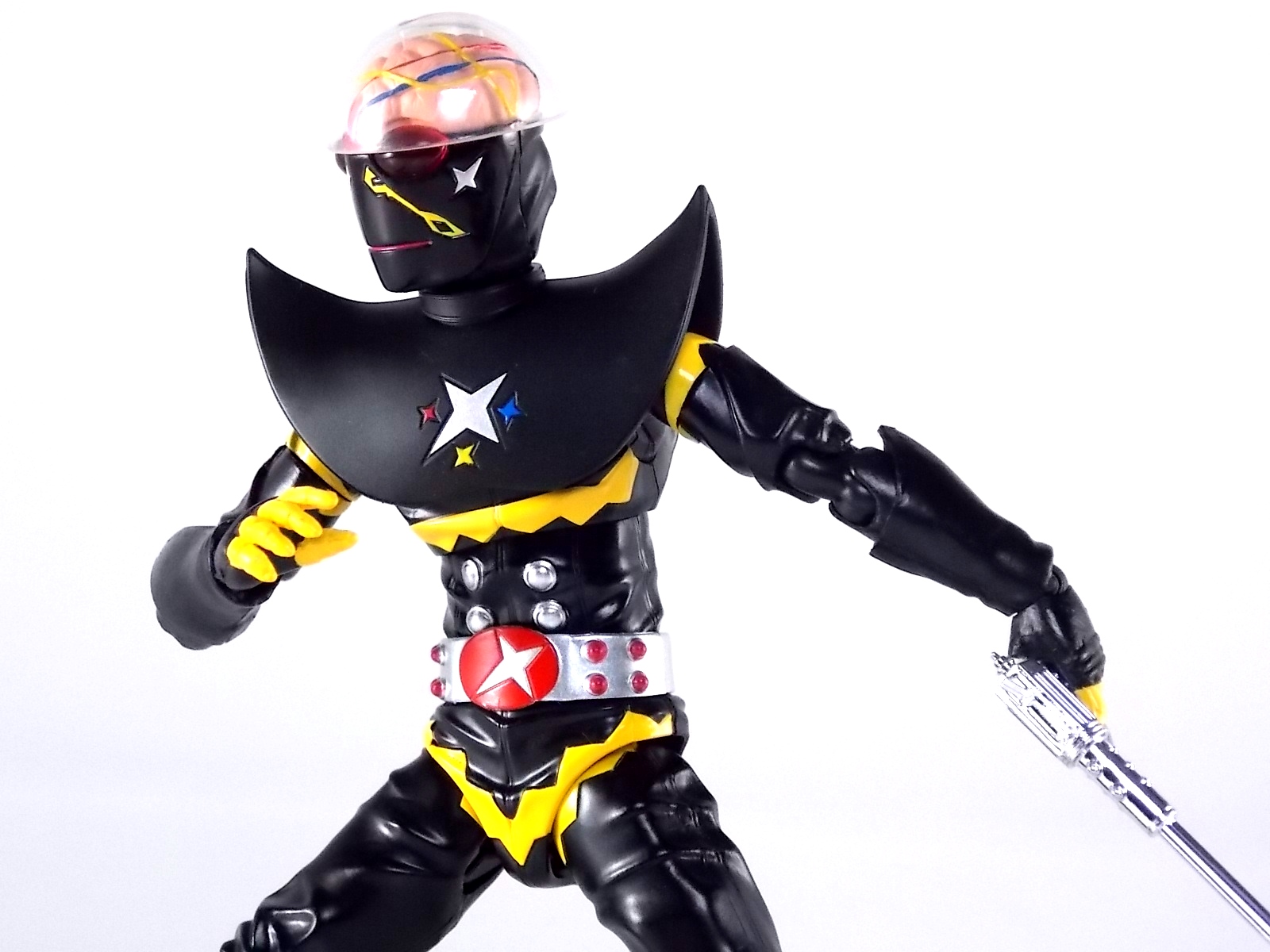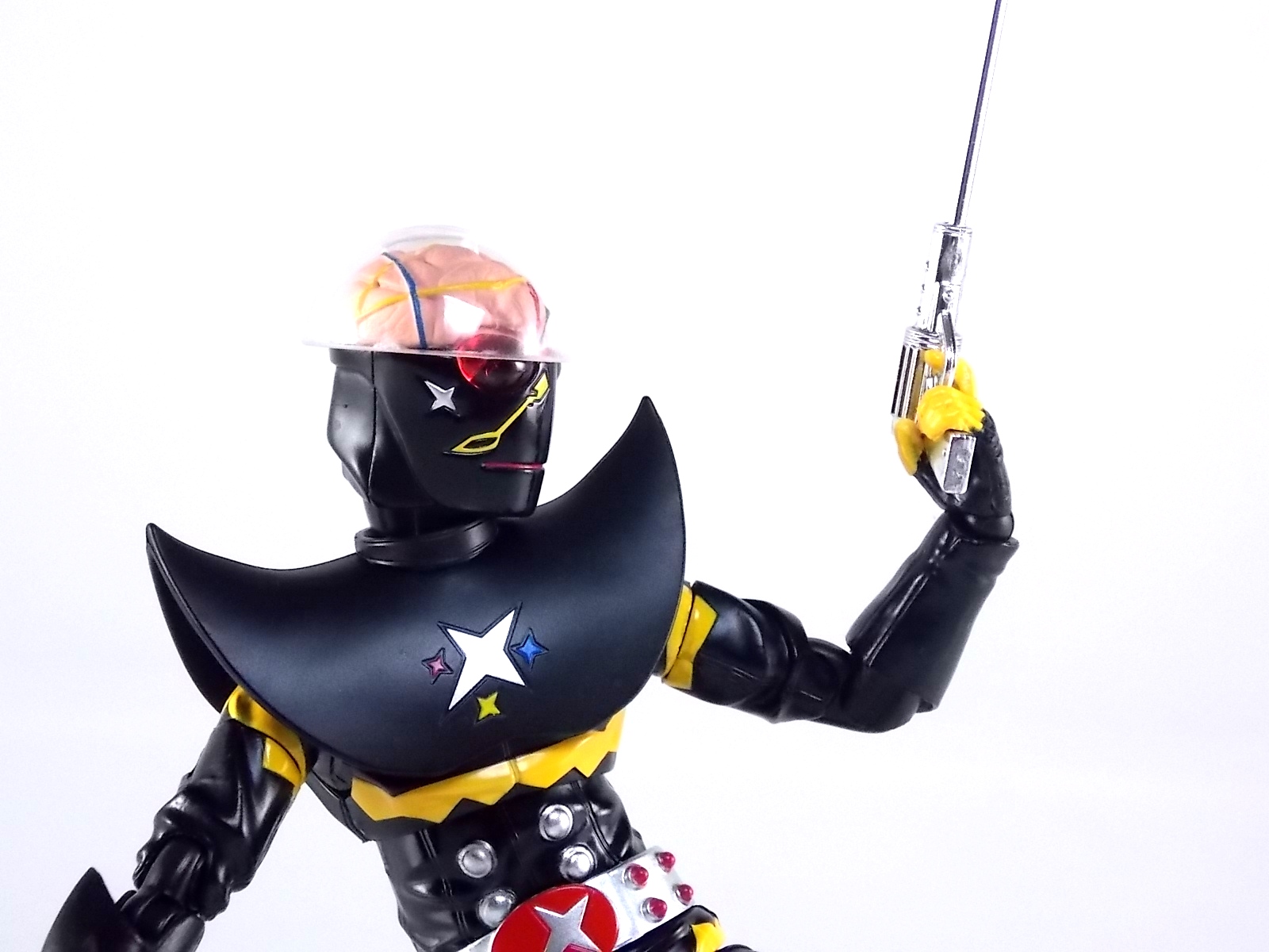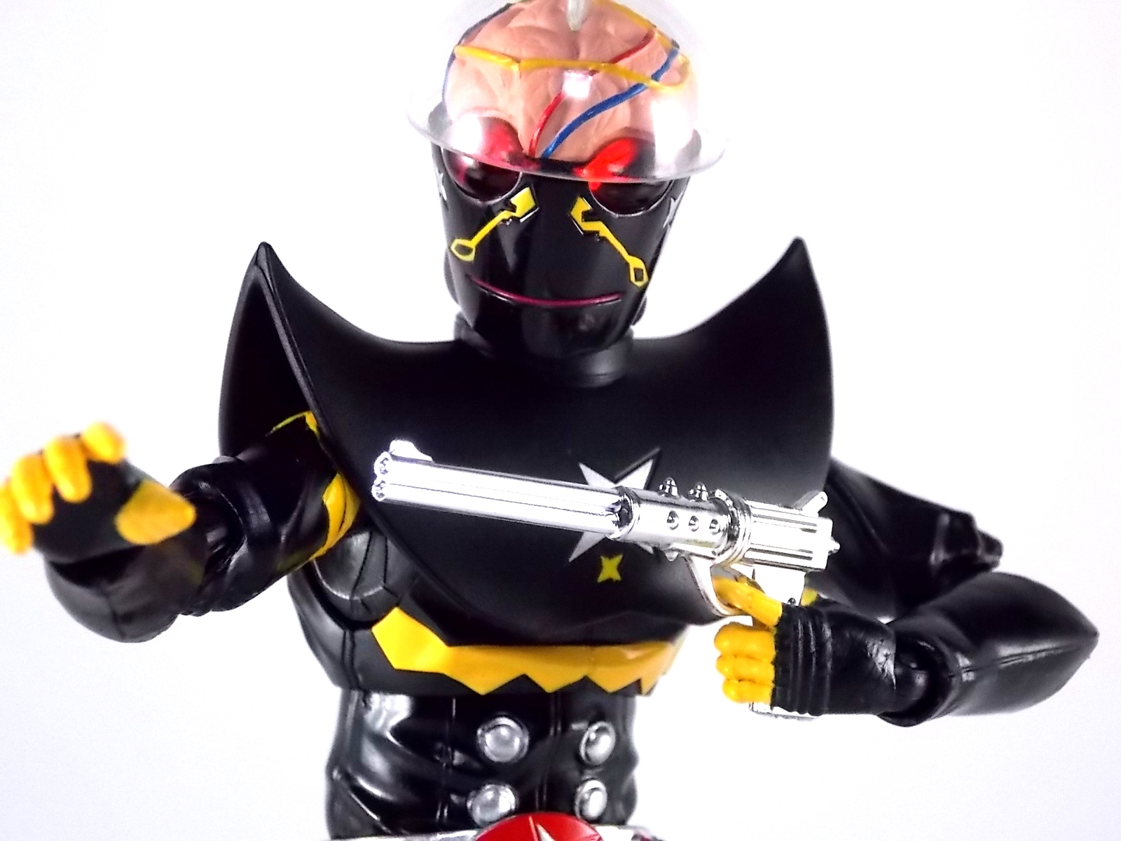 S.H. Figuarts Gill Hakaider! Released as a companion piece to the recent S.H. Figuarts Kikaider 01, the evil android Hakaider was originally created by Dr. Komyoji to destroy Kikaider. Of course this was while under coercion from Professor Gill & DARK. Though Komoyoji built the Android known as Saburo his brain would later be implanted into it by Professor Gill, thus creating the original monster we knew. This figure specifically represents what happened after the fall of DARK, when Professor Gill successfully escaped his headquarters destruction by transplanting his own brain into the Hakaider body, creating Gill Hakaider! The villainous leader of SHADOW who would dog Kikaider 01 throughout his own series! Packaging The packaging is all business as usual. The Gill Hakaider's box is modeled specifically after Saburo Hakaider's but is in line with the rest of the Kikaider release. Very cool minimalist artwork with one dynamic box shot on the back, but nothing new to see. Main Figure After the extensive wait endured by many for an S.H.Figuarts Kikaider, a beloved hero by Japanese and western fans alike, the turn around to get his arch nemesis Hakaider was comparatively quick. Getting this repaint/slight retool of him however took longer. Despite the only differences really being some paint apps and some additional accessories, Gill Hakaider was release nearly 5 months after Hakaider. As a slight repaint a bulk of my review will be identical to Hakaider's. As many recent sentai & rider S.H.Figuarts releases have done, Gill Hakaider features gorgeously sculpted in "fabric" details. The real suit was a bit of a leathery vinyl material and while that kind of look can't be entirely replicated in plastic, this is an excellent attempt to do so. Since Hakaider's primarily black as well there aren't very many paint apps to worry about, but what's there is done just right. The difference with Gill vs standard hakaider is the newly painted Hakaider emblem on his chest accompanied by 3 multi-colored stars. And the lines down his cheeks are of a thinner and altogether different design. The QC on these paint apps is just as top notch as the original release though. The real excellence of this figure is all in the head though. Not only is Gill Hakaider's brain sculpted beautifully, the electrical wires are painted as well, and the skull cap is removable! And the brain is too! That's right, Gill Hakaider's brain is entirely removable to replicate any and all wacky mad doctor scenarios you wish! This is an incredible bonus feature of the figures design. Meanwhile the other incredible bonus of how the head is designed is that Hakaiders' eyes have incredible light piping. Since the skull cap is open and clear his eyes capture a ton of light and almost appear to glow artificially. Perhaps the only complaint I can levy against the figure is the shoulder design. Though the shoulder pads are accurate to the suit, they are molded as one gigantic piece that stretches across the chest. It can angle upward somewhat on either side to give the arms a bit more room, but ultimately this shoulder/chest piece hybrid interferes with the arms movement a bit. But this is an issue I experienced with the original figure as well. Otherwise this figure is pretty excellent and a wonderful companion/rival piece to Kikaider 01 that's very much on par with his quality. Accessories Unlike the other releases in the Kikaider subline so far, Gill Hakaider boasts an impressive accessory selection: 4 - full sets of extra hands. Sadly they don't seem to be intelligent choices for hands though. As with Hakaider, Gill Hakider suffers from having only one left hand to hold his gun and no real right hand for it. And he includes a right hand to hold his flute staff but it doesn't very well and there's no left hand laternative. 1 - Hakaider Shot handgun. A beautiful silver chromed handgun that's as comedically long as it is in the show. It looks like something the Joker would be packing except Hakaider's gun is deadly and awesome. The next accessory is directly tied to the gun. 1 - replacement shin. This shin can be attached to by removing the previous one at the knee and ankle joints. The advantage of this one is that it has a built in holster for the Hakaider Shot. I love that this is included but my Hakaider is almost always holding the Shot so it's just a bonus to me. But a welcome bonus none the less. 1- cape/mantle. To use this simply pull Gill Hakaider's head off at the neck joint and pull his chest/shoulder armor off, swap it for this one and bingo you have an awesome cape. Sadly as is the case with practically all figuarts of characters who should have cloth capes, he does not. So it's statically posed and a bit back heavy. Not so bad that you can't pose Gill with it, but cumbersome. It still manages to give him a devilish and menacing look that I love. The cape itself is actually more associated with the animated version of Gill Hakaider from the Kikaider 01 OVA. But it's still a cool bonus to see here. 1 - flute/staff. Though we've seen several toku characters, mostly heroes, over the years use flutes Gill's is far from heroic. An evil staff that seems pretty ornate at first, it has a sharpened for skewering enemies and when played as a flute can control mechanical life forms, as it's been used to control Kikaider on more than one occasion. The toy version here looks great and even has small sculpted in finger depressions to replicate the flute playing. Though sadly he doesn't have a hand that's really designed properly enough to hold it correctly, you can still pull of some decent poses. This release sets itself apart from all the other Kikaider releases so far. Not only does it have the most accessories quantity wise but it also has arguably the best selection generally speaking. Even going so far as to throw in something from the characters animated counterpart in the form of his cape. Final Thoughts While the sculpt and paint apps