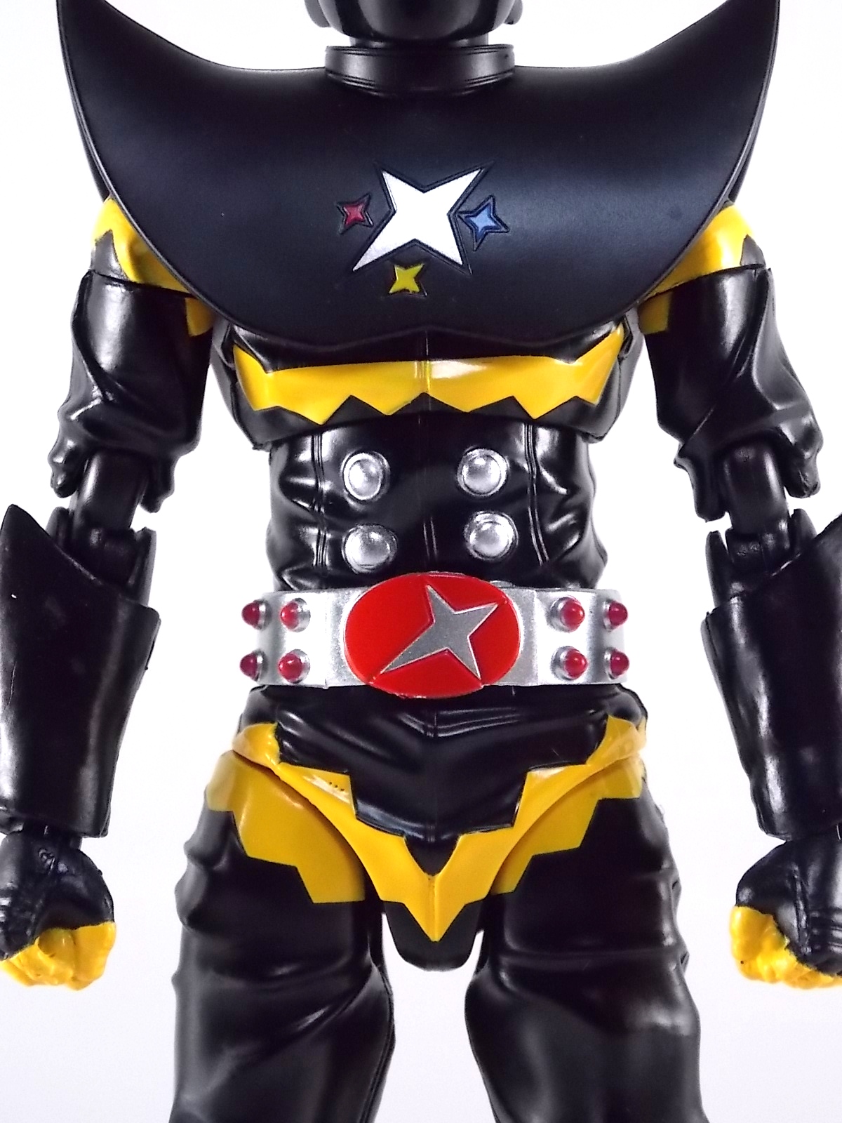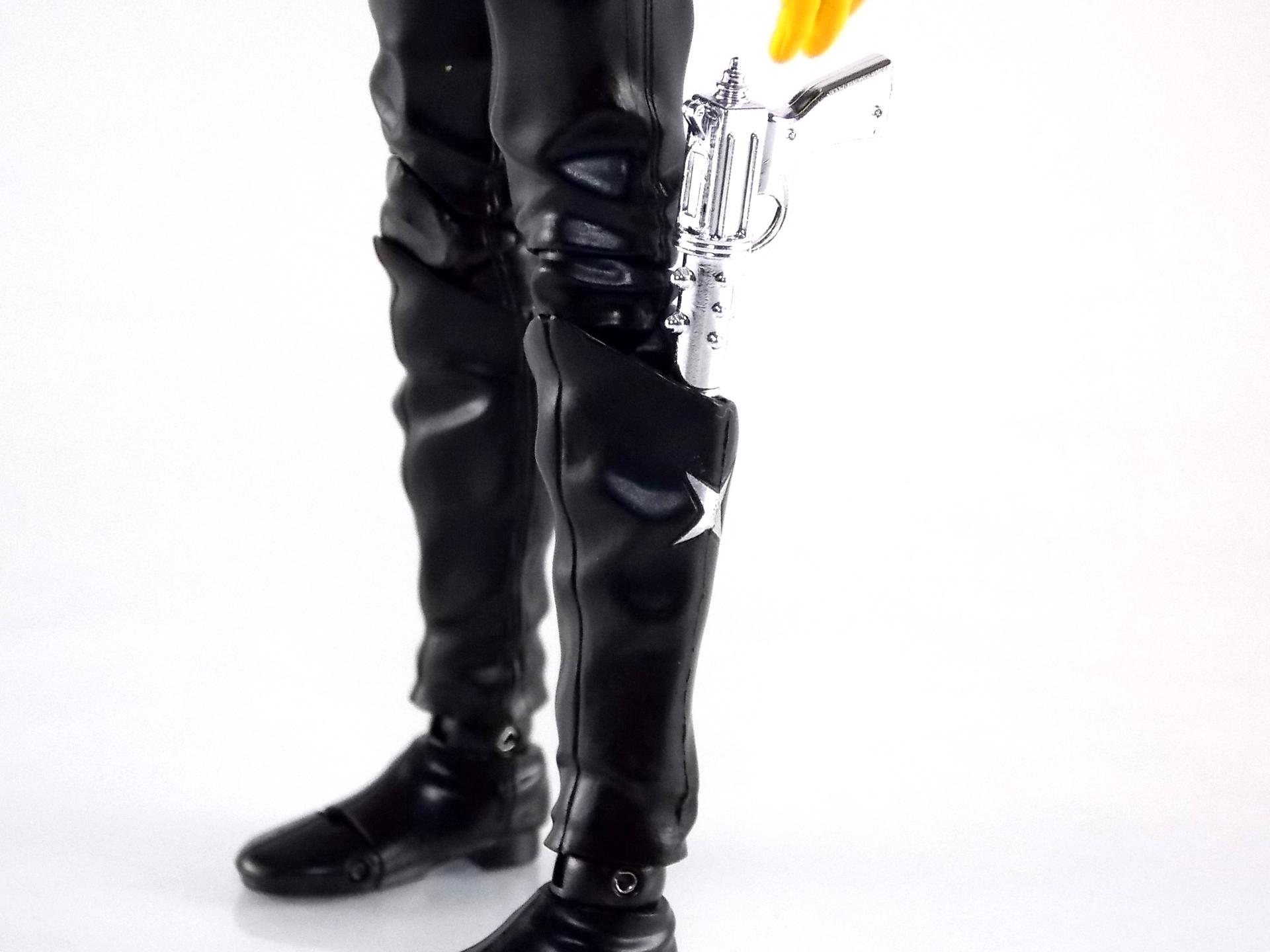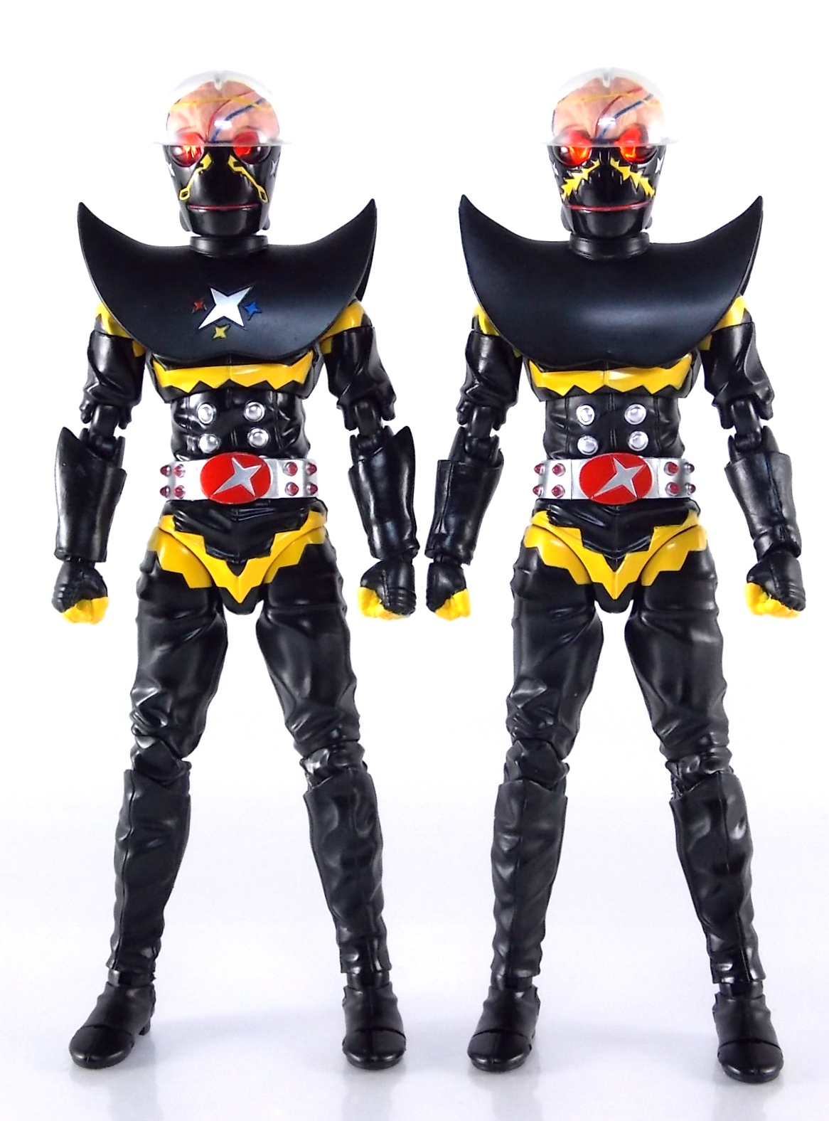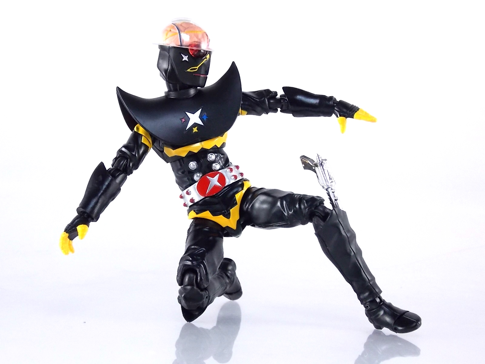 S.H. Figuarts Gill Hakaider! Released as a companion piece to the recent S.H. Figuarts Kikaider 01, the evil android Hakaider was originally created by Dr. Komyoji to destroy Kikaider. Of course this was while under coercion from Professor Gill & DARK. Though Komoyoji built the Android known as Saburo his brain would later be implanted into it by Professor Gill, thus creating the original monster we knew. This figure specifically represents what happened after the fall of DARK, when Professor Gill successfully escaped his headquarters destruction by transplanting his own brain into the Hakaider body, creating Gill Hakaider! The villainous leader of SHADOW who would dog Kikaider 01 throughout his own series! Packaging The packaging is all business as usual. The Gill Hakaider's box is modeled specifically after Saburo Hakaider's but is in line with the rest of the Kikaider release. Very cool minimalist artwork with one dynamic box shot on the back, but nothing new to see. Main Figure After the extensive wait endured by many for an S.H.Figuarts Kikaider, a beloved hero by Japanese and western fans alike, the turn around to get his arch nemesis Hakaider was comparatively quick. Getting this repaint/slight retool of him however took longer. Despite the only differences really being some paint apps and some additional accessories, Gill Hakaider was release nearly 5 months after Hakaider. As a slight repaint a bulk of my review will be identical to Hakaider's. As many recent sentai & rider S.H.Figuarts releases have done, Gill Hakaider features gorgeously sculpted in "fabric" details. The real suit was a bit of a leathery vinyl material and while that kind of look can't be entirely replicated in plastic, this is an excellent attempt to do so. Since Hakaider's primarily black as well there aren't very many paint apps to worry about, but what's there is done just right. The difference with Gill vs standard hakaider is the newly painted Hakaider emblem on his chest accompanied by 3 multi-colored stars. And the lines down his cheeks are of a thinner and altogether different design. The QC on these paint apps is just as top notch as the original release though. The real excellence of this figure is all in the head though. Not only is Gill Hakaider's brain sculpted beautifully, the electrical wires are painted as well, and the skull cap is removable! And the brain is too! That's right, Gill Hakaider's brain is entirely removable to replicate any and all wacky mad doctor scenarios you wish! This is an incredible bonus feature of the figures design. Meanwhile the other incredible bonus of how the head is designed is that Hakaiders' eyes have incredible light piping. Since the skull cap is open and clear his eyes capture a ton of light and almost appear to glow artificially. Perhaps the only complaint I can levy against the figure is the shoulder design. Though the shoulder pads are accurate to the suit, they are molded as one gigantic piece that stretches across the chest. It can angle upward somewhat on either side to give the arms a bit more room, but ultimately this shoulder/chest piece hybrid interferes with the arms movement a bit. But this is an issue I experienced with the original figure as well. Otherwise this figure is pretty excellent and a wonderful companion/rival piece to Kikaider 01 that's very much on par with his quality. Accessories Unlike the other releases in the Kikaider subline so far, Gill Hakaider boasts an impressive accessory selection: 4 - full sets of extra hands. Sadly they don't seem to be intelligent choices for hands though. As with Hakaider, Gill Hakider suffers from having only one left hand to hold his gun and no real right hand for it. And he includes a right hand to hold his flute staff but it doesn't very well and there's no left hand laternative. 1 - Hakaider Shot handgun. A beautiful silver chromed handgun that's as comedically long as it is in the show. It looks like something the Joker would be packing except Hakaider's gun is deadly and awesome. The next accessory is directly tied to the gun. 1 - replacement shin. This shin can be attached to by removing the previous one at the knee and ankle joints. The advantage of this one is that it has a built in holster for the Hakaider Shot. I love that this is included but my Hakaider is almost always holding the Shot so it's just a bonus to me. But a welcome bonus none the less. 1- cape/mantle. To use this simply pull Gill Hakaider's head off at the neck joint and pull his chest/shoulder armor off, swap it for this one and bingo you have an awesome cape. Sadly as is the case with practically all figuarts of characters who should have cloth capes, he does not. So it's statically posed and a bit back heavy. Not so bad that you can't pose Gill with it, but cumbersome. It still manages to give him a devilish and menacing look that I love. The cape itself is actually more associated with the animated version of Gill Hakaider from the Kikaider 01 OVA. But it's still a cool bonus to see here. 1 - flute/staff. Though we've seen several toku characters, mostly heroes, over the years use flutes Gill's is far from heroic. An evil staff that seems pretty ornate at first, it has a sharpened for skewering enemies and when played as a flute can control mechanical life forms, as it's been used to control Kikaider on more than one occasion. The toy version here looks great and even has small sculpted in finger depressions to replicate the flute playing. Though sadly he doesn't have a hand that's really designed properly enough to hold it correctly, you can still pull of some decent poses. This release sets itself apart from all the other Kikaider releases so far. Not only does it have the most accessories quantity wise but it also has arguably the best selection generally speaking. Even going so far as to throw in something from the characters animated counterpart in the form of his cape. Final Thoughts While the sculpt and paint apps