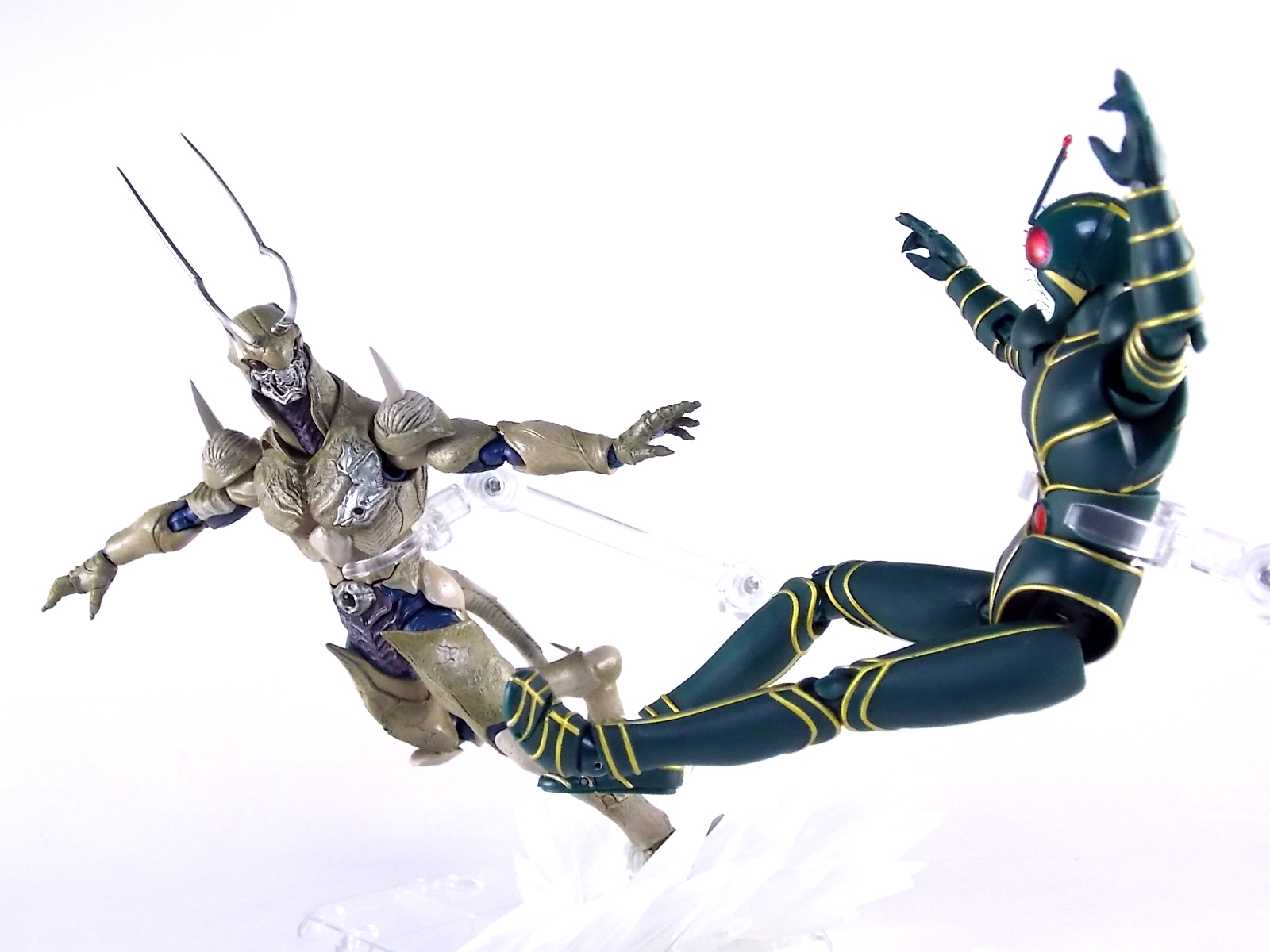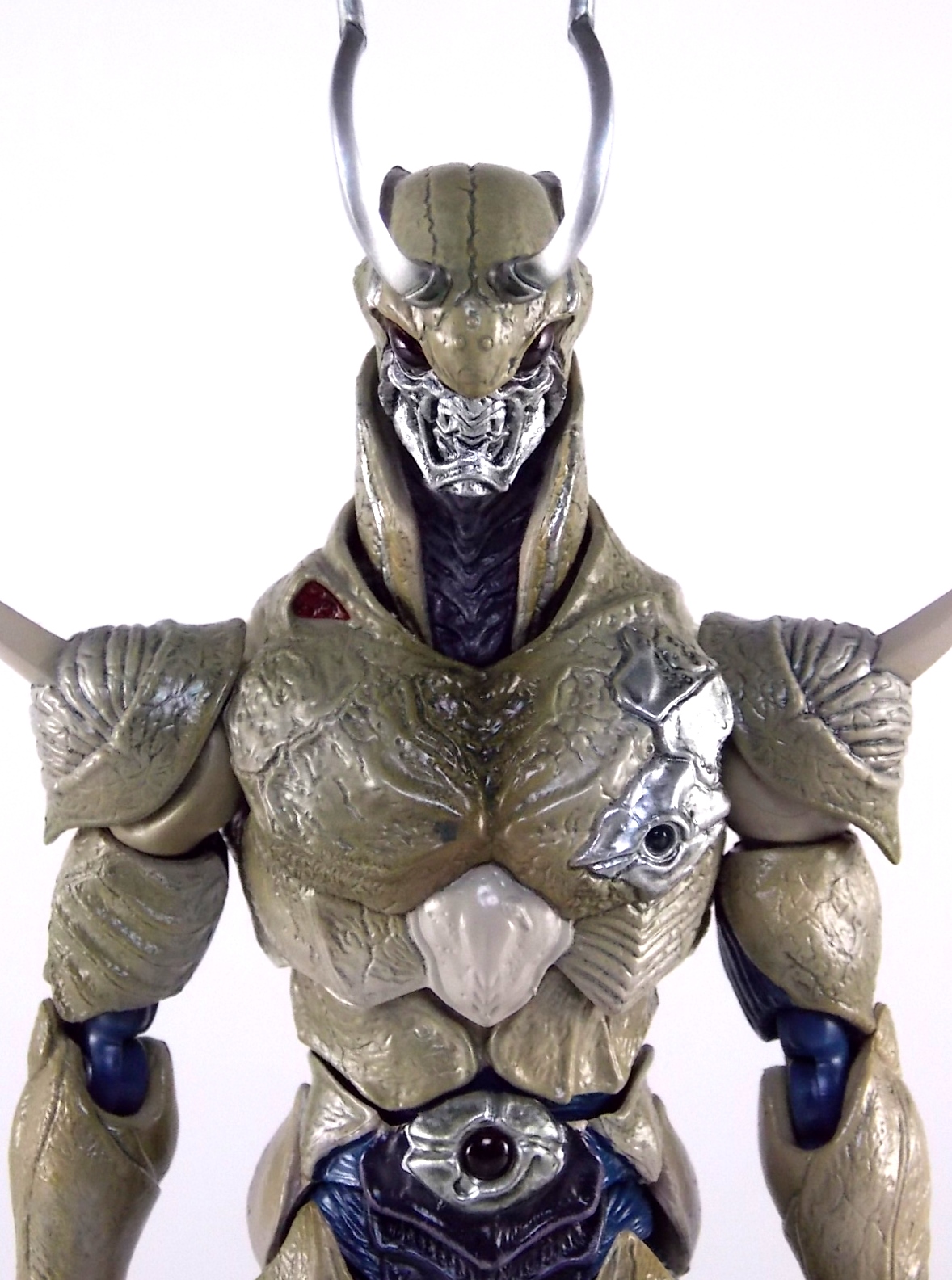 Originally created from the Neo Organism that Professor Motchizuki unleashed on the world, Doras came to exist in the Kamen Rider ZO movie. Yet another film created to celebrate the 20th anniversary of the Kamen Rider franchise, as well as a new beginning of sorts. With the critical failure of it's predecessor, Shin Kamen Rider, ZO became the new de facto modern rider for a brief time. Though Shin, ZO, & later Kamen Rider J comprise a special trio of movies and riders that later came to be associated with the Showa era, they were entirely produced in the early Heisei era. ZO was meant to be the new modern day Rider 1 while J who purposefully shared a similar design, was meant to thematically be his Rider 2. However Doras technically predates both of these heroes. Although ZO is referred to by the Professor as Cyborg #1 the Neo Organism he's been incubating is the first in a new breed of cybernetic Organism. When it matured it created Doras as it's avatar in the world. In effect Doras is more of a tool than character, and in fact is very pseudo-rider like. Though he doesn't transform he shares many design cues as riders and almost appears to be an even more monstrous version of Kamen Rider Shin. The character would appear many years later in the 2010 Decade/W movie wars first in it's initial form and then later in a more dangerous & evolved state. Packaging It's been some time since I ran across some Tamashii Web Exclusive packaging that wowed me, but finally the good stuff is back! Though I still don't have much to say, I absolutely love the line art created for releases like this. This box, much like the figure, is very reminiscent of Kamen Rider Shin from a design perspective. With an almost wire-frame version of the character on the front and spine and a good selection of stock photos on the back, what more could you ask for? Well a special clam shell within the plastic tray designed specifically to protect Doras' wonderful antennae! Main Figure I've really only ever said this once before about a figuart, but I'm prepared to say it again. This figures is absolutely monstrous and gorgeous. S.H. Figuarts Doras is a prime example of how wonderful sculpting and paint can transform what would otherwise be a limited run toy of a rather obscure character, into a masterpiece. Kamen Rider Shin was the same way, though he was solely organic unlike Doras who features numerous technological details on his body. The primary thing you'll notice is that Doras is almost entirely asymmetrical. Head to to toe, if you cut him down the middle the 2 halves would be very different. It brings to life the interesting premise that Doras' body was originally crafted from junkyard scrap metal. A true cyborg fusion of details. The belt area and chest features some of the most detailed sculpting. Though it must be pointed out despite how good he looks, that Doras is not entirely accurate to the suit used in the film. While A very good representation of Doras, the Figuart can't quite capture the changing details of the actual suit. Several versions of it were used through out the film with varying degrees of weathering and detailing that are hard to replicate in figure form. Though I believe this figure has done and admirable job of doing so and is likely the most accurate representation of Doras ever. The head itself is a marvel of detailing and paint wash, I only wish the mandibles could open, or that there were an alternate head included to simulate it. The truly terrifying moments with this character are when he's trying to consume Kamen Rider ZO. You should also be aware that Doras' gigantic antennae are very fragile, as are the various spikes on his appendages. The instructions go out of their way to warn you to be careful with these areas. Regardless the figure is incredibly solid, with some of the most sturdy flat feet I've ever seen. Great balance all around. Though sadly the hips leave much to be desired. The spiked hip armor impacts the waist keeping the legs rather restrained, its a design flaw for the toy but the look of the legs at least is accurate. This issue aside everything else is wonderfully articulated. shoulders, double neck joints, great ab crunch and floating upper torso. If the legs were just a bit better we'd be in serious business. Overall though S.H. Figuarts Doras is a beautiful figure with some seriously nice details. He'll fit right into anyone's collection. It makes me very very hopeful that one day we'll see the Decade version of the character brought to life as well, or perhaps some of the S.I.C. Hero Saga versions of the Doras done up in S.H. Figuarts. Time will tell! Accessories Like many Web Exclusives Doras is rather lacking in the accessories department. It includes: 1 - alternate extended tail. This piece can be used by unplugging the small tail stump from his back. They're both on ball joints so the swap is quite easy. I am disappointed though that the tail doesn't have at least one pivoting joint for some kind of posing. You have to rely entirely on the ball joint at the base to get movement out of it. 2 - sets of hands. Sadly these are 2 very same-y sets of hands. Splayed open ones and then splayed even more open ones. They're just repetitious. One set over the other in favor of another accessory of some sort would have been better. Usually I don't have a ton of suggestions for accessories that should be included with something. But here there's plenty of room for improvement. Doras is lite on the goodies but wow there are tons of options for things they could have included. A replica of his small orb like form, or of the later liquid metal form he assumes for rapid travel. An alternate torso with his chest open to simulate how he tries to kill ZO initially. A replaceable right arm and left leg with mechanical bits. The aforementioned alternate head with open mandibles. I mean come on those are obvious based on his regenerative abilities. It really saddens me that none of