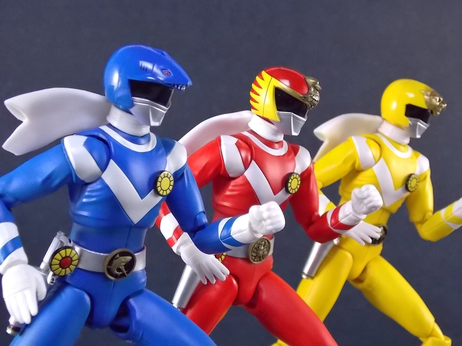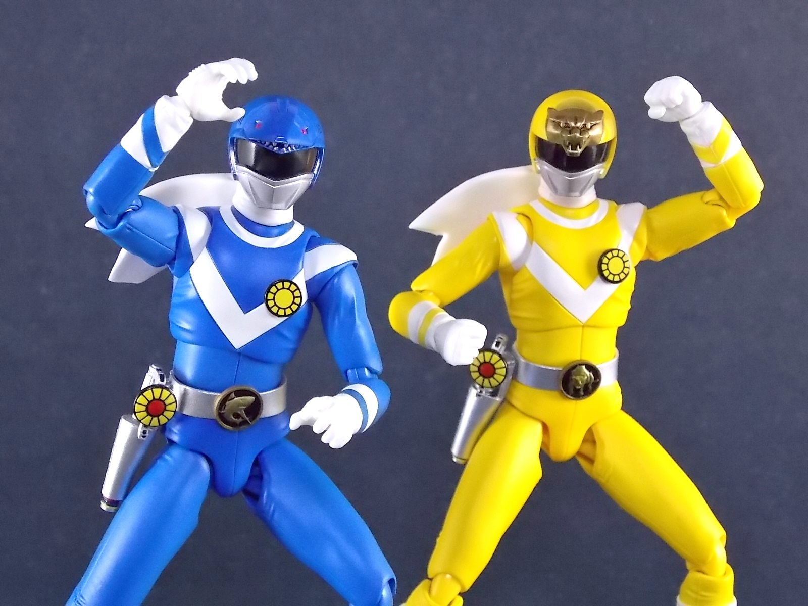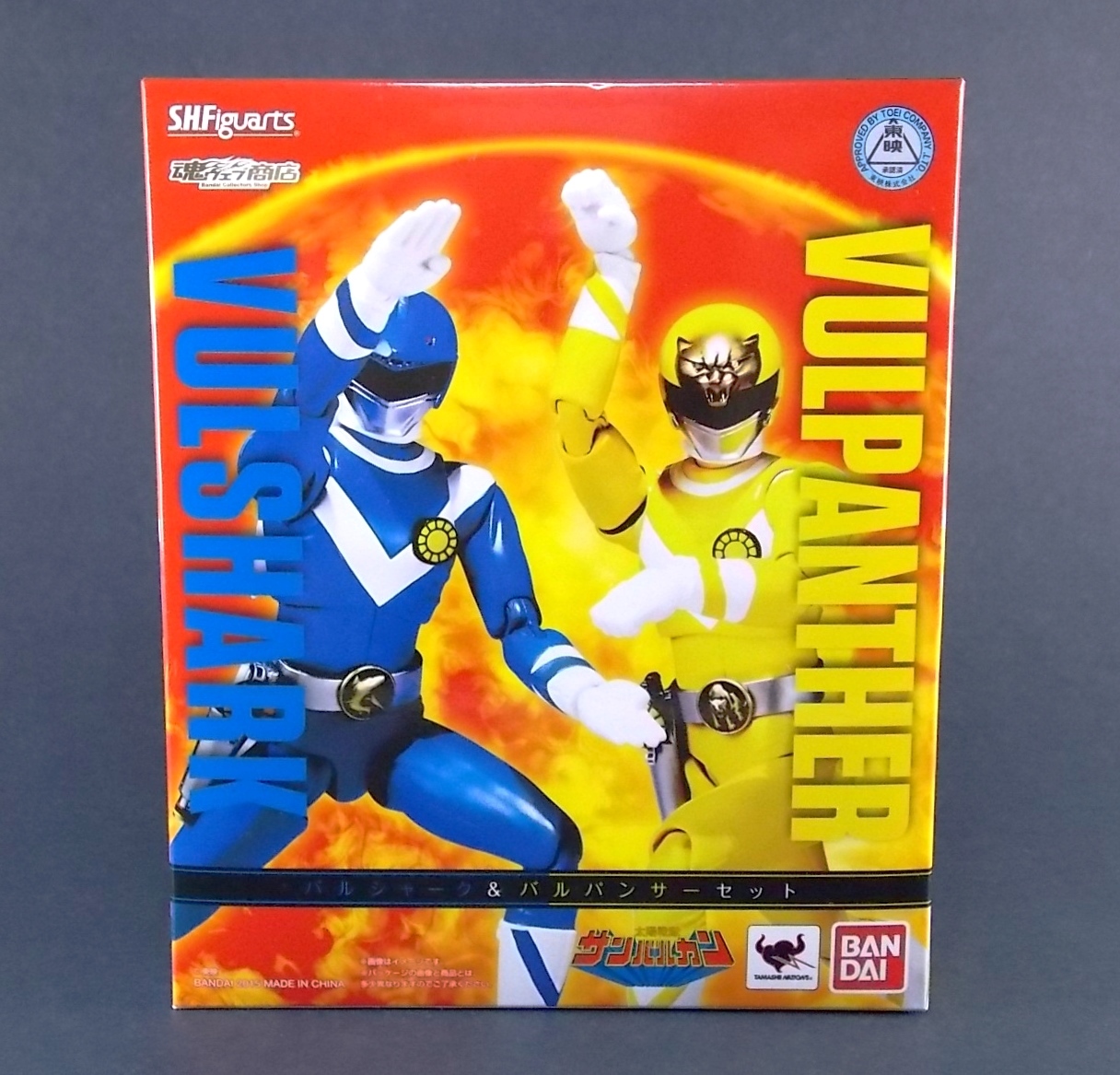 TokuNation has caught the sun once more with this gallery from Taiyou Sentai Sun Vulcan! In this installment we're taking a look at the final two members of the team, S.H. Figuarts Vul Shark & Vul Panther! This pair follow up from the release of S.H. Figuarts Vul Eagle this past December. ** Post #1: contains the boxed set and Vul Shark, post #2 contains Vul Panther and a variety of group shots! Packaging Vul Eagle, as the first release in the Sun Vulcan line of S.H. Figuarts, gave us a brand new basic figure and packaging. However the two pack of Vul Shark & Panther as a web exclusive is a little bit different. Rather than have a window this box opts for the more usual closed type of packaging with art adorning the front. Which is fine since the two characters are posed very appropriately in front of a blazing sun. Otherwise the packaging is pretty standard with two insert trays. One for the figures, one for all the accessories. Much like any other web exclusive sentai 2-pack. Main Figure These two figures have near identical bodies to Vul Eagle save for their helmets and belts so much of my review will be the absolute praise I had to bestow on Vul Eagle. S.H. Figuarts Vul Eagle is by far one of my favorite sentai Figuarts ever. So it's absolutley no surprise that I hold the exact same high opinion of Vul Shark & Vul Panther. These figures are solid on every level. For a suit that really looked baggy in the show, they've carried some of that over here but streamlined it so it doesn't look cheesy at all. As I said with Vul Eagle, these suits look like they belong in a modern series thanks to the toys. They don't look outdated one bit. Featuring some fantastically sculpted in fabric details these suits come to life. Where these figures completely knocked it out of the park is the head sculpts. Beautiful profiles, a gorgeously done crest on Panther, the attention to detail on Shark. It's perfection. And the emblems on their belts, again they just absolutely nailed it. They look like actual metallic parts rather than plastic thanks to a fantastic paint wash. These figures also happen to feature wonderful articulation! It's pretty standard stuff for non-armored/non-rider or Metal Hero figuarts but Vul Shark & Vul Panther can move in all the right ways to get the job done. I've yet to discover any real flaws with my set, as with Vul Eagle I've really yet to discover any QC issues. The paint is crisp, the parts are formed properly, and the joints are tight. Though I have to say Vul Sharks left hip is scary tight. I'm afraid of it snapping like my older Gokaigers have done on occasion. And since these two share the exact same mold as Vul Eagle, Vul Shark & Vul Panther are about the same height as S.H. Figuarts Akaranger. It would seem at first glance that these Showa sentai figures are a bit taller than their Heisei counterparts. But honestly when I've got them all lined up together the differences aren't as apparent. Where Akaranger felt large bulky and towering because of his sculpt, the Sun Vulcan figures feel much less so. Though they clearly stand above their sentai brothers and sisters a little bit, they aren't the sore thumb in the crowd that Akaranger is. Accessories Vul Shark & Panther are near perfect figuarts in my opinion, and the accessories help contribute to that as well. But be forewarned, as with most exclusives, they include less than their retail teammate. EACH figure includes the same accessories as follows: 4 - Additional hand sets. That's a full 1.5 sets of hands less for both Vul Shark & Panther compared to Vul Eagle. They lose some of the expressive hands like the thumbs up and get stuck with a few sets of very similar open palm hands. It's still a good selection but it sucks to lose those more unique hands that Vul Eagle had. 1 - Vulcan Stick (retracted mode). The Vulcan Stick is the signature sidearm of all 3 members of Sun Vulcan. It's packaged in the standard "retracted" mode which is how it always looks while in the hip holster. Though it separates above the handle to use another included part. 1 - Vulcan Stick Blade. The Vulcan Stick itself separates just above the handle for 2 reasons. One, to let you swap out the default end for the Blade. The second is that it let's you slide the handle up through the bottom of a holding weapon fist and then reattach it. Ensuring you don't have to bend the fingers out to try and cram the handle in their. And while this is a somewhat decent collection of accessories I can't help but feel disappointed. With Vul Eagle you got so much more. Granted the included Katana was meant to allow you to display either version of the character, but there's no reason something else couldn't have been included with this pair. At least one effect part would have been nice. But perhaps the most obvious and thus disappointing omission is that no form of the Vulcan Ball is included. The iconic finisher of this trio the Vulcan Ball ( or even the New Vulcan Ball) would have been incredibly easy to manufacture for this set. It's a huge missed opportunity. Final Thoughts As sentai figuarts go I still have to say I'm fantastically impressed. Vul Eagle set the bar high though. S.H. Figuarts Vul Shark & Vul Panther fall short of him only in the accessory category. The sculpts are still gorgeous, the QC top tier, and each figure still manages to convey a unique personality. It's a shame there are so few members of Sun Vulcan as I would love to see the top notch engineering of this mold used again. These two knock it out of the park once again. My only holdout of hope right now is that eventually Sun Vulcan's top tier enemies could be made. Like Fuhrer Hell Saturn or Inazuma Ginga. here's to hoping!