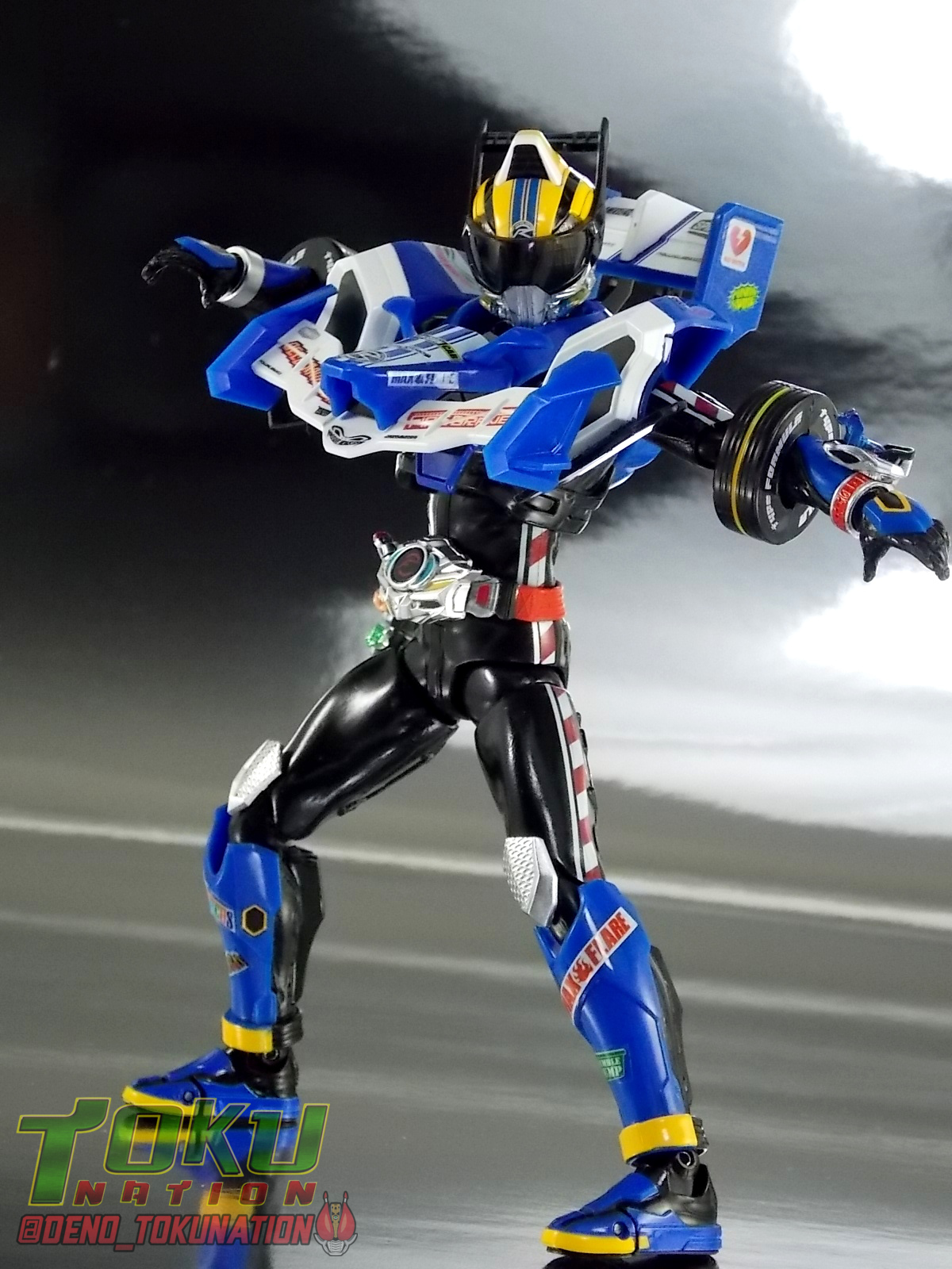 Kamen Rider Drive's penultimate form arrives in our latest gallery before the holidays commence! Today we're showcasing S.H. Figuarts Kamen Rider Drive Type Formula! ** I've basically taken 2 galleries here. Post #1 has an extensive look at this figure without decals applied, [/B] post #2 features the Trailer Cannon, & post #3 features the full figure with all decals applied. Packaging As with all previous Kamen Rider Drive releases, the only new thing to say about this packaging is that it feature a windowless box because it's a Tamashii Web Exclusive. So this is totally normal for web exclusives. In this case, just as with Heart, we get to see a lot more awesome box art because of it. Everything else is business as usual. Main Figure I'll start off by saying I never really understood the distaste that many people had for Drive Type Formula. To me it's an incredibly unique and fun design that takes the car theme to it's extreme, in a good way. The figuart down scales that fantastic design perfectly. And of course because it shares molding with the previous Drive releases it's an already excellent figure. So let's break it down. For starters, aside from minor mold changes and color differences much of Type Formula's lower body is indentical to Type Speed & Proto-Drive. The first significant change is the new Formula readout on the Drive Driver As with all previous uses of this part the Driver can be removed and the readout can be swapped out. The upper body of course features extensive new molding & remolding. Beginning with the arms we get the new "flipped" Shift Formula in the Drive Brace. Also new to the forearms are the Type Formula Tires. These smaller tires thankfully do no significantly hinder the arms posability. The Tire Koukan Formula figure, as well as the show prop, could exchange these tires in favor of other power ups but much like Proto-Drive this figure has not been designed for these Tires to be removable. The most interesting new molding on this figure is the entire chest assembly. Basically the entire upper body is new. The chest has a rather large pair of spoiler wings modeled after an F1 car called the Power Gail Wing. This assembly can be removed exposing the flat chest beneath and also allows you to plug on one of the below listed accessories, an exposed Core Driviar-N. The shoulder pads greatly resemble car fenders and do hinge up, but not quite enough to give the arms quite the forward & back range they require. Don't get me wrong you can plenty of use out of the arms, but the combination of the tires, shoulders, & large breast plate make it difficult to get some poses out of this guy. On the back side Drive has the newly molded in X-Fan-Boost. Essentially a booster jet on his back with a spoiler. And finally we have a new remold of the standard Type Speed head. Formula's head features the same basic design of Type Sped with a new vent on top for aerodynamics and an epic pair of shades over his visor. The shades can be removed by the nature of their design but there's no real purpose to it. As I'm sure everyone is wondering, yes this figure had an extensive decals sheet to deal with. I was pretty skeptical of having to apply ALL of the Shift Car sponsor logos myself too, I still firmly believe Bandai should have just done these as tampographs. I'd even have been willing to pair even more for that. But that being said, applying the decals was not difficult in the slightest. While the layout of the decal sheet itself and the instructions don't quite match up, it's not too hard to get everything where it goes. There's a certain margin of error I was willing to accept and I'm glad to say I never came close to it. I expected to ruin these decals and I didn't. If you use a fine point curved pair of tweezers as I did then applying these is a piece of cake. Oddly there are several totally unused decals on this sheet, a couple of Drive "R" symbols and the FULL readout that would go on the Trailer Cannon. The directions make no mention of these additional labels. Accessories 1 - Shift Formula Car. Standard un-flipped version, the flipped one is in the Drive Brace already. 1 - Core Driviar-N. A swap out part for the chest. Not much point in it really without a figuarts version of the Pit Crew to do repairs on the suit as the only time this part was exposed in show meant Drive had been damaged. 2 - sets of hands. Just so Drive can actually hold the Trailer Cannon and the 2nd set just for expressive purposes. 1 - Trailer Cannon. Now this is a pretty great example of how S.H. Figuarts should strike the balance between functionality & accuracy. When not in use by Drive the Trailer Mode can be left on it's own as an oversized Shift Car. To become a handheld weapon you just need to pull down on the handle and lock it into place. However the Trailer Cannon can also replicate the Rider Shooting Full Throttle attack. To do this you can first remove the Shutter Gate Panel, its the sort of sight on top of the Cannon, a small peg for Shift Cars is there. Just plug on the one of you're choosing. This replicates how the real deal would physically load Shift Cars through a slot in the same place. You can also pull on the silver panel on the front of the cannon to full the entire Shift Container Barrel out, which itself has 2 Shift Car pegs on it. So you can mix & match Shifts as you please to recreate Drive's attacks. I can't really think of anything else that Type Formula should have come with that it didn't. That's everything relevant to it, and while the hand selection is slim it's all you really need for this figure. It's got the perfect accessory loadout. I do wish the Pit Crew Shift Cars & tires (Sparner, Jacky, & Mantan) had been released but I doubt they would have been included with this. As is though I'm more than pleased. Final Thoughts Overall I'm ridiculously happy with how this figure turned out. Being what it is many people wrote this design off as goofy, cumbersome, and ul