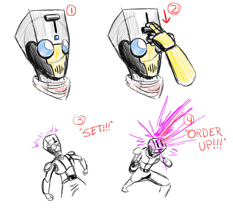 Alrighty, I posted this stuff back on TFW2005 a long time ago, and I've been sitting on it ever since. I thought it was high time that I bring it to you all here where it might get a bit more attention and feedback! I was sitting down one day, dreaming my ambitious dreams and whatnot, and I came up with a little Kamen Rider fan film idea (Which I've promised myself I will make someday, somehow). ...This is that idea (With holes a-plenty, some details aren't done yet). The story follows our hero who is a lowly waiter at a small hole-in-the-wall restaurant, who dreams of becoming the worlds greatest chef. Meanwhile, on the other side of the world in Japan there is a top-secret organization who is working on a species of self-replicating food organisms to solve the world's hunger problems. However something goes wrong, and the scientists must build a suit to contain the creatures. But, alas, they are too late. The monsters escaped, and the suit is incomplete. A lone scientist takes the belt to search for a worthy human to wield it. Stuff happens, and our hero begins to use the belt which will only respond to Japanese words (Which was the only way I could make "HENSHIN!" work). He fights the monsters, who I've styled after the Greeed from Kamen Rider OOO. They are called Pyranoids and each is styled after a different food group of the food pyramid, and can create monsters based on food in their group. Silliness occurs, and forms are unlocked as the belt is built more along the way. The main character is sort of a snarky ass in battle (Think Spiderman), and he's usually going to drop a bunch of food puns and mock the monsters. The way he finished them off he will be dropping a devastating Rider Kick down upon them, stand there for a moment saying "You've been served..." Then he will spin around, snap his fingers into the shape of a checkmark and they will explode. I don't have all that many refined sketches of this guy laying around because most of it is in my head. I'll be updating this thread/post as I come up with things so stay tuned! Now it's time for art... Forms: Fry Cook - Base form, and it uses a laser spatula as a weapon. He has a special attack where he can click down his toaster lever and blast enemies with laser toast. Rider: "Hey you! What do you put in a toaster?" Monster: "B-Bread?" *clicks down lever, shoots and blows up monster* Rider: "The correct answer is... What- Whatever that was..." Sushi - A form which acts a bit like a mash-up of ShinkenGold and Kamen Rider Kabuto. He wields two blades which he can spin around real fast and hack and slash at enemies. Chef - Final Form, is able to use either a flame thrower gun, or a giant cannon which can turn into a huge blade or a bigger gun. He has a little mustache on his helmet which is pretty rad. Flame Broiler - It is essentially the RideVendor from OOO if it was a propane grill instead of a vending machine... And a moped instead of a motorcycle... Last edited by Watty; 04-02-2013 at 11:45 PM.. |