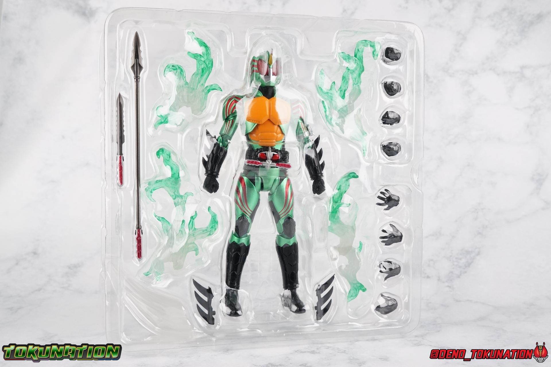 Do you believe in Amazon yet? Well if not then it's time to change your opinion! The fantastic Amazon Japan series Kamen Rider Amazons has been a runaway success since it's first season premiered last year. With the 2nd season having just begun this week, we thought it was finally time to take a look at the first figure release from season 1 with S.H. Figuarts Kamen Amazon Omega (Amazon JP Edition)! Packaging This version of Amazon Omega comes in a special corrugated brown box. Just like the Amazon JP exclusive release of Showa Amazon. Amazon Alpha also had this type of exclusive treatment. We'll look at him eventually so for now let's talk about Omega. Omega comes in this type of box, which is also wider than the normal release because of some additional flame effects, but ultimately it's pretty plain looking compared to the standard retail version. Main Figure I'm so happy to finally have the time to look at the first release from this series. As the inaugural Amazons release Kamen Rider Amazon Omega had to set the bar high, and for the most part I feel it succeeds. Amazon Omega at first appeared to share some superficial design elements with the Kamen Rider Ghost lineup of figuarts. But in hand I certainly don't see that. For starters Omega has some really excellently designed legs. His ankles have a full range to them, not impacted at all by the shin cuffs like you might expect. The knees hit about a 90 degree angle which while fine does keep him from getting in more exotic poses. But despite some pretty thick hips Omega makes full use of them as well. He does have a tiny bit of the diaper look going on, but it's a very functional design overall. The torso is probably my favorite part of the figure weirdly enough. The Amazons Driver itself is incredibly faithful, but sits pretty loose around the waist. This can be both good and bad based on your point of view. I like a little looseness in any rider belt, just so I can be sure there's room for the figure to move. The right handle of the driver, the Battler Grip, is removable to recreate Omega's weapon abilities. It's a snug fit to get it back in there though so be careful not to break it. The actual torso looks great as well, the way the upper half rotates around the lower section gives it some decent posability that you don't quite expect out of such a beefy sculpt. Mine had a nasty little defect on the edge of yellow pectoral plates where the paint was cracked but when you aren't looking for it it's hard to notice. Again, for some reason I love his chest, it just pops and I really like the sculpt. I know, I'm weird. At least his pecs aren't articulated like Showa Amazon was, now that was weird. Omega's arms are pretty standard stuff as well. The wrists are pretty free to move as are the elbows, uninhibited by any of the design elements. My only real gripe with the arms is the way the shoulder pads are hinged, they can only really slide up and down a little. So if you're trying to straighten the arms out fully you won't have much luck, at least not before popping the pad off, sending it flying across the room. I also want to take a sec to mention the gorgeous sculpt of the Amazons Register on the left arm. It's just spot on. The head is where I have my primary issue with this mold. It's a dead on sculpt, from the side it can look a little narrow, but it's very true to life. However the collar around the neck really gets in the way of it being able to do much. Side to side motion works, some up and down as well. But if you want to crane his neck out and back much at all for any weird poses, the collar is going to keep that fro happening. Minor qualms aside, hot damn Omega is a great looking figuart. I loved the show itself so I'm very, very, biased towards these designs. They aren't for everyone and I can understand that. But this is a really well executed figure. And as you'll see below, Amazon Omega comes with a ton of great accessories as well! Accessories Even as a retail release Amazon Omega included a ton of stuff, but this edition also includes some bonus effects! 4 - sets of hands. That's 2 types of open hands, one set of "holding things" hands for use with the simultaneously release Jungraider bike, and for holding the Battler Grip Knife. The other holding hands are specifically intended for the Battle Grip Spear. 2 - Violent Punish blades. These replace the normal gauntlets on Omega's forearms and can connect to the included effect part. They're a bit longer and I generally prefer to just display Omega with them on rather than the normal ones. 1 - Violent Punish effect part. It clips right on over the new forearm blades and can be a little snug. When you try to take it off it generally takes the whole forearm piece with it. 1 - Battler Grip (knife). This shortened version of the handle to the Amazon Driver works like a small knife. It's a bit bigger than the part on the driver itself but that's typical given the "magic" often used on screen when these types of devices transform. Oddly this version of the grip is exclusive only to the Figuart, it was never actually shown to be used in this fashion in the show itself. 1 - Battler Grip (spear). Identical to the knife, just obviously much longer. Replicates Omega's Violent Break finisher. 1 - Set of Green Flame Effects. This set is a recolor of the popular Tamashii Flame Effects tailor made for Amazon Omega. Amazon Alpha also includes a set of them in red to match his armor. All in all that's a damn fine breakdown of accessories. Haruka includes literally anything he could need, the only omission that I see most people complain about are that Battler Grip Sickle & Whip which are both actually included with the Jungraider. Final Thoughts S.H. Figuarts Kamen Amazon Omega is a really great figure. It may have some faults in it's design that can limit some aspects of it's posability, but it's still a great release. It's a really stylistic update to a classic design and has plenty of