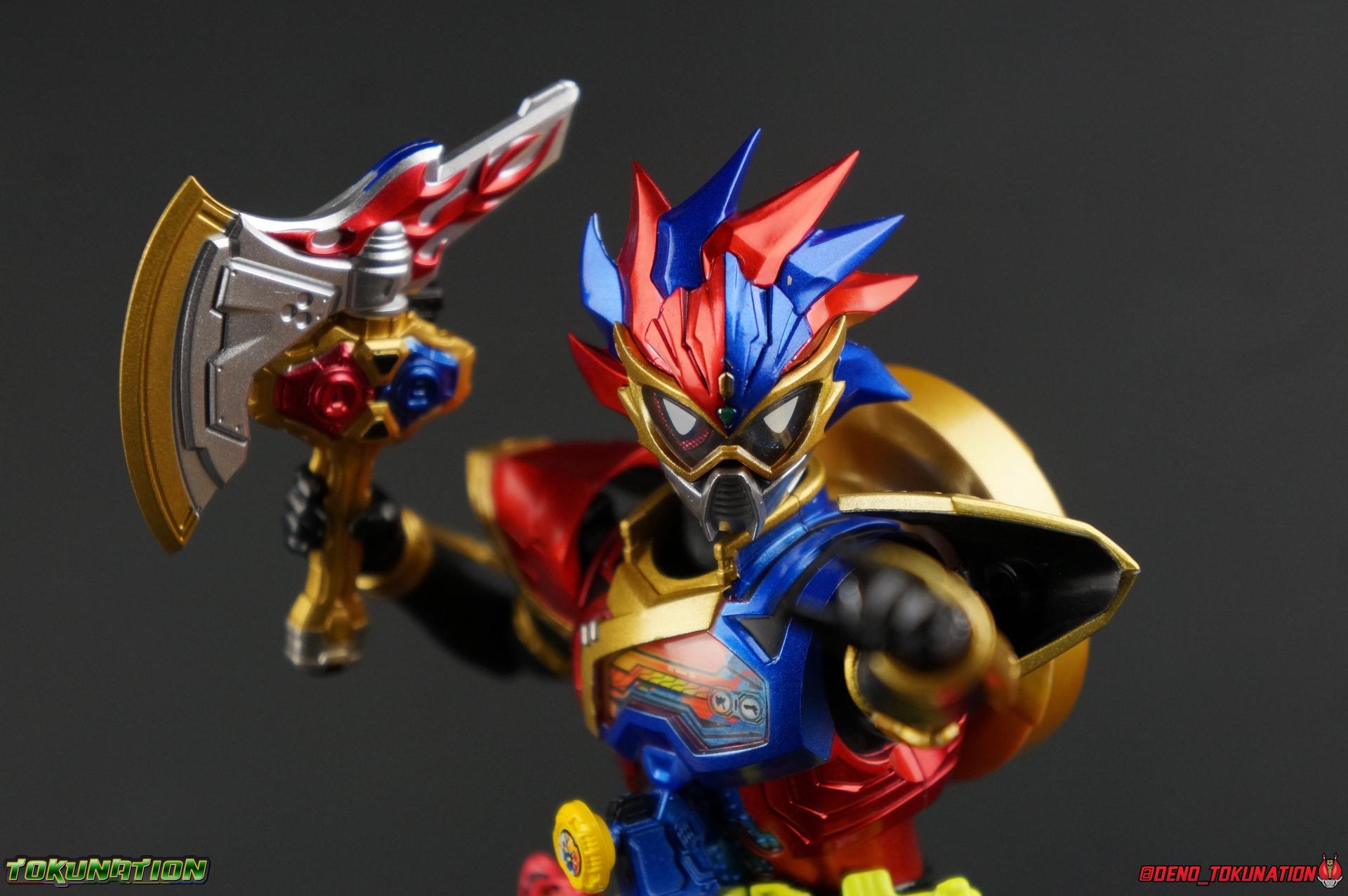 The Genius Gamer M or rather, the Bugster Parad whom'd given Emu those skills for years would eventually become Kamen Rider Para-DX. Using the Gashat Gear Dual he could alternate between two powerful Level 50 forms. In an attempt to stay relevant in Emu's life and surpass him, Parad would even go so far as to have himself be reprogrammed by Maximum Mighty X. This procedure allowed him to finally use a Gamer Driver like a human, in doing so giving him access to his most powerful form. Now we look at this pinnacle of strength & skill in our gallery of S.H. Figuarts Kamen rider Para-DX Perfect Knockout Gamer Level 99! Packaging As with previous releases, Para-DX Level 99's box is themed very similarly to the rest of the line. With it's bright, loud, packaging it's right at home with the rest of the Ex-Aid lineup. With no packaging window as all web exclusives are these days. As with the others the colors really pop and I like the character portrait on the front. And I'm always down for red/blue two-tone. That's about all there is to say on this one once again. Main Figure I'll be honest, it took me a long time to really care for Parad's Level 99 form in show. The design just did not work for me for some time. It felt very at odds with itself in my mind. But as the show continued it really became easier for me to digest the suit and I eventually really grew to like it overall. The figure won me over straight out of the box thanks to this. Para-DX Level 99 has a really strong and powerful sculpt that definitely showcases it's high level nature. This is a form that commands attention. And thanks to the 3-piece poseable skirt armor the figure can assume some really nice wide angled stances that are filled out a bit from these parts. Something about them helps contribute to the overall look of the figure and really bulks the lower body up quite nicely. Even if the legs themselves are still basically the Ex-Aid ones we've come to know so well, minor flaws and all, the whole package really works. And I absolutely LOVE the engraved puzzle piece design on the skirt. It's just top notch gorgeous as is the section on his abs. As with previous releases, the Gamer Driver is as always my favorite thing about these figures. This entire device is really intricately detailed for something at this scale. The Driver handle can still flip shut. Changes to this release include a new read out on the driver that pairs with this form. I'd never noticed before but it seems that the image is of Para-DX's Perfect Puzzle form. There's also the addition of the "dummy" Gashat Gear Dual, which is removable and compatible with all Gamer Drivers and double slotted Gashacon weapons. You can insert it into any other Gamer Driver with two open slots, much in the same way as Mighty Brothers XX or Snipe Level 50. At this scale I'm really impressed by the artwork on the front of the Gashat Gear Dual, it's a really good representation of the real deal. The Gashat Holster to the left of the Driver is empty. The upper body of the figure has a lot going on. Particularly on Parad's back. This is where the large Dial representing the Gashat Gear Dual sits. While pretty large this part doesn't detract from the design or hinder Parad's articulation. The chest detailing on the figure is also quite nice. As most always seems to be the case for Ex-Aid Riders, Para-DX has a nice crisp clear Rider Gauge in his chest as well. Honestly there's just a ton of great detailing on this fella. There's a lot of ornate engraving style details on the armor. The puzzle pieces I mentioned above are the best, but I love the sort of gold engraving done on the legs arms and shoulder pads. The shoulder pads while I'm on them, are a bit of a bother. The keep the figure from fully lifting his arms up perpendicular to the body. You can always rotate the shoulders back and angle things out as you need, but I'm always bothered when figures can't fully extend their arms out to the sides. That brings us to head, where the biggest fault of this release lies. Unfortunately the head was manufactured pretty inaccurately. The eyes within the visor are a bit misshapen compared to the actual show prop, but the bigger issue is their placement. They're supposed to touch the top edge of the visor and come down from there. Instead the eyes are almost centered within the visor. The look is both very off-putting and rather disappointing. The paint work on the rest of the helmet is brilliant but the issue with the eyes is just so irksome that it's difficult to enjoy it beyond that. The flared out alternating "hair" is very well done and definitely makes Para-DX seem just a 'tad' bit like a Yu-Gi-Oh character. Accessories Para-DX comes with pretty much all he really could. Even if it feels a bit on the lite side. 3 - Sets of hands. 2 splayed open hands, two more relaxed open hands, and two weapon holding hands. Nothing unique to speak of but enough hands to get the job done in most cases. 1 - Gashacon Parabladegun. This strange two form weapon has never felt like nearly as intuitive of a design as the Gashacon Breaker to me. And it feels just a bit awkward in toy form as well. It's detailed quite nicely so it at least looks good in that respect. But I almost do feel it's a little over-sized, maybe? The grip is just a hint too thick as well. It doesn't fit quite as well in Parad's hand as I'd like. To switch between the Ax & Gun modes you just rotate the blade back and forth. It's a little bit loose though. There's also a slot to accommodate any double sized Gashat to replicate a Critical Finish. I would really really hope that at some point in the future, an accurate head would be included with another Ex-Aid figuart, in much the same way that the original Accel figuart eventually got a new head with Booster. Para-DX's head is just kind of unforgivably off and we need a replacement for it ASAP. Toss it in with Perfect Puzzle or Knockout Fighter when and if those come out. Somethi
