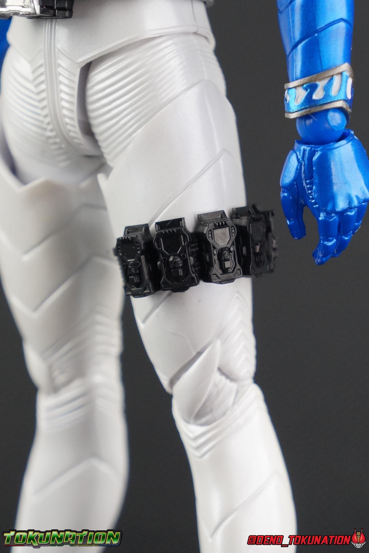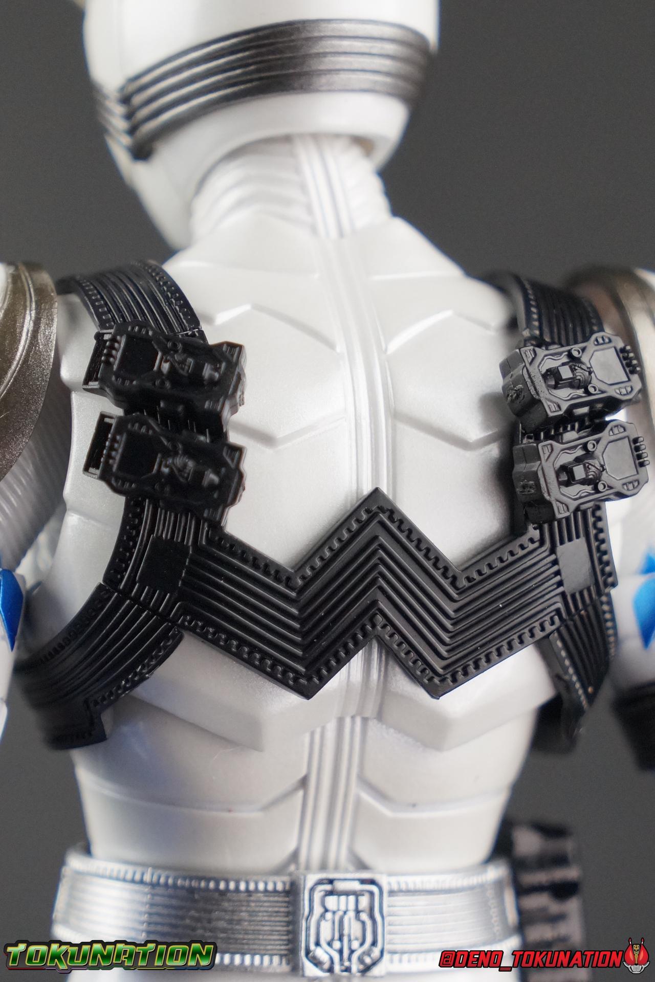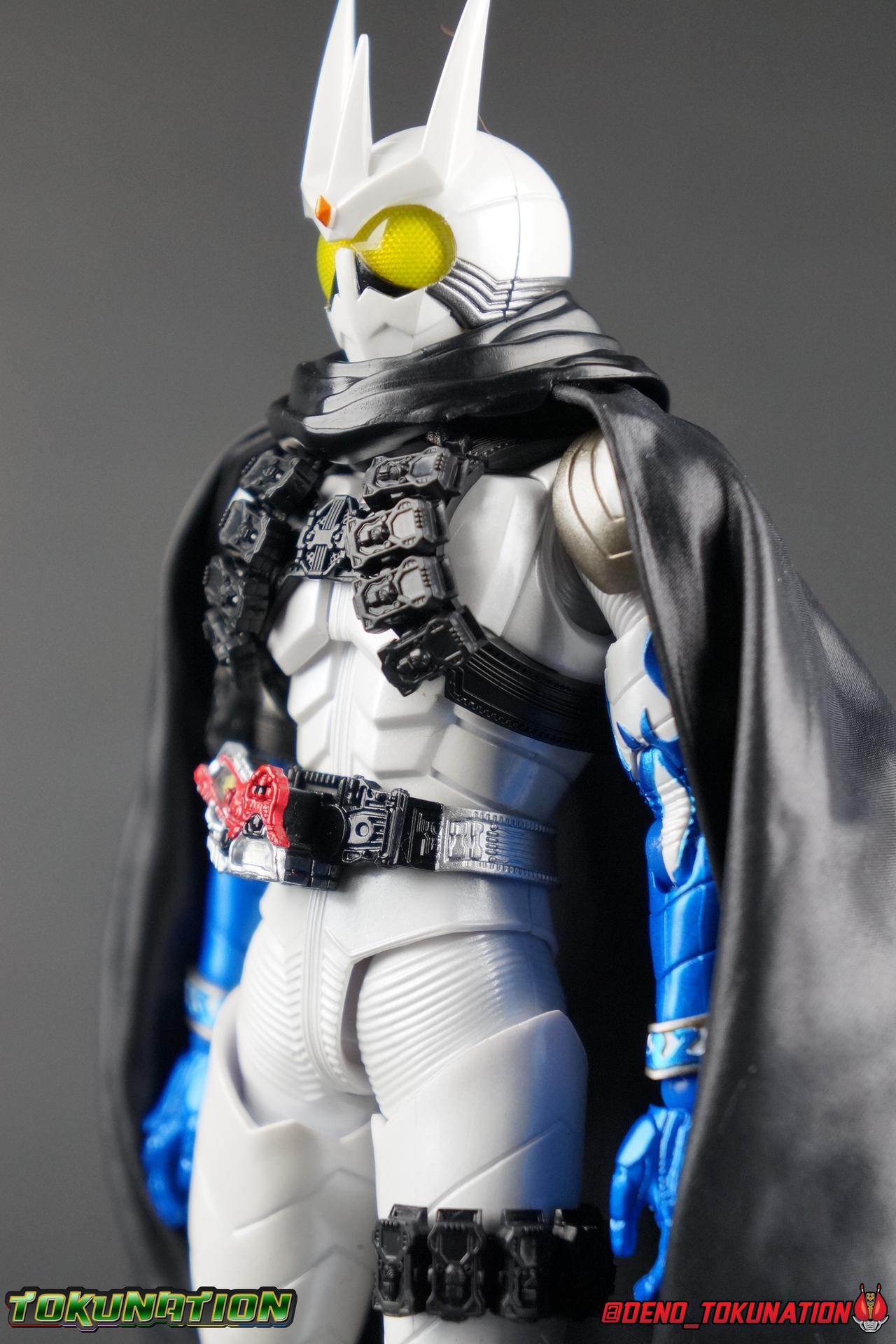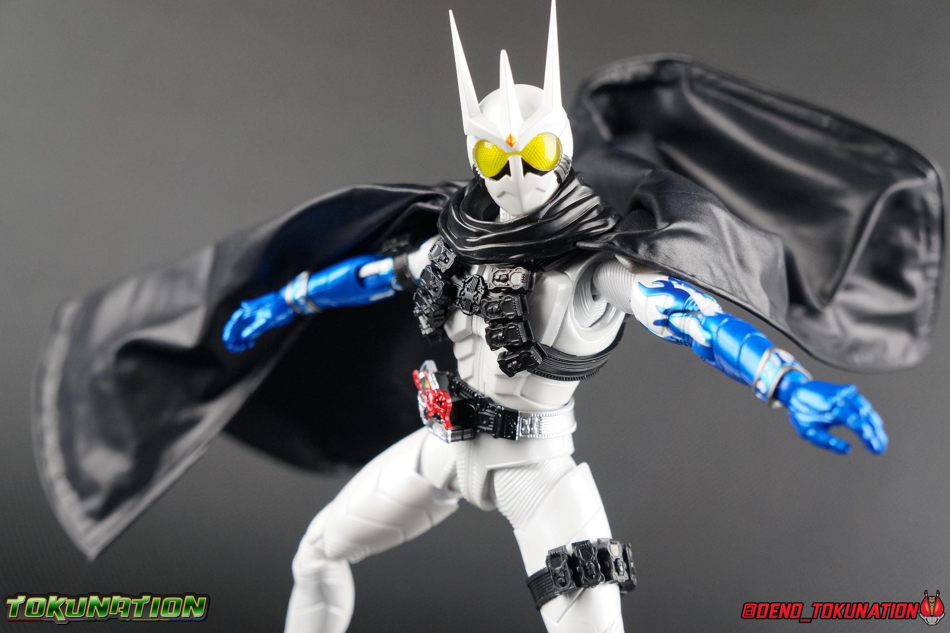 Katsumi Daido, the Necro-Over that preceded the beginning of the Gaia Memory Project, and member of NEVER. A conflicted individual, Katsumi had endured disease, suffering, and experimentation through out his life. He was in a sense the protagonist of the W Returns:Eternal V-Cinema which would shed light on his later (chronologically) appearance as the villain of Kamen Rider W Forever: A-Z The Gaia Memories of Fate. I've never been the biggest fan of the Kamen Rider W franchise, I've made no secret of that. But Shinkocchou Seihou has managed to re-create the gorgeous designs of the series and films exquisitely. Eternal is possibly the greatest example of this line so far. Here's why! Packaging The familiar Shinkocchou Seihou slip cover box makes another appearance! Nothing can be said about it this time that hasn't been said before. Only perhaps that due to Eternal's primarily white color scheme that his character portrait looks rather plain on the front. Main Figure In his first appearance (release order), Eternal is initially shown in his true form, Blue Flare. That's the one with the empty Gaia Memory holsters as well as (or without) his cape, the Eternal Robe. This form should not be confused for the earlier incomplete Eternal, Red Flare. Jun Kazu AKA the Utopia Dopant was the initial user of the Eternal Memory, but his incompatibility with it only allowed him access to the incomplete Red Flare form. Katsumi stole the T2 Eternal Memory & Driver and briefly assumed Red Flare during his first transformation before his perfect compatibility evolved the memory into the completed Blue Flare. The Seihou figure of Eternal, unlike the now ancient original figuart, comes in package loaded out in the further powered up Kyoka Busou/Strengthening Armament configuration. In this form Eternal's 26 Gaia Memory slots are filled thanks to the powers of the Zone Memory. While I'd rather review basic Blue Flare & work my way to Strengthening, I'll work from what we're given in package first. I apologize if that's a bit jarring in the gallery itself. With all that out of the way I just want to touch a bit on the functionality of the figure. I won't spend a ton of time on articulation because what you get is essentially identical to Seihou W & Seihou Skull. The W mold has, to me, been the pinnacle of Seihou/renewal engineering for Riders. Fantastic ankles and toe bends, really nice knees that look like a natural expansion of the costume akin to real fabric stretching, same for the hips. The right hip is weirdly very tight and feels like it could snap when applying too much pressure, I suspect my sample is a just a bit wonky is all. The legs are very tight generally on this release compared to W & Skull. And as with W & Skull, Eternal features an intricately detailed sculpt with appropriate paint apps for his Lost Driver, which is entirely functional. We have an open slot for any to-scale Gaia Memory to be inserted. I find that of the 4 Seihou W Riders I own thus far, Eternal has by far the most loose driver slot. If you breath, memories falls out of there. I'm still amazed at how well the upper body is designed as well. When I initially handled Seihou W, I thought that figure's torso was all one piece until I realized the upper body could move. Eternal still looks that good in hand, though the upper body joints are much tighter. This figure can pull off most any pose you recall him making, and looks absolutely perfect while doing so. I really want to touch on the fantastically sculpted & painted blue flames on Eternals' forearms as well. That electric blue just glows in the right light. I can't wait to see the eventual red flare repaint of this bad boy. Now to some specifics for Strengthening. I've included break down shot of the parts that are removable to change Eternal to standard Blue Flare. As you can see the hip holster, chest & back straps, and bicep strap are all removable. Here's the good part, these Gaia Memories don't come out of their slots as many people seemingly feared. They're molded as solid pieces so no worries losing those. Actually, two of the 26 memories are removable but I'll explain that in the accessories section below. These memories are extraordinarily detailed at their scale just like with the individual ones included for Drivers & weapons with these releases. It's details like this that make this a really sensible release as a web exclusive. It's just so lavishly detailed that it would totally cost out of being an affordable retail figure I'm sure. The standard Blue Flare form of course swaps the holsters out for the empty straps included with the figure. And it's very easy to swap every thing out. While all the parts plug in snugly they're easy to remove as well, even with how the right arm has to come off. The addition of the Eternal Robe completes this look quite nicely but I'll get into that a bit further below. Accessories Bucking the trend of many Web Exclusives, Eternal is loaded down with cool stuff! 3 - Individual Gaia Memories. That's the Eternal, Unicorn, & Zone Memories. Each is phenomenally detailed and easily lost. So be careful! 1 - Eternal Edge. Eternals' personal weapon is a fairly simple knife with a Gaia Memory slot on the back of the grip. Surprisingly this holds memories much more securely than the Lost Driver can. 6 - sets of hands. That's kind of crazy honestly. So many hands, and frankly not enough variety. Like 2 sets that essentially accomplish the same thing, holding memories. While we only get one open palm set of hands that's so unnatural and expressionless. The two varieties of Edge holding hands are great though. A different pair to hold it correctly blade out, or upside down. And I'm always a fans of thumbs up hands, so lucky for me Eternal comes with a right & left. I would have just really liked some more expressive action style hands. 1 - set of empty memory straps. As I mentioned above these are very easy to swap out and I've included some pi