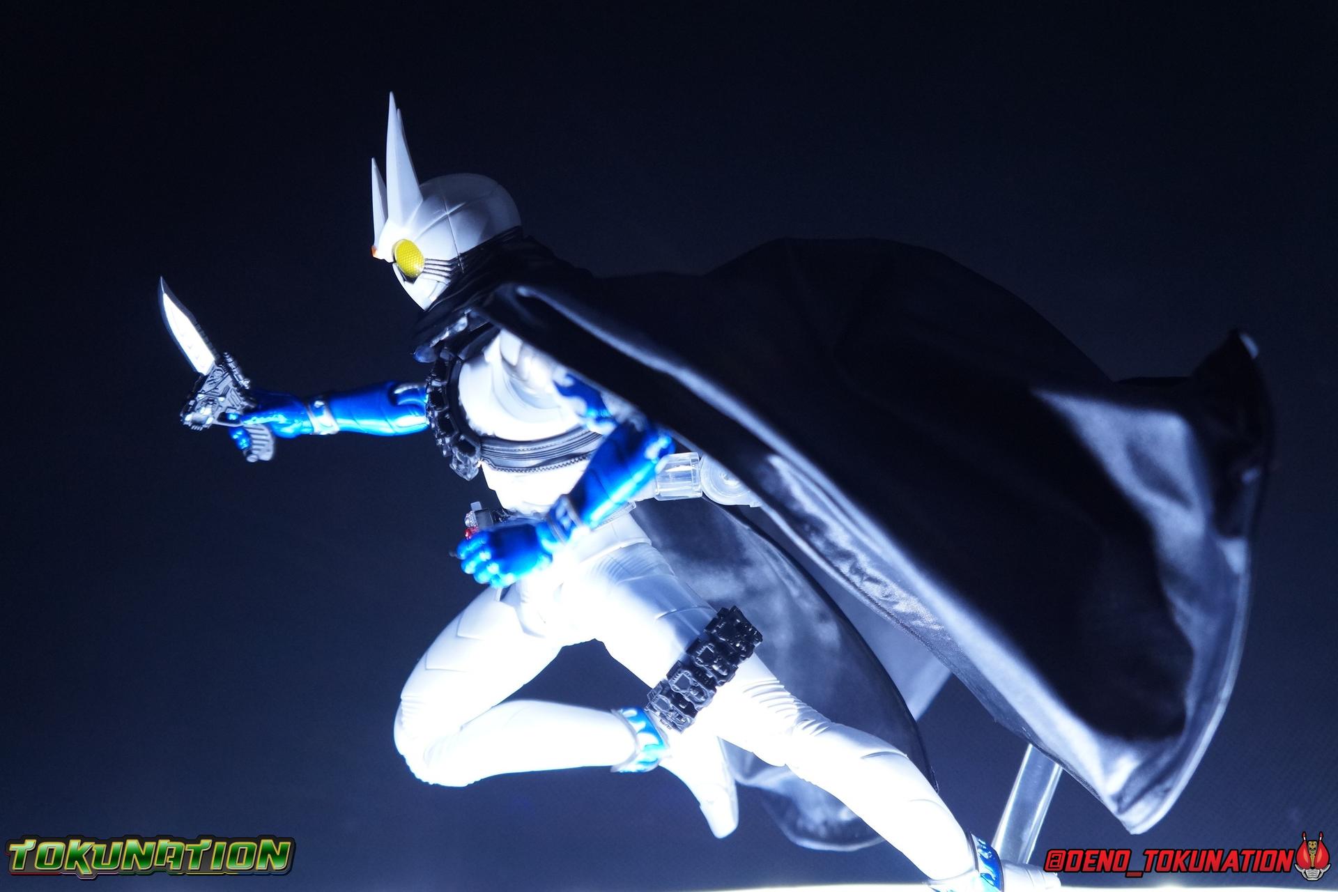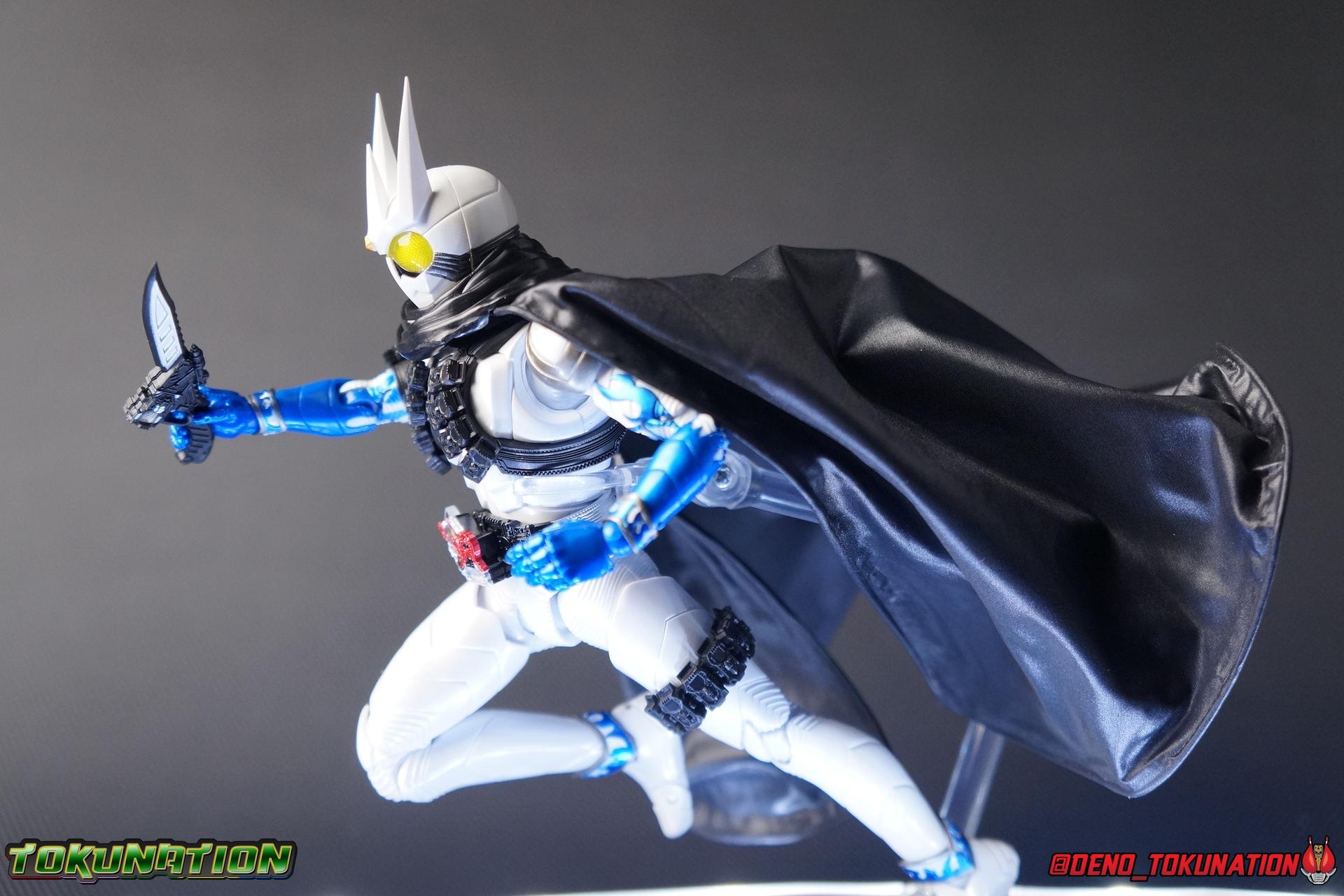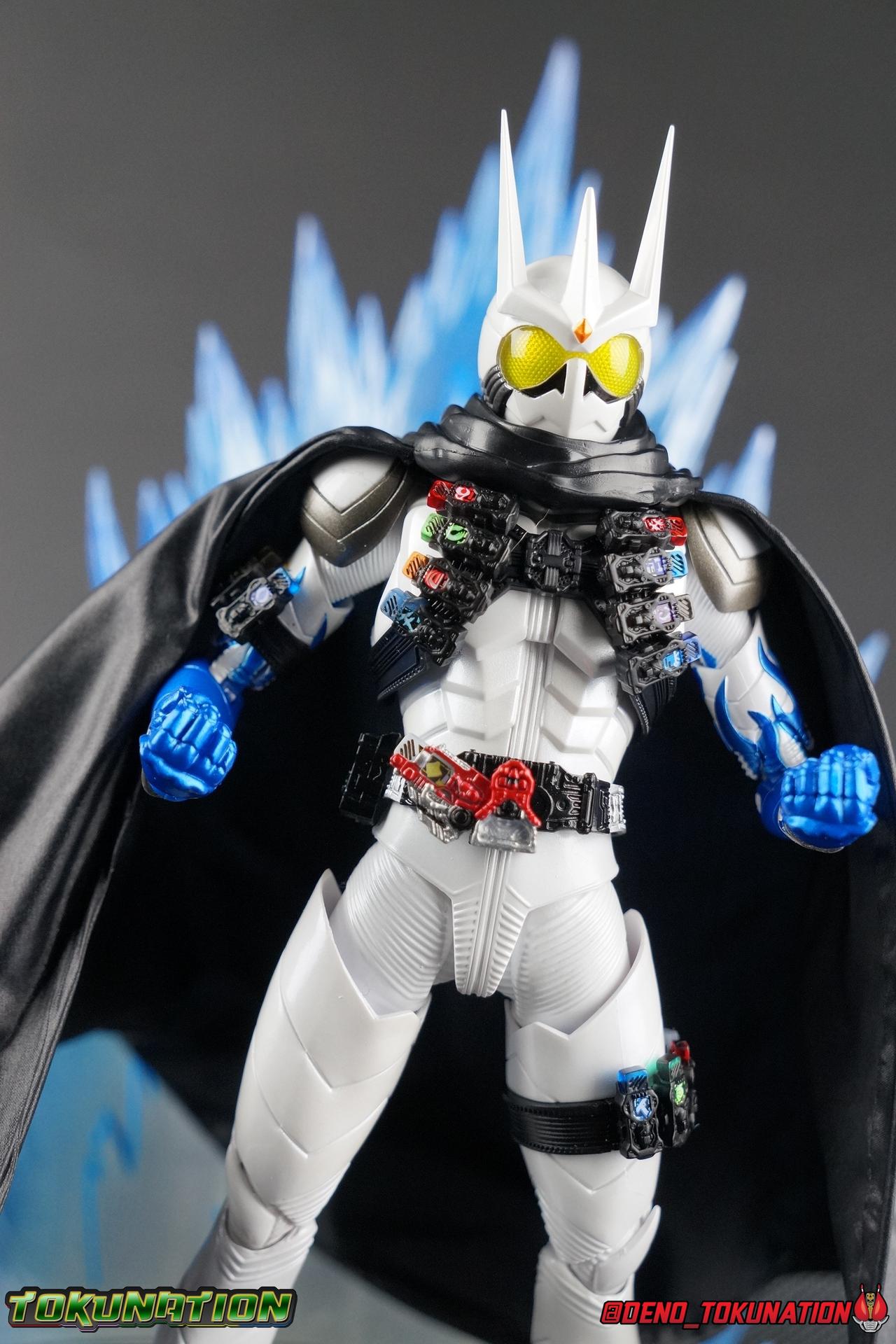 Katsumi Daido, the Necro-Over that preceded the beginning of the Gaia Memory Project, and member of NEVER. A conflicted individual, Katsumi had endured disease, suffering, and experimentation through out his life. He was in a sense the protagonist of the W Returns:Eternal V-Cinema which would shed light on his later (chronologically) appearance as the villain of Kamen Rider W Forever: A-Z The Gaia Memories of Fate. I've never been the biggest fan of the Kamen Rider W franchise, I've made no secret of that. But Shinkocchou Seihou has managed to re-create the gorgeous designs of the series and films exquisitely. Eternal is possibly the greatest example of this line so far. Here's why! Packaging The familiar Shinkocchou Seihou slip cover box makes another appearance! Nothing can be said about it this time that hasn't been said before. Only perhaps that due to Eternal's primarily white color scheme that his character portrait looks rather plain on the front. Main Figure In his first appearance (release order), Eternal is initially shown in his true form, Blue Flare. That's the one with the empty Gaia Memory holsters as well as (or without) his cape, the Eternal Robe. This form should not be confused for the earlier incomplete Eternal, Red Flare. Jun Kazu AKA the Utopia Dopant was the initial user of the Eternal Memory, but his incompatibility with it only allowed him access to the incomplete Red Flare form. Katsumi stole the T2 Eternal Memory & Driver and briefly assumed Red Flare during his first transformation before his perfect compatibility evolved the memory into the completed Blue Flare. The Seihou figure of Eternal, unlike the now ancient original figuart, comes in package loaded out in the further powered up Kyoka Busou/Strengthening Armament configuration. In this form Eternal's 26 Gaia Memory slots are filled thanks to the powers of the Zone Memory. While I'd rather review basic Blue Flare & work my way to Strengthening, I'll work from what we're given in package first. I apologize if that's a bit jarring in the gallery itself. With all that out of the way I just want to touch a bit on the functionality of the figure. I won't spend a ton of time on articulation because what you get is essentially identical to Seihou W & Seihou Skull. The W mold has, to me, been the pinnacle of Seihou/renewal engineering for Riders. Fantastic ankles and toe bends, really nice knees that look like a natural expansion of the costume akin to real fabric stretching, same for the hips. The right hip is weirdly very tight and feels like it could snap when applying too much pressure, I suspect my sample is a just a bit wonky is all. The legs are very tight generally on this release compared to W & Skull. And as with W & Skull, Eternal features an intricately detailed sculpt with appropriate paint apps for his Lost Driver, which is entirely functional. We have an open slot for any to-scale Gaia Memory to be inserted. I find that of the 4 Seihou W Riders I own thus far, Eternal has by far the most loose driver slot. If you breath, memories falls out of there. I'm still amazed at how well the upper body is designed as well. When I initially handled Seihou W, I thought that figure's torso was all one piece until I realized the upper body could move. Eternal still looks that good in hand, though the upper body joints are much tighter. This figure can pull off most any pose you recall him making, and looks absolutely perfect while doing so. I really want to touch on the fantastically sculpted & painted blue flames on Eternals' forearms as well. That electric blue just glows in the right light. I can't wait to see the eventual red flare repaint of this bad boy. Now to some specifics for Strengthening. I've included break down shot of the parts that are removable to change Eternal to standard Blue Flare. As you can see the hip holster, chest & back straps, and bicep strap are all removable. Here's the good part, these Gaia Memories don't come out of their slots as many people seemingly feared. They're molded as solid pieces so no worries losing those. Actually, two of the 26 memories are removable but I'll explain that in the accessories section below. These memories are extraordinarily detailed at their scale just like with the individual ones included for Drivers & weapons with these releases. It's details like this that make this a really sensible release as a web exclusive. It's just so lavishly detailed that it would totally cost out of being an affordable retail figure I'm sure. The standard Blue Flare form of course swaps the holsters out for the empty straps included with the figure. And it's very easy to swap every thing out. While all the parts plug in snugly they're easy to remove as well, even with how the right arm has to come off. The addition of the Eternal Robe completes this look quite nicely but I'll get into that a bit further below. Accessories Bucking the trend of many Web Exclusives, Eternal is loaded down with cool stuff! 3 - Individual Gaia Memories. That's the Eternal, Unicorn, & Zone Memories. Each is phenomenally detailed and easily lost. So be careful! 1 - Eternal Edge. Eternals' personal weapon is a fairly simple knife with a Gaia Memory slot on the back of the grip. Surprisingly this holds memories much more securely than the Lost Driver can. 6 - sets of hands. That's kind of crazy honestly. So many hands, and frankly not enough variety. Like 2 sets that essentially accomplish the same thing, holding memories. While we only get one open palm set of hands that's so unnatural and expressionless. The two varieties of Edge holding hands are great though. A different pair to hold it correctly blade out, or upside down. And I'm always a fans of thumbs up hands, so lucky for me Eternal comes with a right & left. I would have just really liked some more expressive action style hands. 1 - set of empty memory straps. As I mentioned above these are very easy to swap out and I've included some pi