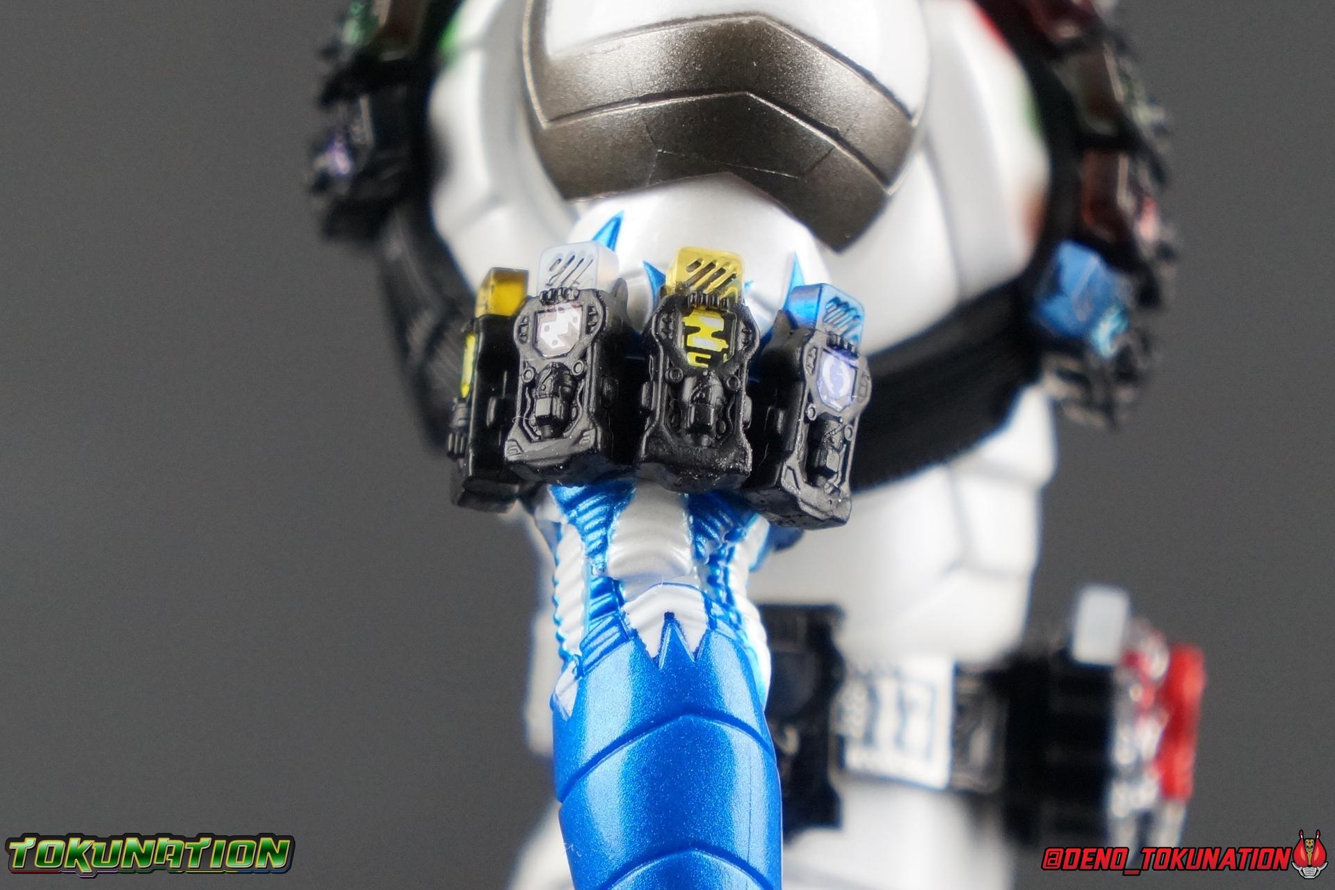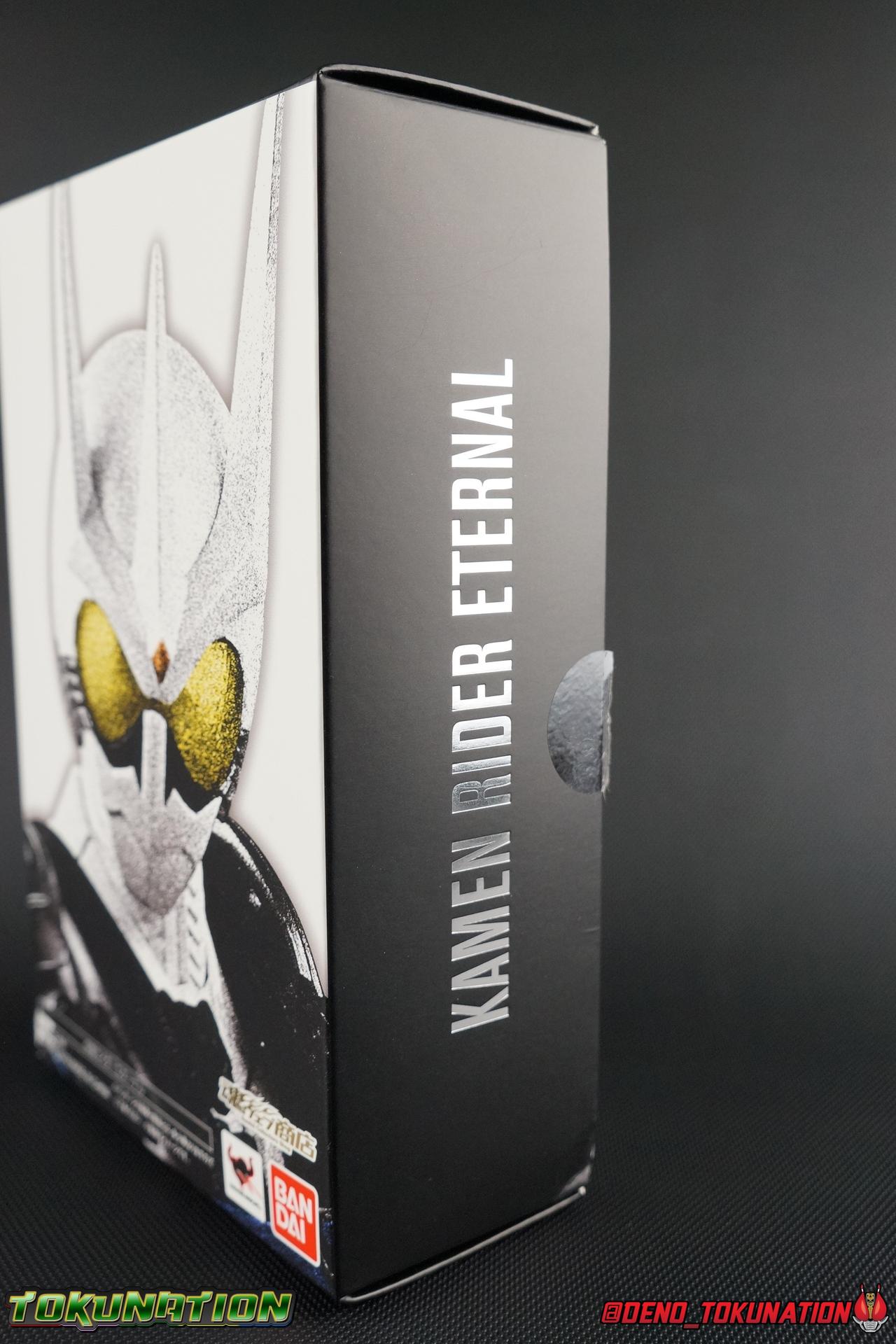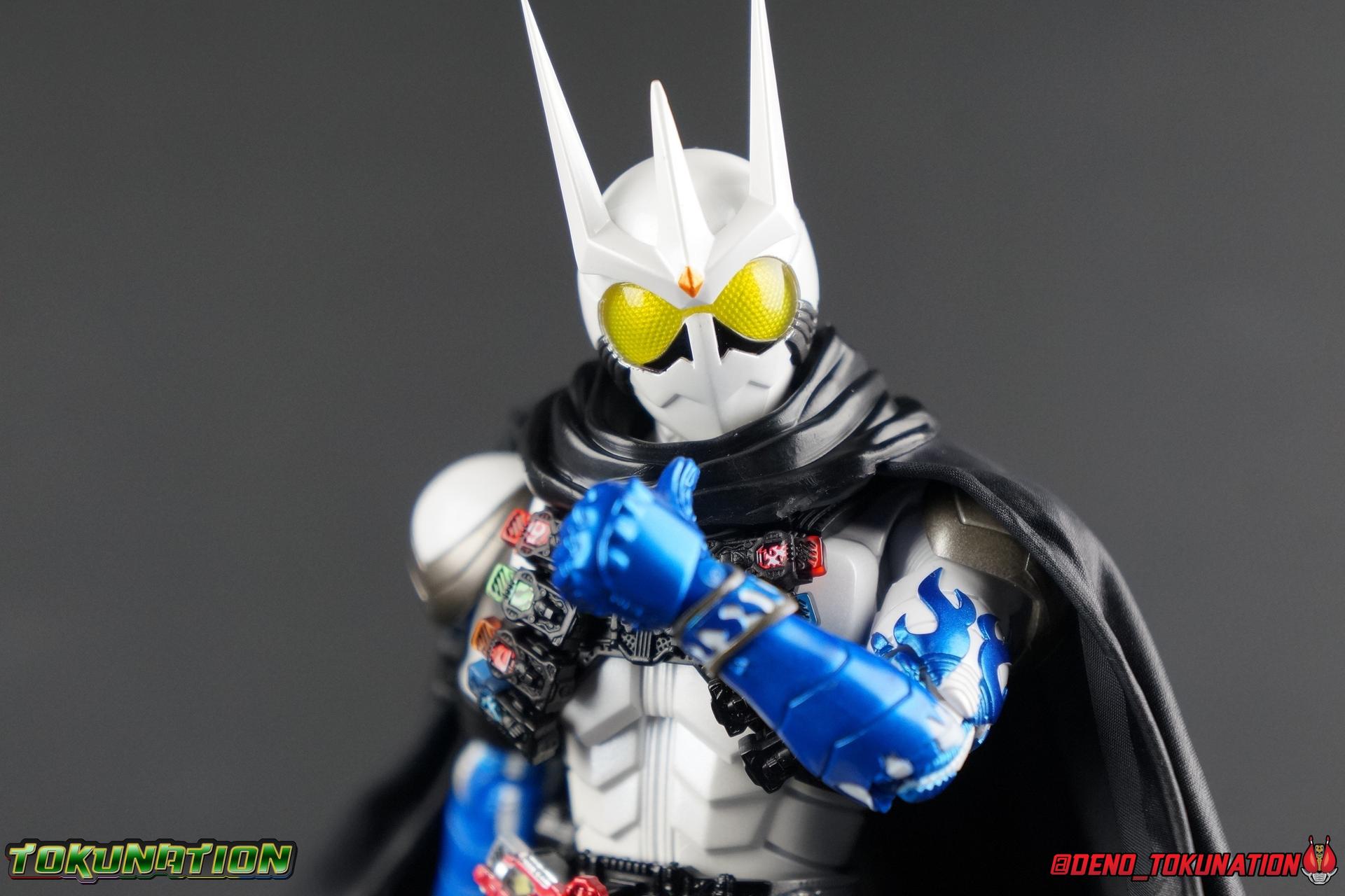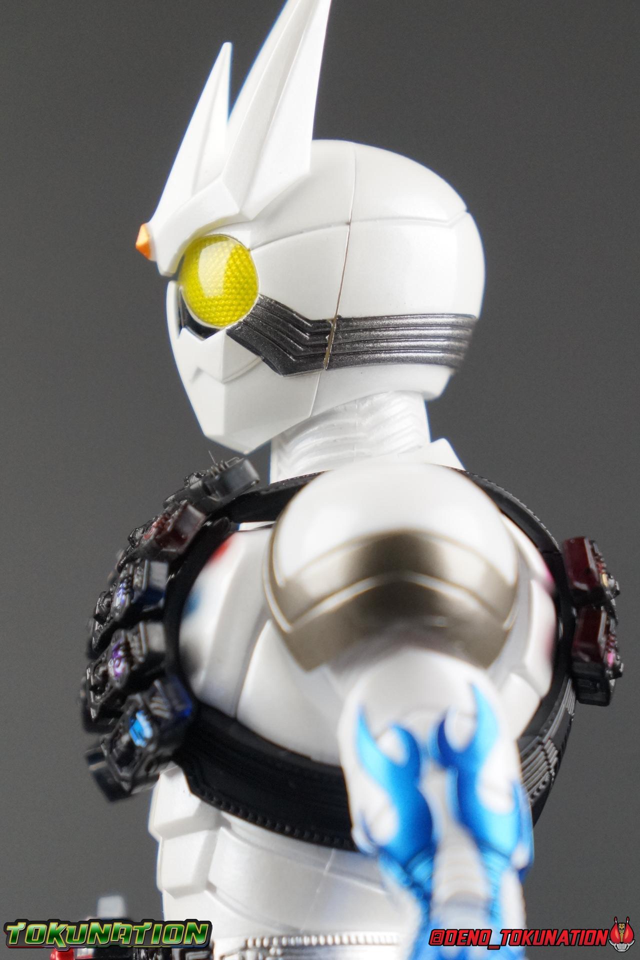 Katsumi Daido, the Necro-Over that preceded the beginning of the Gaia Memory Project, and member of NEVER. A conflicted individual, Katsumi had endured disease, suffering, and experimentation through out his life. He was in a sense the protagonist of the W Returns:Eternal V-Cinema which would shed light on his later (chronologically) appearance as the villain of Kamen Rider W Forever: A-Z The Gaia Memories of Fate. I've never been the biggest fan of the Kamen Rider W franchise, I've made no secret of that. But Shinkocchou Seihou has managed to re-create the gorgeous designs of the series and films exquisitely. Eternal is possibly the greatest example of this line so far. Here's why! Packaging The familiar Shinkocchou Seihou slip cover box makes another appearance! Nothing can be said about it this time that hasn't been said before. Only perhaps that due to Eternal's primarily white color scheme that his character portrait looks rather plain on the front. Main Figure In his first appearance (release order), Eternal is initially shown in his true form, Blue Flare. That's the one with the empty Gaia Memory holsters as well as (or without) his cape, the Eternal Robe. This form should not be confused for the earlier incomplete Eternal, Red Flare. Jun Kazu AKA the Utopia Dopant was the initial user of the Eternal Memory, but his incompatibility with it only allowed him access to the incomplete Red Flare form. Katsumi stole the T2 Eternal Memory & Driver and briefly assumed Red Flare during his first transformation before his perfect compatibility evolved the memory into the completed Blue Flare. The Seihou figure of Eternal, unlike the now ancient original figuart, comes in package loaded out in the further powered up Kyoka Busou/Strengthening Armament configuration. In this form Eternal's 26 Gaia Memory slots are filled thanks to the powers of the Zone Memory. While I'd rather review basic Blue Flare & work my way to Strengthening, I'll work from what we're given in package first. I apologize if that's a bit jarring in the gallery itself. With all that out of the way I just want to touch a bit on the functionality of the figure. I won't spend a ton of time on articulation because what you get is essentially identical to Seihou W & Seihou Skull. The W mold has, to me, been the pinnacle of Seihou/renewal engineering for Riders. Fantastic ankles and toe bends, really nice knees that look like a natural expansion of the costume akin to real fabric stretching, same for the hips. The right hip is weirdly very tight and feels like it could snap when applying too much pressure, I suspect my sample is a just a bit wonky is all. The legs are very tight generally on this release compared to W & Skull. And as with W & Skull, Eternal features an intricately detailed sculpt with appropriate paint apps for his Lost Driver, which is entirely functional. We have an open slot for any to-scale Gaia Memory to be inserted. I find that of the 4 Seihou W Riders I own thus far, Eternal has by far the most loose driver slot. If you breath, memories falls out of there. I'm still amazed at how well the upper body is designed as well. When I initially handled Seihou W, I thought that figure's torso was all one piece until I realized the upper body could move. Eternal still looks that good in hand, though the upper body joints are much tighter. This figure can pull off most any pose you recall him making, and looks absolutely perfect while doing so. I really want to touch on the fantastically sculpted & painted blue flames on Eternals' forearms as well. That electric blue just glows in the right light. I can't wait to see the eventual red flare repaint of this bad boy. Now to some specifics for Strengthening. I've included break down shot of the parts that are removable to change Eternal to standard Blue Flare. As you can see the hip holster, chest & back straps, and bicep strap are all removable. Here's the good part, these Gaia Memories don't come out of their slots as many people seemingly feared. They're molded as solid pieces so no worries losing those. Actually, two of the 26 memories are removable but I'll explain that in the accessories section below. These memories are extraordinarily detailed at their scale just like with the individual ones included for Drivers & weapons with these releases. It's details like this that make this a really sensible release as a web exclusive. It's just so lavishly detailed that it would totally cost out of being an affordable retail figure I'm sure. The standard Blue Flare form of course swaps the holsters out for the empty straps included with the figure. And it's very easy to swap every thing out. While all the parts plug in snugly they're easy to remove as well, even with how the right arm has to come off. The addition of the Eternal Robe completes this look quite nicely but I'll get into that a bit further below. Accessories Bucking the trend of many Web Exclusives, Eternal is loaded down with cool stuff! 3 - Individual Gaia Memories. That's the Eternal, Unicorn, & Zone Memories. Each is phenomenally detailed and easily lost. So be careful! 1 - Eternal Edge. Eternals' personal weapon is a fairly simple knife with a Gaia Memory slot on the back of the grip. Surprisingly this holds memories much more securely than the Lost Driver can. 6 - sets of hands. That's kind of crazy honestly. So many hands, and frankly not enough variety. Like 2 sets that essentially accomplish the same thing, holding memories. While we only get one open palm set of hands that's so unnatural and expressionless. The two varieties of Edge holding hands are great though. A different pair to hold it correctly blade out, or upside down. And I'm always a fans of thumbs up hands, so lucky for me Eternal comes with a right & left. I would have just really liked some more expressive action style hands. 1 - set of empty memory straps. As I mentioned above these are very easy to swap out and I've included some pi