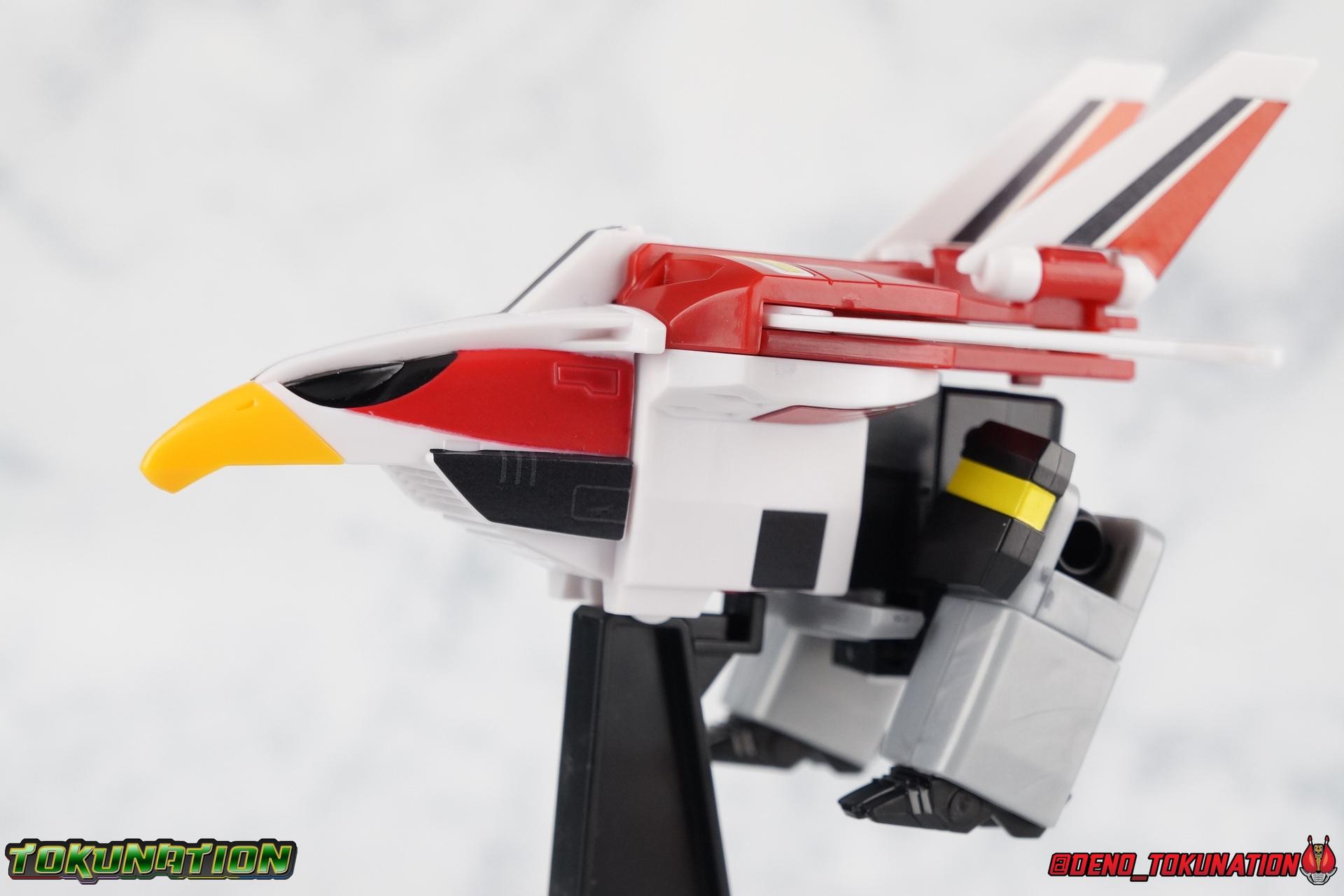 Either of the names Sky Machine or Jet Falcon are acceptable and they've been used interchangeably by Bandai over the years to refer to this machine. The Super Minipla packaging uses the name Sky Machine though so for consistency I'll be using that from here on. I won't be focusing on describing the process to build this figure so much as just it's functionality as an individual once built. I've included extensive step by step photos to build each of the 3 machines so hopefully that should do a better job of explaining the building process than I could. Now like I said in the first post, these Super Minipla are a lot more complex than what customers of the old line have become accustomed to. That means a larger number of parts and a more complex build. However it ALSO means fewer stickers. Because of the line's more collector oriented nature it means that some parts come pre-painted from the factory for you! Often Minipla collector's either choose to paint certain parts (or entire kits) or in order to get that little bit of accuracy that was missing they have to. Thankfully with this line Bandai is opting to paint relevant parts that otherwise be very difficult to sticker up, for you. In Sky Machine's case that means you get both halves of the Jet's bird face as well as the combined Live Robo head. There is a small sticker sheet included to finish detailing up this bad boy, much of which gets applied to the wings and back plate. Sky Machine by far needs more stickers than the other two components but just get yourself some fine tipped tweezers and you'll manage. On it's own the Sky Machine doesn't do much honestly. The tail fins and wings do move, though that's more a by-product of it's transformation than any thing else. The figure actually does have extending bird talons it can stand on too. The grey chunks that become the Live Robo's thighs in combined mode have caps on the end that can be removed, when done you can extend these bird legs out. Though they don't serve a ton of purpose, you have to lean Sky Machine pretty far back to make use of them. However, this piece of the set also includes the parts to make a Display Base! This simple single arm base does wonders for displaying any of the 3 Machines but is primarily meant for Sky Machine. It's a simple plug type base with no poseable arm, but each of the 3 machines has a port that fits it. A port that is also the same size as a Tamashii Stage arm, so you have options. Thankfully the Live Robo Base also has peg hole storage on the side to store the extra fists that come with Land Machine.
