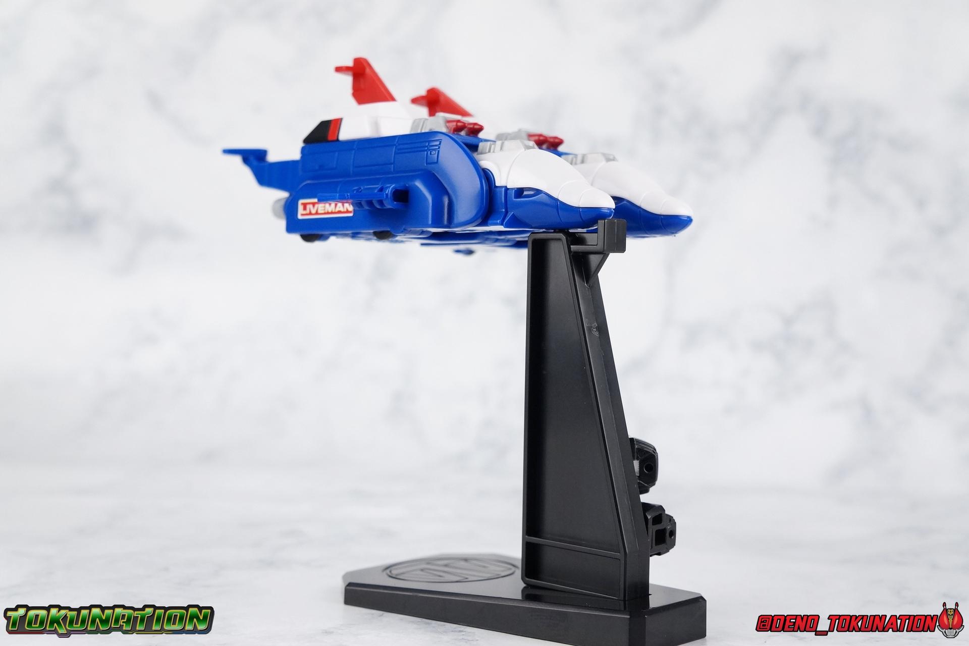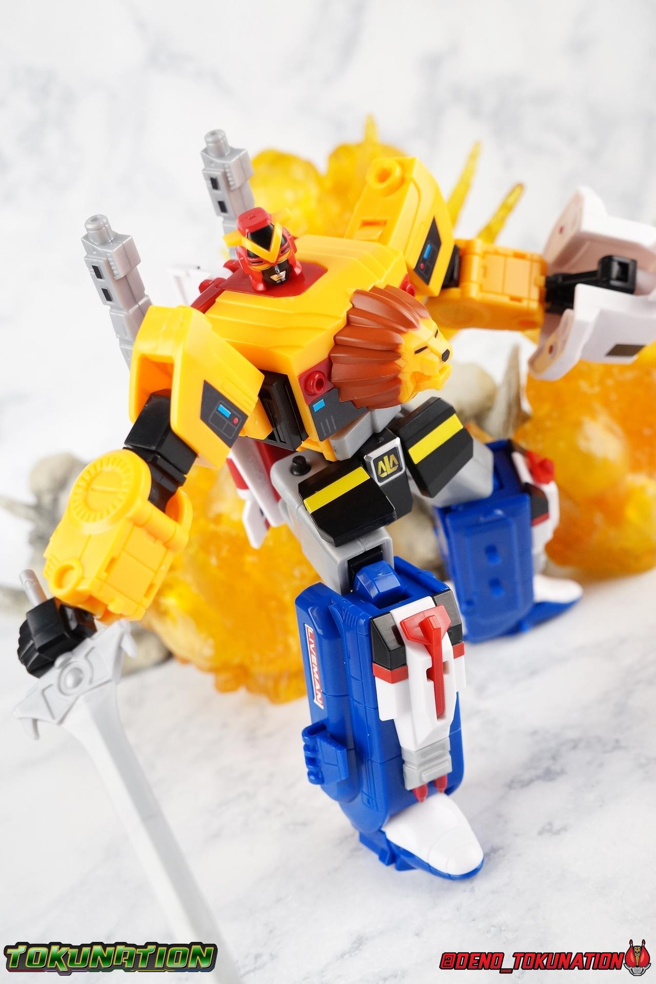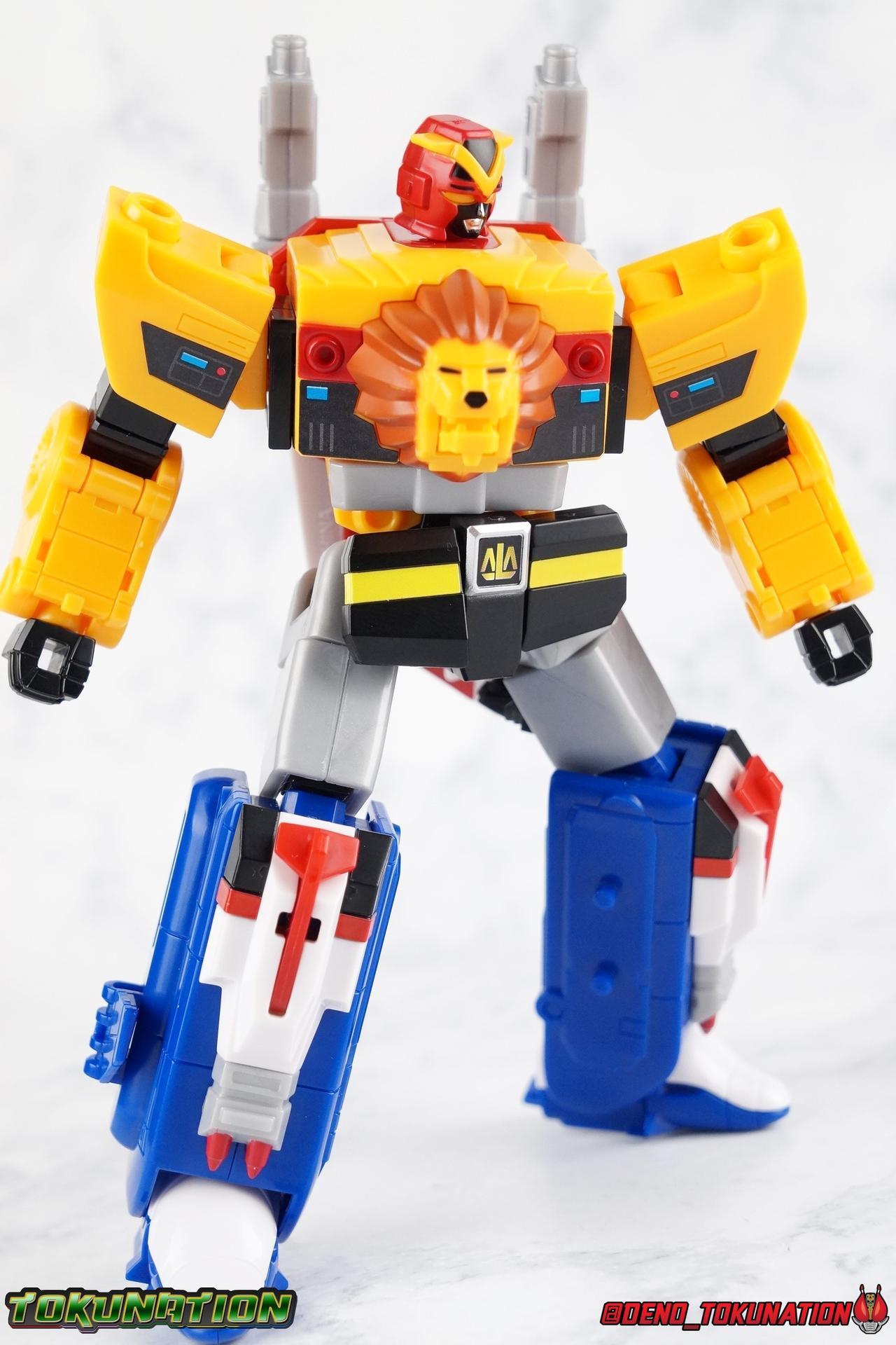 Now for the main event, Live Dimension! By far the greatest strength of the Super Minipla line is it's ability to recreate combined robots so excellently. You get a great functional toy with some fantastic proportions and accessories. Unlike many minipla of the past, you can also get around most part swapping for the transformations. In Live Robo's case, a mere 3 parts are removed and totally set aside for this transformation. Only the plugs that cover the knee plugs on Sky Machine and the tail from Land Machine are left over in the end. I've included step by step photos to show you how to get from each individual machine into the parts you need. While I think those images can speak for themselves I do want to mention a couple of fascinating things about the combination that I love. First, the way the lower half of Sky Machine slides down to accommodate the Land Machine chest, then slides back up to lock it in place and hide Land Machine's front legs just blows my mind. Likewise the way in which Land Machine's legs rotate out on that shared black joint within the chest is just incredible to me. The way it moves is just so fluid it's hard to believe this is a minipla. Once you've assembled Live Robo, you have one hell of a fun little figure. Without getting into the weapons yet, Live Robo is a great and poseable action figure in it's own right. The feet have side tilting joints thanks to how the feet are built, while the ankles can tilt forward and back too. Because of the nature of joints in the thighs we also get a nice knee joint connected to Aqua Machine that extends out it's main body. Then there's a mid-thigh swivel as well as a rotating hip joint. Now the hips are TIGHT, scary forceful on my Live Robo. Just be wary. All of this adds up to some extraordinary articulation in the lower body. This thing can stand on one leg with the other wrapped around it's back even. Despite it's complicated assembly even the torso can rotate pretty freely. The shoulders are each on a sort of butterfly joint that allows them to move very high up (at the cost of looking a bit inaccurate) but the arms can also swing out quite wide. Now for my one big complaint, the elbows have almost no range. Mostly because they have to accommodate the way the lion legs transform, they can only rotate forward about a quarter turn before they impact the opening forearm panel. The rotating biceps and fists can help alleviate some of this but it's still imperfect. Finally the head is on a small but useful balljoint that allows it to move a lot more than it appears at first glance. Able to spin around completely and angle up or down just a bit goes a long way to helping create personality for this mecha. Now for weapons. Live Robo comes with a shield formed from Sky Machine called the Live Shield. A square peg on the handle allows it to fit snugly into either hand of the Live Robo and it's hinged to pose it out of the way. We also get the mighty Chojuken or Super Beast Sword. Oddly this accessory isn't painted nor are there stickers included for it so the hilt remains in accurate. I don't paint or panel line or do anything outside of what the stock instructions give me for model kits. I like to straight build everything, that's just the way I am and I'll always be. If you've ever seen Gundam Build Fighters, think of me like Straight Build Shimon. I don't feel like I should have to recreate missing details they should simply be there, and I'm not particularly good at it either. So these little inaccuracies are frustrating, but not deal breaking. Final Thoughts Super Minipla is a revolutionary toyline for Super Sentai. As someone who typically collects DX toys, Robot Damashii, S.H. Figuarts, and Chogokin type figures, I was not prepared to be up for another toyline. But the chance to own a classic design like the Live Robo in an affordable way was something I couldn't pass up on. And I'm glad I didn't. If Bandai keeps it up and does more pre-Zyuranger mecha then I may actually be all in on this line. For now, I'm extremely please with how Super Minipla Live Robo has turned out.