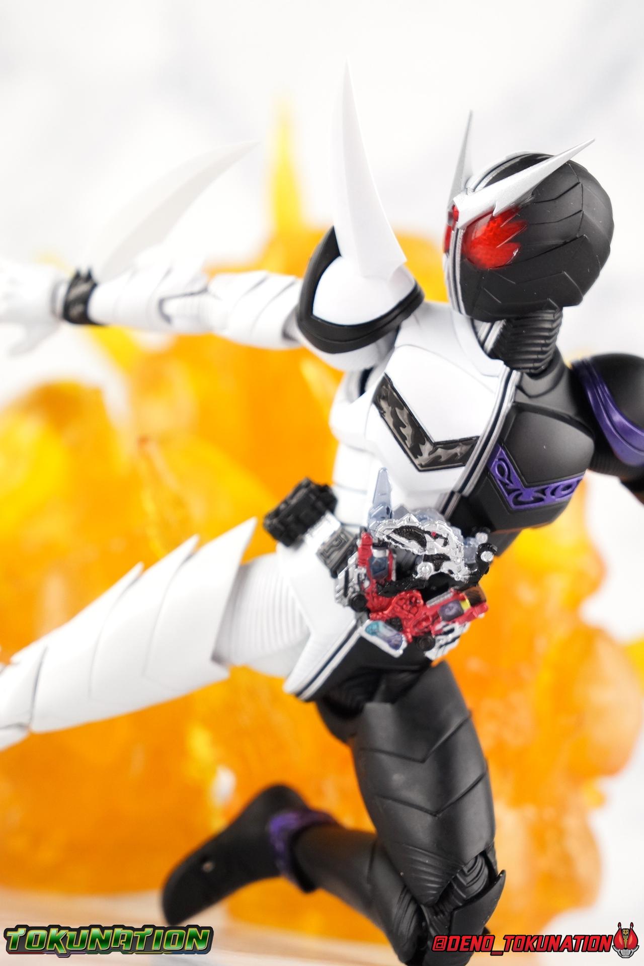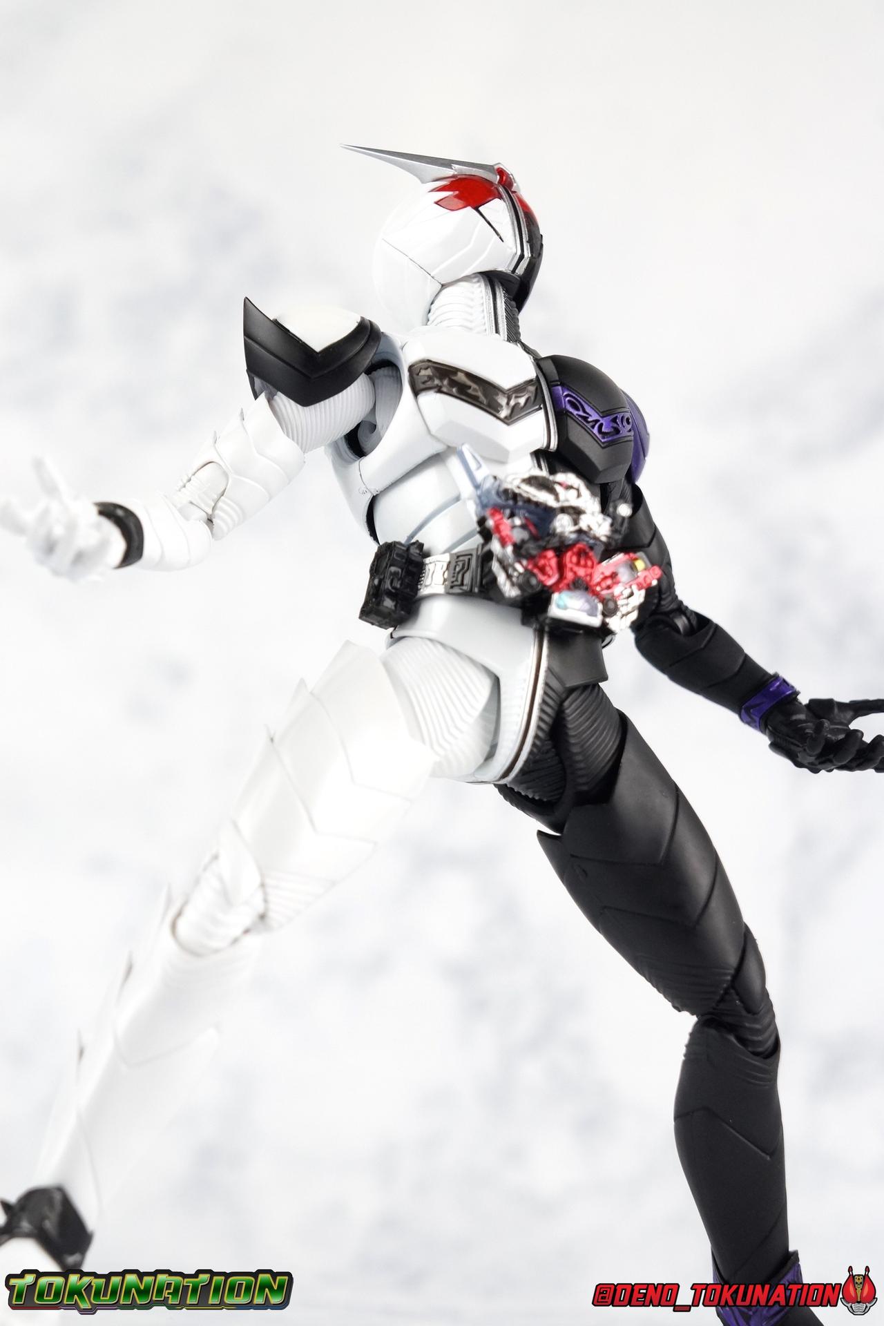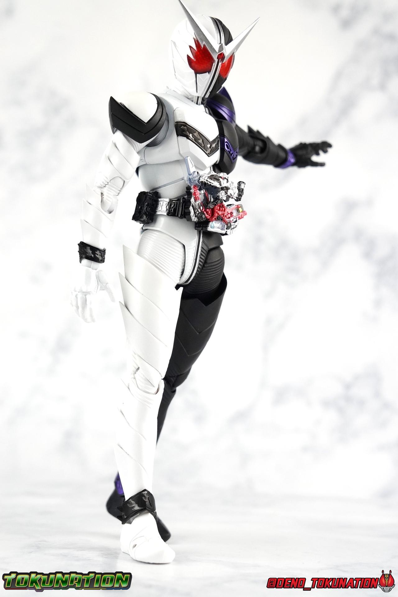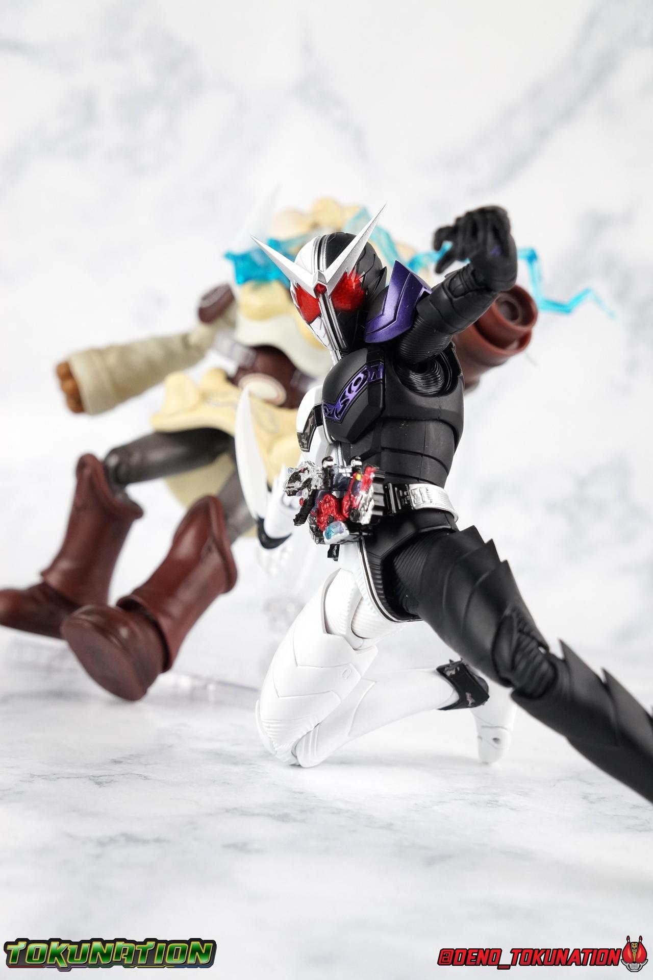 Begins Night. The incident that set the events of the Kamen Rider W series into motion. This incident also heralded the birth of Kamen Rider W's first and most ferocious form. One so powerful that, for a time, Phillip & Shotaro purposefully avoided using it or they'd risk losing control entirely. Eventually mastered, this form was a force to be reckoned with until the introduction of Xtreme. On occasion used to fight some of W's fiercest opponents, even Kamen Rider Eternal. Now, after languishing for nearly a decade with the original figuarts release, Bandai has recreated this powerhouse form in S.H. Figuarts Shinkocchou Seihou Kamen Rider W Fang/Joker! Packaging The familiar Shinkocchou Seihou slip cover box makes another appearance! Nothing can be said about it this time that hasn't been said before. It's gotten a bit stale over time but it's still a pleasing type of collector's packaging. Main Figure As with the previous line of Kamen Rider W figuarts, the Seihou releases rely heavily on repaints. Fang/Joker is just the latest such, soon to be followed up by Heat/Metal & Luna/Trigger. The nice thing about that is, that we know what to expect when it comes to this release and others from the line. As with base Cyclone/Joker W, that's excellence. Feel free to peruse my review below, but it will be very similar in wording to my Cyclone/Joker review. This figure accurately recreates the suit you've seen in numerous episodes and movies down to it's finest details. I've said this many times with Shinkoccouh Seihou releases, but I truly think the W body is the peak of engineering in the line so far. In every conceivable way these are magnificent figuarts. For a frame of reference, the original W Figuarts were largely a product of their time. The contrast between the old line, and what we have now, is stark. For starters the S.S. release nails the details and coloring. A nice flat black for the left half, and a fantastic glossy white finish on the right. The best bit being the gorgeous deep purple used for the Joker half's details. The body itself is mostly unchanged, but what you will obviously notice are the extra spikey protrusions that have been added to the contours of the body. The natural lines of the suit all come up and out to a point and I just absolutely love it. The couple of comparison shots I included really illustrate the subtle differences between this one and base W. Now, the Double Driver! This belt is still the crowning achievement of W Seihou line. A functional belt at this scale still just blows me away. This figuart includes both the Fang & Joker Memories, one of which fit's into it's slot rather snugly. However as with most any of the normal memories in this line, the Joker one falls out extremely easily. I do find that the way the Fang Memory folds down and over the driver isn't perfect, it always seems to come out a bit crooked to me. The form is 100% there, and because this figure is a repaint of the magnificent Seihou W mold, it has the functionality too. Seihou W has the articulation to pull off everything, and the proper sculpting for the joints needed for it to look perfect while doing so. The extending knee joints that look like a natural expansion of the costume the near seamless thigh swivels, the way the upper arms & shoulder come together and separate just as you need, and the miraculous way the upper torso is designed. This figure just looks stunning in hand. Seihou W releases just have a way of doing that. The other most recent release, Eternal, is just the same. I absolutely hate that character and that figure still massively won me over. This figure can pull off most any pose you recall the character making, and looks absolutely perfect while doing so. Accessories Fang Joker includes a wealth of accessories, frankly it's perfect. 6 - sets of hands. That's pretty any and everything you could need, feral hands, hands for holding memories, hands for holding the included blade, pointing fingers. It's really just the perfect selection. 1 - Fang Memory. Now, don't get me wrong, this thing is great for it's scale. But I'm very disappointed that it's not the full memory. It's sort of a half transformed state, you can still rotate the memory and full body to conform to the W Driver. But it's individual dino mode is lost. I'm really shocked that a regular dino form of the memory wasn't also included. It's one of the few faults I've been able to find in the W line of Seihou Figuarts. 1 - Joker Memory. Just a repack of the one from Cyclone/Joker. Just be careful, like basically all of the Seihou W stuff, this memory will fall out at the drop of a hat. 1 - Arm Saber. This part is actually attached to a replacement forearm. You can pull W's arm off at the elbow and this plugs back on quite snugly. It can be a bit awkward to pose with sometimes but I dig it. 1 - Shoulder Saber. A replacement shoulder pad is attached so you can just pop off the normal one and plug this one on. I find this a little more difficult than it needs to be, but it works. 1 - Shoulder Saber Dagger/Boomerang. I wish the blade on the shoulder part has just removeable, but you can have W hold this individual Dagger part while he's posed with the normal shoulder pad. It fits just a bit too tightly in his weapon hand for me. I feel like it's going to get scraped each time I do it. 1 - Maximum Saber. Attached to a replacement ankle cuff, W's foot comes right out on a peg, be careful reattaching it, don't jab yourself like I did. Aside from the lack of a dino mode Fang Memory, I'm very satsified with these accessories. Final Thoughts As far as repaints (with slight remolds) go, this is an excellent one. It's just another example of how a good figure design can really sell you on something, even if you don't like it. That's just my relationship with Kamen Rider W. I've never loved the show, but the designs were pretty slick, and these Seihou Figuarts have just been nailing it. Fang/Joker is another love
