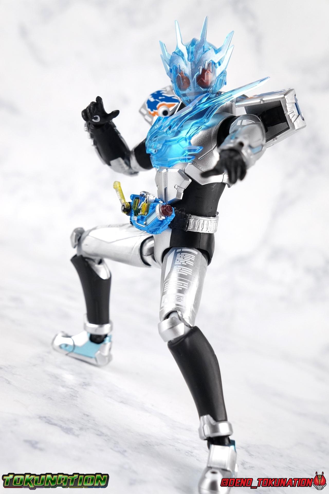 With a 3 sided war for Japan's future (and the power of Pandora's Box) underway, Hokuto's own warrior Kamen Rider Grease has appeared. His arrival on the battlefield brings with it the powerful and dangerous Sclash Driver. Fueled by Sclash Jellies, this wild driver has detrimental side effects on the users' body. In Ryuga Banjou's case, his drive to find a reason to fight, to protect his friends has given him the strength to overcome these hazards. But will this power be enough? When the time comes, can the muscle headed hero face his destiny? We'll see today in our gallery of S.H. Figuarts Kamen Rider Cross-Z Charge! Packaging Charge continues the trend of two-tone boxes for Build releases despite the rather bland combination of blue & gray on it. This one's not particularly interesting honestly, but I'm not here for the box. I'm legitimately quite happy to finally have a chance to review this figure and form. Main Figure It's odd the by the time this form has finally made the crossover to figuarts, that it literally doesn't exist in the show anymore. Cross-Z Charge took over for Banjou's original Cross-Z form fairly early on. The original only having a few outings to speak of including 1 movie. But with the introduction of Cross-Z Magma, Charge was literally no longer viable. That was several months ago now. Despite this I've been excited to see how this design translated to toy form and I'm pretty happy with the results. Cross-Z Charge is pretty strikingly different when compared to Cross-Z, Magma, or Great. It's shiny silver and translucent blue color scheme really go a long way to setting it apart from Cross-Z's various evolution's. But that's pretty appropriate given the different Driver being used, the transition from Grease to Grease Blizzard is very similar. Anyways, that striking color scheme is what I'd like to touch on first. Charge is almost fully painted in a really gorgeous metallic silver. The only notable exceptions being the shins, abdomen, and translucent parts. The finish on this is really excellent, I've only noticed a few iffy spots where the application is either over sprayed or a little under applied. The legs are accented by some ice blue on the feet, and some very sharp white techy detailing on the thighs. The legs themselves feel like they have a much greater range of movement than the standard Build/Cross-Z or Night Rogue/Stalk molds. I do wish the ankles had a little more clearance, but the overall performance of the legs is nice. The waist features a brand new driver as well, the Sclash Driver! I always liked the design of this driver and felt like it's ultimately been under used. Originally billed as the "big upgrade" near the middle of the series, and certainly used to great effect by Grease, Rogue, & Cross-Z, it has been outclassed. To the point that by the oncoming series finale, only Rogue is still using it. And even then he's about to get a Build Driver based upgrade form in an upcoming DVD/V-Cinema. That's all beside the point. This driver works very well at this scale. The Wrench handle can move up and down and the include Dragon Sclash Jelly can be removed as well as inserted into the Twin Breaker weapon. The upper body has an elaborate translucent blue dragon emblem stretched across it that I'm totally in love with. In a coincidence of the suit and toy designs, the peg holding the dragon to the chest is placed where the eye is so it syncs up well enough to hide it despite the translucence. The sculpt for this part is very well defined and the blue plastic just the right opacity. The arms are pretty much standard, though the elbows are hindered a little bit by the way the forearm ends on a point. They do look quite nice thanks to that silver paint application and the white tamphographed details on the biceps. The shoulder pads have magnificent airbrushed style dragon art that would look very much at home on the side of a van I would love to drive. I love it. These big dumb shoulder do however limit some of what you can do with the upper arms, they tend to impact the chest at very strange angles, though they are surprisingly well jointed. It's imperfect but they work. Finally, the head. Made with the same glorious clear plastic as the chest. I absolutely *Love* how it turned out. I half expected the opaqueness of the plastic to be off like in the past with Meteor Storm. But I'm happy to report that it's dead on. The faceplate is sharp and well defined, while the features underneath it shine through in almost any lighting. They just nailed it on this one. Bravo. Overall this is a really excellent figure that I think excels in several areas that the first Cross-Z did not. It's not absolutely perfect, but it's turned out so much better than I ever expected too. Accessories Charge comes with a pretty balanced set of accessories: 2.5 - sets of hands. That's an open pair, one set of open fists for either holding the Sclash Driver handle or possibly the handlebars of the Machine Builder, and one left hand to hold the Twin Breaker. 1 - Twin Breaker. This dual mode weapon always looked a bit clumsy to me in the show, but I like it for the most part here. The hand meant to grip it, holds it an angle but that can help navigate around the forearm a bit. I wish it could rest flush against the arm but that wouldn't be entirely accurate. The twin breaker comes packaged in Beam Mode with the gun barrels pointed forward. You can easily transition it to Attack Mode by rotating them back and extending the golden spear point in the middle. This locks nice and snugly in place, just be careful not to scratch it. The Twin Breaker also comes equipped with the Cross-Z Dragon and Dragon Full Bottle. They can be removed and are identical to those included with standard Cross-Z. They fit very snugly into the slots of the Breaker so you'll need a little force to get it out. These slots can also accommodate any Full Bottle, or Sclash Jelly. Really that's everything this form coul