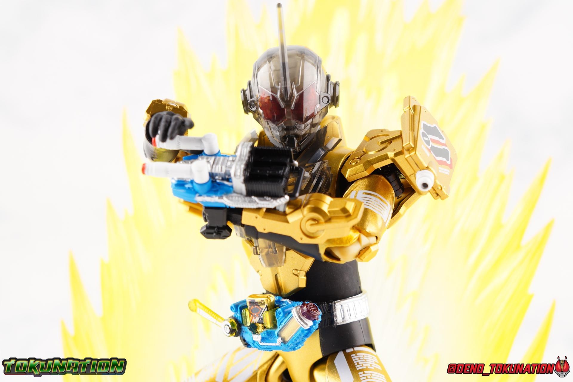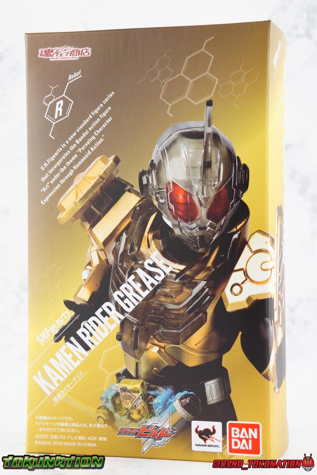 Kazumi Sawatari, was a humble farmer once. But the 3 sided war to unite or conquer Japan would change his destiny. At one time a foil to Sento Kiryu and his friends, Kazumi would come to find his greatest allies in this cobbled together cafe' crew. As Kamen Rider Grease, Kazumi would help defend Japan from the threats of industrialist Juzaburo Nanba, cybernetic aide turned insane rider Utsumi Nariaki, and the alien evil of Evolt. Driver in hand, Kazumi sacrificed everything to be a hero and stand up for those he lost, and those he loved. It's no wonder that the first collector figure of his rider form is already selling for huge markups now. Today's gallery will be a focus on S.H. Figuarts Kamen Rider Grease! Packaging As with previous Build releases, Grease has a bit of a two-tone package, themed on the "best match" aspect of the series. With Grease of course he only uses a Sclash Jelly to transform, so the two tones used are gold and brown. Not a lot of gradation between the two. So the box looks a bit boring, but does have some great stock photos adorning it. Main Figure Grease shares much of his body's basic tooling with the previously released Cross-Z Charge. While there are undeniable cosmetic differences, particularly in the upper body, if you've handled Charge. You can expect much of the same from Grease. The striking color scheme is what I'd like to touch on first. Grease is almost fully painted in a really gorgeous metallic gold. The only notable exceptions being the shins, abdomen and some of the hips, and of course the translucent parts. The finish on this is really excellent, I've only noticed a few iffy spots where the application is either over sprayed or a little under applied. The legs are accented by some silver applications on the feet, and some very sharp white techy detailing on the thighs. In fact this is all identical paint application and placement to Charge. The legs still feel like they have a much greater range of movement than the standard Build/Cross-Z or Night Rogue/Stalk molds. I do wish the ankles had a little more clearance, but the overall performance of the legs is nice. The waist features a brand new driver as well, the [B]Sclash Driver.[B] I always really dug this driver even if it was ultimately underused and completely replaced. Originally billed as the "big upgrade" near the middle of the series, and certainly used to great effect by Grease, Rogue, & Cross-Z Charge, it has been outclassed. To the point that by the series finale, only Rogue was still using it and even now, he's about to get a Build Driver based upgrade "Prime Rogue" in an upcoming DVD/V-Cinema. That's all beside the point. This driver works very well at this scale. The Wrench handle can move up and down and the included Robot Sclash Jelly can be removed as well as inserted into the Twin Breaker weapon. The upper body has an elaborate translucent black robot/mechanical design stretched across it that I really dig. The sculpt for this part is very well defined and the black plastic just the right opacity. The arms are pretty much standard, though the elbows aren't hindered in the same way as Charge. They do look quite nice thanks to that gold paint application and the white tamphographed details on the biceps. The shoulder pads have fantastic airbrushed style Robot art that would look very much at home on the side of a van I would love to drive. And these are on brand shoulders, totally different from Charge's. The pads on the shoulders can fully rotate to recreate Grease's rider kick. The forearms have been similarly remolded, though these parts make resting the Twin Breaker against the arm even more difficult than on Charge. Finally, the head, which is made with the same clear plastic as the chest. I really love how well the effect turned out on Charge, and the opacity of the helmet here is just spot on as well. The faceplate is sharp and well defined, while the features underneath it shine through in almost any lighting. There are very minor gray paint details on the face that draw out just a bit more detail as well. As with Charge, I really feel like they nailed it on this one. Overall this is another really great figure that while absolutely not perfect, is absolutely something of a must own for fans. Accessories Kazumi comes with everything he could really need: 4.5 - sets of hands. 1 left hand specifically meant for holding the Twin Breaker, 1 of each for holding Full Bottles, bike handlebars etc, and one pair of open palms for action poses. 1 - Twin Breaker. A straight repack of the one that came with Cross-Z Charge. This dual mode weapon always looked a bit clumsy to me in the show, but I like it for the most part here. The hand meant to grip it, holds it an angle but that can help navigate around the forearm a bit. I wish it could rest flush against the arm but that wouldn't be entirely accurate. The twin breaker comes packaged in Beam Mode with the gun barrels pointed forward. You can easily transition it to Attack Mode by rotating them back and extending the golden spear point in the middle. This locks nice and snugly in place, just be careful not to scratch it. It can accommodate two Full Bottles are Sclash Jellies as needed. 1 - Robot Full Bottle. Mine is molded a little crooked so it can't stand straight up but the real point of it is to interact with the Sclash Driver, Twin Breaker, or any other Full Bottle compatible device. 1 - Phoenix Full Bottle. Molded better than my Robot one, you can see the above for it's uses. Just be careful when trying to exchange any of these items. They are tiny and easy to lose and quite easy to scratch as well. I'm almost a little surprised that Grease doesn't included two Twin Breakers for the Double mode he gets when using the Dragon Sclash Jelly. Another item which could have been easily repacked here. But that's not Bandai's MO with this kind of stuff. Were it not cost prohibitive I'd actually pick up another Cross-Z Charge or Grease