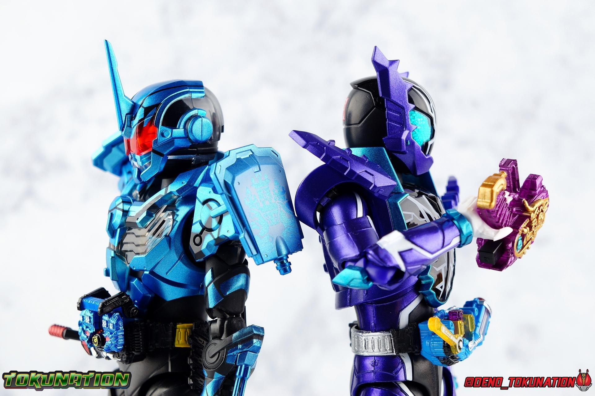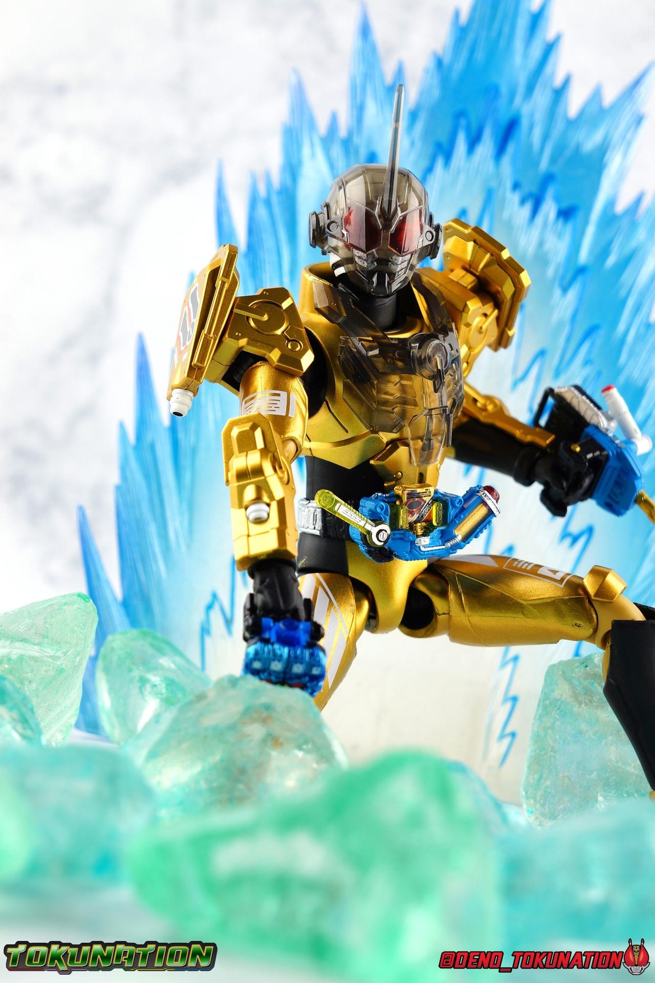 "Damn right I am." Evolt is mere minutes away from total victory, harnessing the power of Pandora's Box & the Lost Bottles, he will consume the Earth and countless more planets. Sento & Banjou must press on to fight him, but standing in their way are clones of the Hokuto Three! With only his life left to give, Kazumi will face his fallen friends one more time. But the power of Grease alone just isn't enough. A parting gift from Sento, Kazumi must wield the deadly Blizzard Knuckle and walk the lonely path of a hero. With frozen fists and an icy resolve, Grease becomes Kamen Rider Grease Blizzard! Packaging As with practically all Build releases Grease Blizzard has a pleasing two tone package design. Nothing's really changed aside from color choice and stock photos this go around. Main figure A big portion of this review will identical to that of my review for the original Grease Figuart. There are some obvious paint and molding differences between the two which I will call attention to, but the bulk of things will be the same. The abrupt difference in color scheme is of course the biggest change. Grease was almost fully painted in a really gorgeous metallic gold, Grease Blizzard tradse this out for a fantastic dark metallic blue. When it hits the right light it really shines like ice on a cold moonlit night. Essentially almos the entire figure is molded in black plastic with blue painted on top of this. This makes the more intricate applications on the shins and shoulders that much more impressive. The finish on this is really excellent, no iffy spots like the first figuart. That said, the body itself is almost totally different. This release, and the show suit, uses Kamen Rider Cross-Z version of the basic suit for it's core. So that means Grease's entire lower body is Cross-Z parts for sure. The legs are the same mold as Cross-Z, having removed the unique parts from build like the rabbit spring. the excellent and far covering paint may obscure this at first but these are Banjou legs and feet through and through. You're going to get exactly the same range of motion out of these legs as you would with Build, Sparkling, Hazard, etc. They work really great and with successive releases it seems joint tightness has been resolved. The waist features a brand new driver for Grease, this is his first outing with a [B]Build Driver.[B] I love the circular nature of upgrades in this show. Ultimately the 3 secondary heroes have all come back to the power of the Build Driver for their most powerful upgrades. Rogue has Prime Rouge and Cross-Z has Cross-Z Evol. Meanwhile Grease had Grease Blizzard as his most powerful form in the TV series, while the upcoming Grease New World film will give him a new final form based on the Build Driver with Kamen Rider Grease Perfect. The Build Driver still remains one of my favorite Figuarts scale devices and thankfully this go around it's also equipped with another new trinket, the Blizzard Knuckle. A very stylish blue repaint of the Magma Knuckle which came with Cross-Z Magma, the Blizzard Knuckle is every bit as removable. It transforms (so to speak) as well. To make a handheld weapon mode for any figure to hold, rotate the handle backwards and pop off the face plates & plug them back on closer to the center. You can also add or remove a Full Bottle as you wish. Pre-installed in the Knuckle is the North Blizzard Full Bottle, a really gorgeous clear blue bottle. Grease Blizzard doesn't come with any other bottles so if you want to do more swapping you'll need to grab another one of you Build family figuarts. As is the option to use the Knuckle in this way gives you lots of photo and posing opportunists, as you can see below. The upper body has an elaborate translucent black robot/mechanical design stretched across it that I really dig. For this release it's a bit darker and compliments the blue of the torso very well The sculpt for this part is very well defined and the black plastic is just the right opacity compared to the original feeling a bit too translucent. The entire torso is an identical sculpt to the first SHF as well. The arms are pretty much the same as well, aside from the new and intricate blue paint apps. The shoulder pads do have a fantastic new airbrushed logo on one of them. While the right pad still features the Robot Full Bottles emlbem, the left now features the North Blizzard Bottle emblem. As before the shoulder pads can fully rotate to recreate Grease's rider kick. Taking the place of Grease's left forearm is a new robotic claw, officially known as the GBZ Demolition One. With fully articulated fingers and nice tight joints this thing works great and has a very firm grip as well as a rotational wrist joint. Ultimately the head is one of the most striking changes for this release. Where the original was beige underneath with a semi-translucent black plastic casing around it, the new one is a darker shade of black but is largely painted over in dark metallic blue. The faceplate is sharp and well defined, but the most striking aspect here is the crimson compound eyes. Just that perfect shade of practically blood red. If this form belonged to any other character I think it would instantly be recognized as a villain. But in Kazumi's hands, it's the form of a cold and calculated warrior. The entire figure comes together flawlessly. If you loved the original Grease you absolutely must own this one. Accessories Despite my love of this form and this figure, this is the aspect where it really falls short. Grease Blizzard comes only with two alternate right hands. While that makes sense given the articulated claw he now has for a left hand, I am disappointed. But on the flip side, there's not really anything this figure could have come with. Much like a similar form that preceeded it (Chaser Mach) Grease Blizzard is a single episode power up. The transformation finishes in the last seconds of episode 46 and it's debut fight and ultimately Grease's death