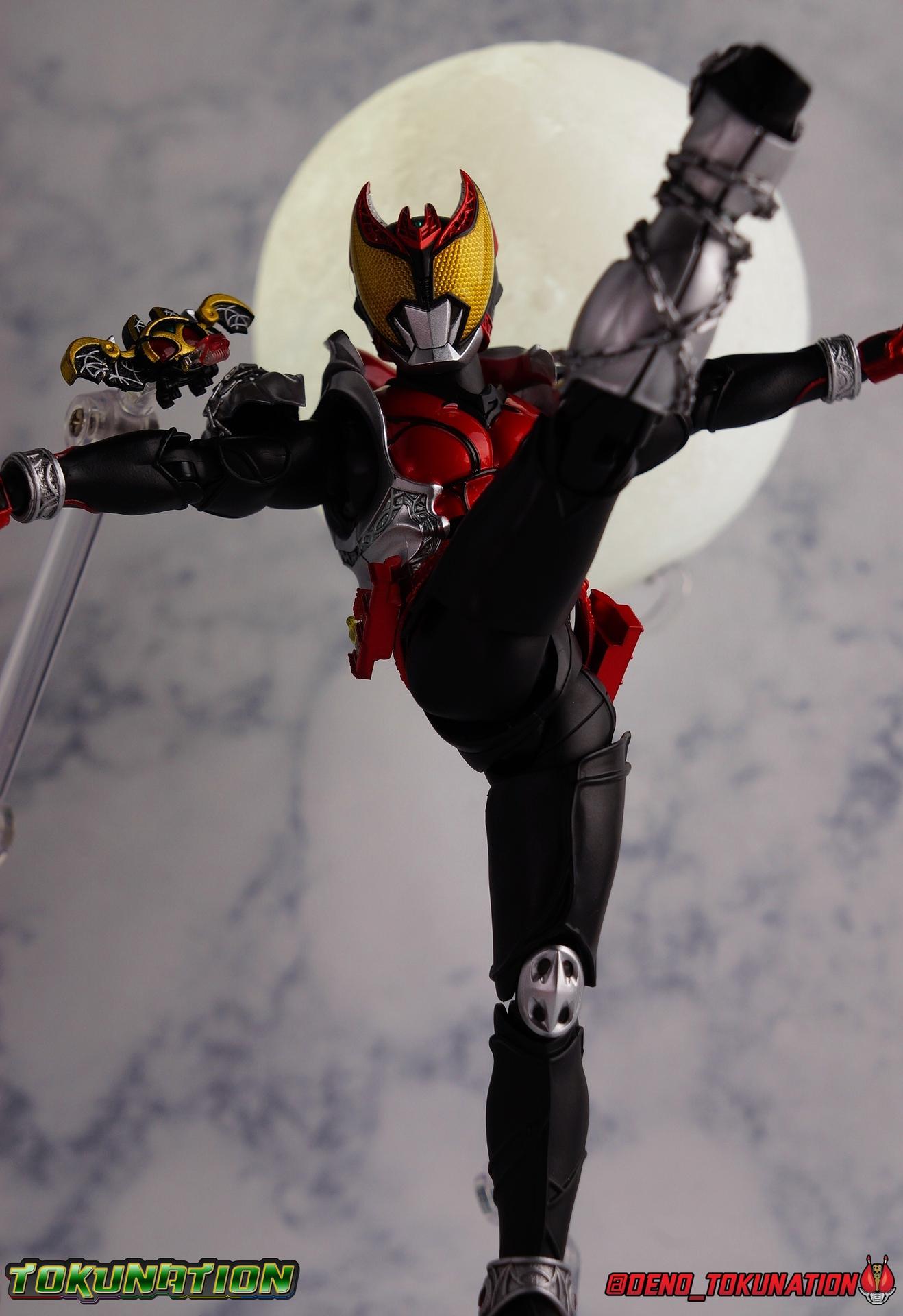 The shy young man Wataru Kurenai would rather spend his time crafting violins as his father Otoya did in life. But given that he's the son of the Fangire Queen as well, he was destined to become Kamen Rider Kiva, the Fangire King. And like the King's before him Wataru has one trusted partner, a member of the Kivat family, Kivat Bat III. With Kivat in tow, Wataru sets out to fight Fangires and protect humanity, just as his father did 20 years prior. But can Wataru overcome the fear and anxiety that have haunted him his entire life? Can he break the chains of his own fate and save the world? With a host of friends, family, and allies along the way, the history of Kiva and the Fangire plays out, across the past & present! It's time to break the chains and bust out a long awaited brand new gallery from Kamen Rider Kiva! S.H. Figuarts collectors have waited with baited breath for years, and years, for Tamashii Nations to finally deliver on the promise of Kiva. Well it may have taken until the end of the Heisei Era but he's finally here and we couldn't be more excited to share a proper review of S.H. Figuarts Shinkocchou Seihou Kamen Rider Kiva! ** This gallery contains 100 images, and is spread across the first three posts of this thread. Skip below to see the good stuff if you like! Packaging It's the familiar Shinkocchou Seihou slip cover box once again! Not much can be said about it this time that hasn't been said before. While it hasn't really changed, maintaining the same basic form factor with every single release, it's still a pleasing type of uniform collector's box thats great for storage. It's just great to finally see one of these boxes with Kiva's art adorning it! Main Figure It's been some time since the last new mold joined the Shinkocchou Seihou line. In fact Seihou Wizard was the last brand new mold the line gave us and that was last year. Since then we've had a few remolds/repaints but Kiva is the first truly new figure in a while. And with the Seihou line in particular, that always brings huge levels of excitement, and big expectations. How does the long awaited king stack up? Find out below! Kiva is an incredible addition to the line. I've said this many times with Shinkocchou Seihou releases in the past, but this one truly looks like it walked off the screen. It's an absolutely stunning recreation. From an engineering standpoint I'd say it's one of the best as well. The W mold was my long time favorite from the line, Rider 1 really upped the ante, and Wizard was an absolute delight. While I'm not sure that Kiva necessarily blows any of the other releases away, it is remarkably nice. Starting with Kiva's feet and legs, they provide a very solid base of support. The asymmetrical design of his right leg has always struck me as well, the chains always draw my attention. It's just such a unique look that sticks with you, much like how I've always loved Kamen Rider Kickhopper's leg design. For their part, these chains are molded in place but have some minor flexibility to them so that you can hopefully avoid litearlly breaking them. Kiva's toe bends function properly on both feet despite the bulk of the chains on one and the ankle tilts seem to be pretty even as well. Always good to see asymmetry that somehow still leads to symmetrical articulation cuts. The knee bends leave a little to be desired, coming out to about a 45 degree angle, but the hips make up for this shortcoming with a wealth of range. Which is totally necessary to recreate that iconic kick pose of Kiva's. Kiva's waist in it's dormant state out of box is just the red Kibuckle belt which holds his driver and trinkets. Fun fact, Kiva's belt was actually the final Heisei henshin belt to not be called a "Driver". From Decade on we've had nothing but Drivers. You'll need to grab the 6 individual Fuestels and 2 Fuestel holders included with Kiva and attach them to the sides of the belt to get his hips looking right. The big thing here of course is really the second star of the Kiva show, Kivat Bat III! The talkative sidekick to Watar Kurenai, Kivat also allows him to transform into Kamen Rider Kiva. On his own, Kivat is a tiny but slightly poseable bat. The ends of his wings can rotate up to simulate flight while his mouth opens to simulate his speech as well as to accept Fuestles. A small tamashii stage adapter is included to let you display Kivat flying around Kiva as well. To get him on the belt just plug his feet over the bar along the top of the belt and rotate him down, plugging him in place. He can still accept Fuestels in this state as well, plenty of clearance for the mouth to open. Kiva's upper body does some really interesting things that I appreciate too. The red armor that makes up his chest extends down around the ab area of the figure. Despite appearing to be one piece, the lower section actually sits under the chest and is independently articulated. As you push the torso down towards the waist, arching the back, the abs push up into the chest. This increases the range of movement and makes for more natural articulation as well. If you straighten the torso back out, you can see where th e tip of this ab armor is sort of tucked up into the chest and there's a small gap, pushing it back down seamlessly fills the torso once more. It's really genius. Likewise the figure's back also tries something interesting. The entire chunk of armor that makes up the collar around Kiva's neck and the armor extending down his back, is on it's own sort of raised joint that allows it to lift up from the back & shoulders. This gives the figure an interesting clearance extension. It's unnecessary, kind of bizarre, but really cool and appreciated. While side to side torso movement may be hindered somewhat by the silver armor around Kiva's ribs, it's hard to deny just how good and seamless the entire upper body looks. At first glance every bit of it look likes one piece, but there's so much complexity involved. I was worried tha