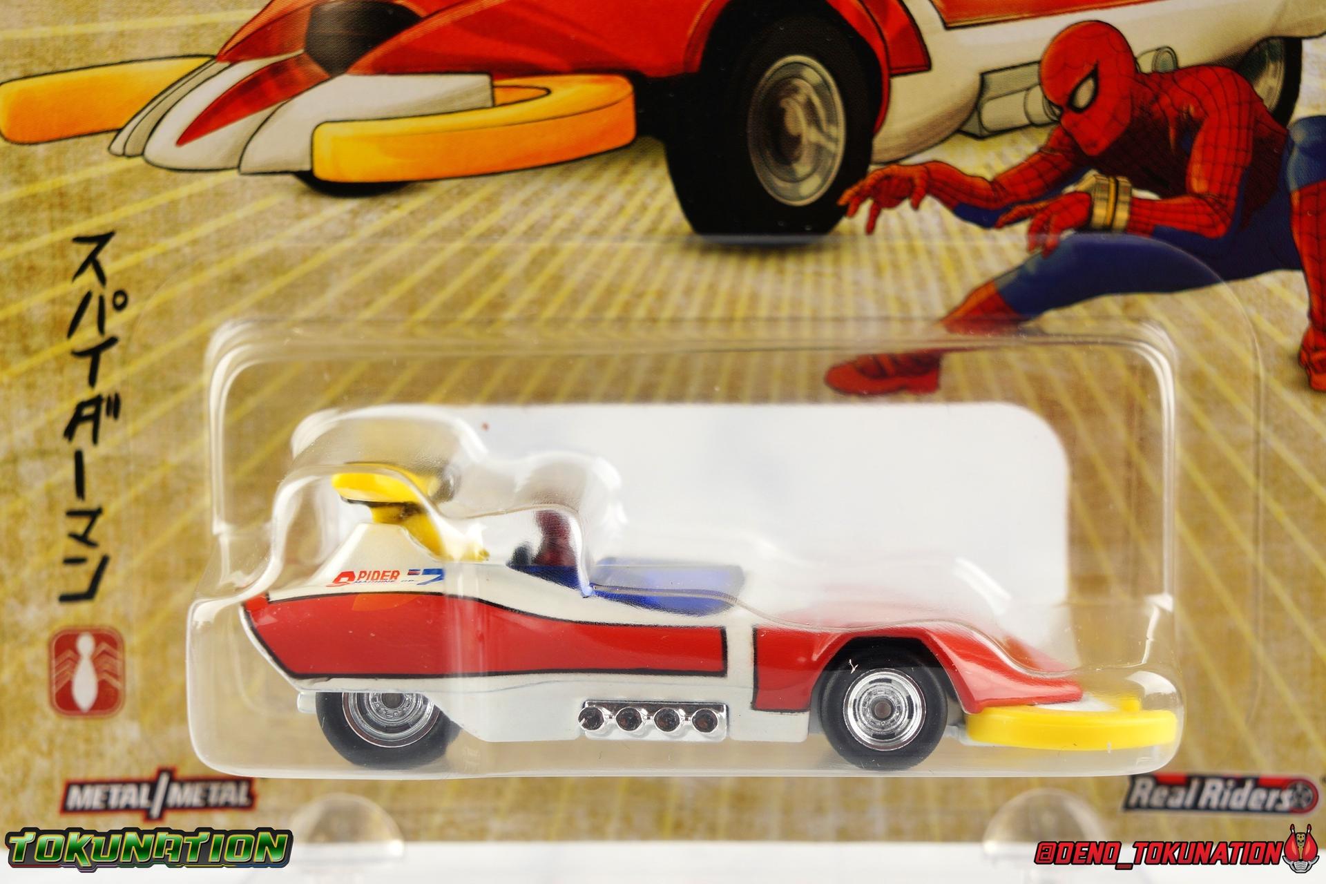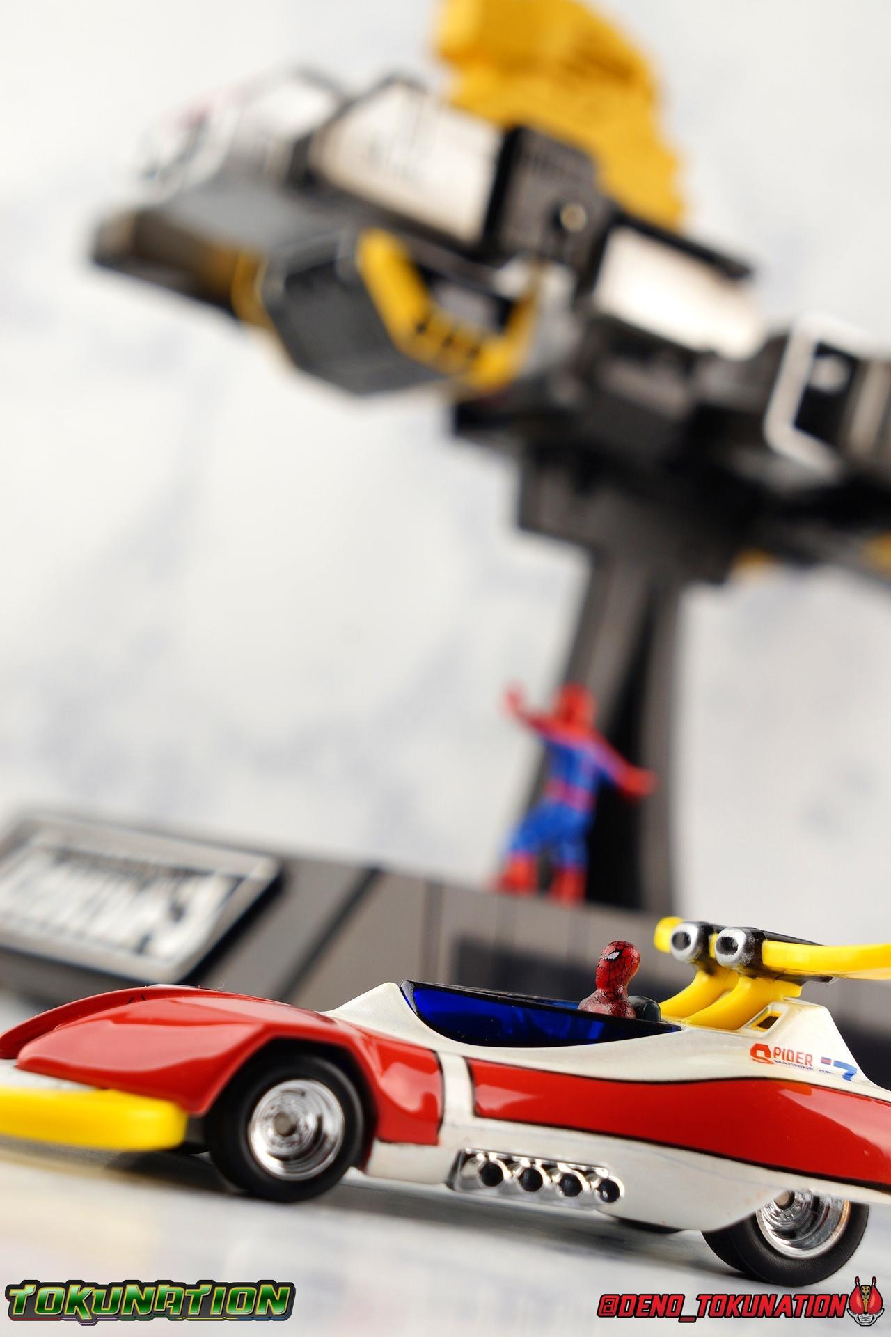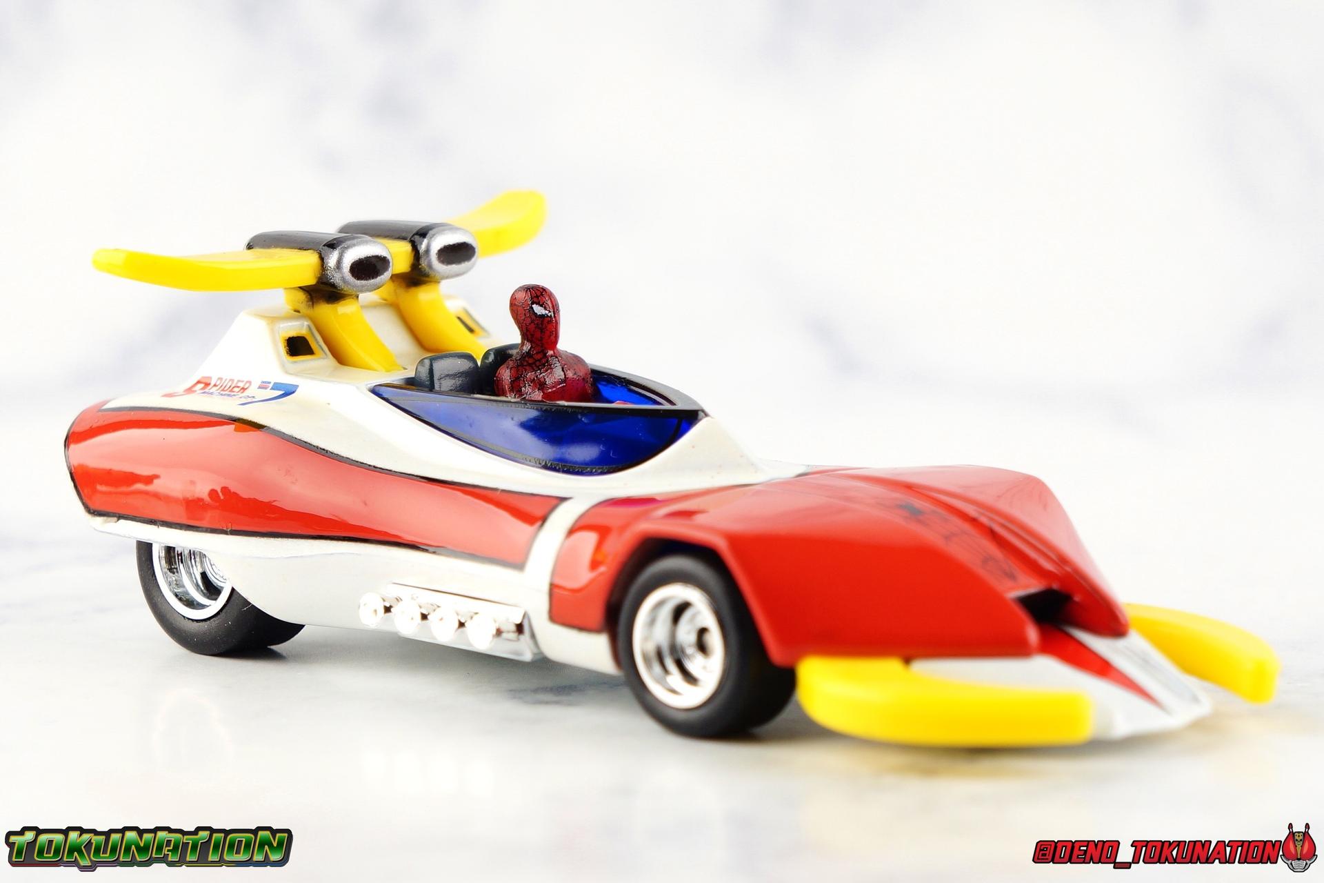 400 years ago, Professor Monster came to invade Earth with his Iron Cross Army. Active once again in 1978, his legions would cross paths with the young motocross racer Takuya Yamashiro. With a fate greater than he knew, Takuya was both destined to lose his father to Iron Cross, and encounter the strange race of the Planet Spider. Now infused with the Spider Extract, and given command of the mighty Spider-Machine GP-7 and Marveller, Takuya has become the Spider-Man! This Emissary of Hell will fight to defend the Earth for as long as it takes to stop Professor Monster and his hordes! The classic 1978 Toei produced Spider-Man series has become a bit of a cult sensation in the last decade here in the US. For a time it streamed in it's entirety for free on Marvel Entertainment's website, but since has been circulated in fan groups through less than legal means. What that's done though is build up a huge following for the series here. Perhaps a by-product of just how massive comic book hero Television and movies have become in the last decade, this series has indeed won a special place in the hearts of many a fan. The character's appearance in a handful of Marvel comics Spider-Man Spider-Verse event series, the possibility stated by filmmakers of him appearing in the next Into the Spider-Verse film, and a recent spate of new apparel being released has continued to cater to the western fan base for the series. This years SDCC gave us possibly the biggest nod to the character though with Mattel's release of the Hot Wheels Spider Machine GP-7! With all that out of the way, let's take a look at this little vehicle and see if it can whet our appetites for the emissary of hell! Packaging Mattel has gone above and beyond for the packaging of this exclusive. The exterior packaging is a really gorgeous spiderweb themed box with absolutely stunning Spider-Man artwork on the front. Though I've yet to track down exactly who the artist is that did this piece, it reminds me very much of the work of Alex Maleev or a similar artist. The rear of the box features a general breakdown of the series plot, a quote from the show's classic OP, and several new pieces of totally gorgeous artwork. Headshots of Spider-Man, Leopardon, and the Marveller, as well as a fabulous full vehicle shot of the GP-7! Inside this box is a more typical Hot Wheels bubble on cardback. Featuring more of that insanely nice artwork on the front, we get a great profile of the GP-7 through the bubble. The back however treats us to some of the best art of Spider-Man and Leopardon together I've seen in a very long time. I'd love to have a print of it to frame and put on my wall. The open back of the card gives another profile of the car through the bubble. Overall the presentation of the packaging is downright perfect. If you just picked up this relatively inexpensive exclusive at the con ($15.00 retail) then leaving it in the box as a display piece is a great option. I of course just had to crack my open for review! Spider Machine GP-7 The Spider Machine GP-7 is a downright sexy design and Hot Wheels has recreated it in all it's glory at their typical 1/64 scale. I'll be the first to admit I'm not a Hot Wheels or diecast car collector and I know that those fandoms can be pretty intense in the collecting scene. I'm simply reviewing this car as representation of a vehicle I love from a series I adore. So if I'm less familiar with the ins and outs of what to expect from a toy of this nature, please bare with me. The GP-7 is a pretty stylish design, and as far as toys of it goes, this is likely the most accurate one we've ever seen. You can see in my gallery below that I've included a bunch of comparisons to the old Charawheels style Spider Machine packed in with the GX-33 Soul of Chogokin Leopardon. Until this year that was our best option for owning the GP-7, and that came out in 2006! On the merits of it's design alone, the Hot Wheels GP-7 gets the general proportions and body styling of the design far better than the SOC release did. Here and there though there are choices I find odd. For one, and I'm unaware if this is typical of Hot Wheels, the Spider-Man figure is molded into the seat. Normally I wouldn't mind such a thing, if it were painted better. Upon close inspection it's mostly just a read torso with a haphazard black spider web application and some barely visible eyes. Were the figure a bit nicer and removable, I think it could improve the release a fair bit. While the general gloss of the paint job is quite nice, I find that some of the finer details are a a bit spotty and run across lines. But the SOC release didn't even have the black contour lines painted on it way back when, we at least get that here. And the "Spider Machine GP-7" tamphograph is gorgeous, just wonderfully clean and crisp. I will say that the rear end of the car bothers me a bit. The old SOC gets the general shape right, and the color of the tail lights. While the Hot Wheels opts only for the exposed engine beneath the rear end. Ultimately a combination of the two toys would result in the ideal rear end, but I don't think that it takes a way too much from the Hot Wheels release either. I do also have a personal preference for the painted silver exhaust pipes of the SOC rather than the chrome ones on the Hot Wheels. Final Thoughts Am I disappointed that the bonnet doesn't open to reveal the Spider Machine's weapons? Sure. But I'm not certain it was on the table to expect such a thing from a $15.00 Hot Wheels car either. The Hot Wheels GP-7 is a solid little vehicle. I was kind of hoping on total chance it would be compatible with SOC Leopardon's base but oh well. The truth is that this release looks fantastic with the SOC, every bit as good as the car that in fact came with it. Spider-Man merch of all varieties just seamlessly fits together if you ask me. There isn't enough to separate any one Spidey toy from another to keep them from all working in your display t