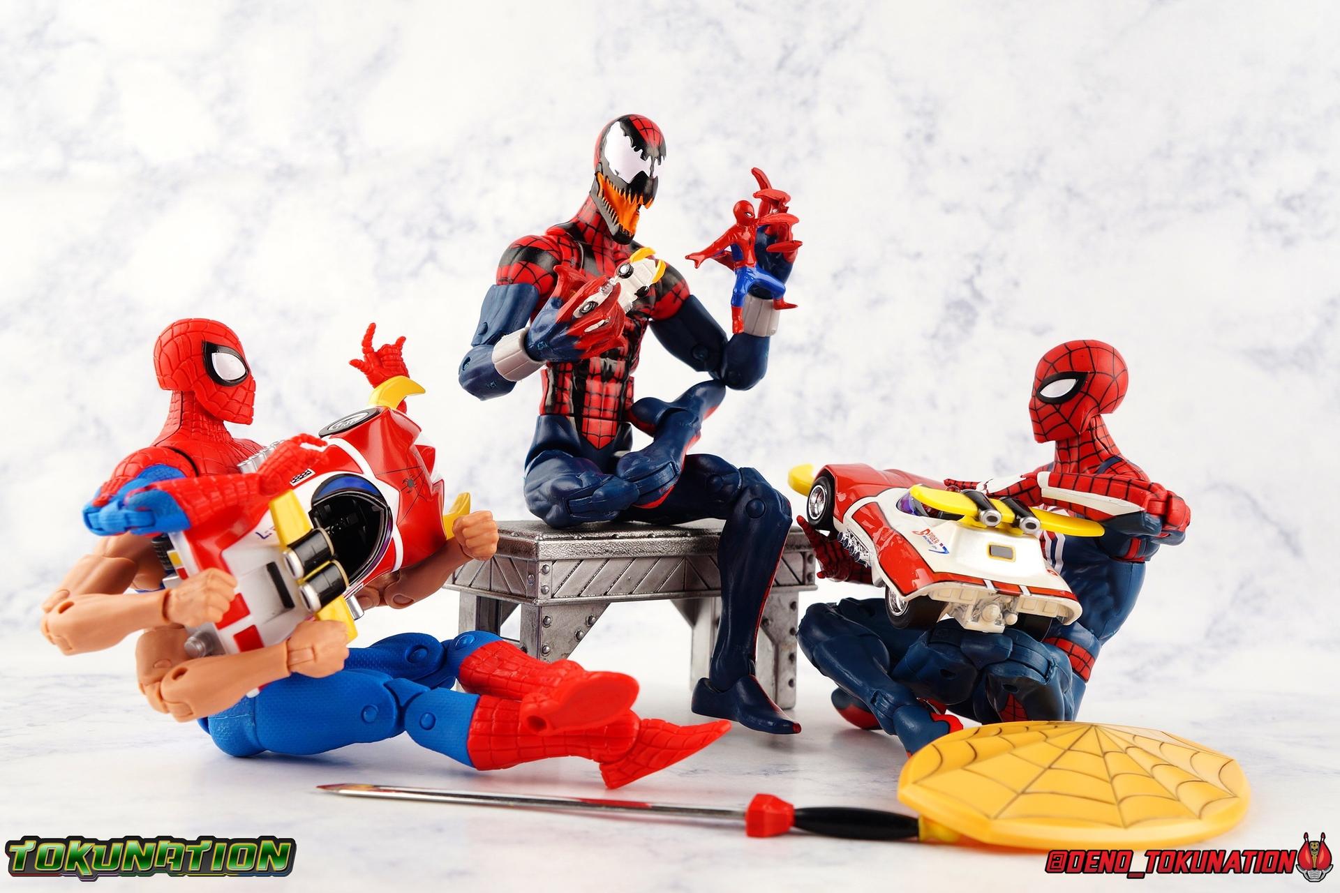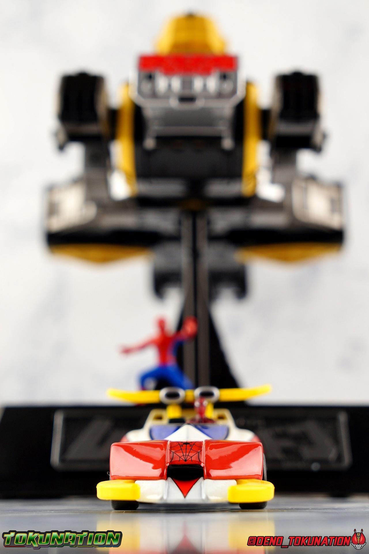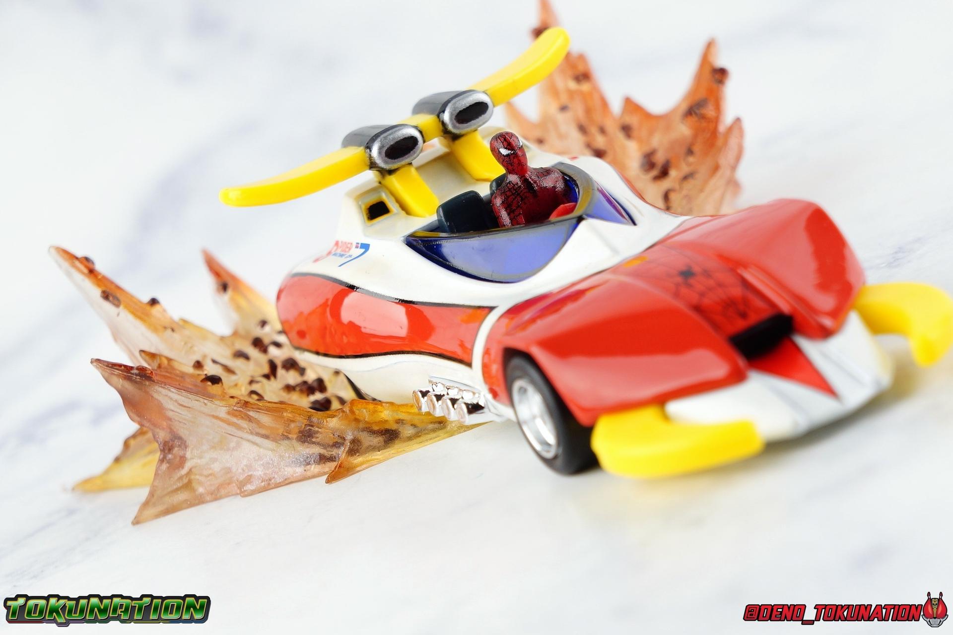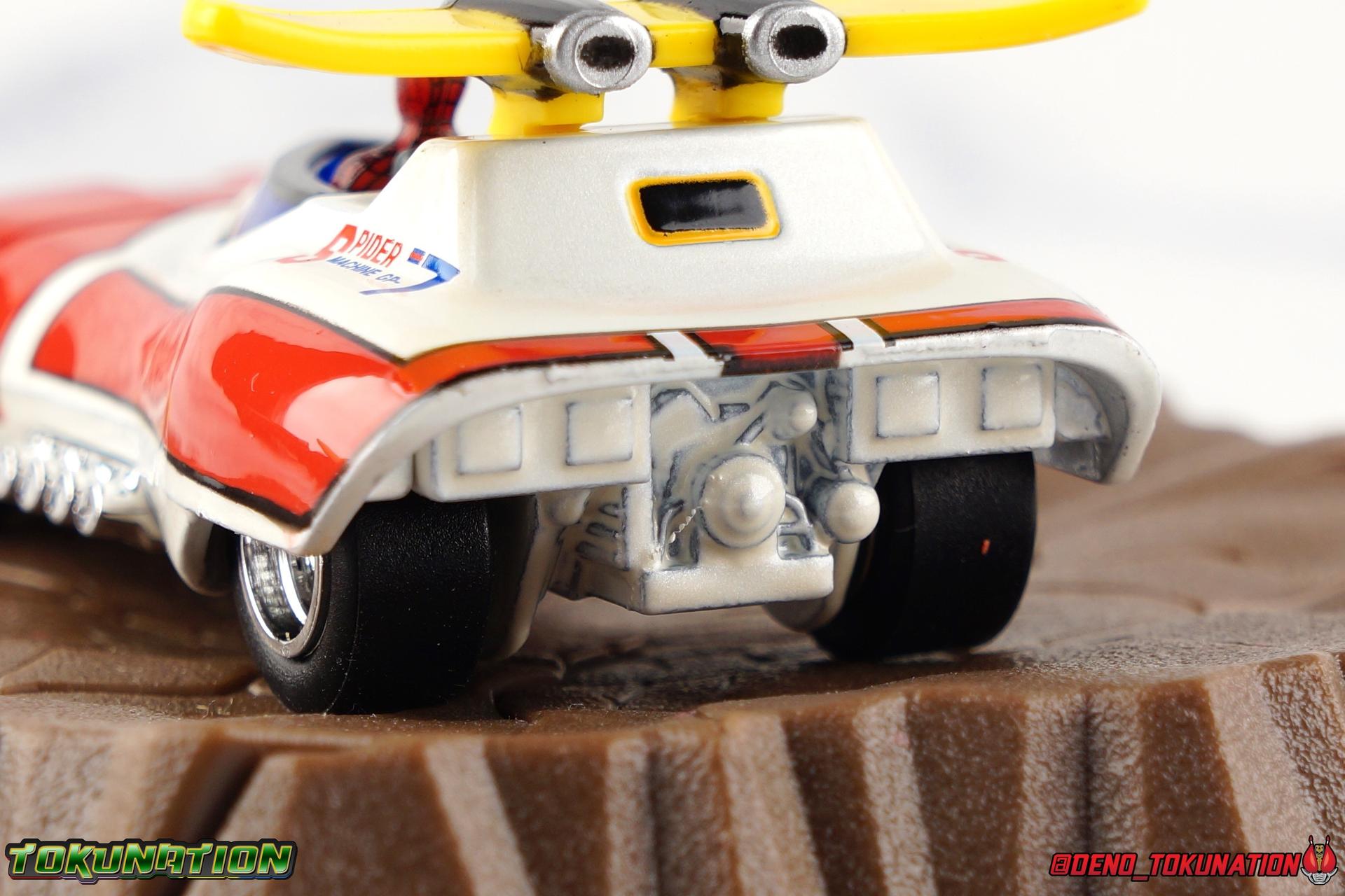 400 years ago, Professor Monster came to invade Earth with his Iron Cross Army. Active once again in 1978, his legions would cross paths with the young motocross racer Takuya Yamashiro. With a fate greater than he knew, Takuya was both destined to lose his father to Iron Cross, and encounter the strange race of the Planet Spider. Now infused with the Spider Extract, and given command of the mighty Spider-Machine GP-7 and Marveller, Takuya has become the Spider-Man! This Emissary of Hell will fight to defend the Earth for as long as it takes to stop Professor Monster and his hordes! The classic 1978 Toei produced Spider-Man series has become a bit of a cult sensation in the last decade here in the US. For a time it streamed in it's entirety for free on Marvel Entertainment's website, but since has been circulated in fan groups through less than legal means. What that's done though is build up a huge following for the series here. Perhaps a by-product of just how massive comic book hero Television and movies have become in the last decade, this series has indeed won a special place in the hearts of many a fan. The character's appearance in a handful of Marvel comics Spider-Man Spider-Verse event series, the possibility stated by filmmakers of him appearing in the next Into the Spider-Verse film, and a recent spate of new apparel being released has continued to cater to the western fan base for the series. This years SDCC gave us possibly the biggest nod to the character though with Mattel's release of the Hot Wheels Spider Machine GP-7! With all that out of the way, let's take a look at this little vehicle and see if it can whet our appetites for the emissary of hell! Packaging Mattel has gone above and beyond for the packaging of this exclusive. The exterior packaging is a really gorgeous spiderweb themed box with absolutely stunning Spider-Man artwork on the front. Though I've yet to track down exactly who the artist is that did this piece, it reminds me very much of the work of Alex Maleev or a similar artist. The rear of the box features a general breakdown of the series plot, a quote from the show's classic OP, and several new pieces of totally gorgeous artwork. Headshots of Spider-Man, Leopardon, and the Marveller, as well as a fabulous full vehicle shot of the GP-7! Inside this box is a more typical Hot Wheels bubble on cardback. Featuring more of that insanely nice artwork on the front, we get a great profile of the GP-7 through the bubble. The back however treats us to some of the best art of Spider-Man and Leopardon together I've seen in a very long time. I'd love to have a print of it to frame and put on my wall. The open back of the card gives another profile of the car through the bubble. Overall the presentation of the packaging is downright perfect. If you just picked up this relatively inexpensive exclusive at the con ($15.00 retail) then leaving it in the box as a display piece is a great option. I of course just had to crack my open for review! Spider Machine GP-7 The Spider Machine GP-7 is a downright sexy design and Hot Wheels has recreated it in all it's glory at their typical 1/64 scale. I'll be the first to admit I'm not a Hot Wheels or diecast car collector and I know that those fandoms can be pretty intense in the collecting scene. I'm simply reviewing this car as representation of a vehicle I love from a series I adore. So if I'm less familiar with the ins and outs of what to expect from a toy of this nature, please bare with me. The GP-7 is a pretty stylish design, and as far as toys of it goes, this is likely the most accurate one we've ever seen. You can see in my gallery below that I've included a bunch of comparisons to the old Charawheels style Spider Machine packed in with the GX-33 Soul of Chogokin Leopardon. Until this year that was our best option for owning the GP-7, and that came out in 2006! On the merits of it's design alone, the Hot Wheels GP-7 gets the general proportions and body styling of the design far better than the SOC release did. Here and there though there are choices I find odd. For one, and I'm unaware if this is typical of Hot Wheels, the Spider-Man figure is molded into the seat. Normally I wouldn't mind such a thing, if it were painted better. Upon close inspection it's mostly just a read torso with a haphazard black spider web application and some barely visible eyes. Were the figure a bit nicer and removable, I think it could improve the release a fair bit. While the general gloss of the paint job is quite nice, I find that some of the finer details are a a bit spotty and run across lines. But the SOC release didn't even have the black contour lines painted on it way back when, we at least get that here. And the "Spider Machine GP-7" tamphograph is gorgeous, just wonderfully clean and crisp. I will say that the rear end of the car bothers me a bit. The old SOC gets the general shape right, and the color of the tail lights. While the Hot Wheels opts only for the exposed engine beneath the rear end. Ultimately a combination of the two toys would result in the ideal rear end, but I don't think that it takes a way too much from the Hot Wheels release either. I do also have a personal preference for the painted silver exhaust pipes of the SOC rather than the chrome ones on the Hot Wheels. Final Thoughts Am I disappointed that the bonnet doesn't open to reveal the Spider Machine's weapons? Sure. But I'm not certain it was on the table to expect such a thing from a $15.00 Hot Wheels car either. The Hot Wheels GP-7 is a solid little vehicle. I was kind of hoping on total chance it would be compatible with SOC Leopardon's base but oh well. The truth is that this release looks fantastic with the SOC, every bit as good as the car that in fact came with it. Spider-Man merch of all varieties just seamlessly fits together if you ask me. There isn't enough to separate any one Spidey toy from another to keep them from all working in your display t