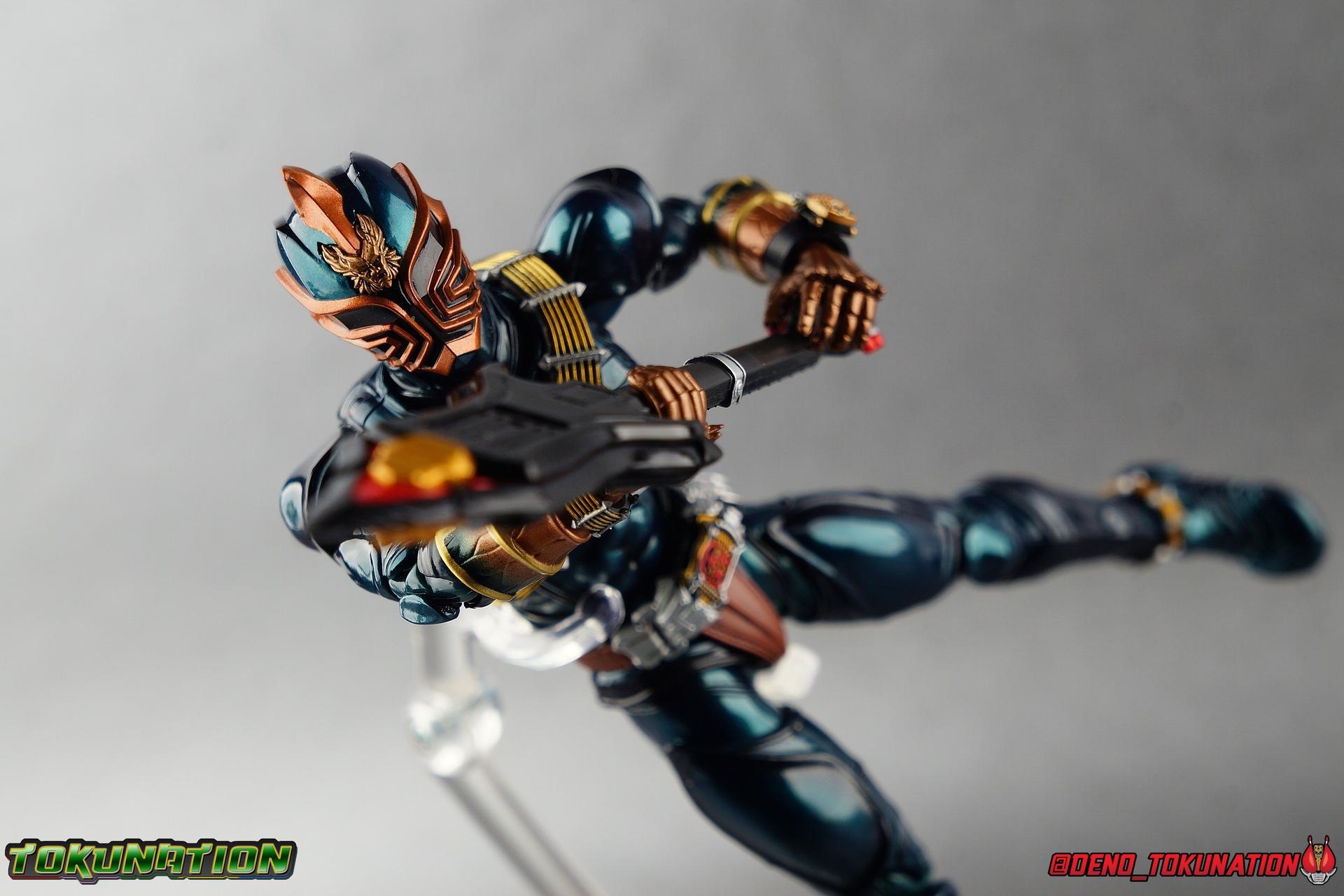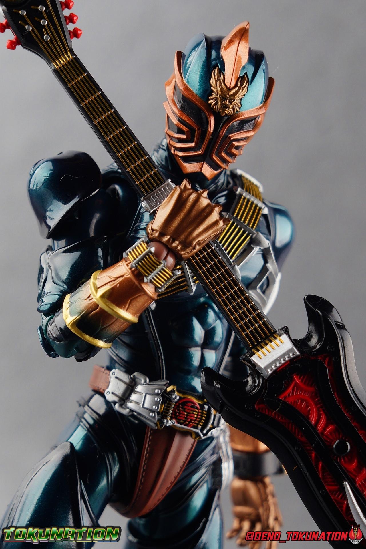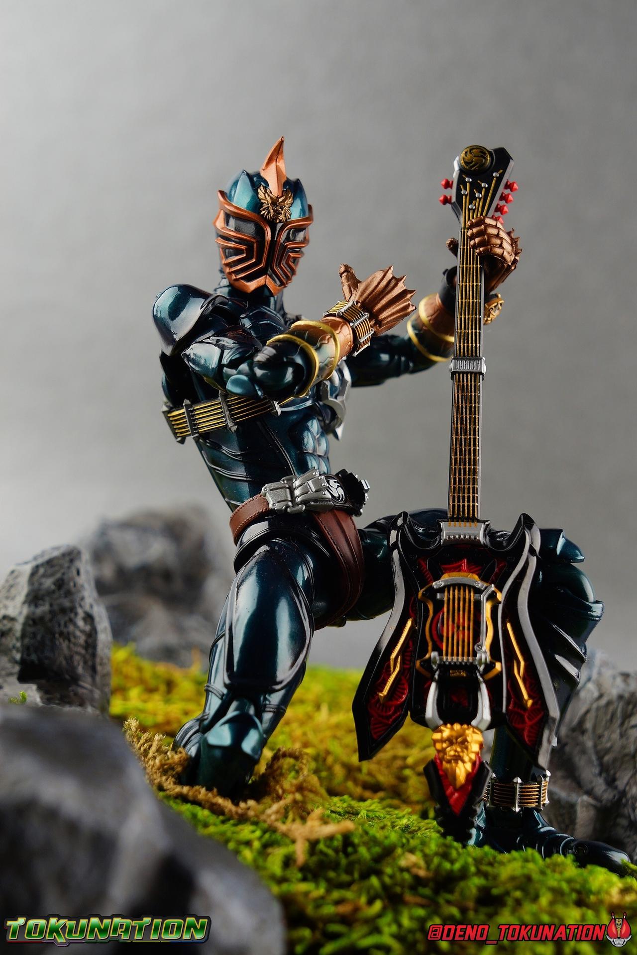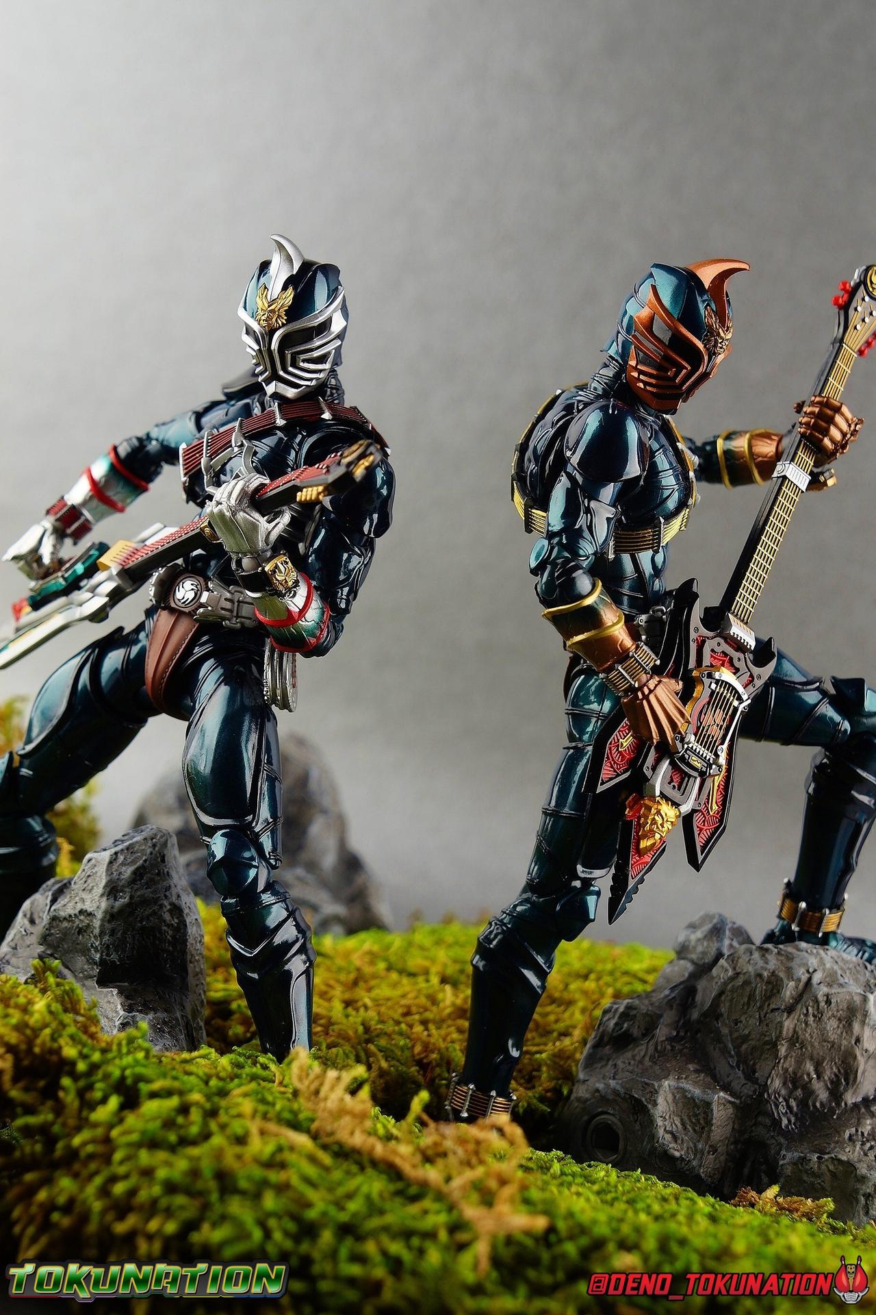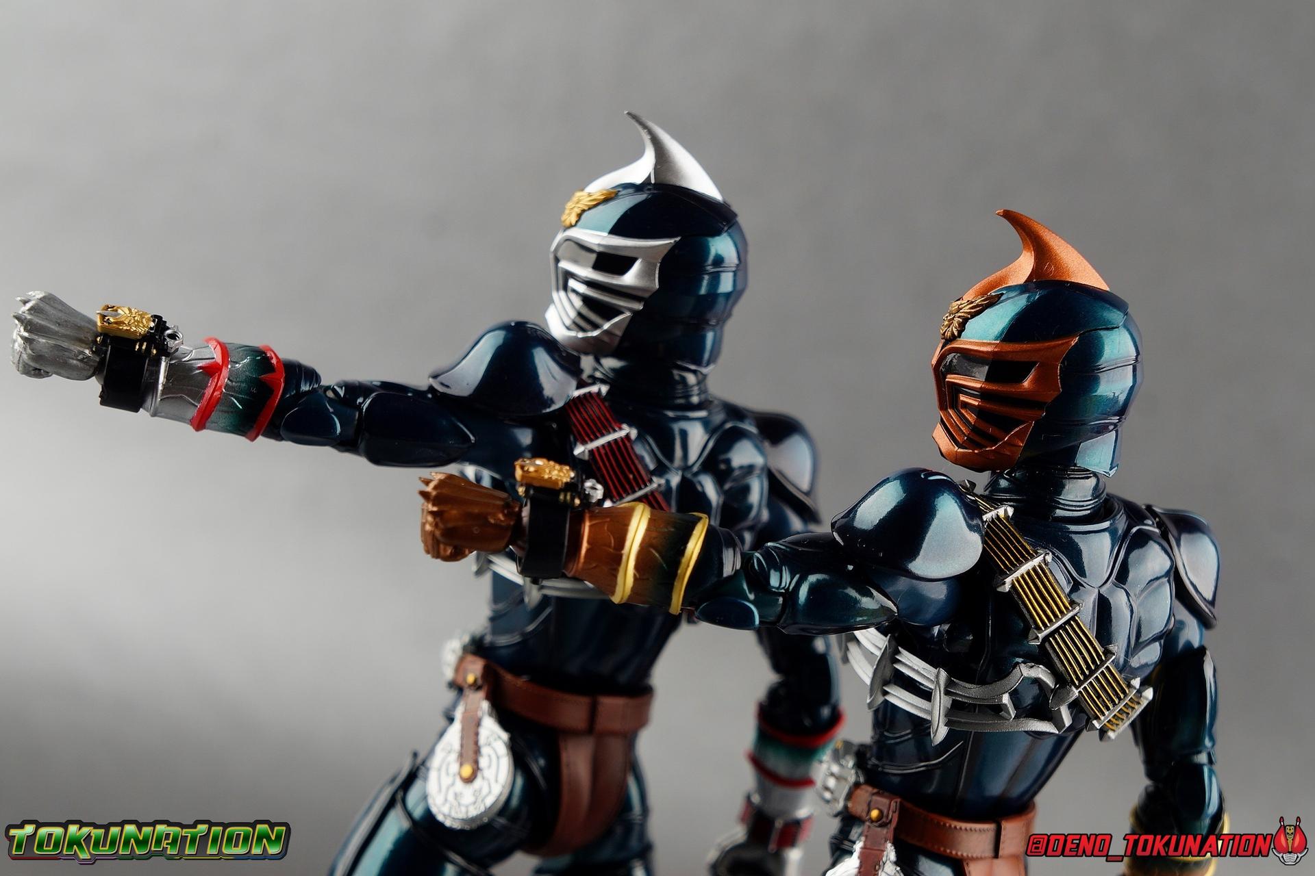 Kamen Rider Hibiki finally joined the S.H. Figuarts line for the first time over 4 years ago. Then last year, Tamashii at last made their second addition from Hibiki's world to this line with Kamen Rider Ibuki. It's taken quite some time for the beautiful Oni Riders to show up in the Shinkocchou Seihou line, but after the recent release of Kamen Rider Todoroki it's befitting that his master has been released as well. Kamen Rider Zanki! Like any Oni master, Zaoumaru Zaitsuhara took on an apprentice. Someone to pass along his skills to, his techniques, and one day his title as well. But the young man once known as Tomizo Todoyama had other plans. This kind warrior wasn't as experienced as his contemporaries Hibiki or Ibuki in the fight against the Makamou, but his dedication to protect others made him the hero he is today. Refusing to inherit his masters title to create his own legacy, Todoyama took on the name Todoroki! Kamen Rider Zanki passed on the remainder of his knowledge, his skills, and the mighty Ongekiken Retsurai to the young Todoroki. But a warrior's journey never ends. Never far from the battlefield, and returning once again to take up the Ongekiken Retsuzan, Zanki continues the fight alongside his disciple, for as long as his body will last! Packaging It's the familiar Shinkocchou Seihou slip cover box once again! Not much can be said about it this time that hasn't been said before. It's gotten a bit stale (to me) over time but it's still a pleasing type of uniform collector's box thats great for storage. Main Figure This review will be nearly identical to that of Todoroki. The two figure's have very very minor physical differences. So don't be surprised to see huge portions of this review be word for word identical to that one. Like Hibiki, Ibuki, & Todoroki, Zanki is a stunning figure. The sculpt of this body type is superb (even 4 years on!), really bringing to life these unique Oni Rider suits. In every way imaginable it captures the look of the on screen suit right down to the textured musculature, and the gloss of the armor really gives in that pleather/vinyl feel of the actual suits. A favorite detail of mine. The design process Seihou's go through has always been much much more involved than that of the standard figuarts line and the best examples of this were the special booklets included with Kabuto & Hibiki. When the design begins with a sort of skeletal inner frame, and builds out what would be like a suit over a real human body like this, you get a much more realistic application of articulation and proportion to the body as a result. Now despite the obvious color changes, Zanki is the same basic mold as Hibiki & Ibuki, but is literally identical to Todoroki even featuring identical articulation placement. When Bandai nails the basic design of the body, it can be truly astounding how outer level cosmetic changes can create a vastly different presentation. But of course, even 4 years later some of my issues with this mold still persist. I've always found the legs to be quite odd. To me, they look really long and at odds with the torso, especially when bent for crouching poses. Something about them looks off. They function well enough, though I've always thought this mold had one of the more strange figuarts hip joints out there. While the part separation undoubtedly gives them great range, the hips look very small by the time you angle them out fully, making the thigh seem huge by comparison. And while the knees function just fine, the feet could be slightly better. Despite being pretty large, they don't easily rest flat on any surface, and the toe bends can be difficult to line up straight. Znki's belt is really loaded up with accessories like his predecessors. This figure comes with a lot and luckily you can store some of it on his belt given the display options you've chosen. When loaded out for static poses, the left hip can be outfitted with a Disc Animal holster with 3 non-removable discs sculpted in. Or you can keep the out of box standard part which is an empty holster for when you want him to hold the discs in hand. Straight out of the box, the center of the belt has Zanki's Ongekishin Zantetsu attached. This rectangular piece is removable to simulate how it combines with the Ongekigen - Retsuzan, though it does not actually combine (a separate piece is included). It can be used with any Oni Rider that has a similarly designed belt. In Zanki's original role as Todoroki's master, his belt featured the Ongekishin - Raigou, but since training Todoroki it has been passed down to him. The upper body is identical to Todoroki as well, just removing the red string accents and replacing them with gold. This bandoleer like sash is still my favorite part of the Zanki/Todoroki design. The upper and lower halves of the torso move independent of one another, though it's a tight fit to get either to move very far. I've always felt this body type was a bit stiff, but it gets the job done very nicely still. Zanki's arms are basically identical to all of the other Oni Riders, though like the rest of the body these are painted in a nice glossy deep green. The silver fade from Todoroki has been replaced by a gorgeous gold on Zanki, as well as further red accents. The left shoulder pad does impact the bandoleer at times so be careful not to scratch it, but thankfully the pads don't pop off frequently as they did with Ibuki. The left wrist also features the Henshin Kigen Onka. This one is in it's closed form, but an open version of the accessory is included to replicate Zanki's transformation. And like others, but particularly Todoroki, Zanki has a stunningly accurate headsculpt. All 4 riders have insanely well detailed sculpts, but the Oni face on Todoroki's head is just top notch. The horn protrusion on his head is actually quite sharp as well, so watch out there. Zanki's head is of course a real nice mostly bronze repaint of Todoroki and it's just stunning on this mold. Th