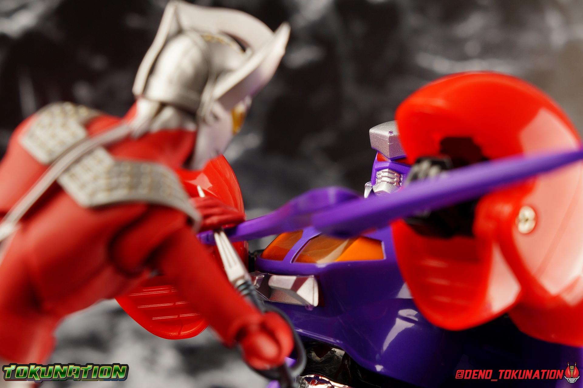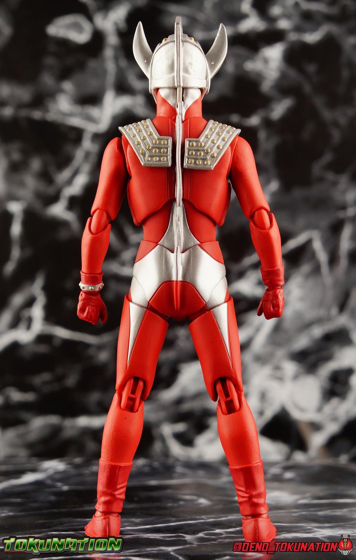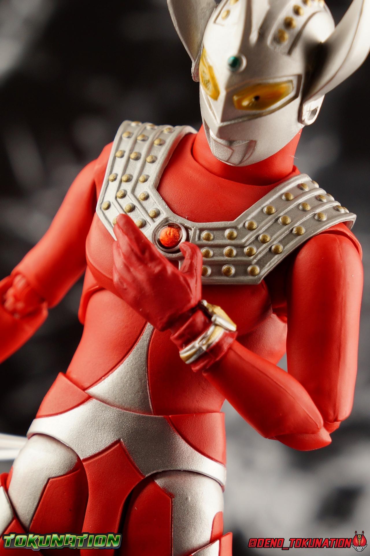 7 years after Earth first encountered the giant of light Ultraman, Ultraman Taro arrived! Taking the human Kotaro Higashi as his host, Taro fought against legions of Kaiju as they invaded the Earth. And for years since, Taro has fought hard and earned the respect of his peers. Mentoring new generations of heroes at the Ultra Coliseum, Taro also went on to instruct the likes of Mebius & Ginga. This Master fighter has lived a long and hard fought life, but that didn't stop him from settling down either. Passing his skills down to yet another generation, Taro instills the hope & power of the land of light in his son, Ultraman Taiga! This figure comes to us courtesy of our friends at Bluefin Brands and Team Rider. Check out their awesome selection of Kamen Rider items, Ultraman items, and more Tamashii Nations & Bandai Japan products! Packaging Like many figuarts of recent years, the Ultraman style packaging has undergone some drastic changes. Taro comes in a gorgeous and colorful box with a sweeping view of the figure, and an outstanding piece of box art adorning the front. I remember when the first revision of Ultra-Act packaging that began with V2's was something special. But what the line does now is really interesting. Taking the general gray & red of the Ultra's themselves, and adapting it to each classic character, this design looks very stylish. I also find it interesting that Ultraman is keeping in line with the older shape and size of Figuarts packaging that Kamen Rider began to shift away from in the Drive era, in favor of slimmer boxes. As characters of much larger stature, I think it helps set the line apart that Ultra Figuarts still come in larger packaging than their less titanic cousins. Main Figure Like I mentioned in my review for Ultraman Ginga, it had been some time since I reviewed any Ultra release. Before Ginga, one of my last reviews had been of the Ultraman 50th Edition set. So after a pair of modern Ultras with Ginga and the Seven Suit, it's nice to return to one of the classics with Ultraman Taro. In the same way as Ginga & Seven Suit, Taro is recreated lovingly and faithfully in this figure. While there is most certainly always something to be said of the intricacy of modern Ultra suit designs, I think there are volumes to be said of classic suits like Taro as well. There's something unmistakably fantastic about the classic red & silver look of classic Ultras. While I've never been a massive fan of the original Ultraman's design, the way that base has evolved over the decades is kind of magical. Somehow the placement of Taro's silver body lines on his slender build, helps communicate his youth and strength as well. While the figure is largely red, the silver paint apps go a long way to bringing out additional detail. Along Taro's legs, hips, waist, and lower torso, these apps are contoured by sculpted in body lines that help create additional depth and detail. Physically the articulation is sort of the Ultraman standard. The typical hinged ankles we see with almost any SHF are present as are a pair of sturdy toe bends. The added gap between the base of the foot and the cuff of the boot also helps add to the range of this joint. While there's nothing new present here, what we have is a tried and tested formula for good basic support. Like Ginga, Taro features some really great knee bends as well, and similarly the silver paint app on the knee continues above and below the exposed joint. This gives you a sense of continuity for the suit as the joint bends. It's little details like this I just love on any release. The built in hip and swiveling thigh combo works to really accent the lower legs as well. Looking far more visually pleasing than the kind of drop down style hips we see from time to time, the built in ones do a great job of keeping the sculpt and suit design flowing in a natural manner. I always appreciate a good thigh swivel as well. It lets a figure replicate the movements of an actual person in a suit in a way that doesn't compromise the figure or it's design in any tangible way. While Taro isn't one of your new-fangled modern bulging muscle Ultras, he still looks pretty imposing. Like Ginga, Taro's torso is separated into two chunks. The lower half is inset to the waist armor on a ball joint, allowing it to rotate side to side within the waist, while the upper body is on it's own ball joint twisting around the lower half. The combination of the two will let you move taro in a number of satisfying ways, exceeding what someone in a rubber suit could actually manage in reality. Taro's chest does feature one of his more interesting design elements as well, the Protector. Something worn by many an Ultra, such as Seven & Zero, the Protector (along with Taro's head and eyes in particular, convey the familial link that Taro has with cousin Ultra Seven. Unlike old Ultra-Acts of the past, this Protector is the perfect fit for the torso, and won't impact the articulation of the arms at all. On to the arms, Taro is another recent Ultra release that doesn't feature bicep swivels, much in the same way as the Seven Suit. Like that releases it's mostly made up for it with some very free moving shoulders. Though Taro doesn't really have the butterfly style joint of Seven Suit, the execution is largely similar. A red cup like part is inset, and the arm is plugged into it via ball joint. When you push the assembly forward the shoulders move in closer to the chest. This works pretty well, but because of the nature of the design the shoulders can also rotate up to be nearly perpendicular with the chest, and rotate a full 360 degrees around the joint. Though it looks less natural on a design based around a suit without armor, it's undeniable that it actually works. It's a pretty well implement design. Some fairly standard elbows and wrists follow this, but overall these choices make a lot of sense. Taro's left wrist features the sculpted in Taro Bracelet as well. An alterna