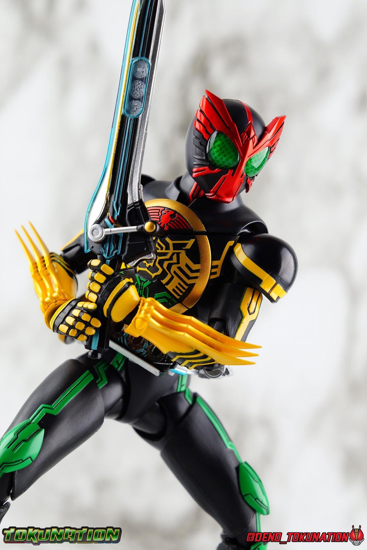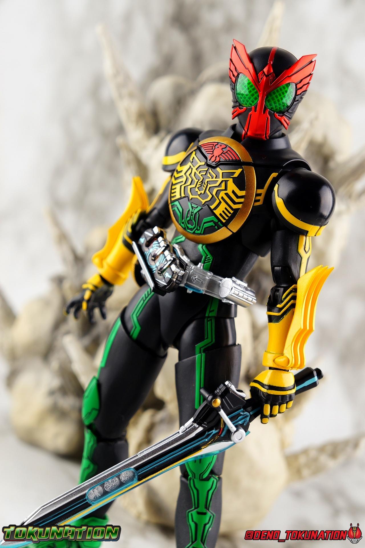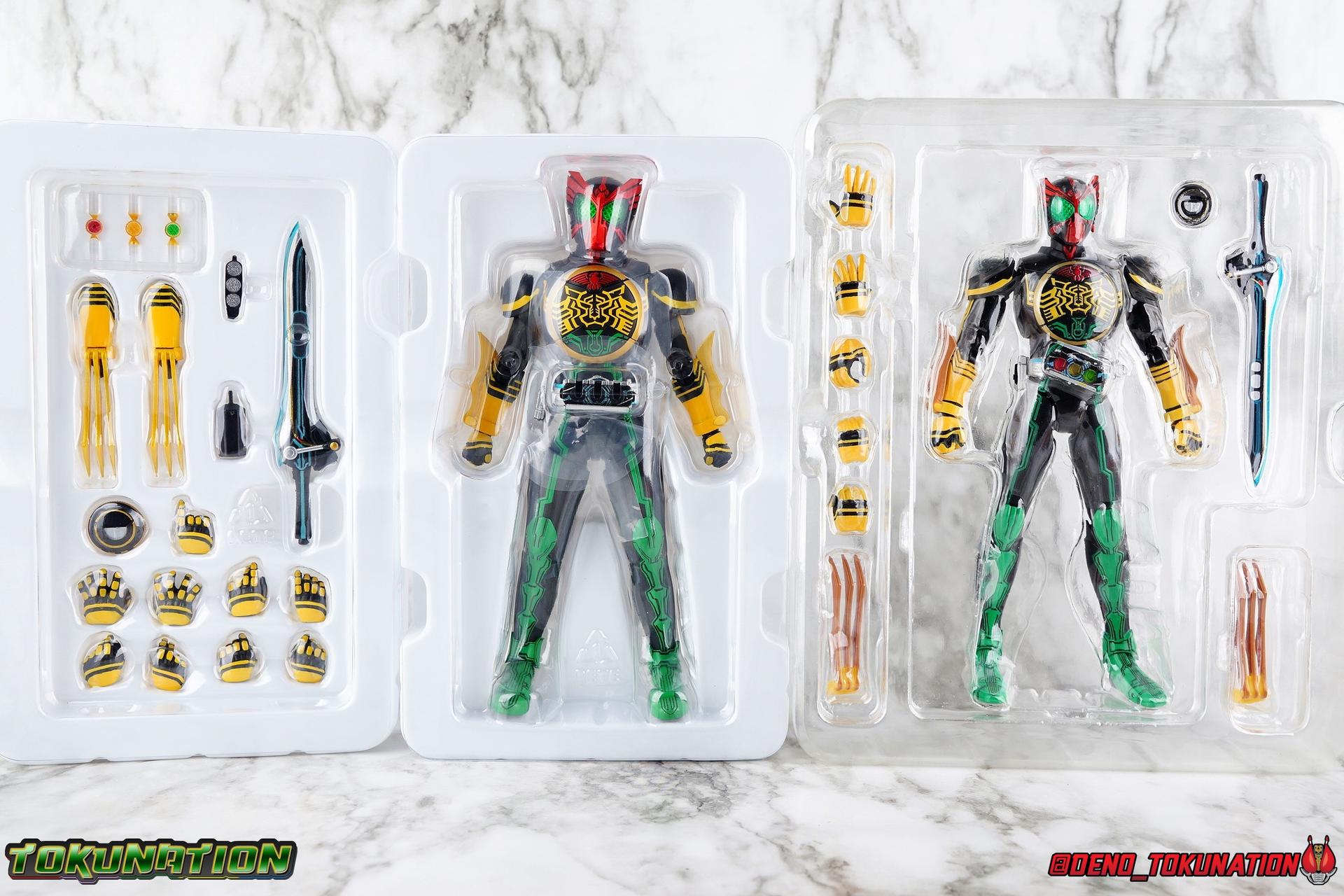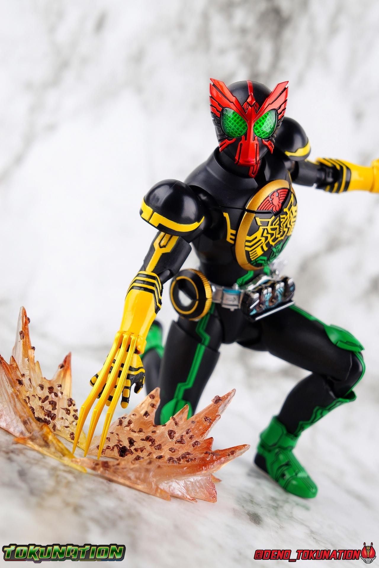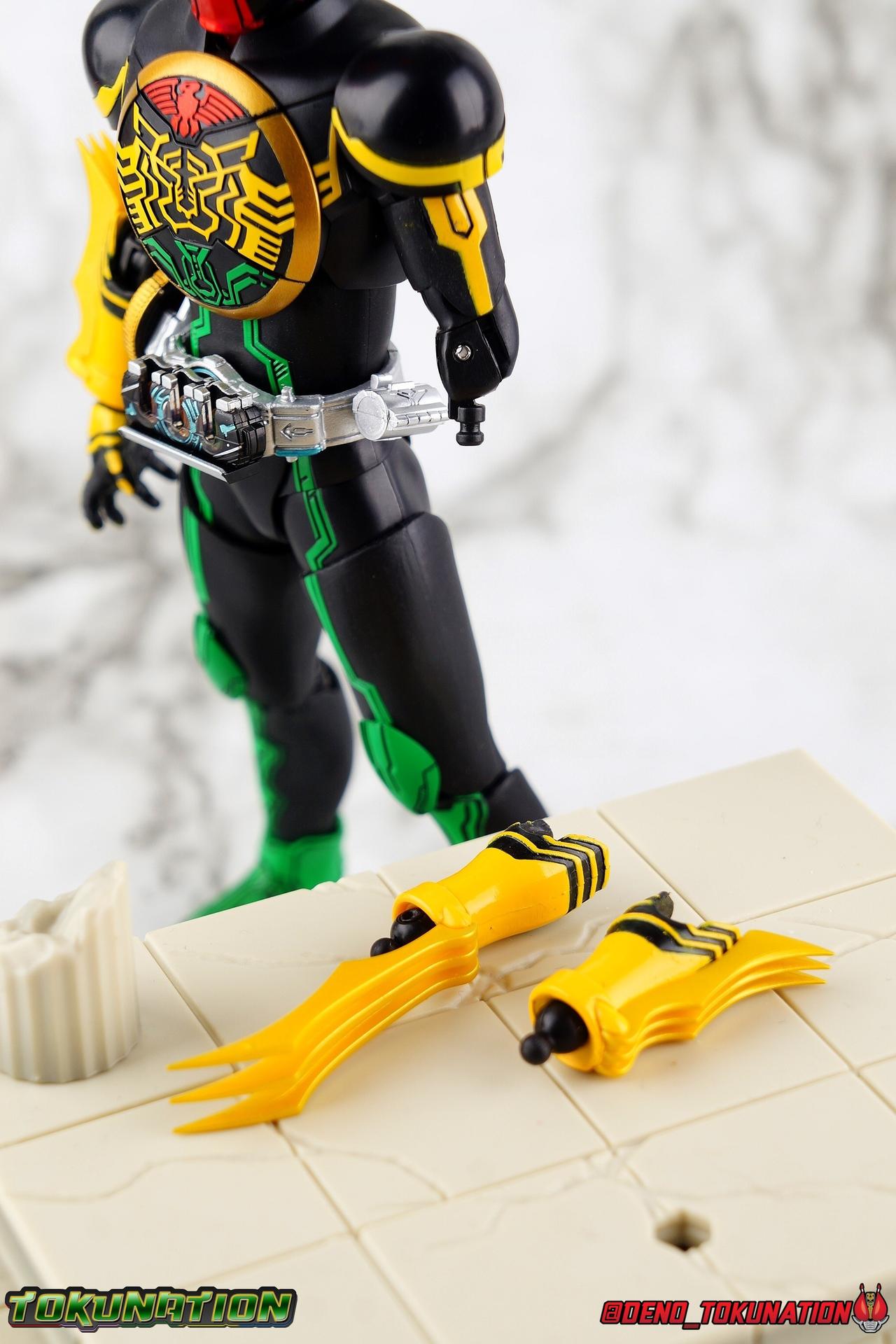 Long ago the King, the first OOO, instructed 4 alchemists to create life. Made from Core Medals these creatures, the Greeed, were filled with immense craving, unable to fill the voids within. Incapable of processing human emotions and senses, the Greeeds sought to consume the world of man to fill their sense of craving, but before they could they were sealed away by OOO. 800 years later, Eiji Hino was minding his own business as a part time security guard when the seal on the Greeed was broken, releasing them once more into the human world. Still craving to be whole, nothing could stand in their way without the power of the King. But one of their number, Ankh, took it upon himself to steal the Core Medals of his kind. Intending to find a human pawn, Ankh stumbles upon Eiji and a bond is born. Handing the Driver of the king and the Core Medals over, Ankh allows Eiji to become Kamen Rider OOO! What began as a begrudging alliance would spawn one of the greatest and truest friendships in Kamen Rider history, as the Greeed Ankh supported Eiji in his quest to save people wherever he could. Anything goes it's coming up OOO! Packaging Obviously, Seihou OOO comes in that familiar and collector friendly packaging this line has come to be known for. And it's quite the departure from what the original OOO line featured. It's much more subdued, which bothers me slightly, but it feels much sturdier and fits right in with an ever growing collection of Shinkocchou Seihou releases. As you can see in the gallery below, the two packaging types are very different, each with it's merits, but I welcome the change. Main Figure It's been quite a journey from the early days of the S.H. Figuarts toyline. Back in the day (2011) the original SHF Kamen Rider OOO TaToBa Combo was released, followed along eventually by every one of OOO other combos, and a variety of his mixed combo forms as well. Honestly it's astonishing how many OOO forms got Figuarts, but the mere fact that the 10 Main Combos from TV & Films happened is incredible. Flash forward to 2019 (though I'm getting to this review in 2020) and we're back to square one. Tamashii is finally treating us to a do-over for OOO, and giving us the figure we always hoped for. The original line was plagued by loose joints, gummy parts, inaccuracies, and more. Now, the Shinkocchou Seihou line is here to set things right. At a glance, there's no question, Shinkocchou Seihou OOO is absolutely an improvement in every single facet over the original figure. Let's start with the composition of the body. Seihou OOO goes the extra mile compared to the original by incorporating a Combo Change gimmick, hearkening back to the gimmick line of the show's day, aptly named Combo Change. Separating into Taka, Tora and Batta sections that means you'll be able to swap around the 3 components of the body between any of the current and future Seihou OOO releases. This is revolutionary, something I've always wanted to see Figuarts try more of. Though not as extensive as OOO, other recent releases have also begun to take on the form change aspect like Kamen Riders' Evol & Geiz Revive. What's really striking about the general look of the figure is it's proper proportions compared to the lanky and thin look of the original. Seihou OOO has all the beef of the actual suit, and so much more articulation than the previous release could have dreamed of. Each ankle has all the range necessary for OOO to get into his trademark wide stances, but it's really the double jointed knees that do a ton of the work. It's all about flexibility in the legs to make a figure feel dynamic, and no rider should feel more like that than OOO. The hips have that same genius sort of in set design type that Seihou's tend to have. The difference with OOO is that the Batta green markings extend up from the thigh across the separated hip joint and onto the waist. Each part can move independently so they may not always line up perfectly, but the attention to detail here is glorious, and the functionality far exceeds the limited range of the original figure's drop down hips. The black detailing on the green parts of the legs is crisp as well, but just rough enough to give it that ancient look that feels appropriate enough to be something from 800 years ago. And of course I'm a sucker for properly sculpted butt plates on riders, so I appreciate how the leg design doesn't take away from some correct anatomy. Around Eiji's waist, is the OOO Driver & Belt. I know the OOO Driver looks like it has a lot going on, but it's an incredibly well designed driver for this scale, even more so than some of my favorites like the Build Driver. The Driver in the center can accept the included 3 Core Medals or any other medals in the Seihou line, allowing you to fully and accurately recreate combo changes. A tool is included to remove and insert medals as you wish as well. The Driver can also tilt down to the figure's left accurately. On the left hip is a Cell Medal container, while the right hip has a holster for the included O Scanner. It's a bulky belt set up but one that feels undeniably perfect on a bulky body like OOO. Above the belt, at the point where OOO's chest emblem covers the torso, is where the figure can be taken apart. A firm plug holds the upper and lower torso together, but it's honestly the ingenious way the OOO emblem comes apart and un-pegs from the torso that blows my mind. While the head and neck can detached from the shoulders as one chunk. Even more astonishingly this entire gimmick doesn't impact the figure's design or articulation. Even the bottom section of the chest is hinged to move. It's just so satisfying all around. The emblem itself is exquisitely sculpted and painted as well. The arms are also a big attraction this go around for OOO. Far less gummy than the originals, these feel solid and extremely flexible. And that's in large part thanks to the hybrid shoulder pad design that incorporates them onto the arms