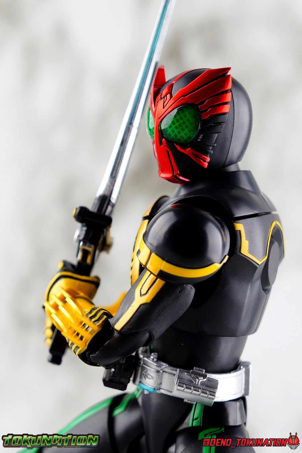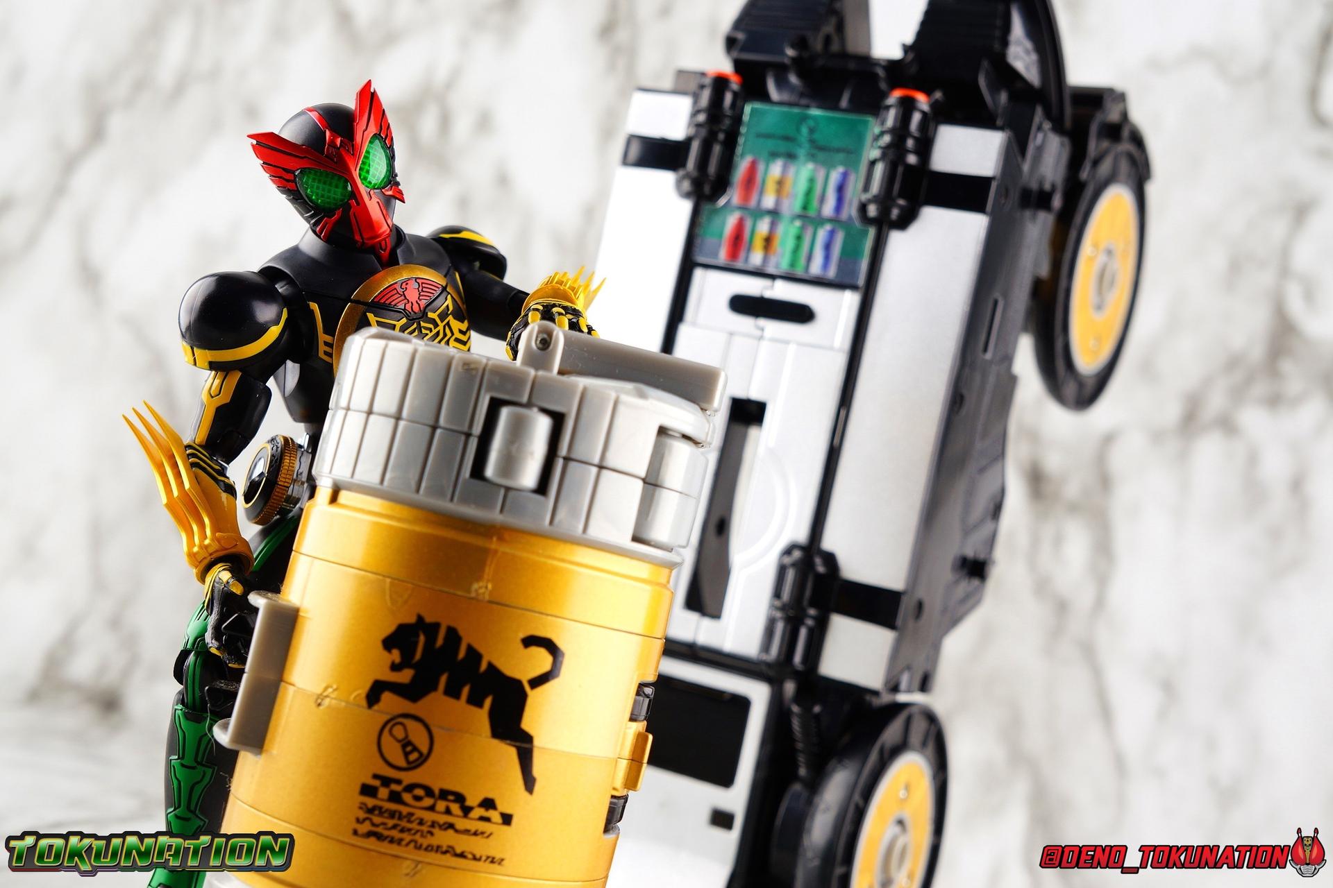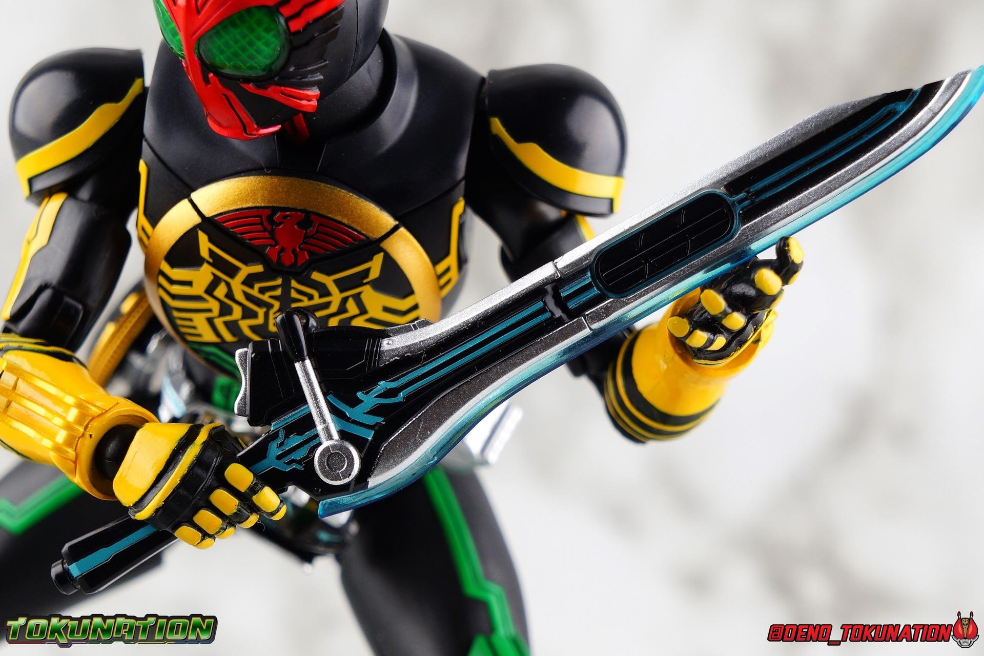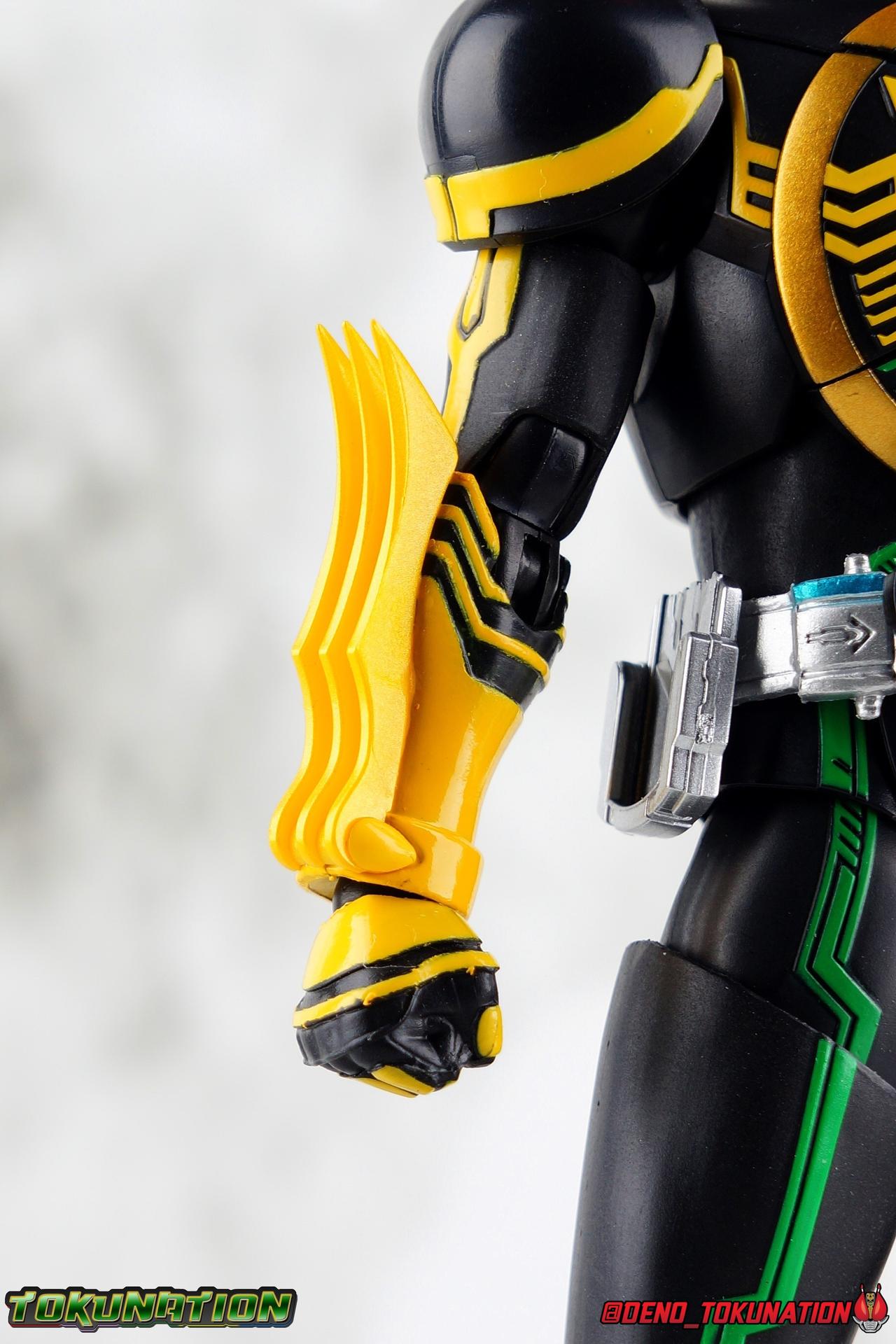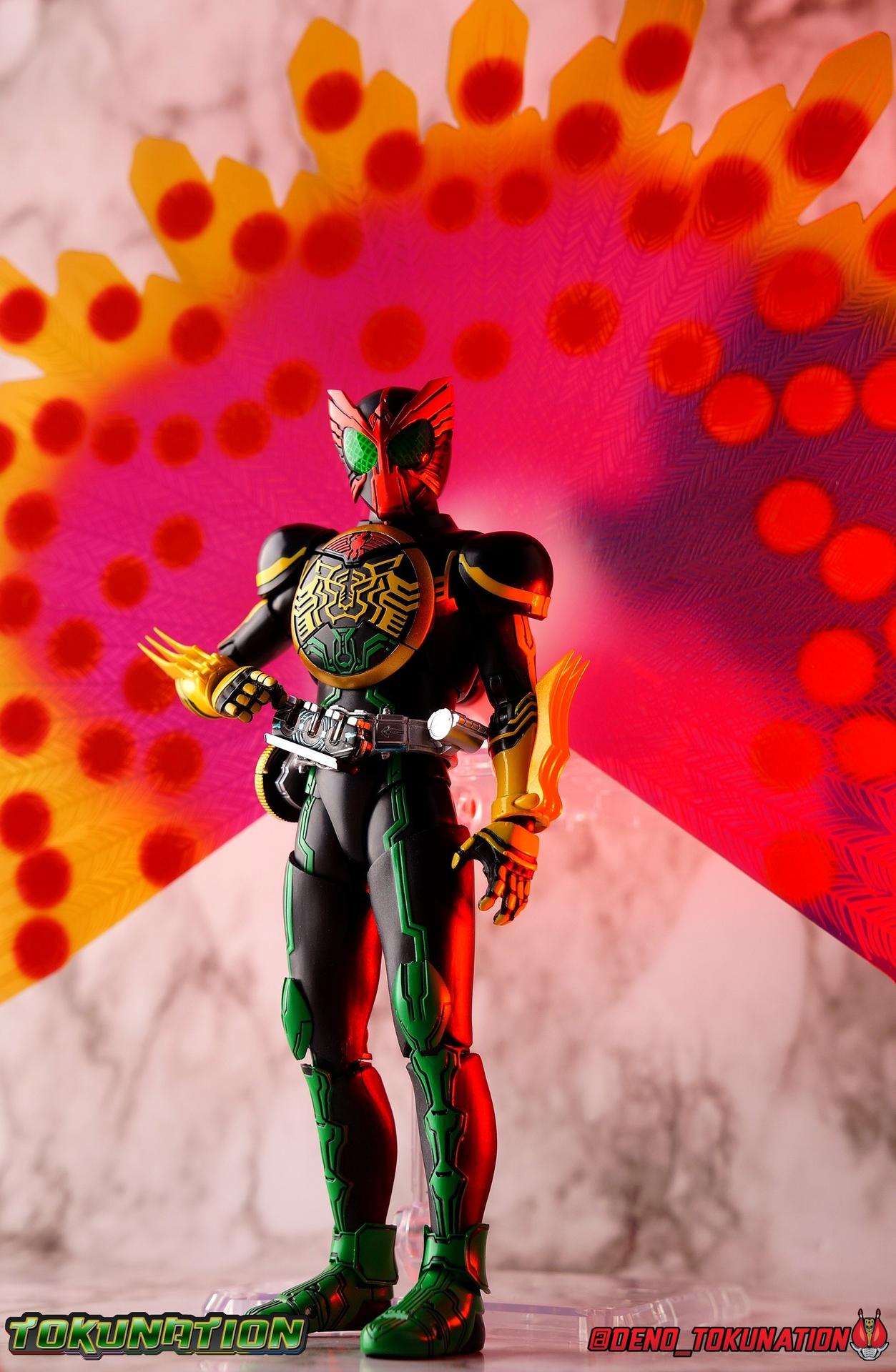 Long ago the King, the first OOO, instructed 4 alchemists to create life. Made from Core Medals these creatures, the Greeed, were filled with immense craving, unable to fill the voids within. Incapable of processing human emotions and senses, the Greeeds sought to consume the world of man to fill their sense of craving, but before they could they were sealed away by OOO. 800 years later, Eiji Hino was minding his own business as a part time security guard when the seal on the Greeed was broken, releasing them once more into the human world. Still craving to be whole, nothing could stand in their way without the power of the King. But one of their number, Ankh, took it upon himself to steal the Core Medals of his kind. Intending to find a human pawn, Ankh stumbles upon Eiji and a bond is born. Handing the Driver of the king and the Core Medals over, Ankh allows Eiji to become Kamen Rider OOO! What began as a begrudging alliance would spawn one of the greatest and truest friendships in Kamen Rider history, as the Greeed Ankh supported Eiji in his quest to save people wherever he could. Anything goes it's coming up OOO! Packaging Obviously, Seihou OOO comes in that familiar and collector friendly packaging this line has come to be known for. And it's quite the departure from what the original OOO line featured. It's much more subdued, which bothers me slightly, but it feels much sturdier and fits right in with an ever growing collection of Shinkocchou Seihou releases. As you can see in the gallery below, the two packaging types are very different, each with it's merits, but I welcome the change. Main Figure It's been quite a journey from the early days of the S.H. Figuarts toyline. Back in the day (2011) the original SHF Kamen Rider OOO TaToBa Combo was released, followed along eventually by every one of OOO other combos, and a variety of his mixed combo forms as well. Honestly it's astonishing how many OOO forms got Figuarts, but the mere fact that the 10 Main Combos from TV & Films happened is incredible. Flash forward to 2019 (though I'm getting to this review in 2020) and we're back to square one. Tamashii is finally treating us to a do-over for OOO, and giving us the figure we always hoped for. The original line was plagued by loose joints, gummy parts, inaccuracies, and more. Now, the Shinkocchou Seihou line is here to set things right. At a glance, there's no question, Shinkocchou Seihou OOO is absolutely an improvement in every single facet over the original figure. Let's start with the composition of the body. Seihou OOO goes the extra mile compared to the original by incorporating a Combo Change gimmick, hearkening back to the gimmick line of the show's day, aptly named Combo Change. Separating into Taka, Tora and Batta sections that means you'll be able to swap around the 3 components of the body between any of the current and future Seihou OOO releases. This is revolutionary, something I've always wanted to see Figuarts try more of. Though not as extensive as OOO, other recent releases have also begun to take on the form change aspect like Kamen Riders' Evol & Geiz Revive. What's really striking about the general look of the figure is it's proper proportions compared to the lanky and thin look of the original. Seihou OOO has all the beef of the actual suit, and so much more articulation than the previous release could have dreamed of. Each ankle has all the range necessary for OOO to get into his trademark wide stances, but it's really the double jointed knees that do a ton of the work. It's all about flexibility in the legs to make a figure feel dynamic, and no rider should feel more like that than OOO. The hips have that same genius sort of in set design type that Seihou's tend to have. The difference with OOO is that the Batta green markings extend up from the thigh across the separated hip joint and onto the waist. Each part can move independently so they may not always line up perfectly, but the attention to detail here is glorious, and the functionality far exceeds the limited range of the original figure's drop down hips. The black detailing on the green parts of the legs is crisp as well, but just rough enough to give it that ancient look that feels appropriate enough to be something from 800 years ago. And of course I'm a sucker for properly sculpted butt plates on riders, so I appreciate how the leg design doesn't take away from some correct anatomy. Around Eiji's waist, is the OOO Driver & Belt. I know the OOO Driver looks like it has a lot going on, but it's an incredibly well designed driver for this scale, even more so than some of my favorites like the Build Driver. The Driver in the center can accept the included 3 Core Medals or any other medals in the Seihou line, allowing you to fully and accurately recreate combo changes. A tool is included to remove and insert medals as you wish as well. The Driver can also tilt down to the figure's left accurately. On the left hip is a Cell Medal container, while the right hip has a holster for the included O Scanner. It's a bulky belt set up but one that feels undeniably perfect on a bulky body like OOO. Above the belt, at the point where OOO's chest emblem covers the torso, is where the figure can be taken apart. A firm plug holds the upper and lower torso together, but it's honestly the ingenious way the OOO emblem comes apart and un-pegs from the torso that blows my mind. While the head and neck can detached from the shoulders as one chunk. Even more astonishingly this entire gimmick doesn't impact the figure's design or articulation. Even the bottom section of the chest is hinged to move. It's just so satisfying all around. The emblem itself is exquisitely sculpted and painted as well. The arms are also a big attraction this go around for OOO. Far less gummy than the originals, these feel solid and extremely flexible. And that's in large part thanks to the hybrid shoulder pad design that incorporates them onto the arms
