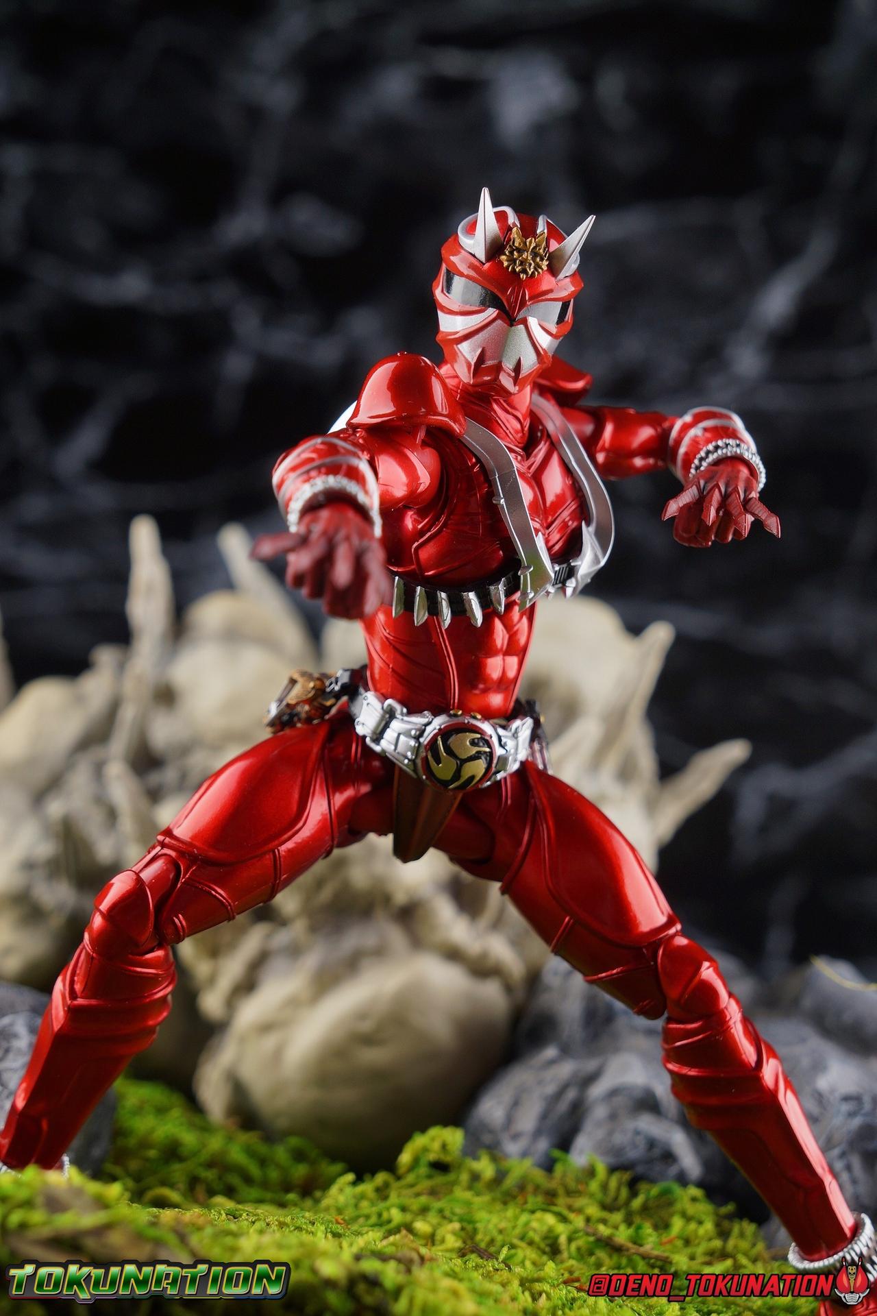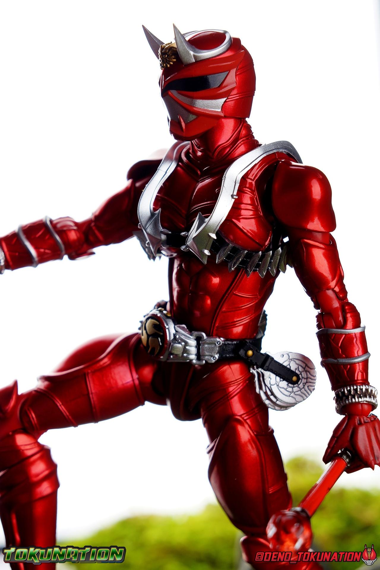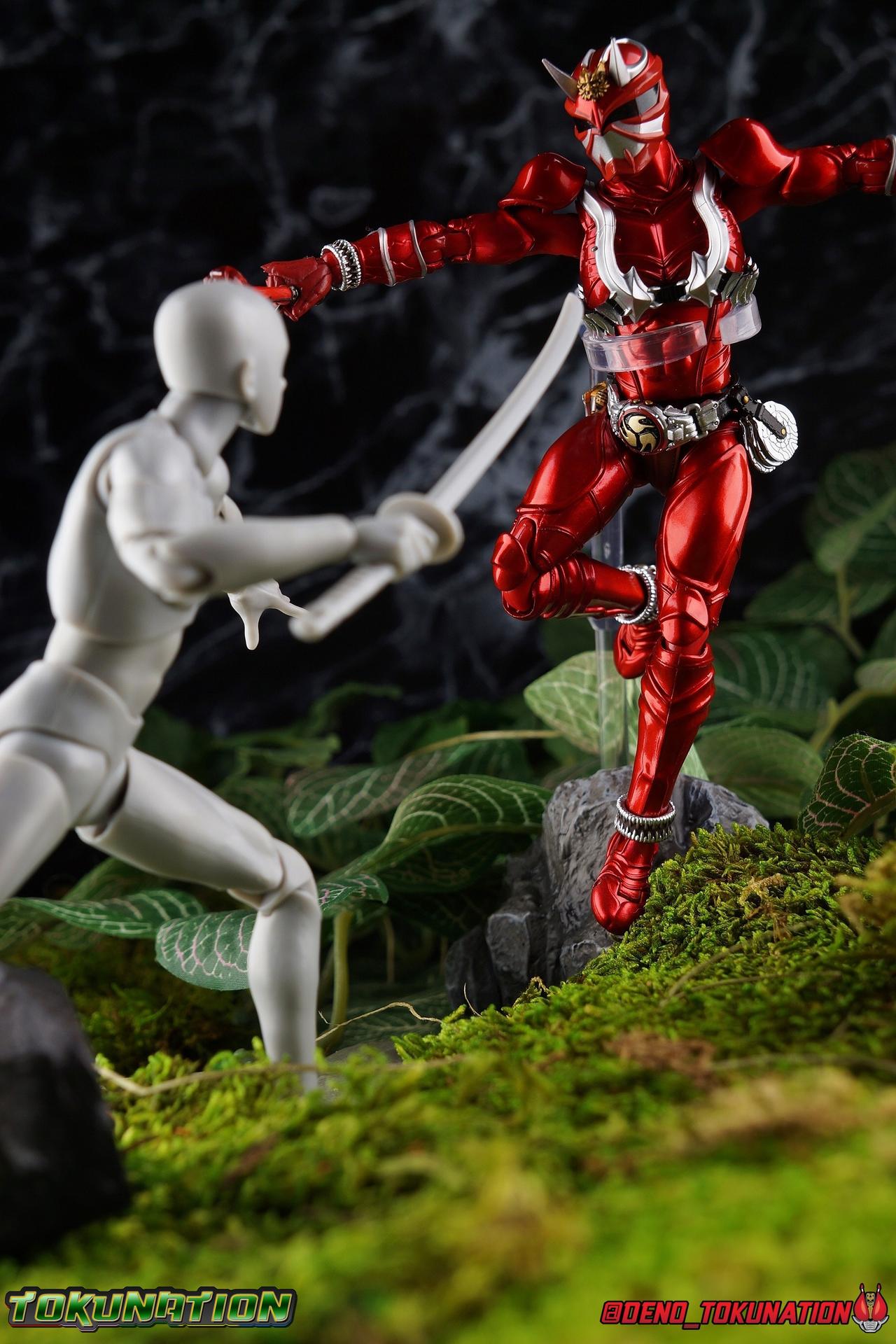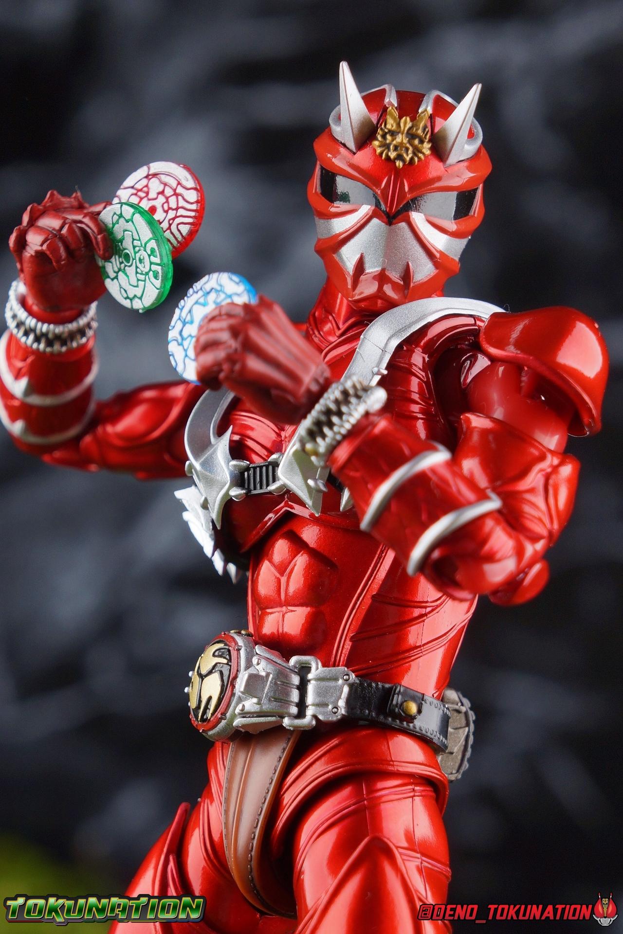 It is the Summer of Training. And while mentoring Todoroki's inconsistent practice of the Taiko drum, and even bestowing the Ongekibou to both Todoroki & Ibuki, Kamen Rider Hibiki furiously trains himself. Faster, stronger, hotter. Burning brighter than he ever has before, Hibiki must master the rhythm of his core once again and draw out the full potential of his Ongekibou. Without this strength, the deadly Dorotabou will continue to multiply, wreaking havoc on the local villages. With a fire of strength raging in his heart, Hibiki explodes into a new form, Kamen Rider Hibiki Kurenai! Packaging Hibiki Kurenai comes in that familiar and collector friendly packaging this line has come to be known for. No massive changes here even from the first Seihou Hibiki release from 6 years ago, the only differenes here being the stock imagery and the front facing portrait. It's a stylish box type even if it feels a little bit more stale each time. I do appreciate when they change things up more with releases like Ankh, Den-O, & Kiba. Main Figure Obviously, Shinkocchou Seihou Hibiki was one of the first figures of the entire Seihou line, predated only by Kabuto. So it's great to see that just over 6 years later, that this fantastic mold has returned to the line with this explosive form. The 3 previous releases in the Hibiki line, Ibuki Todoroki & Zanki, were all magnificent and brought something new and unique to this body type. At their core each shares the basic body structure that Hibiki pioneered. With Hibiki Kurenai though, we finally circle back around the to original tooling of the mold. It's hard to say anything new about the mold itself. As I've gone into on 4 occasions now reviewing Hibiki releases, this is a stellar figure. Each iteration of the mold looks like a suit that's just walked off screen. Of the entire Seihou line, I think the Oni Riders by far look the most gorgeous and lifelike. I'll get into the usual in's and out's of the articulation scheme soon, but first I want to focus on the stunning paint apps on this beauty. The entire figure is decked out in a gorgeous metallic red in the same fashion as that metallic purple of the original release. The paint apps to the core body are largely the only change we see as well, though there are some additional red paint apps on the upper forearms giving them a uniform red look, and some new apps on the head giving Hibiki a much needed visor and mouth plate that really bring the design together. As always Tamashii's attention to detail is jaw dropping. Below we'll get into the articulation this mold has always boasted, but it won't be terribly different from my previous breakdowns of the Hibiki Riders. Feel free to skip down if you wish. The sculpt of this body type really brings to life these unique Oni Rider suits. In every way imaginable it captures the look of the on screen suit right down to the textured musculature, and the gloss of the armor really gives in that pleather/vinyl feel of an actual suit. The design process Seihou's go through has always been much much more involved than that of the standard figuarts line and the best examples of this were the special booklets included with Kabuto & the original Hibiki. When the design begins with a sort of skeletal inner frame, and builds out what would be like a suit over a real human body like this, you get a much more realistic application of articulation and proportion to the body as a result. Now despite the obvious color shift to red, Hibiki Kurenai is physically identical to the original release. When Bandai nails the basic design of the body, it can be truly astounding how outer level cosmetic changes can create a vastly different experience though. Even so, some of my minor gripes still exist. I've always found the legs to be odd. To me, they look really long and at odds with the torso, especially when bent for crouching poses. Something about them looks off. They function well enough, though I've always thought this mold had one of the more strange figuarts hip joints out there. While the part separation undoubtedly gives them great range, the hips look very small by the time you angle them out fully, making the thigh seem huge by comparison. And while the knees function just fine, the feet could have slightly more range. The only unchanged part of the legs color wise, is the silver bands which adorn Kurenai's ankles. Hibiki Kurenai's belt is really loaded up with accessories like his predecessors as well. This figure comes with a lot and luckily you can store some of it on his belt given the display options you've chosen. When loaded out for static poses, the left hip can be outfitted with a Disc Animal holster with 3 non-removable discs sculpted in. Or you can keep the out of box standard part attached which is an empty holster for when you want him to hold the discs in hand. At the center of the belt is the same Ongekiko Kaentsuzumi the original Hibiki had. This circular piece is removable to simulate how how Hibiki uses it like a taiko drum for Ongeki Da finishers. It can be used with any Oni Rider that has a similarly designed belt. The right hip features Hibiki's signature transformation tuning fork, the Henshin Onsa Onkaku in it's collapsed form, though a standard open one is included for use with the figure as well. The back side of the belt can either feature an empty Ongekibou holster or a part is included showing them stored away. If you're paying attention you'll see that in a few photos below I forgot to remove them until well after this shoot was over. Once again the upper body is identical to classic Hibiki. The torso is a beautiful glossy read offset by that magnificently sculpted chest harness that goes around the back as well. The upper and lower halves of the torso move independent of one another, though it's a tight fit to get either to move very far. I've always felt this body type was a bit stiff, but it gets the job done very nicely still. Kurenai's arms 