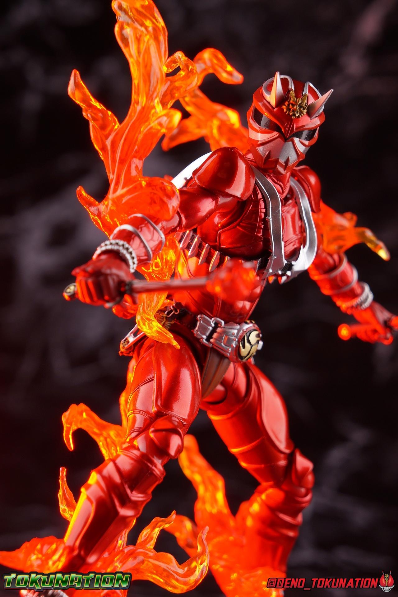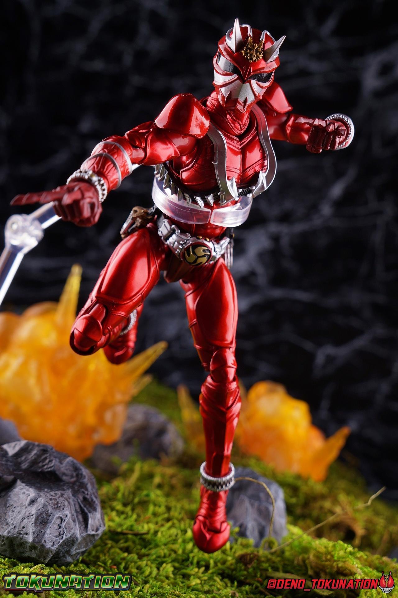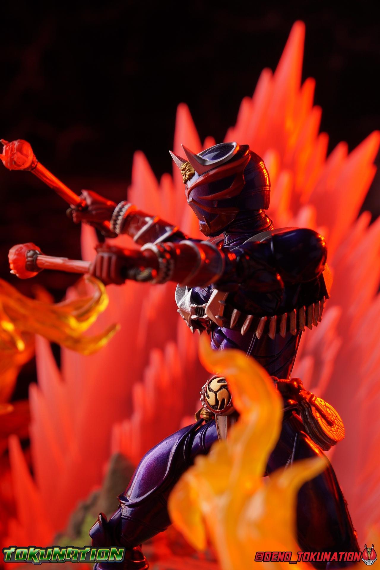 It is the Summer of Training. And while mentoring Todoroki's inconsistent practice of the Taiko drum, and even bestowing the Ongekibou to both Todoroki & Ibuki, Kamen Rider Hibiki furiously trains himself. Faster, stronger, hotter. Burning brighter than he ever has before, Hibiki must master the rhythm of his core once again and draw out the full potential of his Ongekibou. Without this strength, the deadly Dorotabou will continue to multiply, wreaking havoc on the local villages. With a fire of strength raging in his heart, Hibiki explodes into a new form, Kamen Rider Hibiki Kurenai! Packaging Hibiki Kurenai comes in that familiar and collector friendly packaging this line has come to be known for. No massive changes here even from the first Seihou Hibiki release from 6 years ago, the only differenes here being the stock imagery and the front facing portrait. It's a stylish box type even if it feels a little bit more stale each time. I do appreciate when they change things up more with releases like Ankh, Den-O, & Kiba. Main Figure Obviously, Shinkocchou Seihou Hibiki was one of the first figures of the entire Seihou line, predated only by Kabuto. So it's great to see that just over 6 years later, that this fantastic mold has returned to the line with this explosive form. The 3 previous releases in the Hibiki line, Ibuki Todoroki & Zanki, were all magnificent and brought something new and unique to this body type. At their core each shares the basic body structure that Hibiki pioneered. With Hibiki Kurenai though, we finally circle back around the to original tooling of the mold. It's hard to say anything new about the mold itself. As I've gone into on 4 occasions now reviewing Hibiki releases, this is a stellar figure. Each iteration of the mold looks like a suit that's just walked off screen. Of the entire Seihou line, I think the Oni Riders by far look the most gorgeous and lifelike. I'll get into the usual in's and out's of the articulation scheme soon, but first I want to focus on the stunning paint apps on this beauty. The entire figure is decked out in a gorgeous metallic red in the same fashion as that metallic purple of the original release. The paint apps to the core body are largely the only change we see as well, though there are some additional red paint apps on the upper forearms giving them a uniform red look, and some new apps on the head giving Hibiki a much needed visor and mouth plate that really bring the design together. As always Tamashii's attention to detail is jaw dropping. Below we'll get into the articulation this mold has always boasted, but it won't be terribly different from my previous breakdowns of the Hibiki Riders. Feel free to skip down if you wish. The sculpt of this body type really brings to life these unique Oni Rider suits. In every way imaginable it captures the look of the on screen suit right down to the textured musculature, and the gloss of the armor really gives in that pleather/vinyl feel of an actual suit. The design process Seihou's go through has always been much much more involved than that of the standard figuarts line and the best examples of this were the special booklets included with Kabuto & the original Hibiki. When the design begins with a sort of skeletal inner frame, and builds out what would be like a suit over a real human body like this, you get a much more realistic application of articulation and proportion to the body as a result. Now despite the obvious color shift to red, Hibiki Kurenai is physically identical to the original release. When Bandai nails the basic design of the body, it can be truly astounding how outer level cosmetic changes can create a vastly different experience though. Even so, some of my minor gripes still exist. I've always found the legs to be odd. To me, they look really long and at odds with the torso, especially when bent for crouching poses. Something about them looks off. They function well enough, though I've always thought this mold had one of the more strange figuarts hip joints out there. While the part separation undoubtedly gives them great range, the hips look very small by the time you angle them out fully, making the thigh seem huge by comparison. And while the knees function just fine, the feet could have slightly more range. The only unchanged part of the legs color wise, is the silver bands which adorn Kurenai's ankles. Hibiki Kurenai's belt is really loaded up with accessories like his predecessors as well. This figure comes with a lot and luckily you can store some of it on his belt given the display options you've chosen. When loaded out for static poses, the left hip can be outfitted with a Disc Animal holster with 3 non-removable discs sculpted in. Or you can keep the out of box standard part attached which is an empty holster for when you want him to hold the discs in hand. At the center of the belt is the same Ongekiko Kaentsuzumi the original Hibiki had. This circular piece is removable to simulate how how Hibiki uses it like a taiko drum for Ongeki Da finishers. It can be used with any Oni Rider that has a similarly designed belt. The right hip features Hibiki's signature transformation tuning fork, the Henshin Onsa Onkaku in it's collapsed form, though a standard open one is included for use with the figure as well. The back side of the belt can either feature an empty Ongekibou holster or a part is included showing them stored away. If you're paying attention you'll see that in a few photos below I forgot to remove them until well after this shoot was over. Once again the upper body is identical to classic Hibiki. The torso is a beautiful glossy read offset by that magnificently sculpted chest harness that goes around the back as well. The upper and lower halves of the torso move independent of one another, though it's a tight fit to get either to move very far. I've always felt this body type was a bit stiff, but it gets the job done very nicely still. Kurenai's arms 