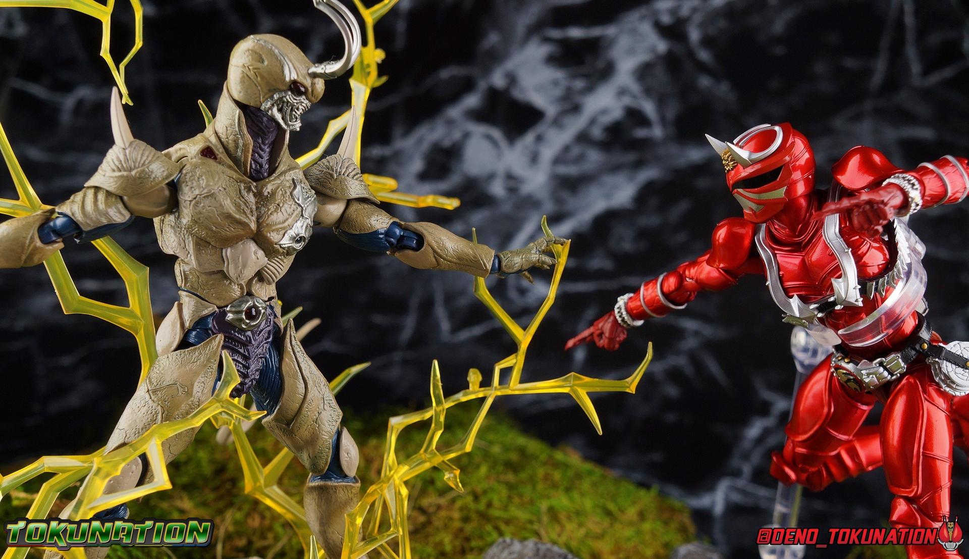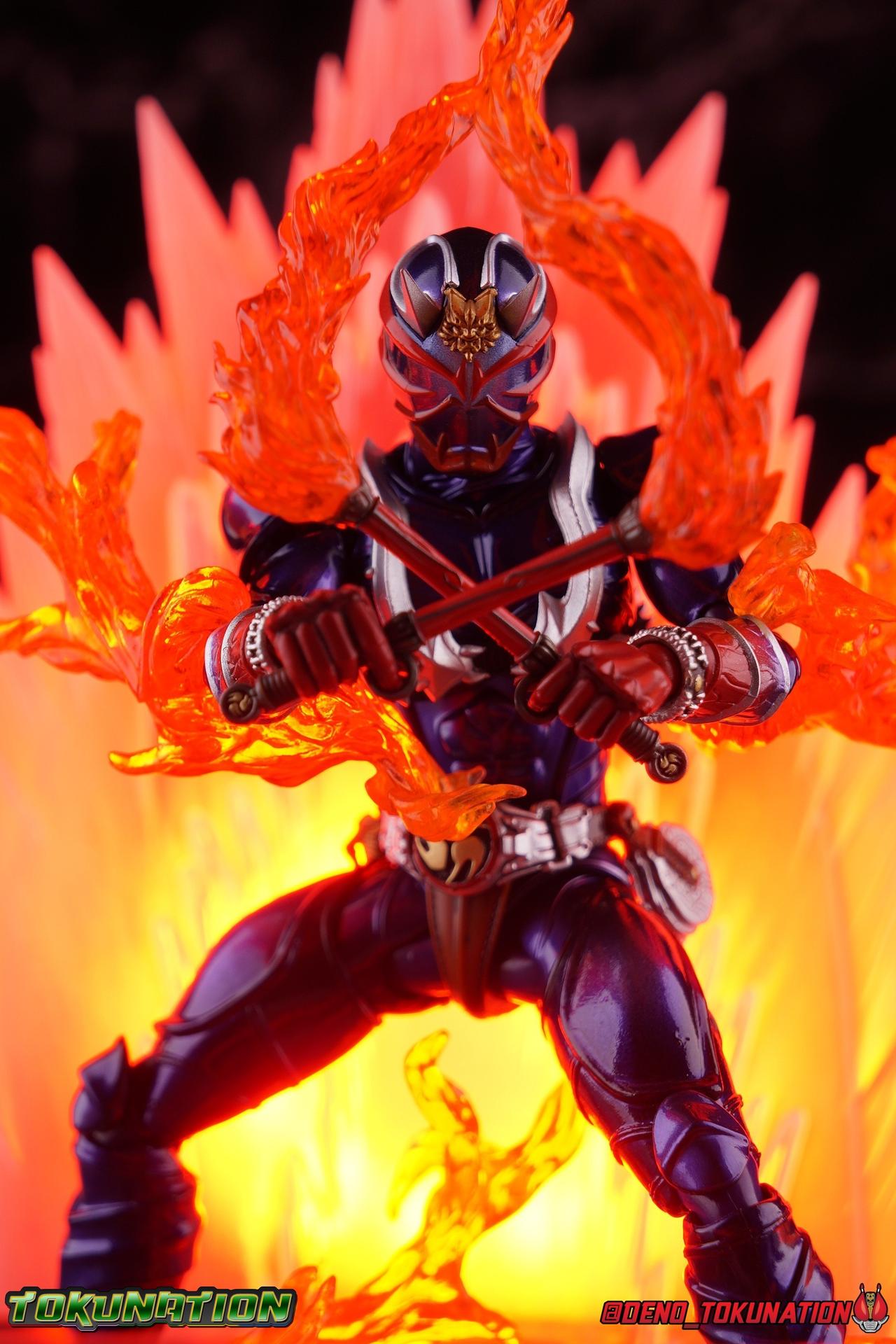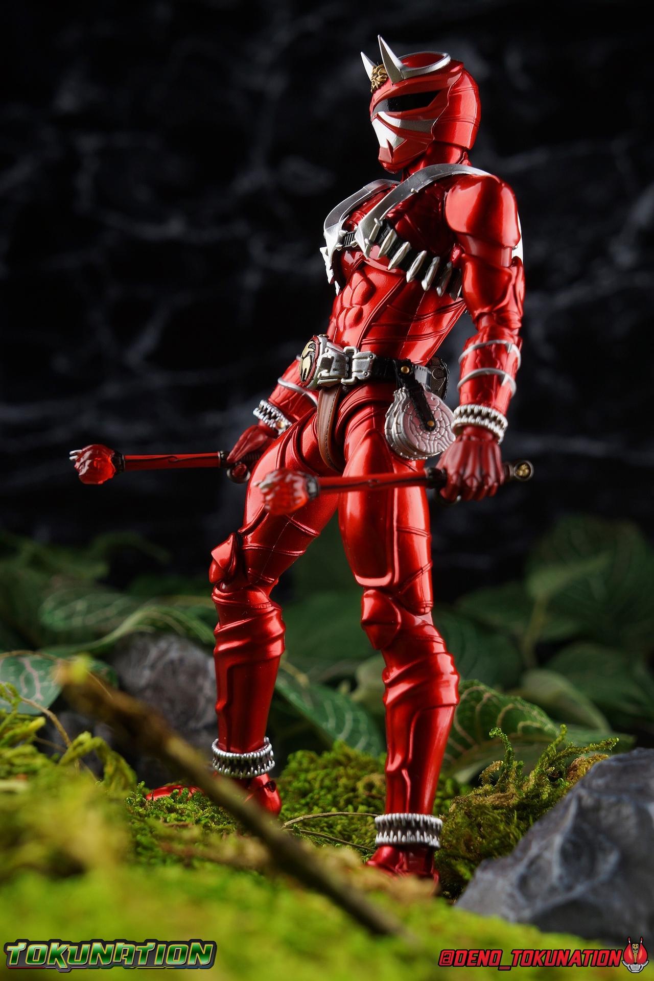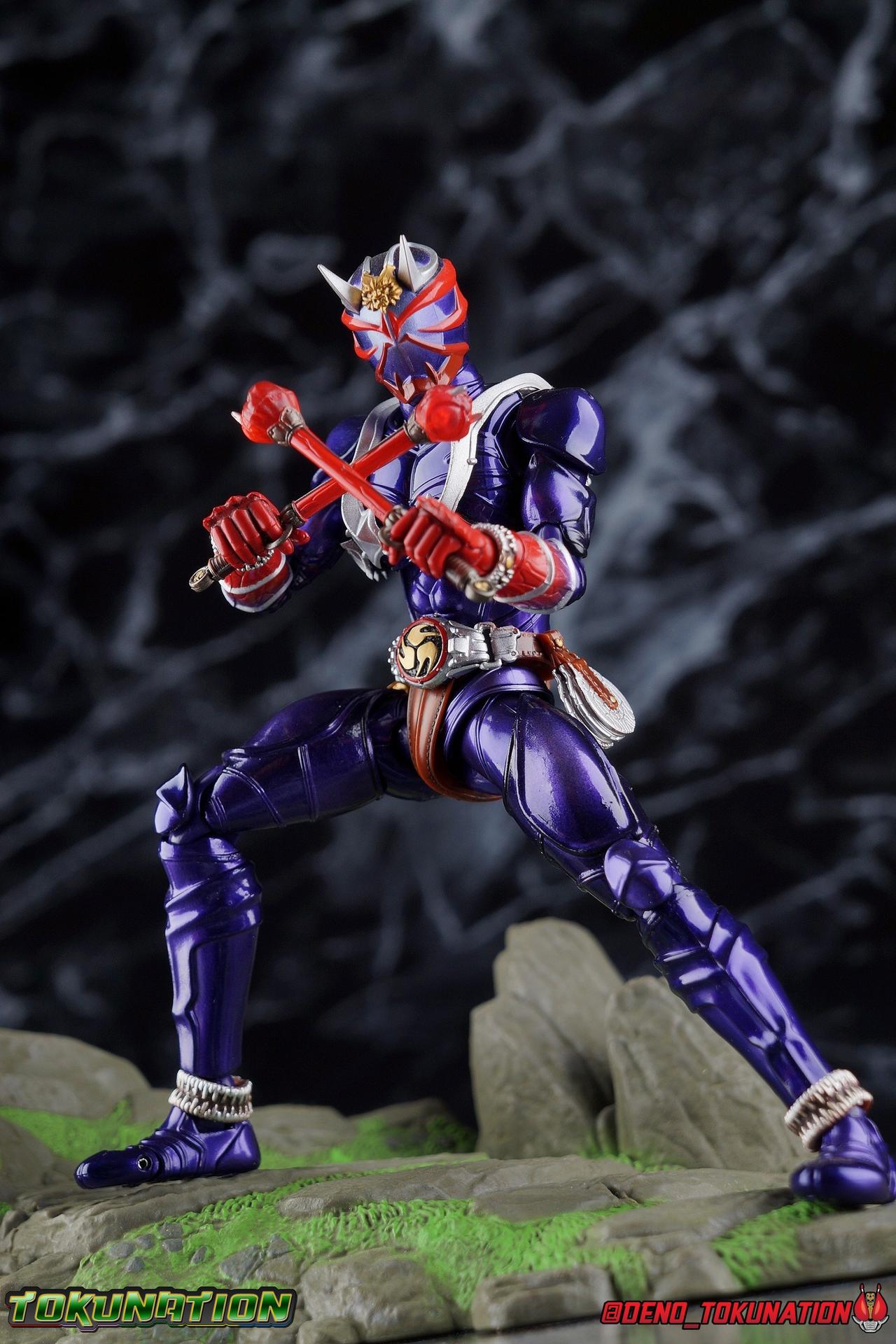 It is the Summer of Training. And while mentoring Todoroki's inconsistent practice of the Taiko drum, and even bestowing the Ongekibou to both Todoroki & Ibuki, Kamen Rider Hibiki furiously trains himself. Faster, stronger, hotter. Burning brighter than he ever has before, Hibiki must master the rhythm of his core once again and draw out the full potential of his Ongekibou. Without this strength, the deadly Dorotabou will continue to multiply, wreaking havoc on the local villages. With a fire of strength raging in his heart, Hibiki explodes into a new form, Kamen Rider Hibiki Kurenai! Packaging Hibiki Kurenai comes in that familiar and collector friendly packaging this line has come to be known for. No massive changes here even from the first Seihou Hibiki release from 6 years ago, the only differenes here being the stock imagery and the front facing portrait. It's a stylish box type even if it feels a little bit more stale each time. I do appreciate when they change things up more with releases like Ankh, Den-O, & Kiba. Main Figure Obviously, Shinkocchou Seihou Hibiki was one of the first figures of the entire Seihou line, predated only by Kabuto. So it's great to see that just over 6 years later, that this fantastic mold has returned to the line with this explosive form. The 3 previous releases in the Hibiki line, Ibuki Todoroki & Zanki, were all magnificent and brought something new and unique to this body type. At their core each shares the basic body structure that Hibiki pioneered. With Hibiki Kurenai though, we finally circle back around the to original tooling of the mold. It's hard to say anything new about the mold itself. As I've gone into on 4 occasions now reviewing Hibiki releases, this is a stellar figure. Each iteration of the mold looks like a suit that's just walked off screen. Of the entire Seihou line, I think the Oni Riders by far look the most gorgeous and lifelike. I'll get into the usual in's and out's of the articulation scheme soon, but first I want to focus on the stunning paint apps on this beauty. The entire figure is decked out in a gorgeous metallic red in the same fashion as that metallic purple of the original release. The paint apps to the core body are largely the only change we see as well, though there are some additional red paint apps on the upper forearms giving them a uniform red look, and some new apps on the head giving Hibiki a much needed visor and mouth plate that really bring the design together. As always Tamashii's attention to detail is jaw dropping. Below we'll get into the articulation this mold has always boasted, but it won't be terribly different from my previous breakdowns of the Hibiki Riders. Feel free to skip down if you wish. The sculpt of this body type really brings to life these unique Oni Rider suits. In every way imaginable it captures the look of the on screen suit right down to the textured musculature, and the gloss of the armor really gives in that pleather/vinyl feel of an actual suit. The design process Seihou's go through has always been much much more involved than that of the standard figuarts line and the best examples of this were the special booklets included with Kabuto & the original Hibiki. When the design begins with a sort of skeletal inner frame, and builds out what would be like a suit over a real human body like this, you get a much more realistic application of articulation and proportion to the body as a result. Now despite the obvious color shift to red, Hibiki Kurenai is physically identical to the original release. When Bandai nails the basic design of the body, it can be truly astounding how outer level cosmetic changes can create a vastly different experience though. Even so, some of my minor gripes still exist. I've always found the legs to be odd. To me, they look really long and at odds with the torso, especially when bent for crouching poses. Something about them looks off. They function well enough, though I've always thought this mold had one of the more strange figuarts hip joints out there. While the part separation undoubtedly gives them great range, the hips look very small by the time you angle them out fully, making the thigh seem huge by comparison. And while the knees function just fine, the feet could have slightly more range. The only unchanged part of the legs color wise, is the silver bands which adorn Kurenai's ankles. Hibiki Kurenai's belt is really loaded up with accessories like his predecessors as well. This figure comes with a lot and luckily you can store some of it on his belt given the display options you've chosen. When loaded out for static poses, the left hip can be outfitted with a Disc Animal holster with 3 non-removable discs sculpted in. Or you can keep the out of box standard part attached which is an empty holster for when you want him to hold the discs in hand. At the center of the belt is the same Ongekiko Kaentsuzumi the original Hibiki had. This circular piece is removable to simulate how how Hibiki uses it like a taiko drum for Ongeki Da finishers. It can be used with any Oni Rider that has a similarly designed belt. The right hip features Hibiki's signature transformation tuning fork, the Henshin Onsa Onkaku in it's collapsed form, though a standard open one is included for use with the figure as well. The back side of the belt can either feature an empty Ongekibou holster or a part is included showing them stored away. If you're paying attention you'll see that in a few photos below I forgot to remove them until well after this shoot was over. Once again the upper body is identical to classic Hibiki. The torso is a beautiful glossy read offset by that magnificently sculpted chest harness that goes around the back as well. The upper and lower halves of the torso move independent of one another, though it's a tight fit to get either to move very far. I've always felt this body type was a bit stiff, but it gets the job done very nicely still. Kurenai's arms 