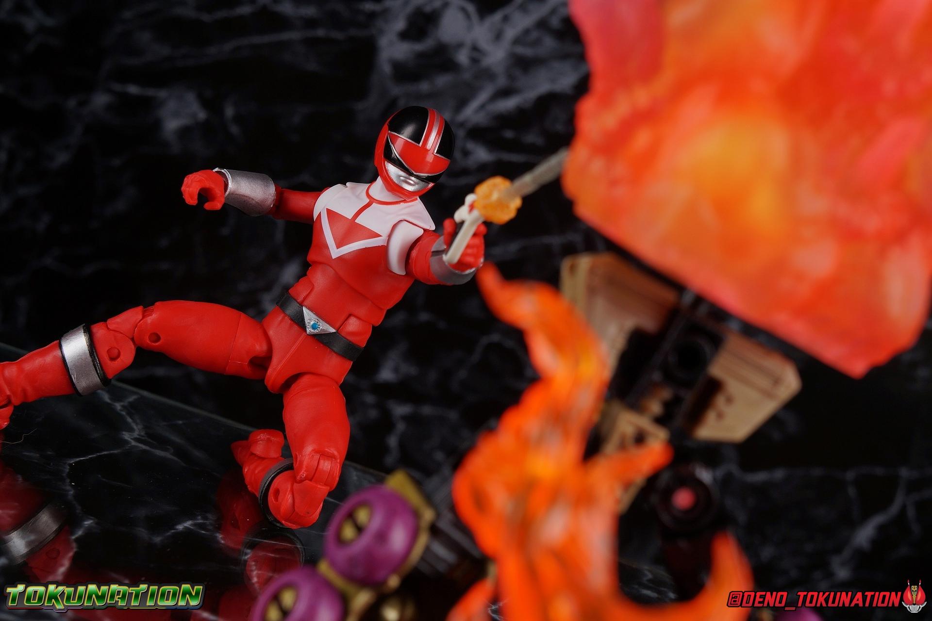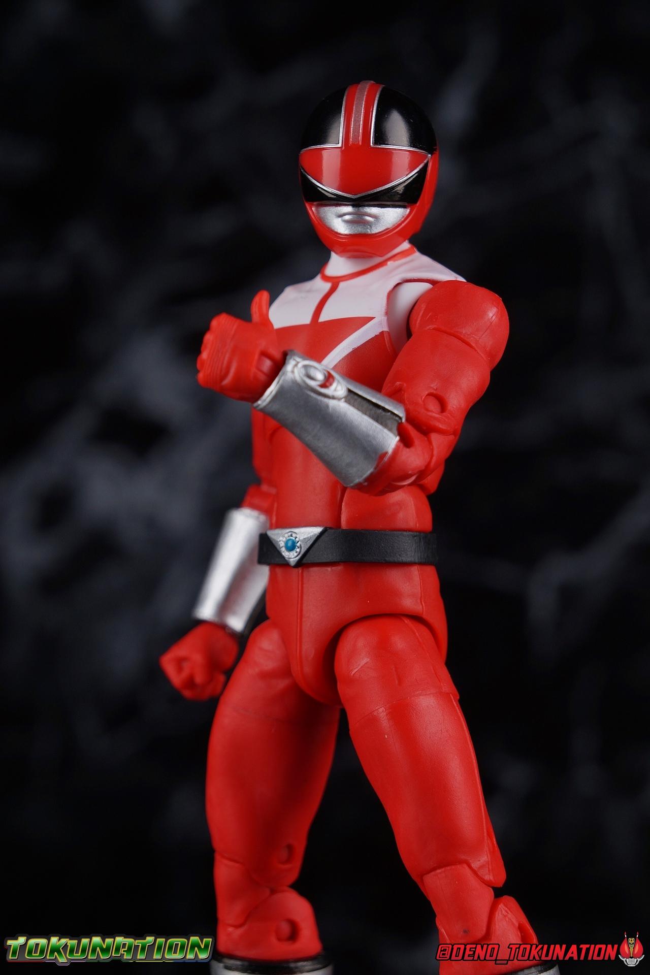Travelling back in time from the year 3000 the wanted criminal Ransik sought to control the Earth before his enemies at Time Force ever even existed. Having disposed with the Red Ranger of his time, Alex Drake, Ransik had ensured his enemies could no longer Morph despite following him to the past. Luckily for Time Force though, Alex's ancestor Wes Collins was willing to step up and ensure that the future came to pass. With the DNA locks on their Chronomorphers broken, the Time Force Rangers could access their powers again! Joining these heroes from the future, Wes Collins is the Time Force Red Ranger! Packaging As we are all pretty familiar with the line by now, I'm sure I probably don't need to go through my usual list of reasons why it's awesome. Hasbro was keen to make sure these appealed to collectors and fans of the franchise from throughout it's various eras. And they also really pop thanks in no small part to some wonderful box art, lovingly crafted by artist Tom Whalen aka @strongstufftom on twitter. His artwork is breathtaking, and makes these figure's feel like just a bit more of a passion project from the folks at Hasbro. Main Figure Most of the time it's a bit hard for me to tell some of the more basic ranger molds apart, strip away the extra bits like armor boot cuffs and such and they all function in generally the same manner. So in that regard this mold feels very familiar to me, reminding me of many other releases. But specifically I do know that the Time Force Red Ranger shares the same mold as the SPD Omega Ranger. The entire body is red plastic, broken up only by the boot cuffs, gauntlets, and paint apps on the torso. Like more or less any ranger in this line, Time Force Red features full rotating rocker ankles as well as a clicking swivel joint for them to go back and forth. Above this is the shin swivel, allowing you to rotate that portion of the leg 360 degrees below the knee, right at the boot cuff. Then we get a very playful double jointed knee which lets you fully bend the leg back in on itself. This is great but there's also a 360 thigh swivel as well as full hips with back/forth and outward motion. All of these cuts are executed in the standard Lightning Collection styling, doing their best to not be obtrusive to this design. Time Force Red features around his waist the unique Time Force emblem and belt. A little soft on the details, and crooked, but this does an admirable job of getting the point across as to what it is. The rest of the torso is totally standard stuff for the line. The lower half has a satisfying but extremely tight ratchet ab joint, while the upper body sits on a ball joint. The combination of the two gives you quite a bit to work with when posing. The chest and back feature that classic Time Force arrow design. I love that bit about the suits, for whatever reason it sticks out in my mind as the most identifiable thing about them, largely because they are so basic. Which is not even remotely a bad thing. In this case however I wish the paint apps had been a little more crisp as there are a number of inconsistently covered areas. The arms hit the sweet spot with that classic butterfly style shoulder joint. As you angle the shoulder back, the body slides out to fill the gap and vice versa. The white plastic of this joint is ever so slightly not the same color as the paint used on the chest. There's a full 360 rotating bicep swivel, double jointed elbows, and the same peg style hands as the rest of the line. But, in the same manner as his mold mate SPD Omega they can't really rest against the figure's torso naturally and instead angle outward somewhat. I really hope Hasbro implements a better set of arms at some point in the line. The left arm of course features the Chrono Morpher. Unlike other recent LC releases with wrist changers, this one is mostly if not perfectly painted. Perhaps my only issue is that the morpher seems a bit small set into the gauntlet. And on that note I wish the gauntles were painted a bit better, mine in particular are very uneven. This brings us to Time Force Red's helmet, which has a strong presence on this figure, and a strong drawback. Whether it's a flaw in neck's design or the depth of the helmet, it sits too low on the neck. It covers the neck hinge so fully that angling the helmet back and forth won't give you much range to play with at all. In action poses he's unable to look very up very far at all. So either the ball joint plug in the head is set too deep into the helmet, or the neck itself is too short. But either way it feels limited. Accessories 1 - Unmasked Wes Collins head. A head sculpt based on the likeness of actor Jason Faunt. I know it's not perfect but I think it's a pretty serviceable sculpt. It's decently expressive, pretty lifelike, and looks good on the suited body. I only take issue with how tight the ball joint is, making it really hard to plug onto the neck. 1 - Chrono Blaster. Though sparsely detailed this little blaster is a pretty great scale representation of the actual prop. I find that it sits just a little bit awkwardly in Red's hand, but with some adjustments its fine. 2 - Chrono Sabers. Each of the 5 core Time Rangers has a pair of these color coded to match them and each pair is capable of connecting end to end to form a double length sword. Another accessory I really like. I appreciate that these are appropriately cast in clear plastic and not a solid color as I expected. 1 - Saber effect part. A long electrical energy effect, this piece slots down over one of the Chronosabers or any other similarly sized sword like weapon. This is one of my favorite effect parts as well. 2 - additional hands. This gives you one hand on each side to hold either of the included weapons, though the left hand isn't the best for hold either of the saber. You also get one closed right fist, but oddly only a thumbs up alternate left. This is an awesome hand to have with any figure, but I wonder if it wo