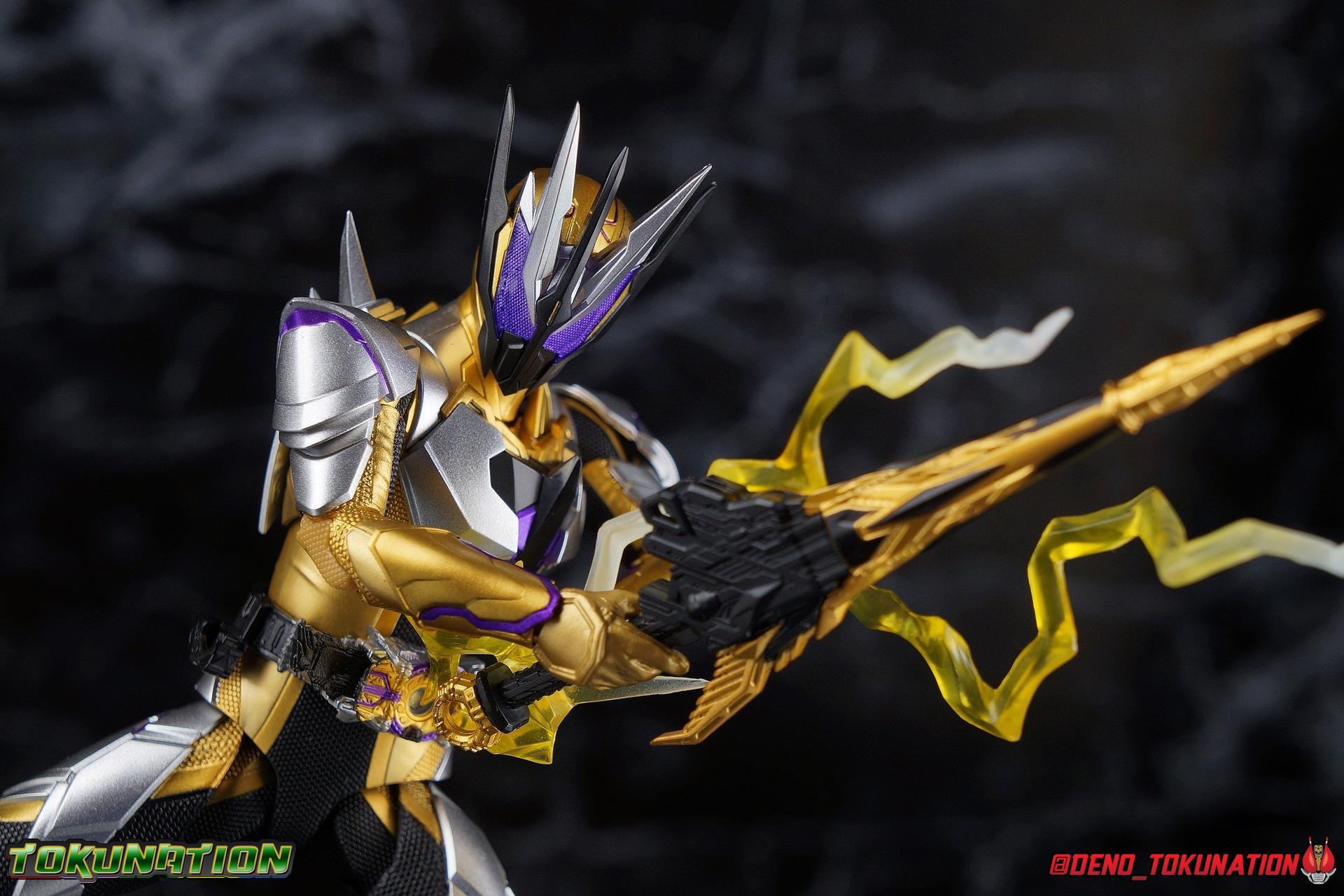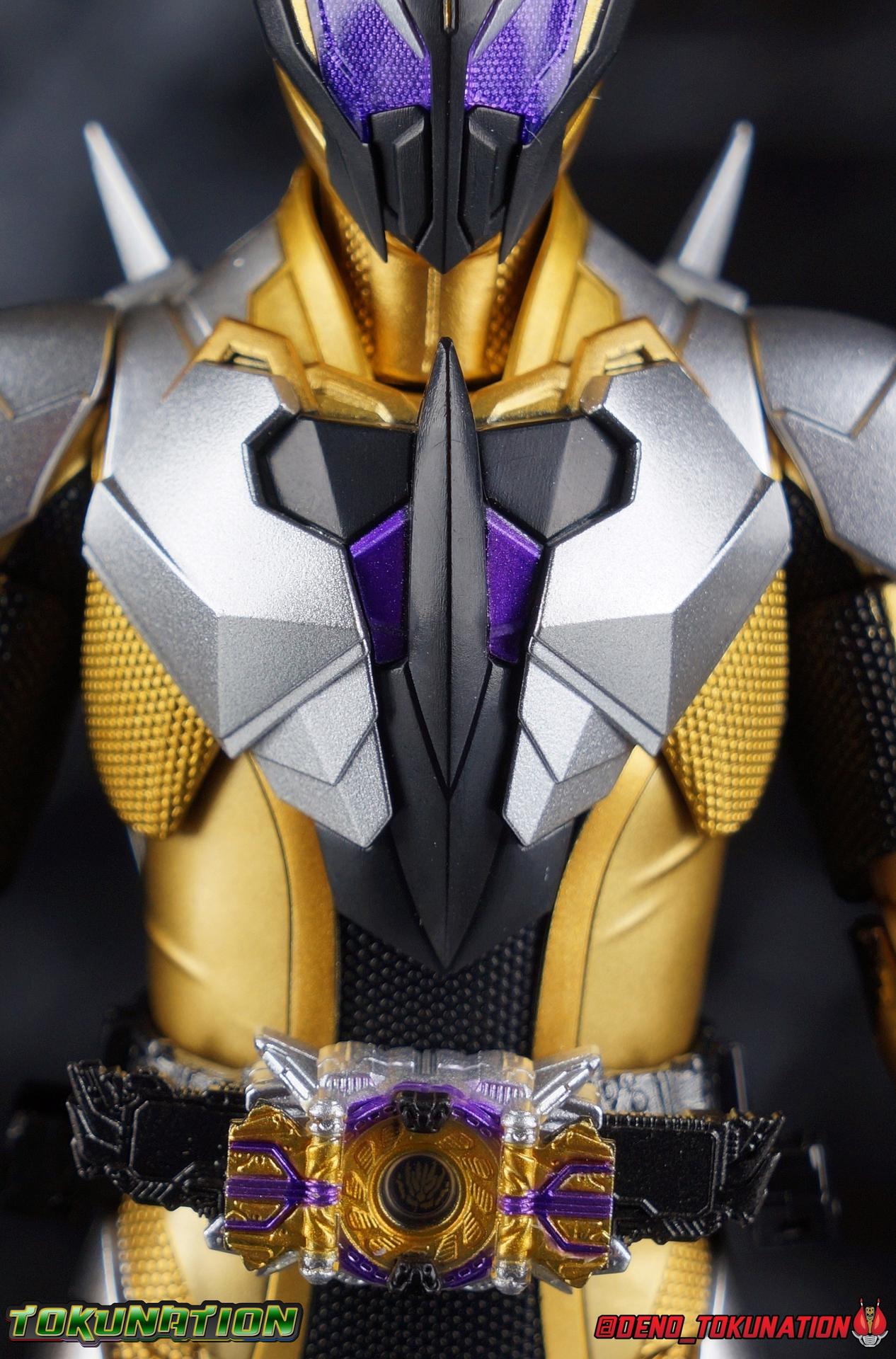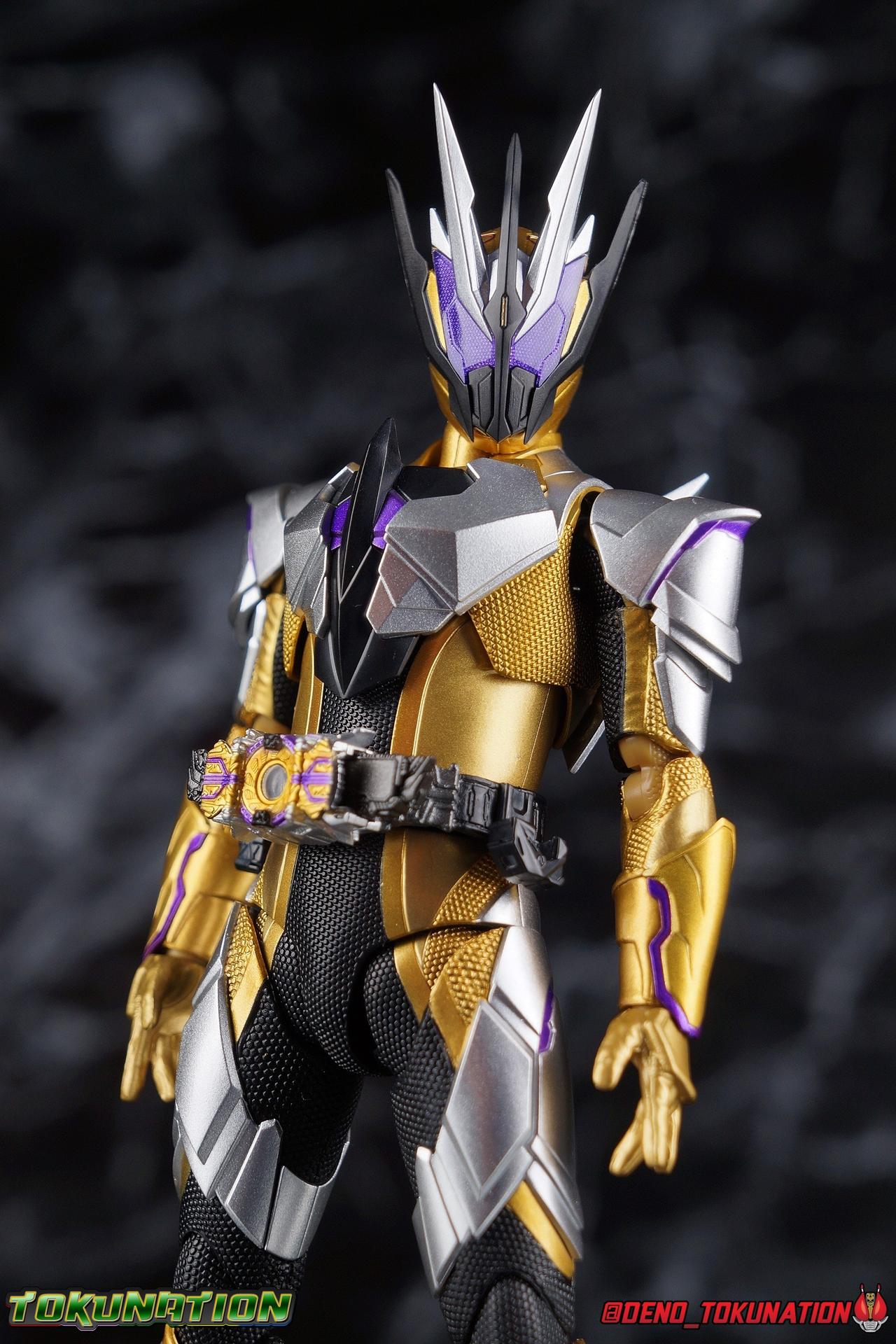 The cruelty of humanity. That is what Gai Amatsu instilled in Satellite Ark. In doing so he instigated not only the Daybreak Town Incident, but also the creation of Metsuboujinrai.net, and all the pain to come for both humans & humagears. For 12 years Gai has manipulated events from the comfortable shadows of ZAIA Enterprise. Now the mysterious man behind A.I.M.S. has his sights set on Hiden Intelligence as well, but can Zero-One keep his grandfather's company safe? Gai Amatsu is a master manipulator, and maybe one day, he could even be a hero. But for now? With strength that's 1000% greater than Zero-One's, the golden solider Kamen Rider Thouser is born! Packaging Keeping in line with the sort of packaging the Zero-One line has had, Thouser arrives in a mostly white box, but with appropriately ostentatious gold details and lettering. There are no fun black light gimmicks or anything like that with Thouser's box. Just some really standard stock photos and a nice portrait of the figure across the front. Nothing special to report this go around. Figure time! Main Figure Unfortunately I've yet to be able to handle all the riders from Zero-One so far. Having missed Horobi, Jin, & Valkyrie, I feel like I need to preface this review. Because I don't feel like I have a complete picture of the Zero-One Figuarts line yet without them. So if my impressions of Thouser are way off base, I apologize. That being said, while he's certainly the most ornately detailed of the Zero-One riders, he has a number of flaws as well that need to be addressed as this line continues. Zero-One really set the standard for this line. An absolutely rock solid release to kick off a new line up of rider figuarts, which doesn't always happen. And while I thought he was fantastic, I did feel Vulcan was a less than perfect follow up. With Thouser much of what we see is new, but there's a lot of familiarity as well. The basic form of the Zero-One mold is there, but Thouser still manages to be very different. In the legs we can see the exact same textured black detailing between the two, but the armor that covers it is entirely different. So these two do share at least some parts. However what they don't share is the same range of articulation. Thouser has very restricted ankles, largely due to the design of the ankle cuff, where it drops down around the back of the foot. This nixes almost all of the outward movement of the foot, so good luck with wide stances. The knee bends are fortunately spared, having been directly carried over from Zero-One, no new armor to get in the way. The hip and thigh are largely identical, with only surface details having been changed for Thouser. However the thigh armor does extend further up toward the waist on him as well. And because the drop down hips on this mold already don't go down very far, rotating the hips up to pose the figure is a dangerous preposition. Be very very careful to angle them correctly or you will damage the silver paint on the thighs. Bot overall I really like the way the legs look, the design is great and paint work magnificent. Around his waist, Thouser has the appropriately named Thousandriver. And much like the Zero-One Driver in this line, I feel like we've been a little cheated. The Zero-One Driver is essentially non-functional because it can't revert to it's closed pre-henshin state, and the Thousandriver is exactly the same. The two halves that cover the window of the driver are permanently molded open. So even if you remove the keys you can't really recreate the closed driver. As for the keys we get the Amazing Caucasus Progrisekey & Awaking Arsino Zetsumerisekey. Only the Caucasus key has any detail and that's just the emblem on the end of the key that winds up being in the driver window. Outside of this both keys are just black plastic. The Driver looks fantastic, but it feels half realized, much like the Forceriser. The belt also has Key holsters on each hip, but considering so far there are no closed Progrise or Zetsumerise Keys in this line that I'm aware of, these holsters are entirely pointless. The ab section of the torso is very very similar to Zero-One, it's possibly the same part, though there are some details sculpted into the surface like fabric folds on Thouser. The upper body is the big difference with Thouser having completely newly sculpted armor and some really bright regal colors. But Thouser's armor is also quite thick? The chest armor sticks out a fair bit further than Zero-One, nearly as far out as the Thousandriver. Luckily the torso's articulation is nearly the same as Zero-One. We get a full rotating waist joint, and a ball jointed upper body that can lean about 45 degrees to either side, with a fair bit of room to arch the back. Thouser also features quite similar arms to Zero-One. They're essentially the same, again with new armor for Thouser. Thankfully this means we get the same basic elbow bend and wrist articulation. However the shoulders are a different story. Largely because of the large new shoulder pads which Thouser sports. Covering a greater portion of the joint, and having less range to move, the pad limits what the arms can do. Leaving us with about a 45 degree bend in straight out and upward movement. This is a bummer but it wasn't unexpected as well. Finally, probably the most interesting thing about the Thouser design, is his helmet. It's a harsh, striking design that certainly looks like the bad guy. Even despite Gai's change of heart later in the series, the design still speaks to it's villainous origins. Early concept art for Thouser had the compound eyes in blue and I think that actually would have gone a long way to making the suit look more heroic overall. As is there's some great royal purple compound eyes set amongst a crown of beetle horns. Luckily all the added bulk of the head itself and the armor of the torso don't really impact how the head can maneuver. While the figure has plenty of areas that should have